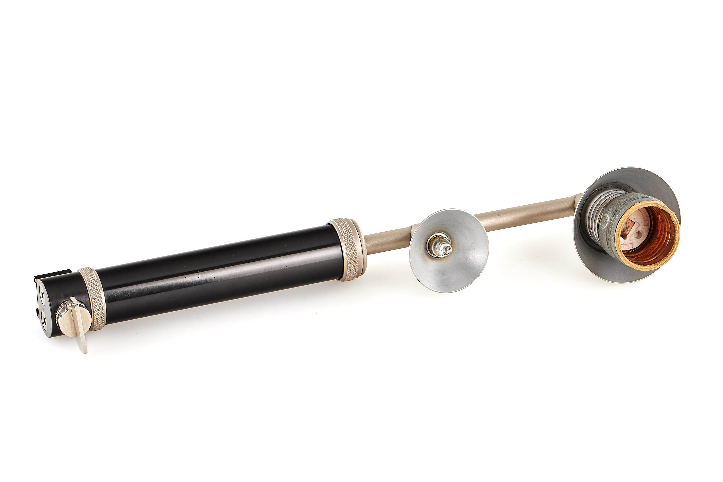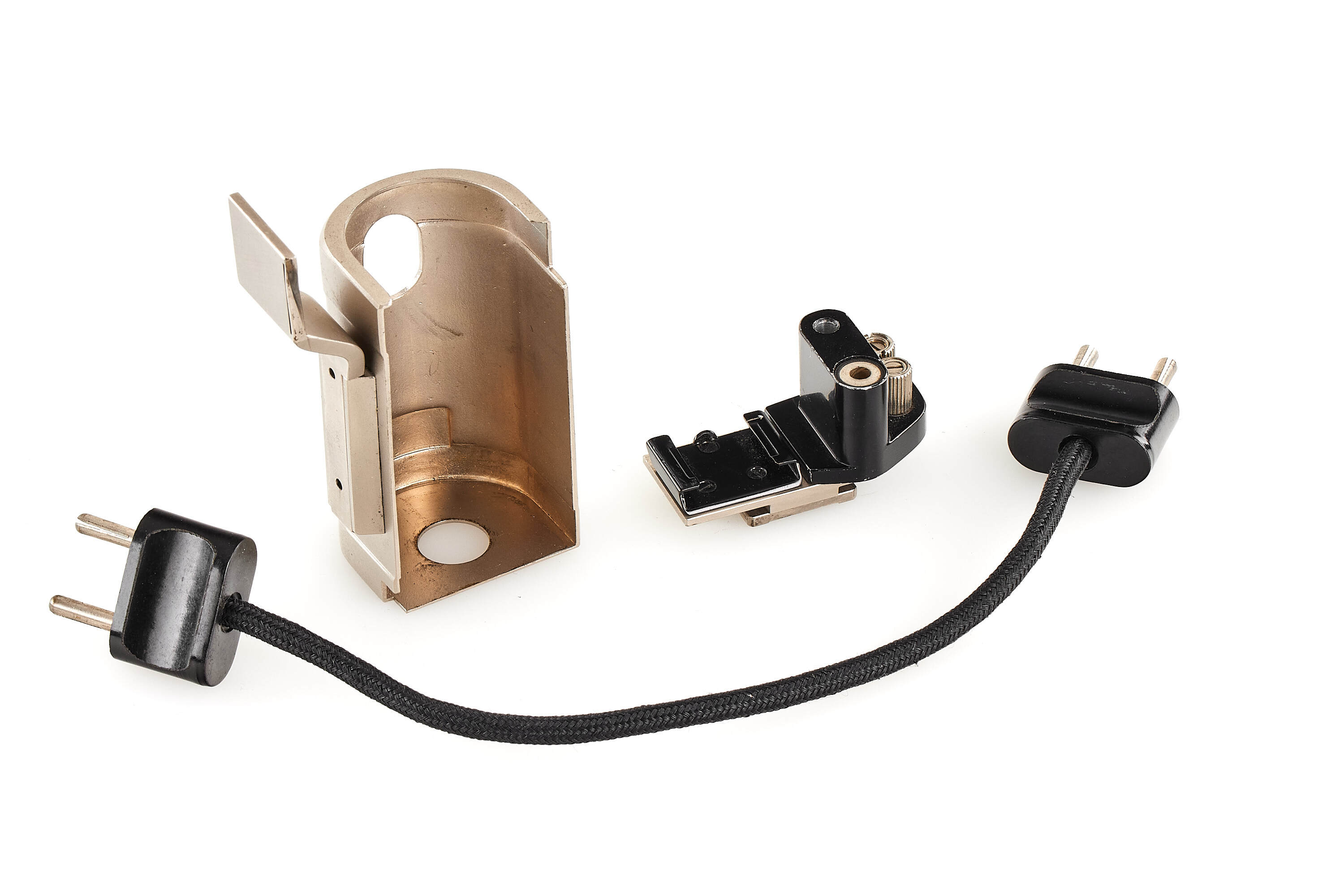 Rare early flash for Vacublitz bulbs, complete set including flash shoe mount, camera bracket and German instructions from 1935, in beautiful, near-mint condition, with original, near-mint red maker's box, hard to find in this good condition.