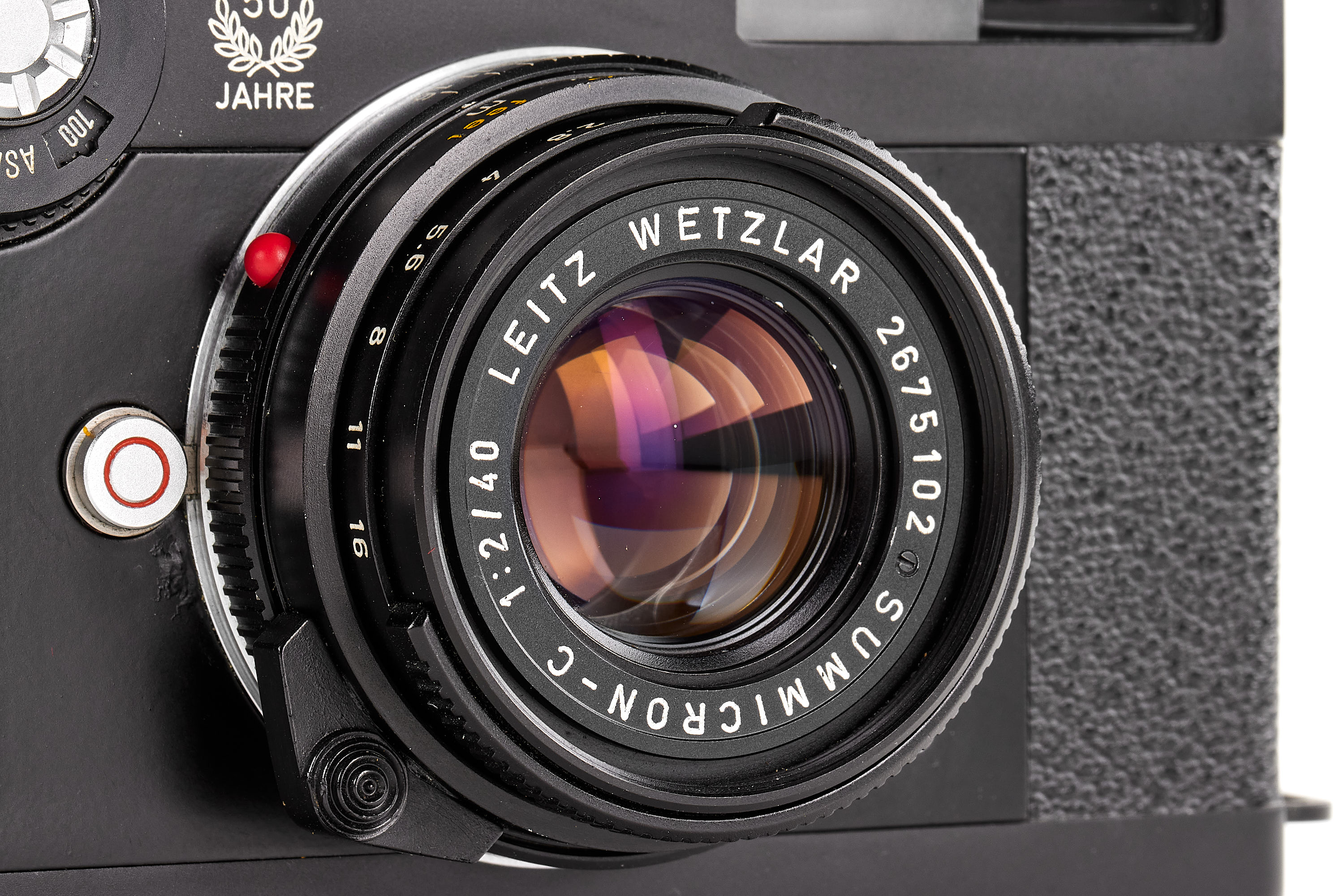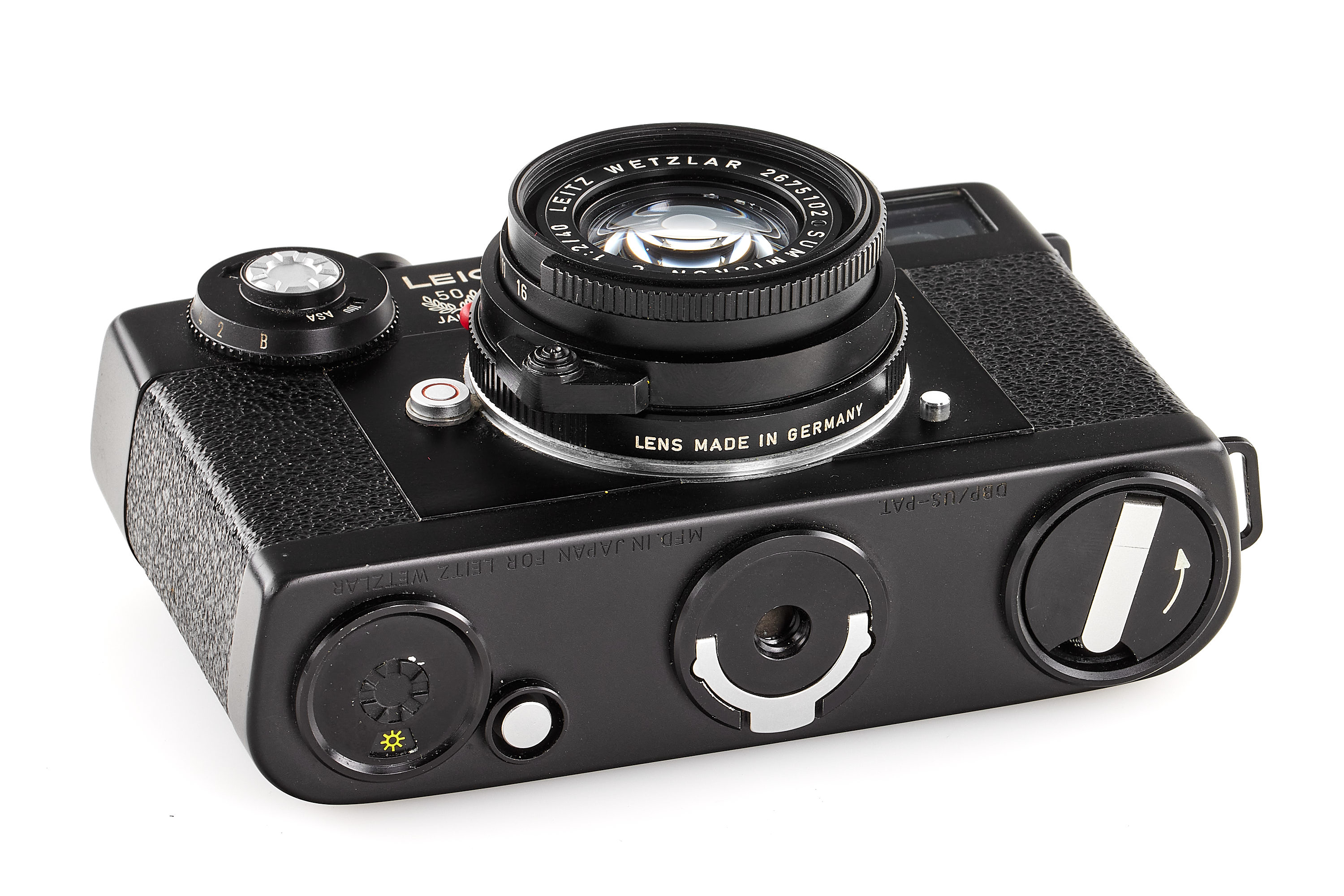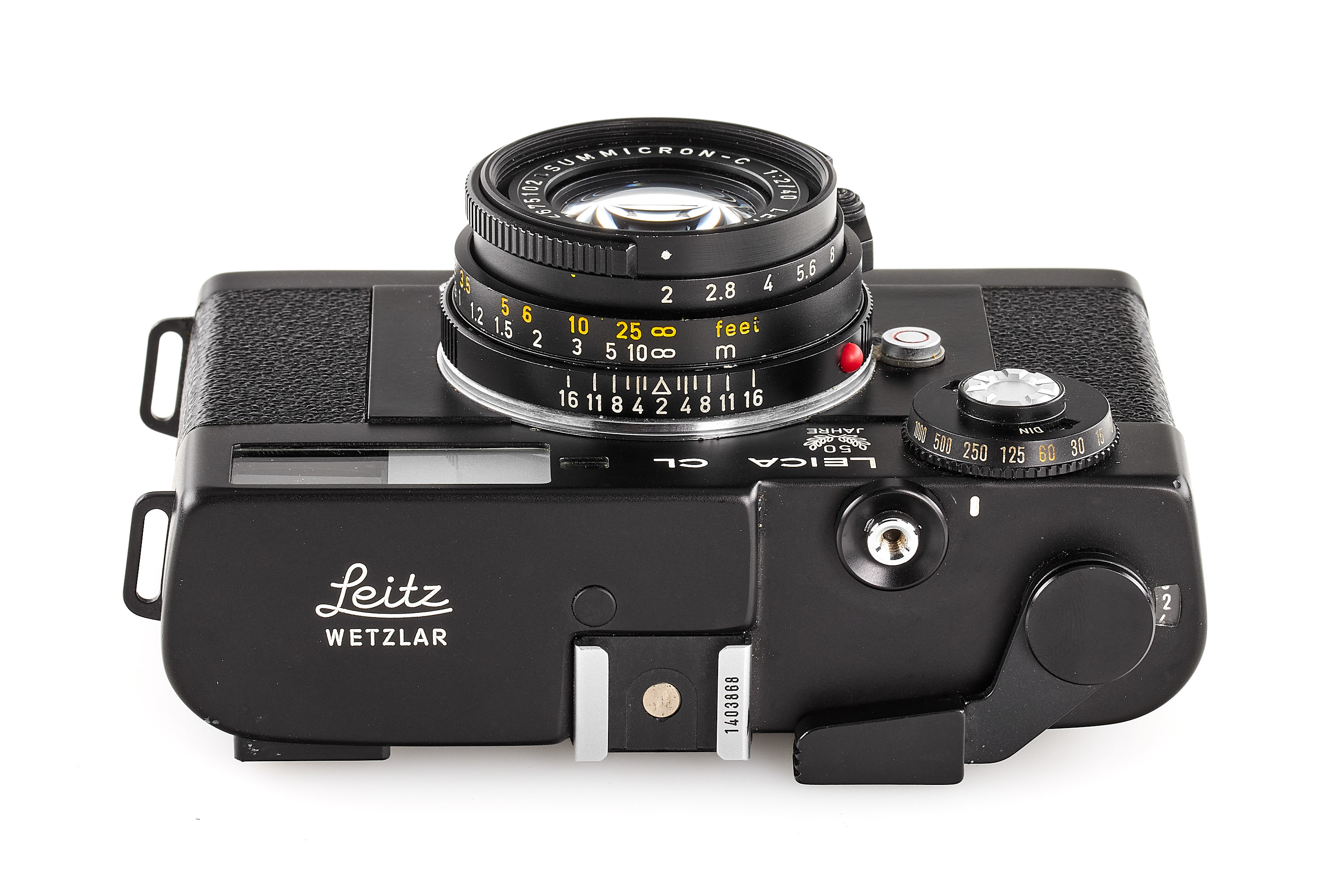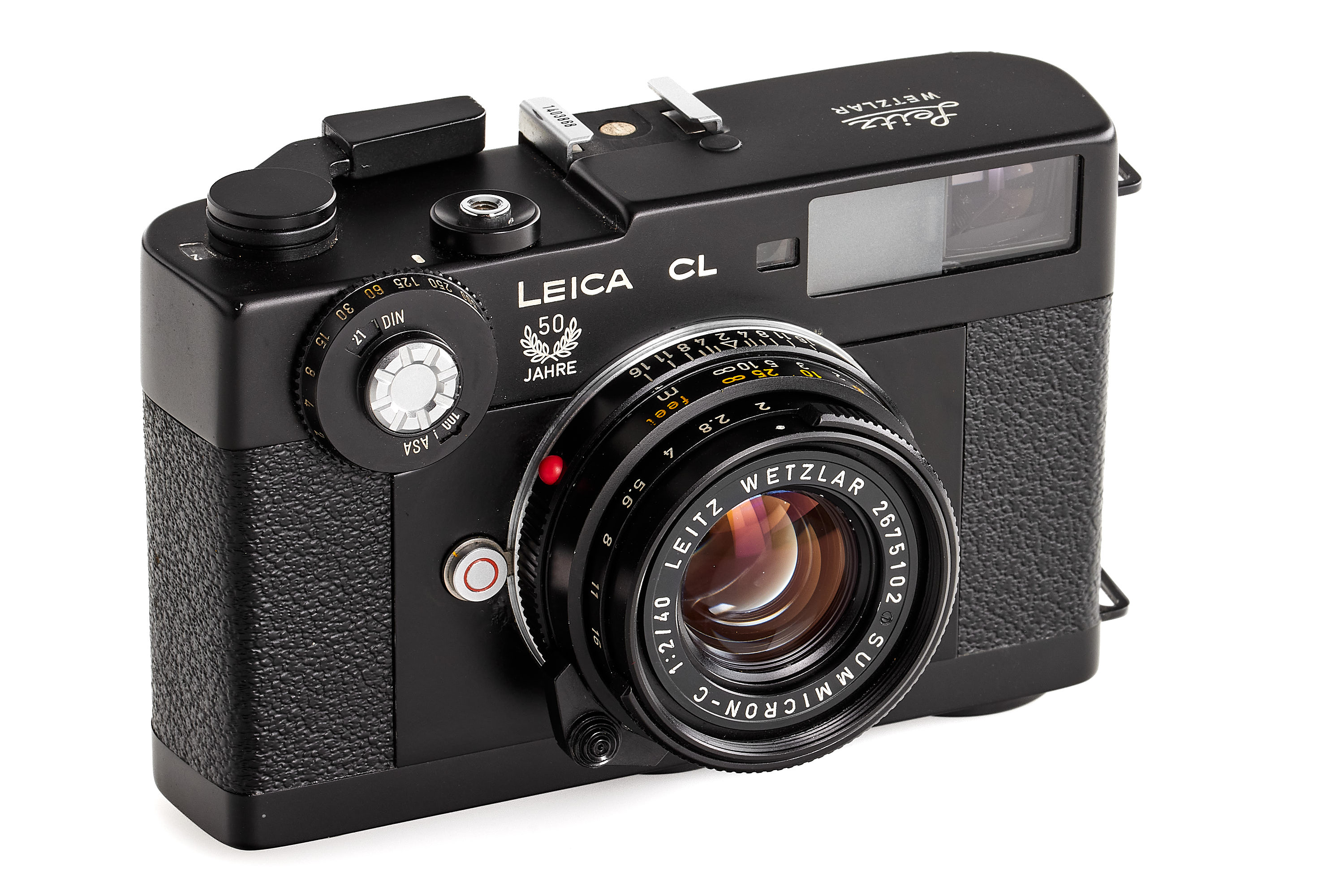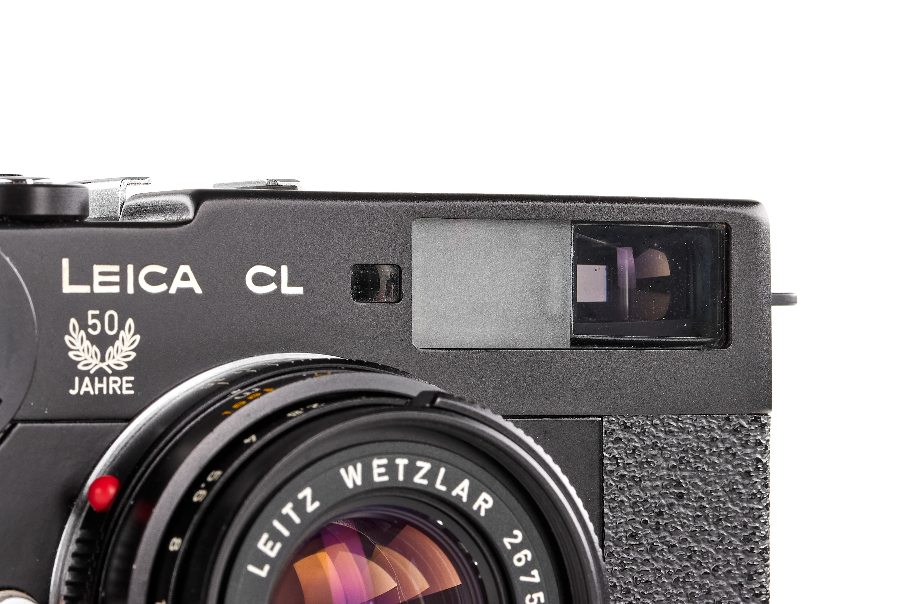 Limited edition Leica CL issued to commemorate 50 years of Leica cameras, with special engravings on the front plate, including body no.1403868 in near-mint condition, needs maintenance, Summicron-C 2/40mm no.2675102 (showing some haze), Elmar-C 4/90mm no.2604063 (showing some haze) with rubber hood.