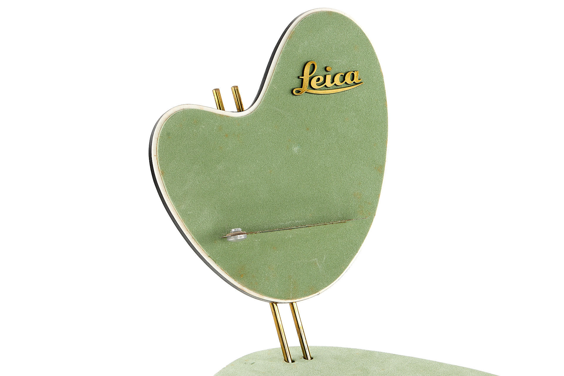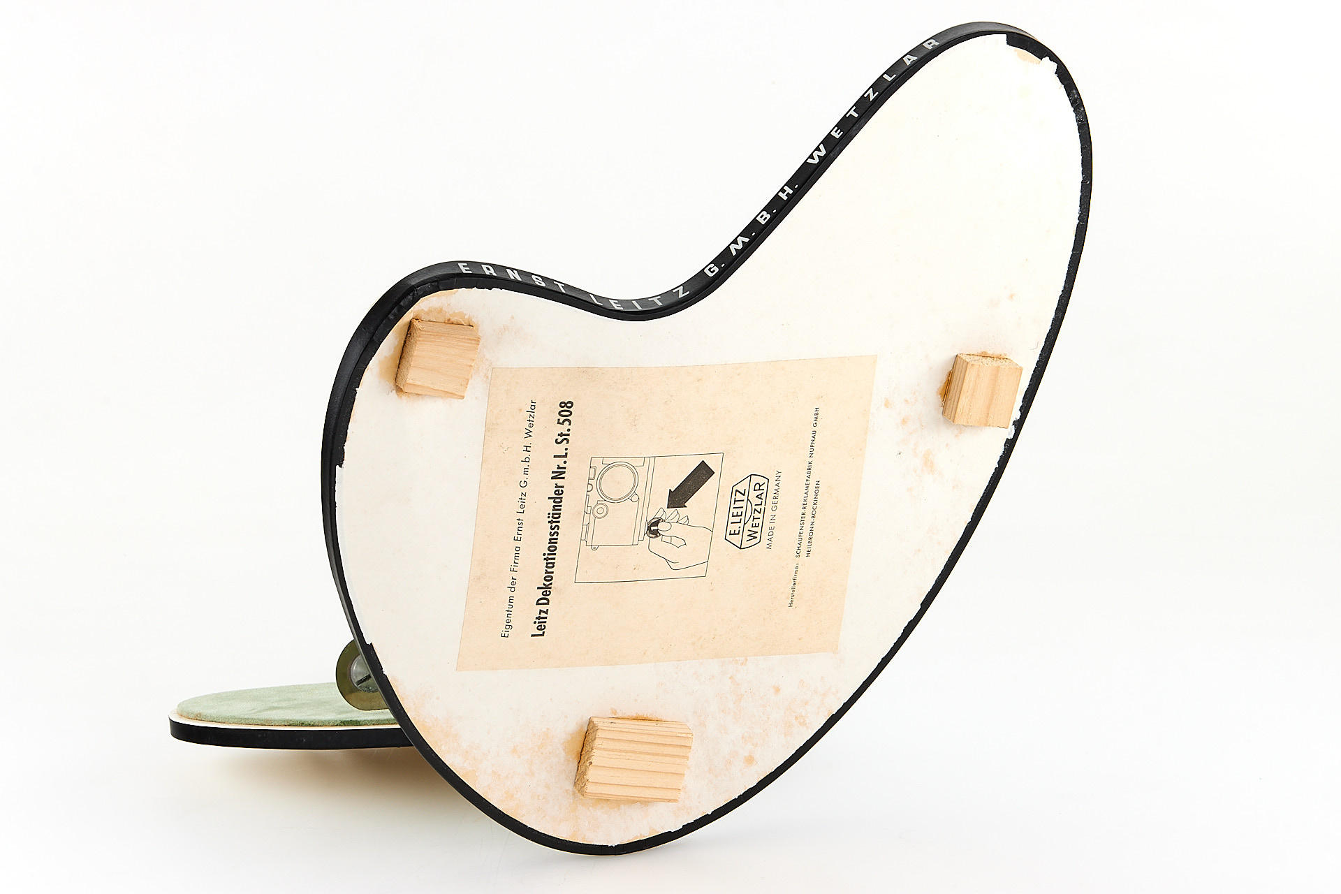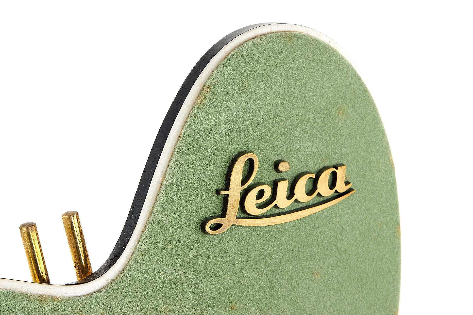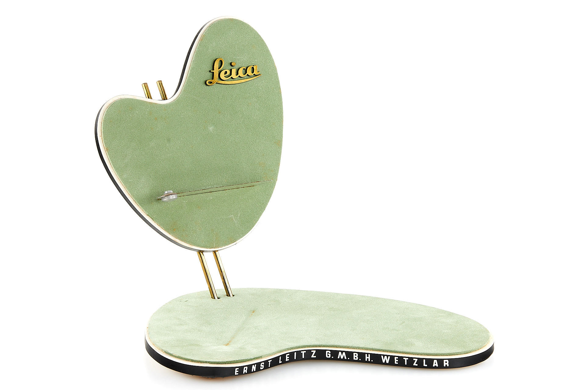 Extremely rare and beautiful pastel green display stand in very good condition, classic curved shapes from the "50s", in suede finish on cardboard and metal holders, 'ERNST LEITZ G.M.B.H WETZLAR' painted on the sides, a sticker with description and instructions on the bottom, a very special opportunity for every Leica collector!