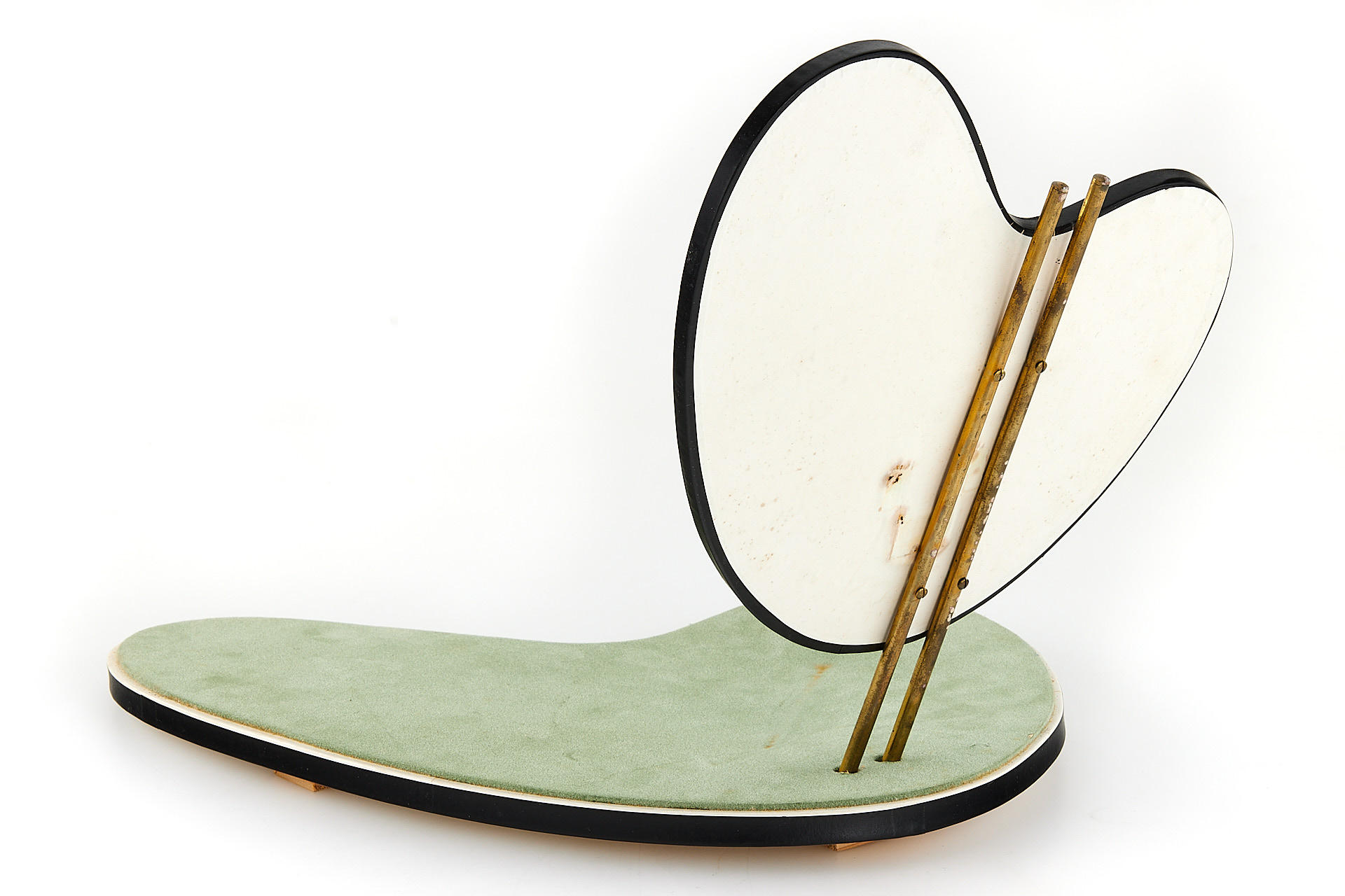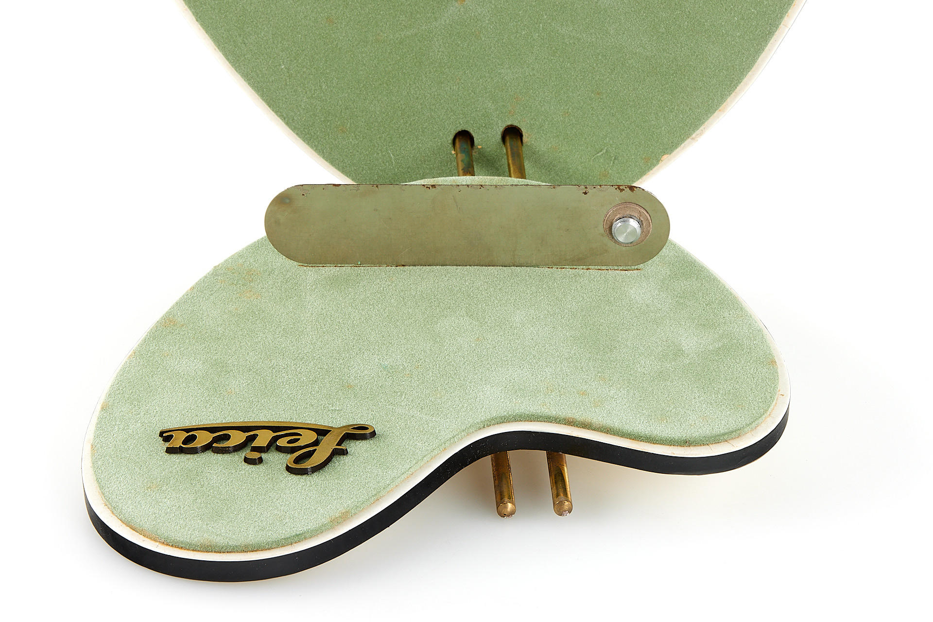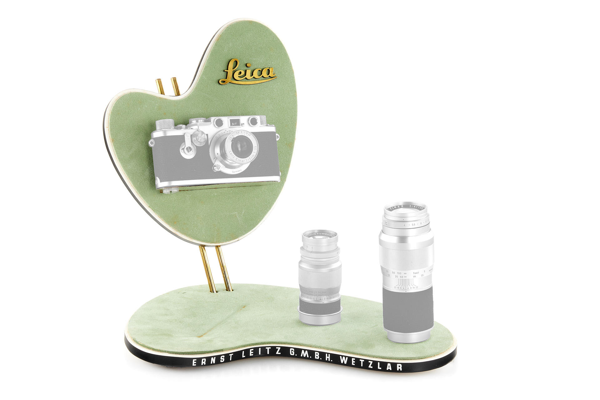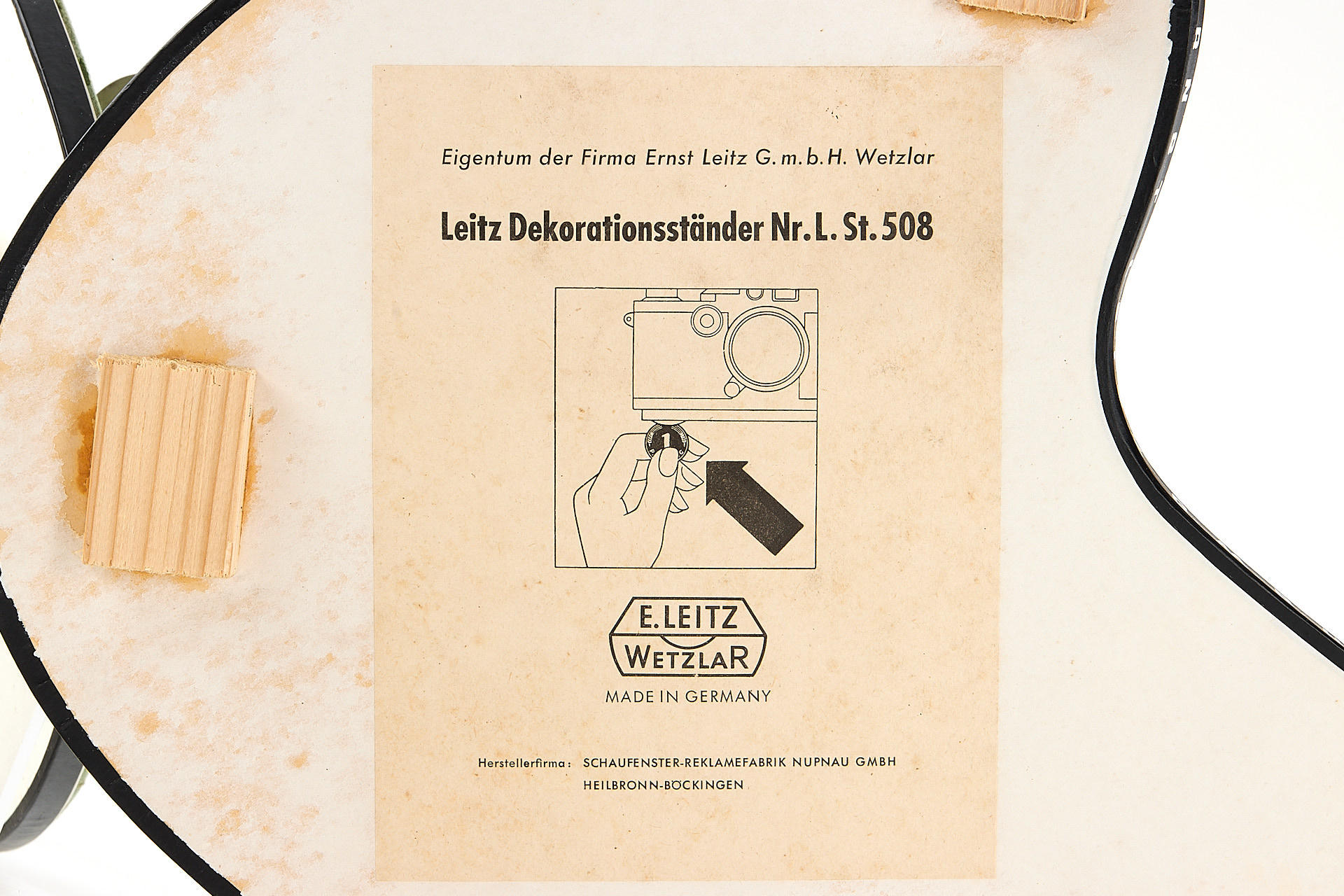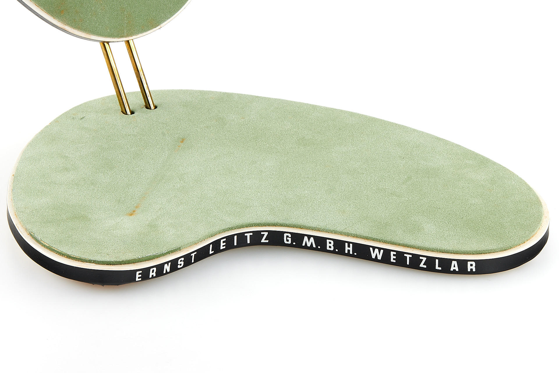 Extremely rare and beautiful pastel green display stand in very good condition, classic curved shapes from the "50s", in suede finish on cardboard and metal holders, 'ERNST LEITZ G.M.B.H WETZLAR' painted on the sides, a sticker with description and instructions on the bottom, a very special opportunity for every Leica collector!