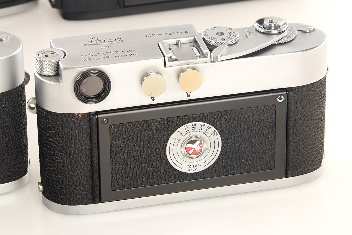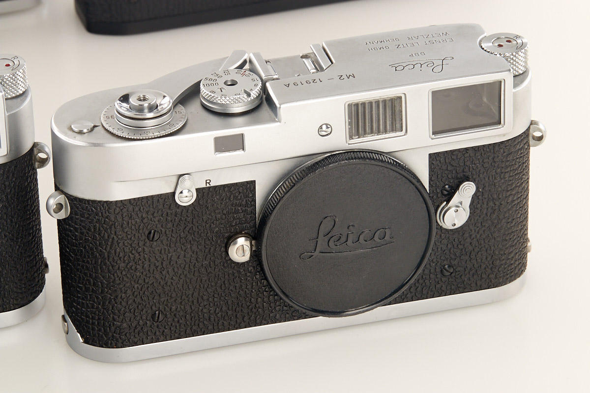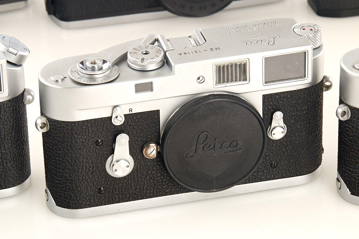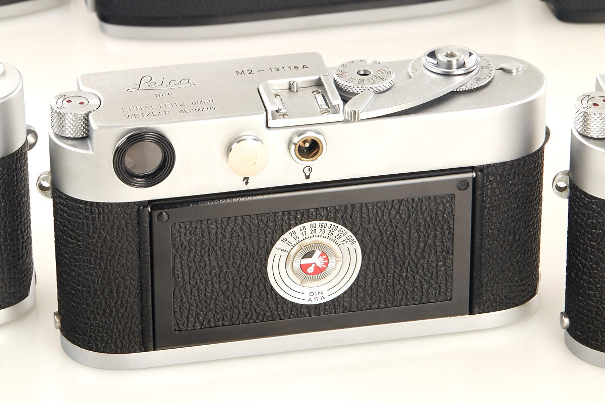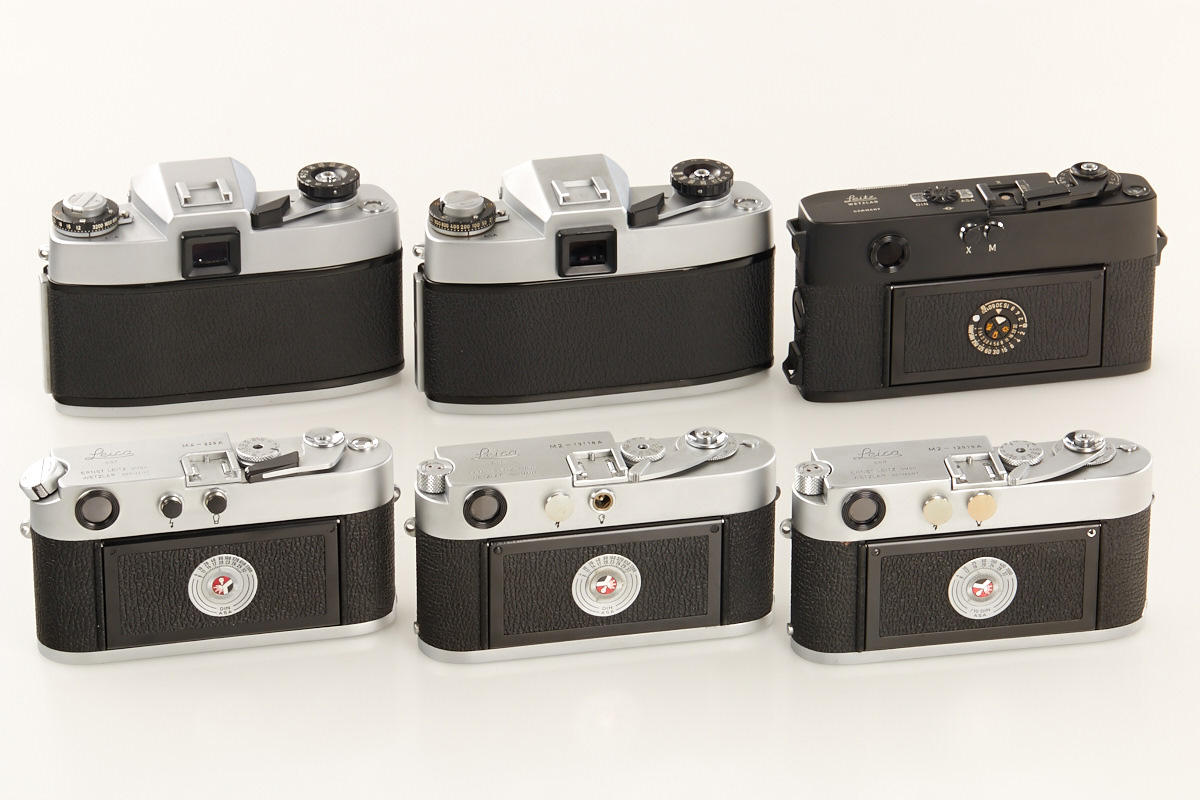 (1) M2 dummy no.12919A (cond. B), (2) M2 dummy with self timer no.13118A (cond. B+), (3) M4 dummy no.229A (cond. A/B), (4) M5 black dummy no.A667, (5+6) two Leicaflex SL dummies without numbers, all with body caps