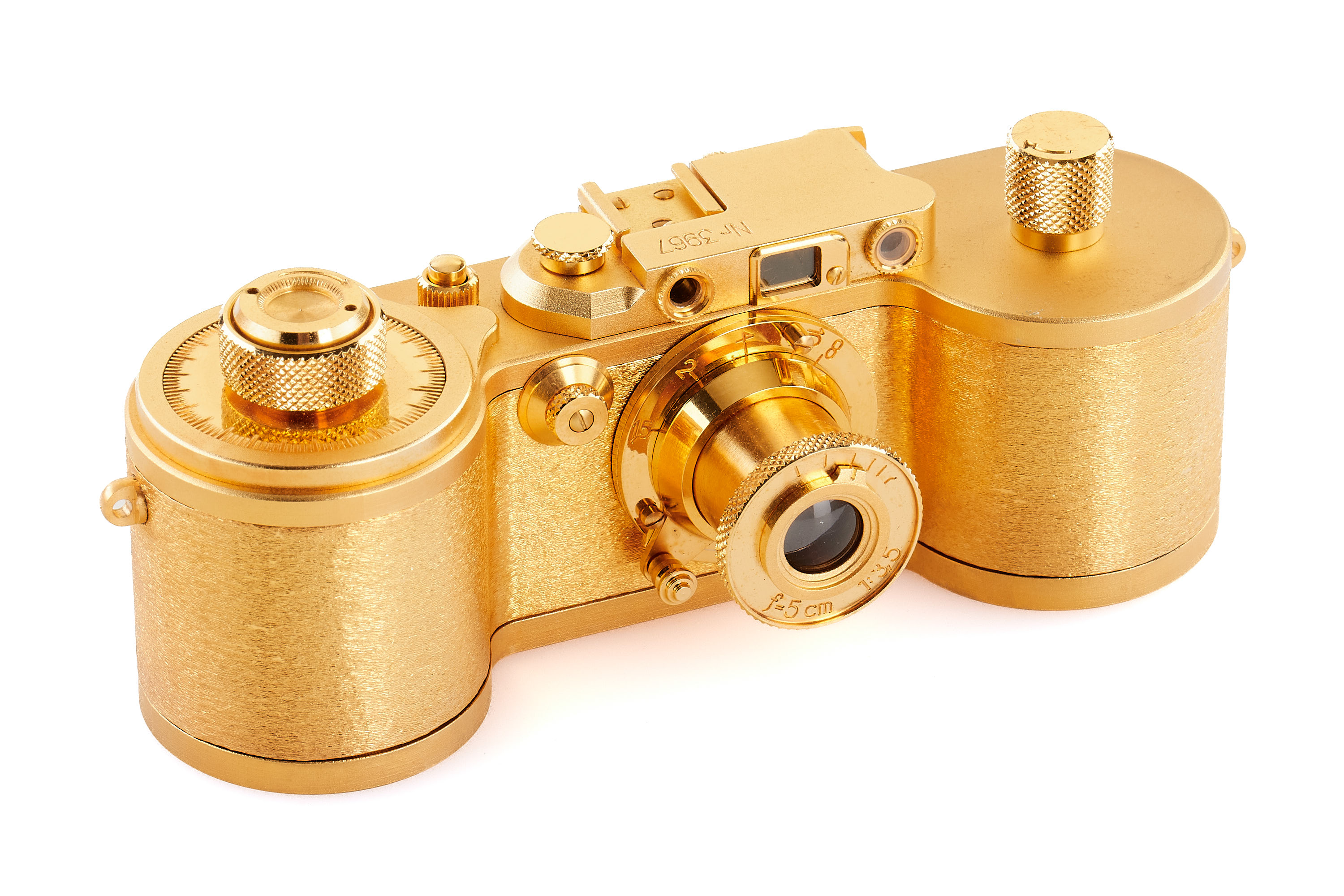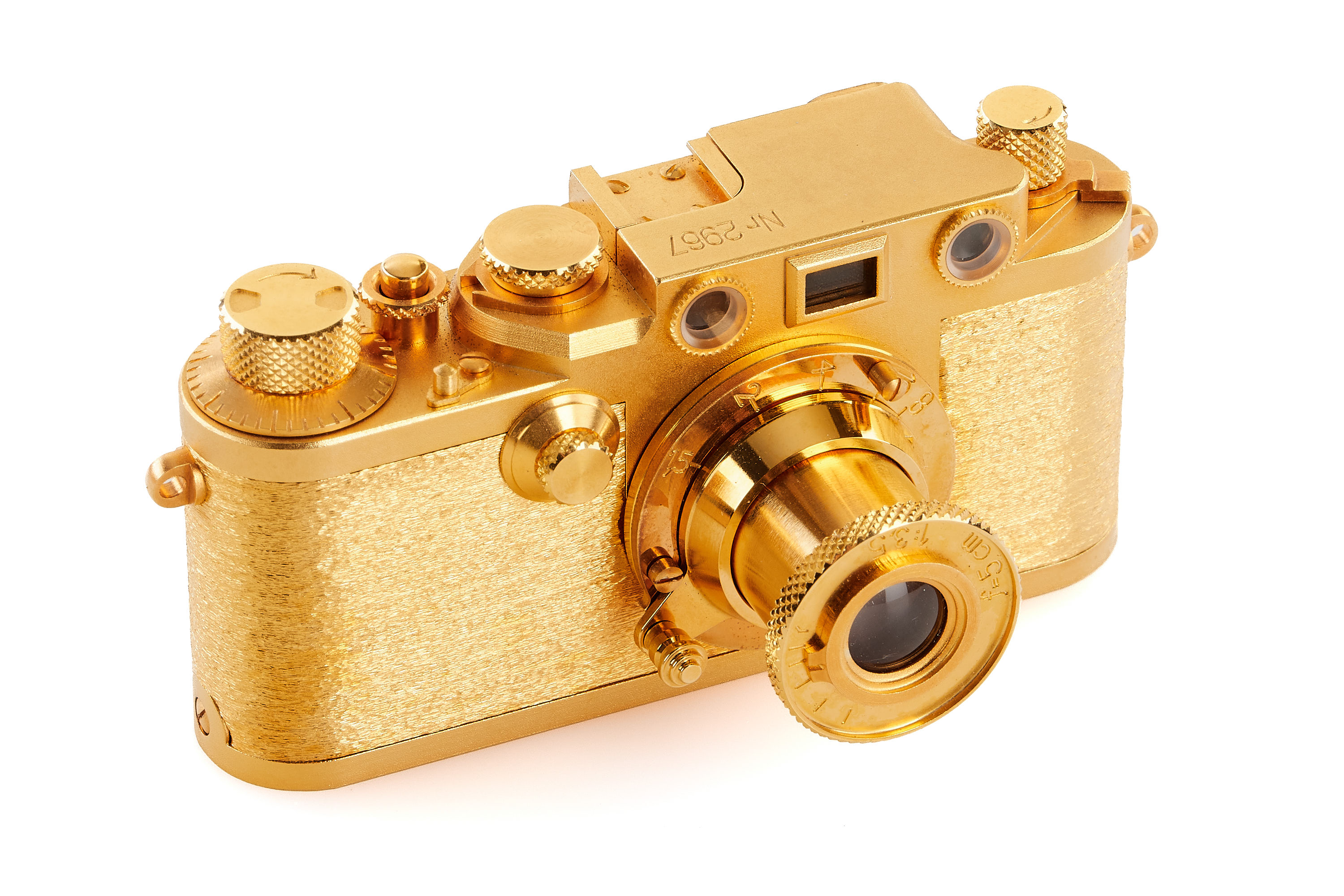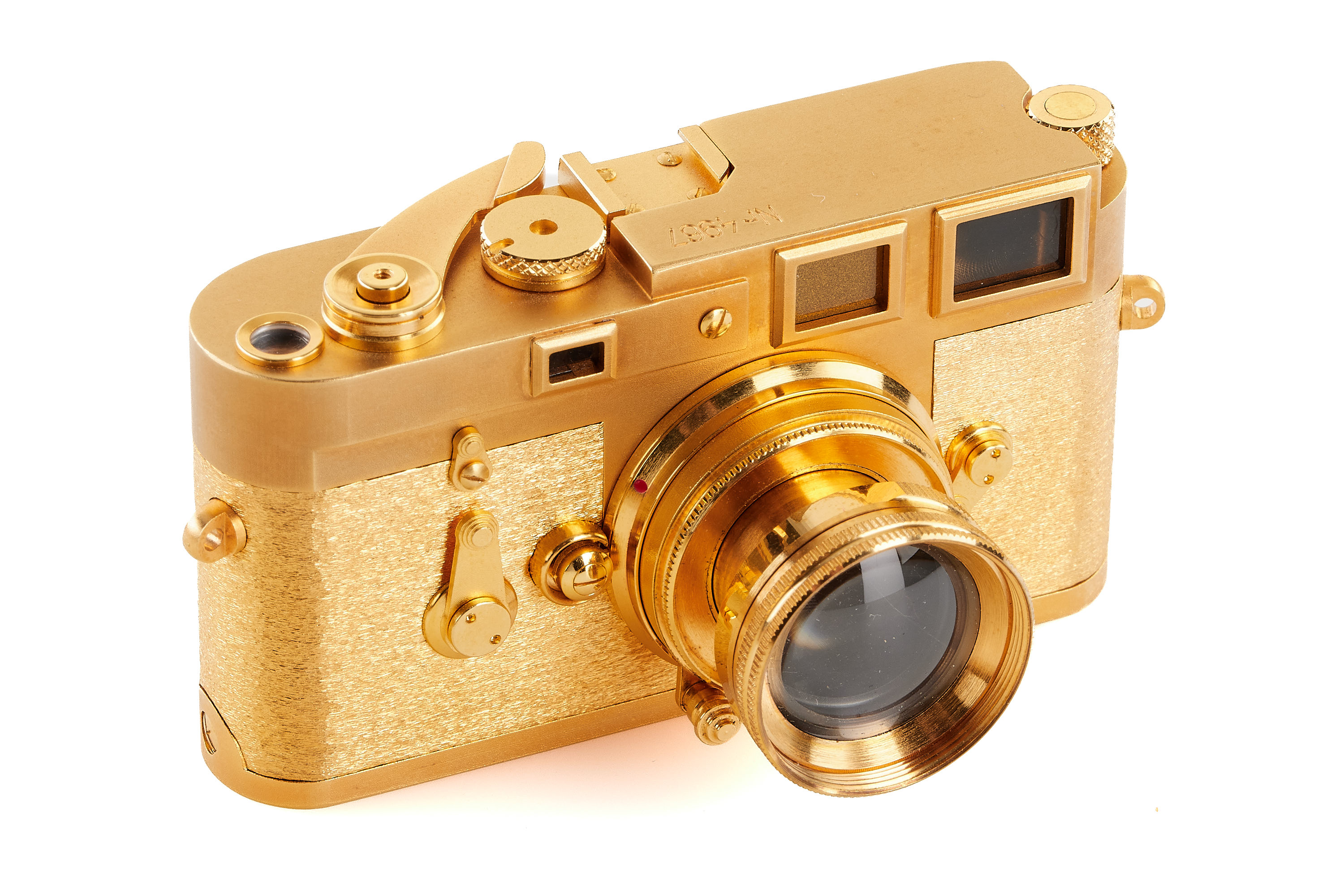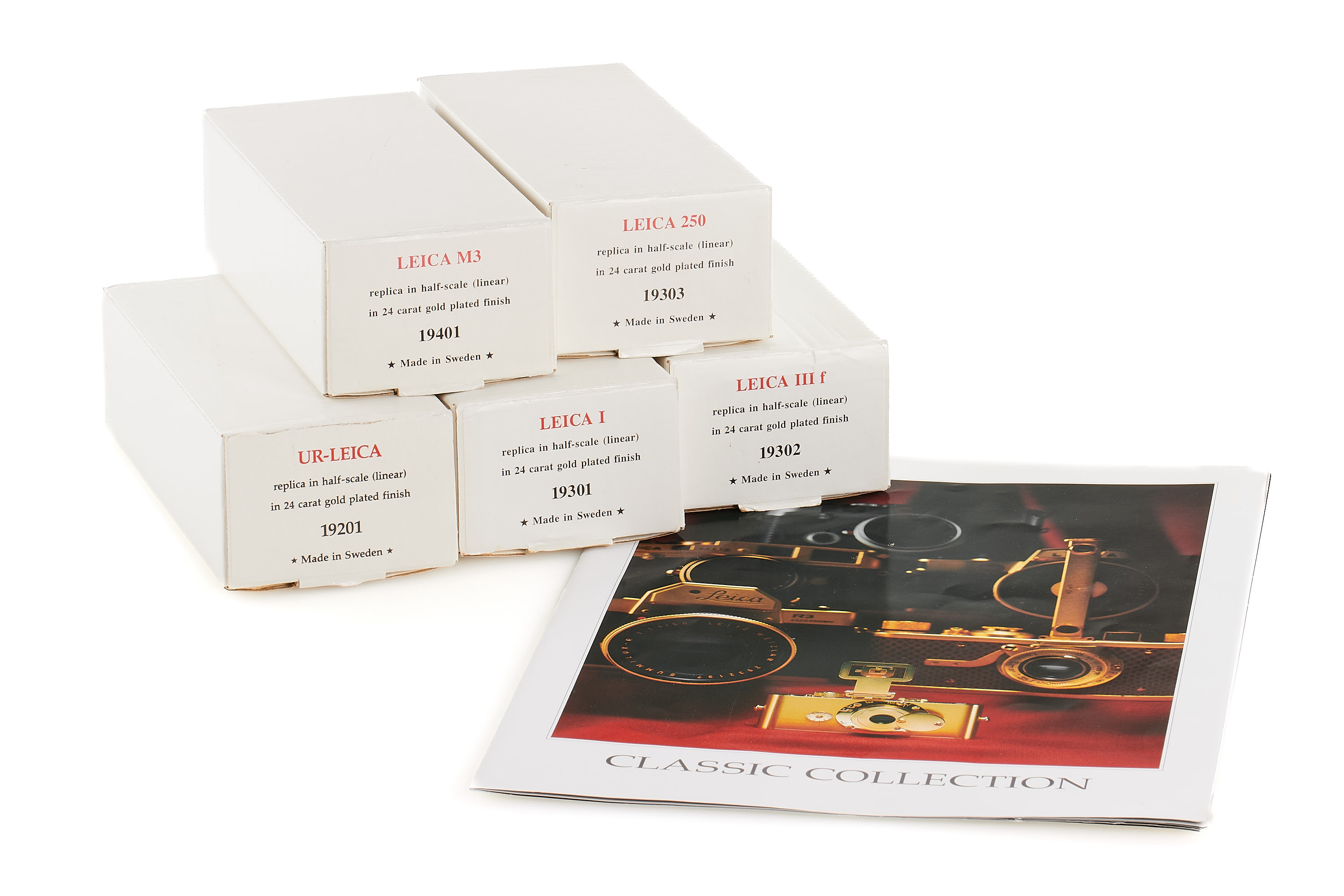 Beautiful complete set of 5x 24 carat gold plated replicas in scale 1:2 produced by Eurofoto in Sweden, including an Ur-Leica no.0967, Leica I no.1967, Leica 250 no.3967, Leica IIIf no 2967, Leica M3 no.4967, all in new condition, with all certificates of authenticity, brochure, maker's boxes and special wooden presentation box.