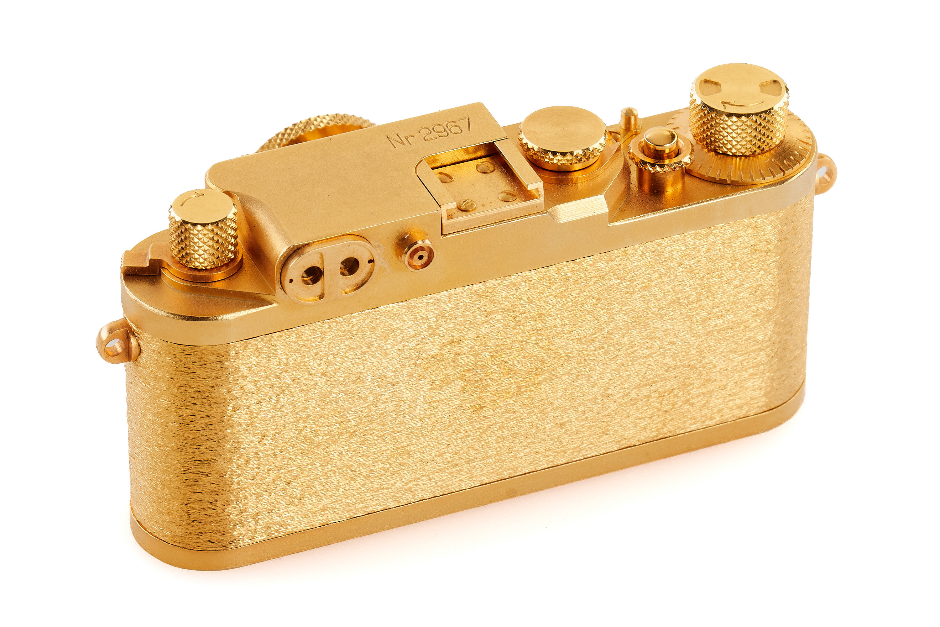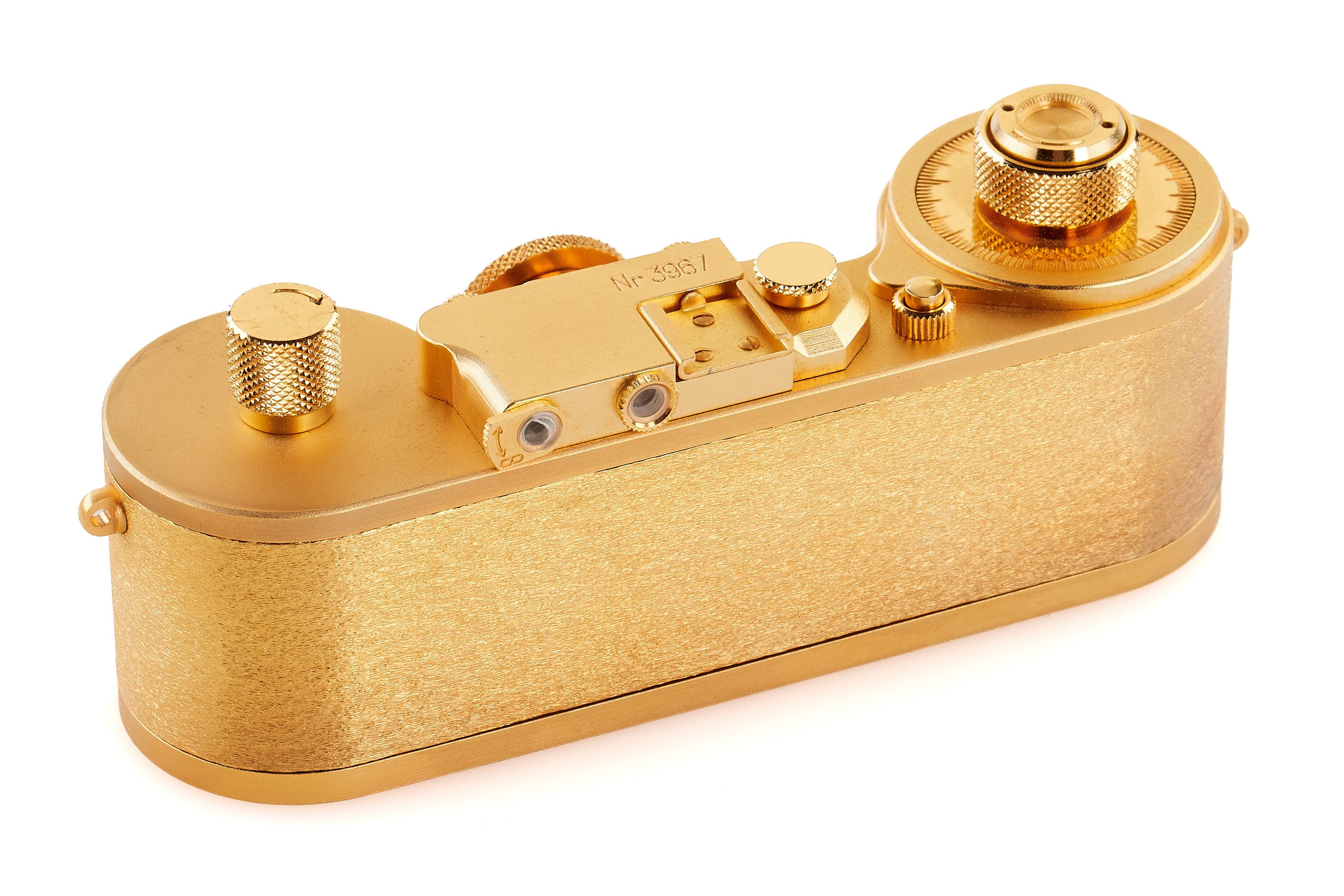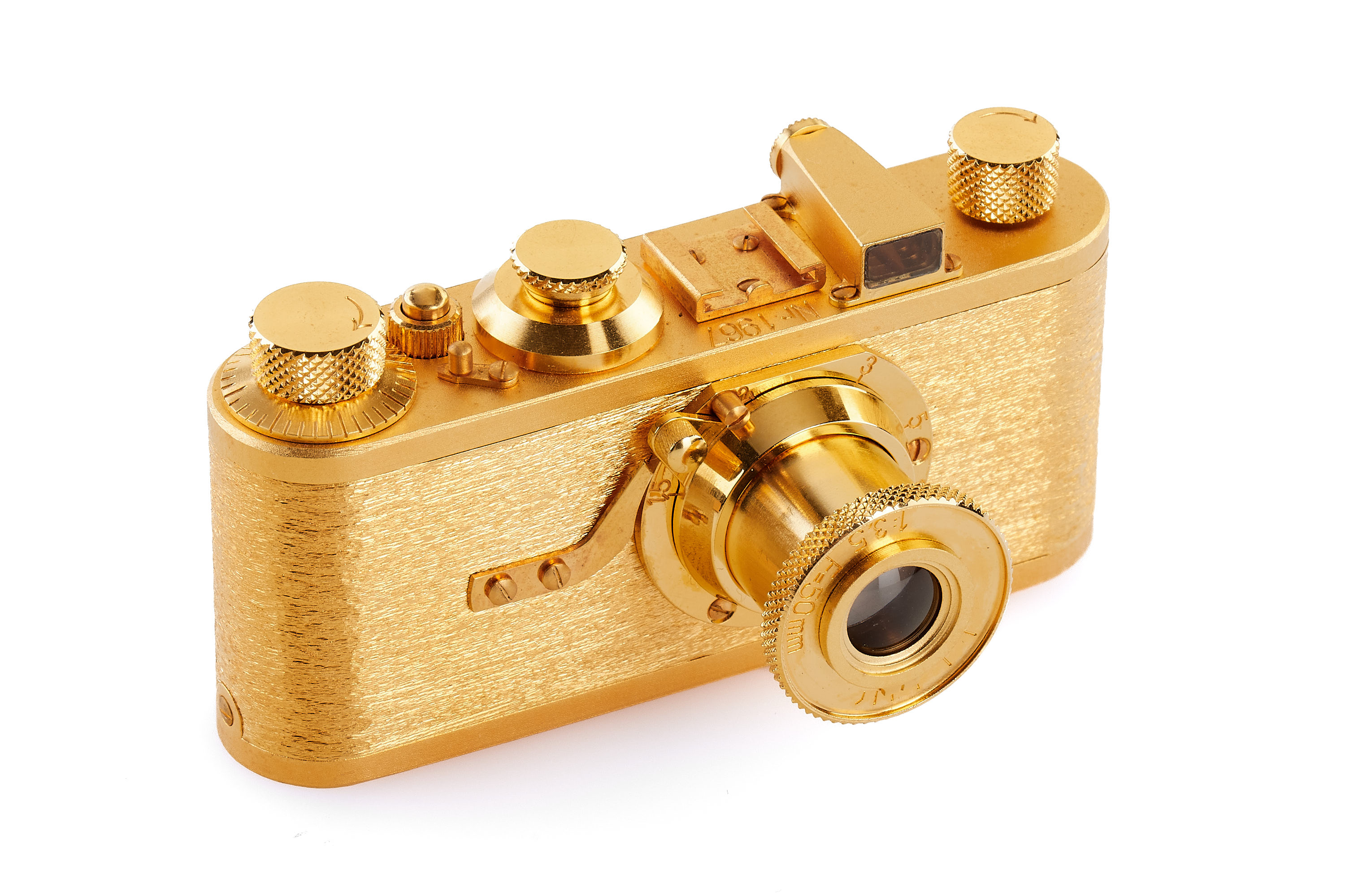 Beautiful complete set of 5x 24 carat gold plated replicas in scale 1:2 produced by Eurofoto in Sweden, including an Ur-Leica no.0967, Leica I no.1967, Leica 250 no.3967, Leica IIIf no 2967, Leica M3 no.4967, all in new condition, with all certificates of authenticity, brochure, maker's boxes and special wooden presentation box.