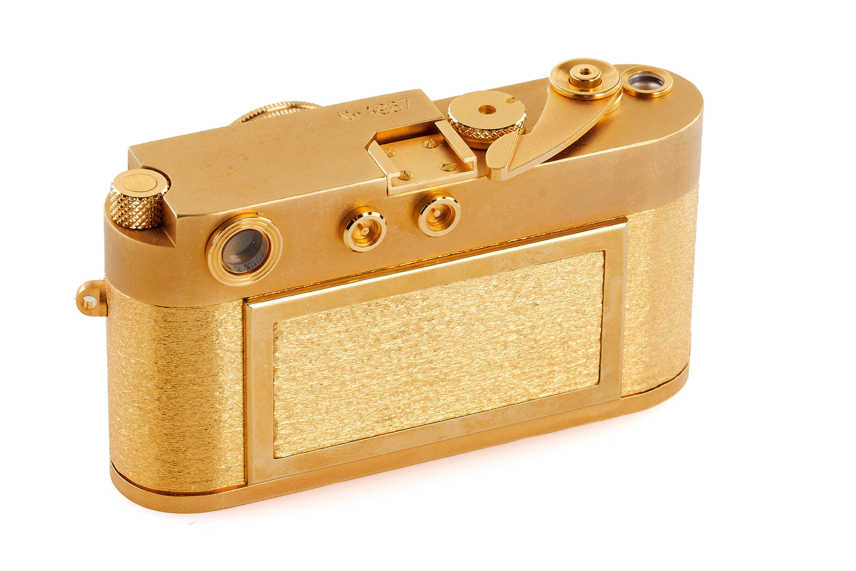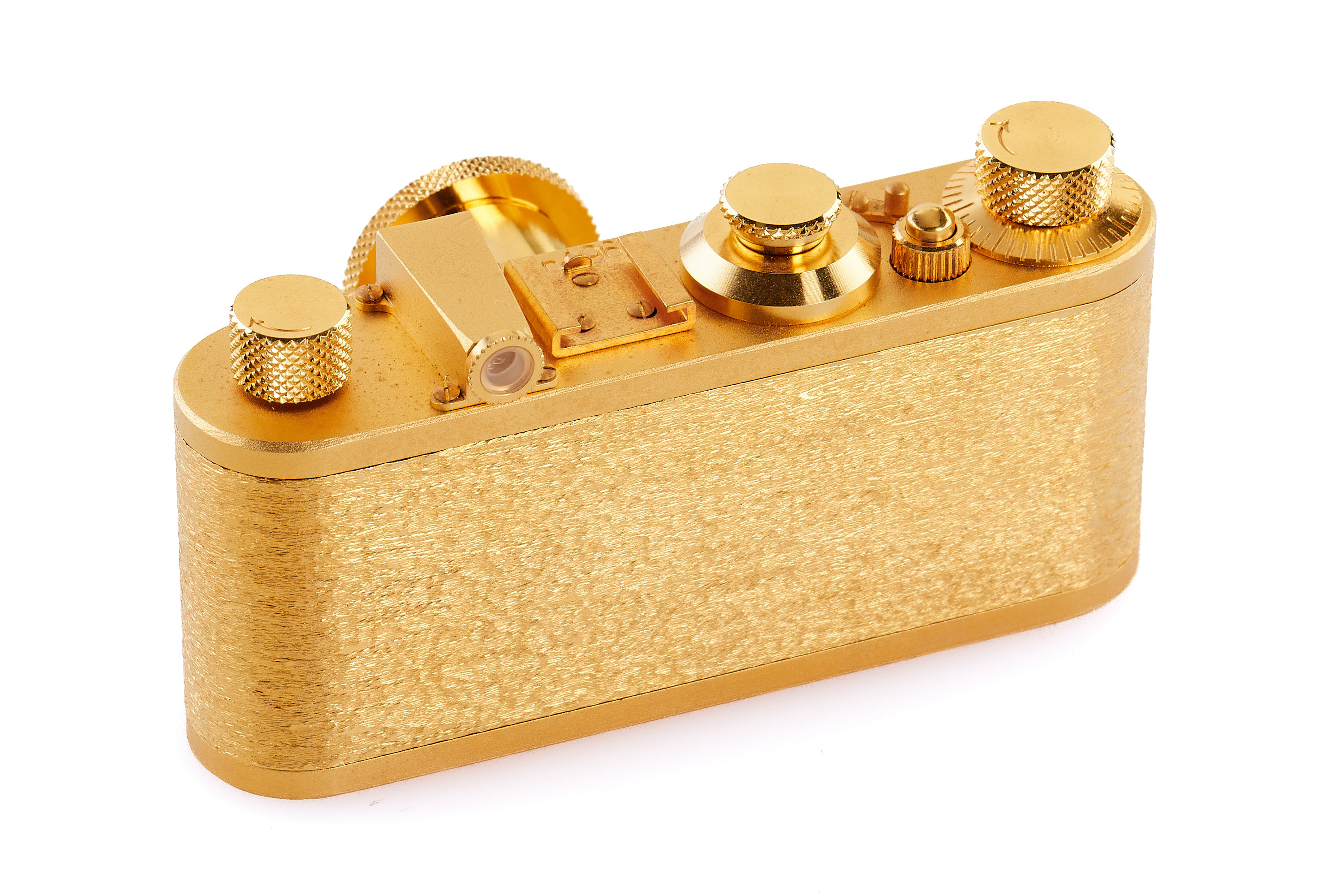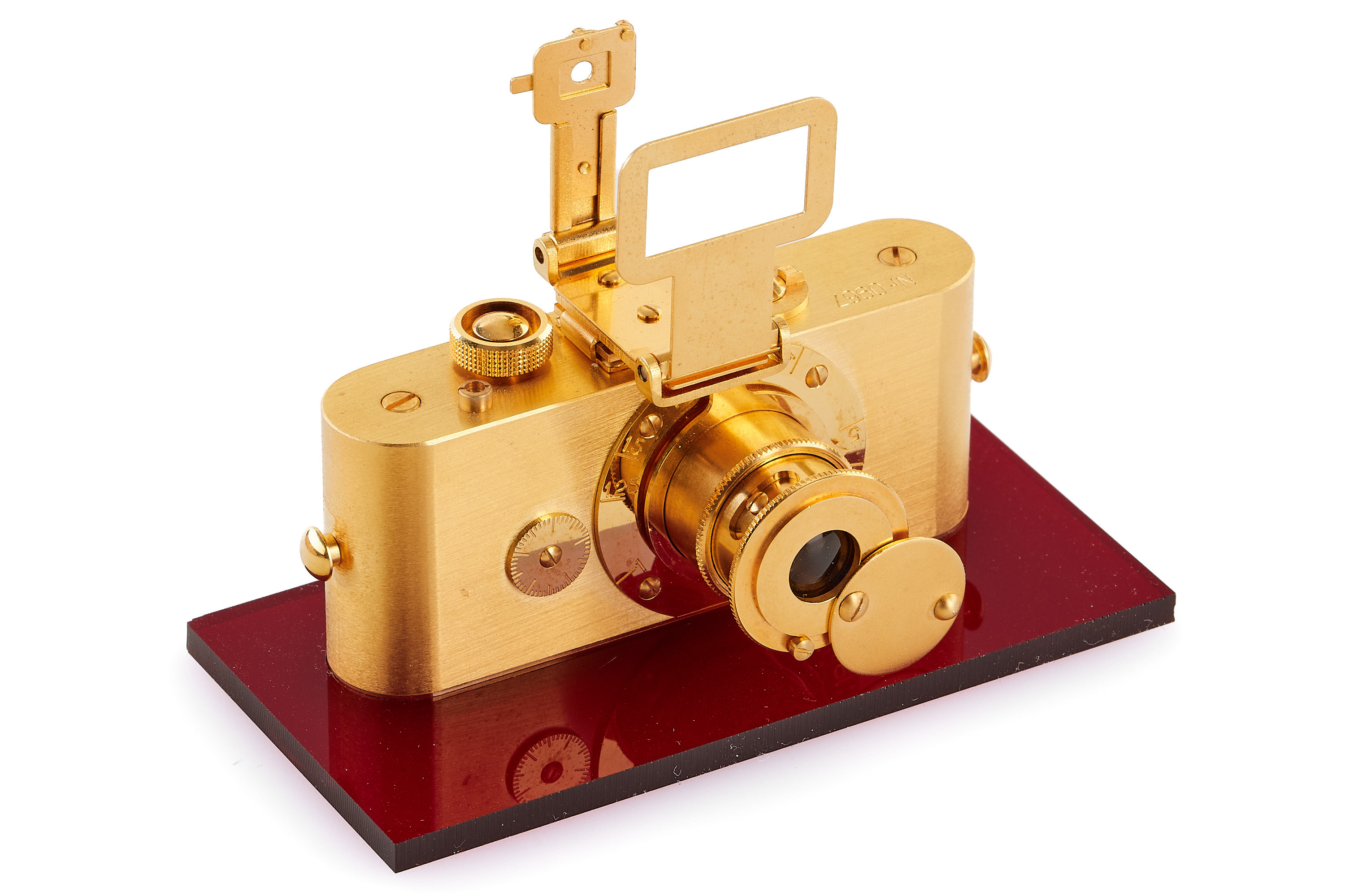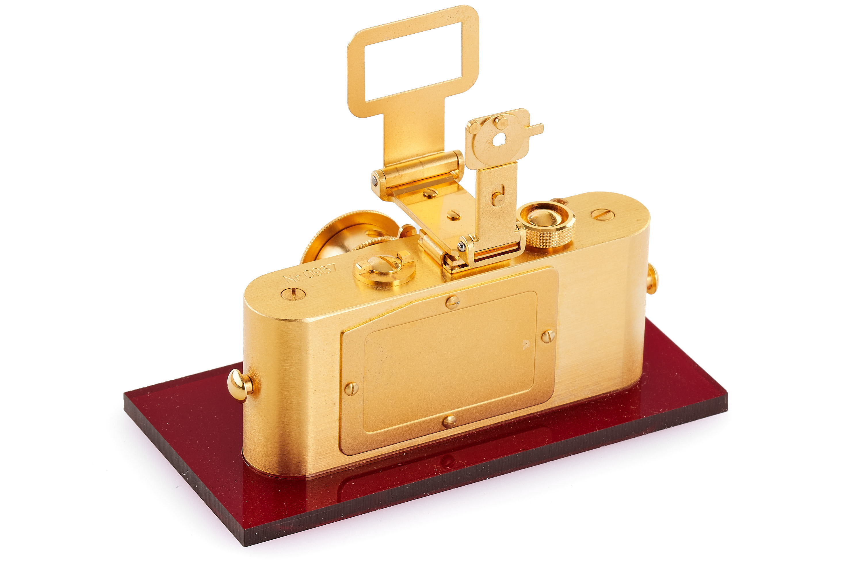 Beautiful complete set of 5x 24 carat gold plated replicas in scale 1:2 produced by Eurofoto in Sweden, including an Ur-Leica no.0967, Leica I no.1967, Leica 250 no.3967, Leica IIIf no 2967, Leica M3 no.4967, all in new condition, with all certificates of authenticity, brochure, maker's boxes and special wooden presentation box.