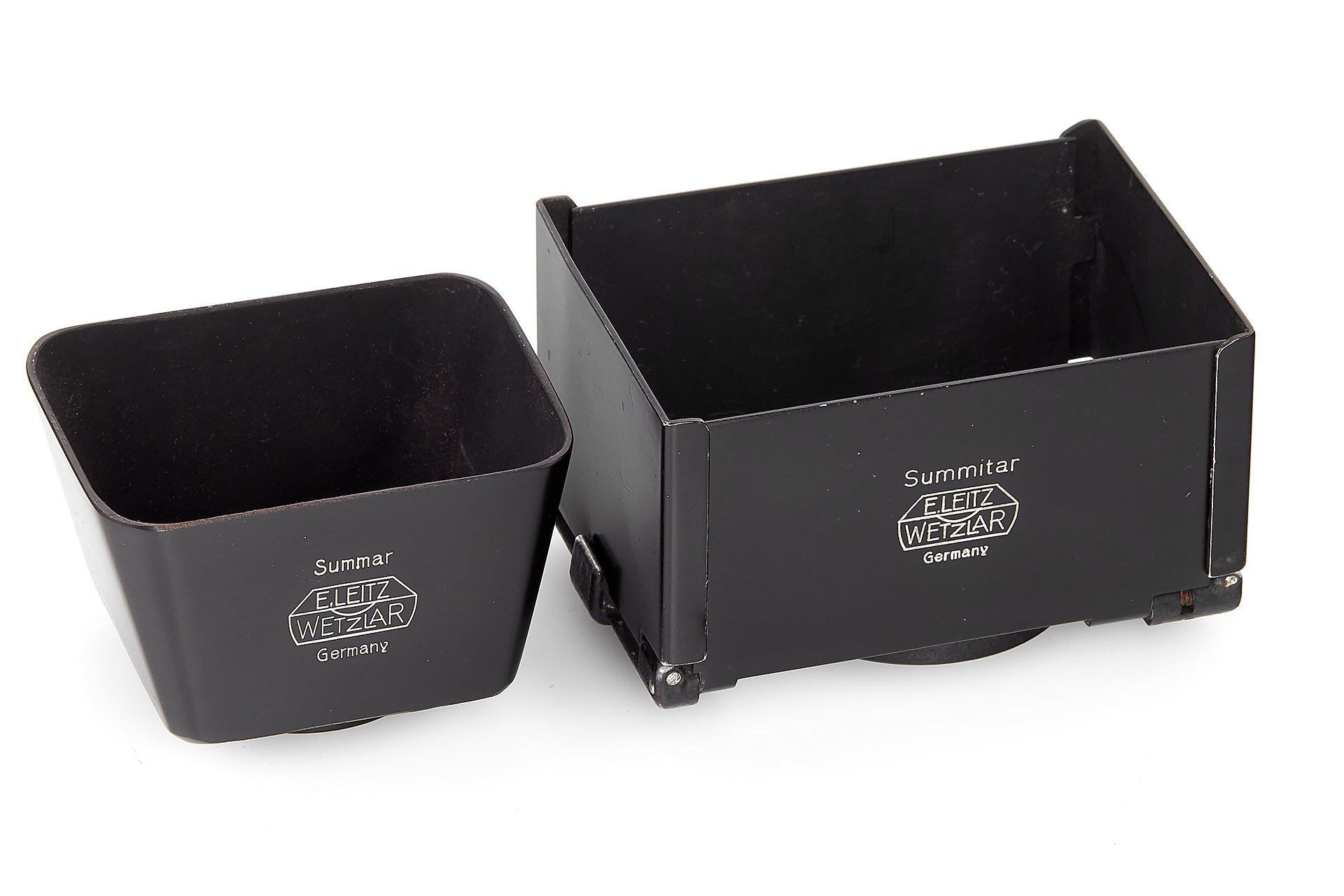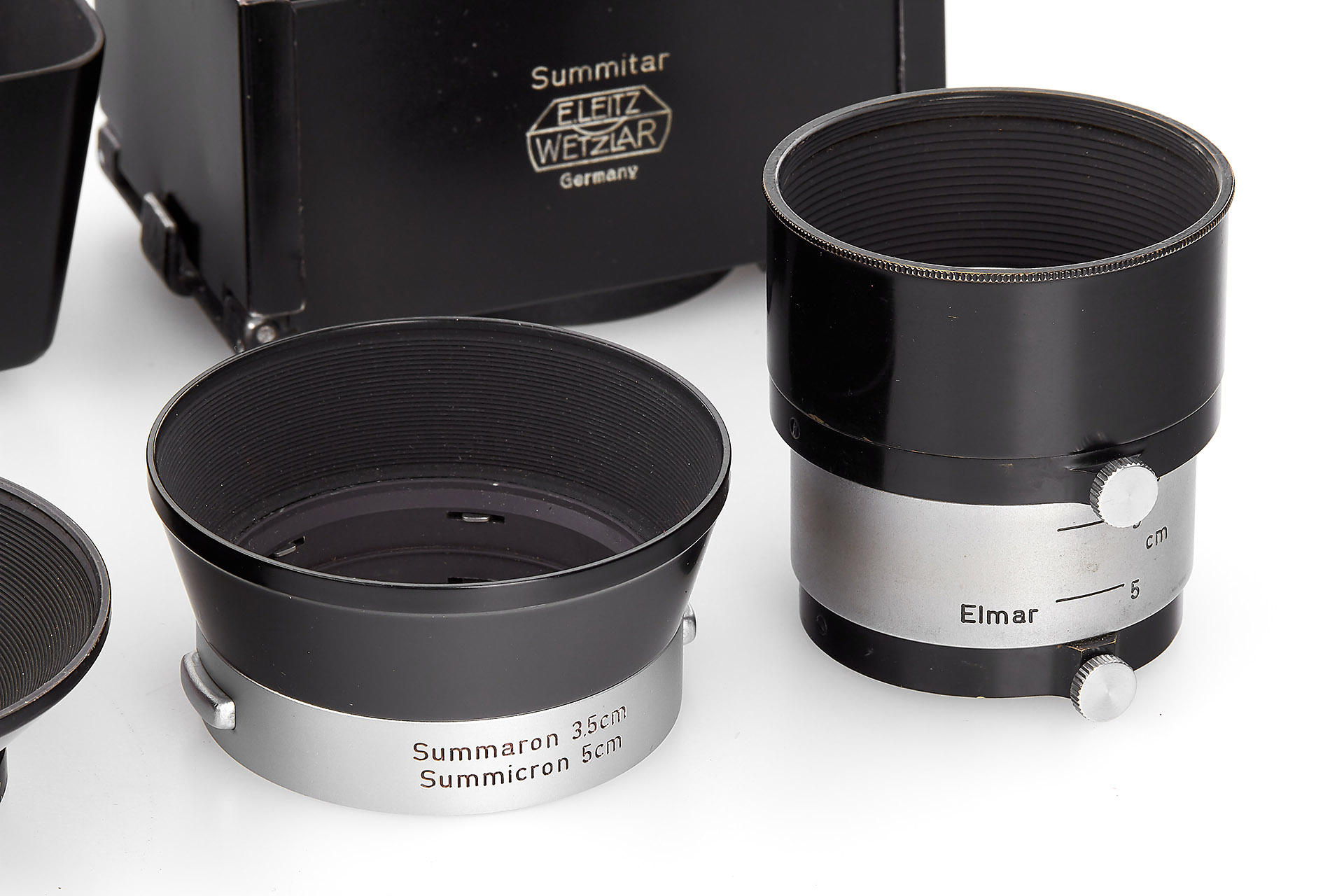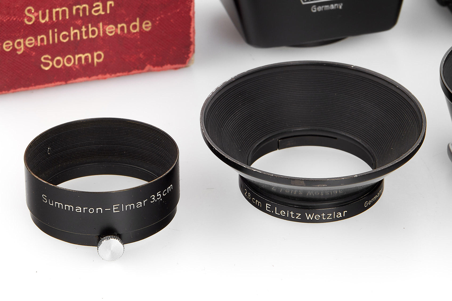 lot of six Leica hoods: (1) sought-after SOOHN hood for 2.8cm Hektor, (2) uncommon black FOOKH, (3) folding SOOPD hood, (4) black/chrome FIKUS, (5) IROOA, (6) boxed SOOMP - all in very good to mint condition
