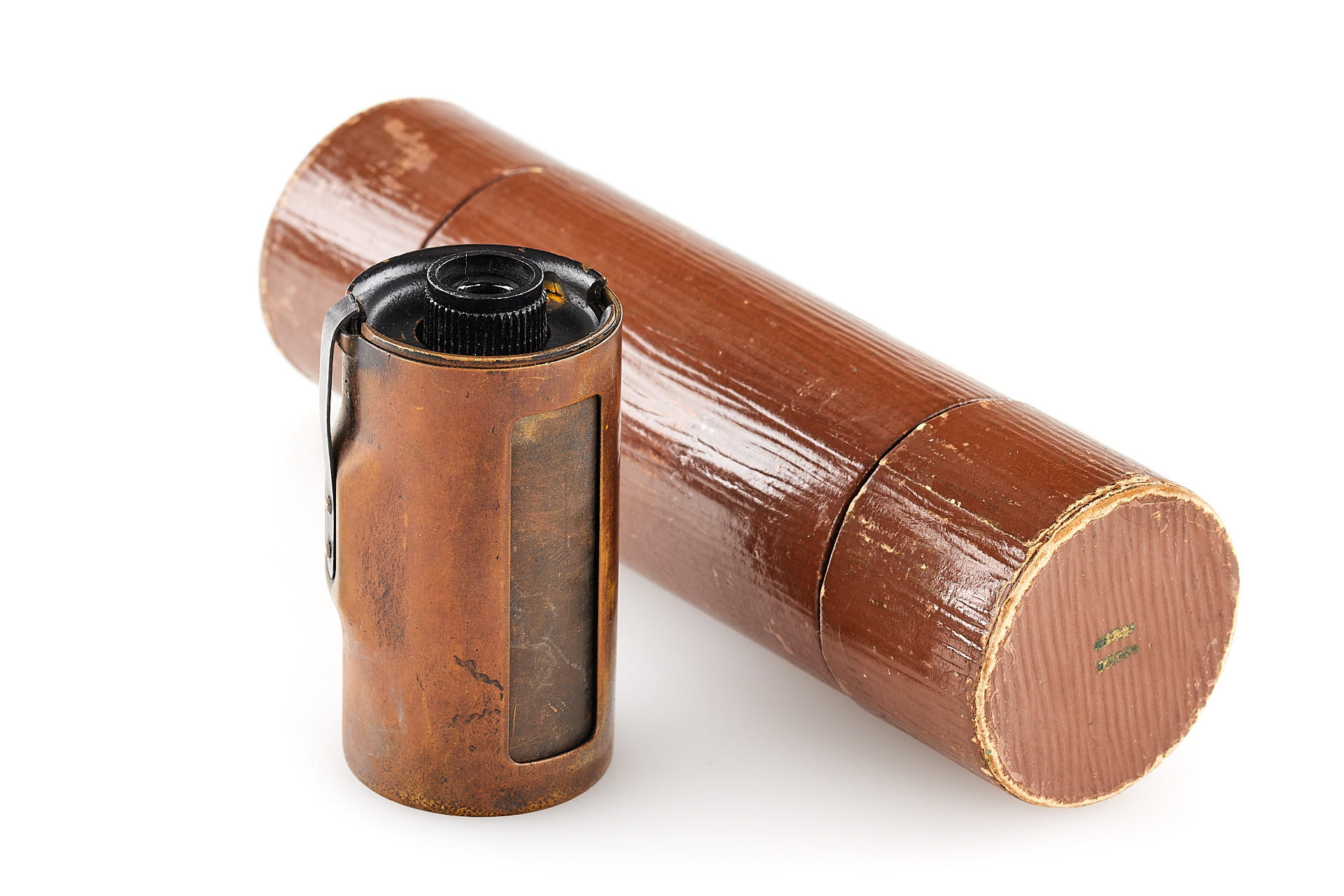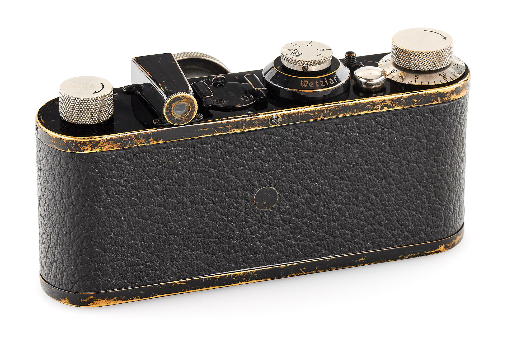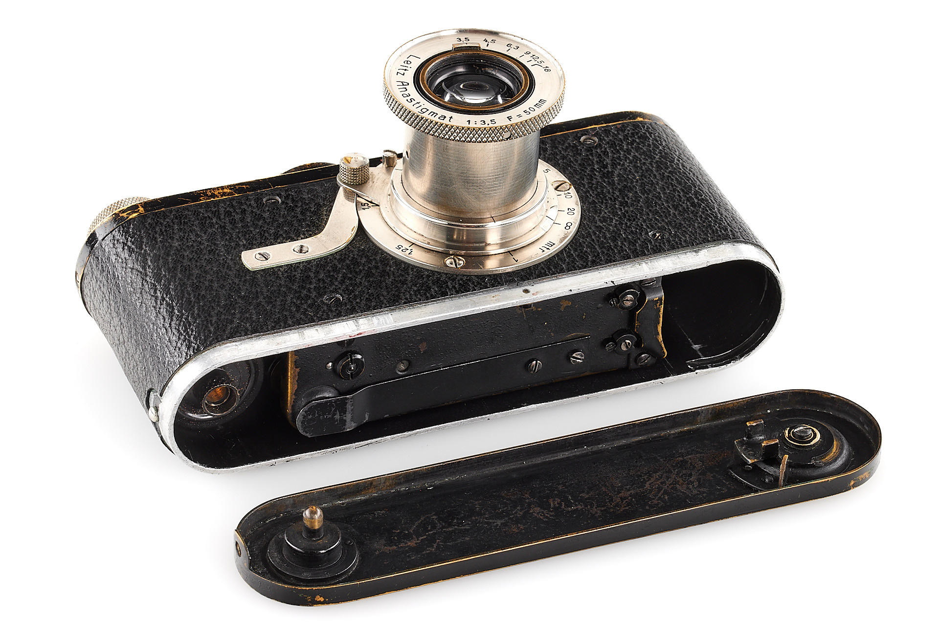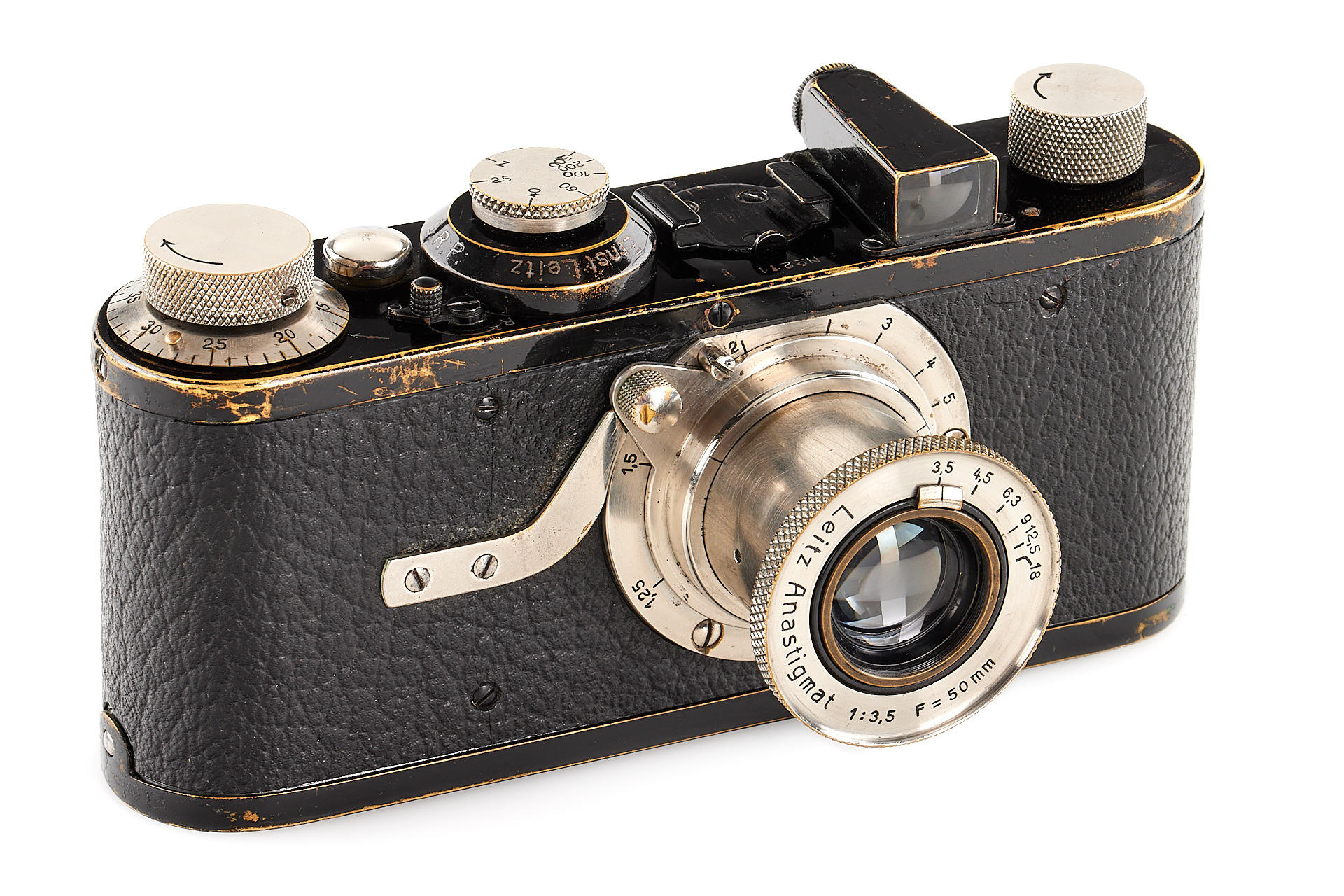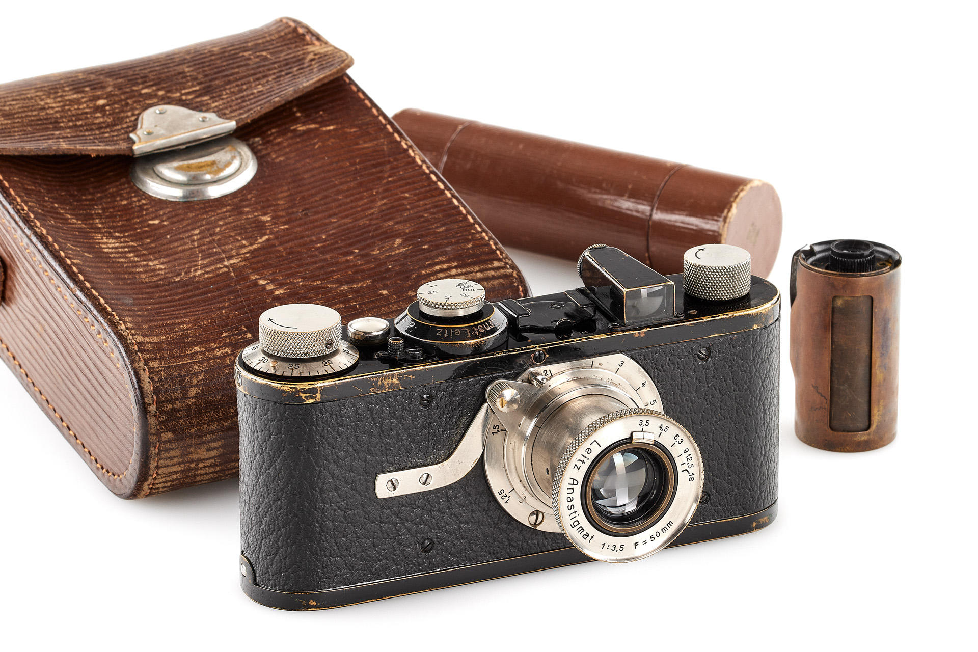 Authentic Leica model A with a 5-element Anastigmat lens, in extremely rare original condition, with all early matching features. This lot includes the earliest version ETRIN case in 'EPI' leather style, twin cassette container. Several versions of the Leica model A were produced, which differ primarily in their respective built-in lenses. The Leica model A with a 5-element 50 mm Anastigmat f/3.5 lens represents the first version of a regular production Leica camera. It was first introduced to the public at the Leipzig Spring Fair in 1925. Only about 155 of these cameras were built and delivered in 1925 (production started with number 126, the 0-Series cameras bearing numbers 101-125). The “Anastigmat” Leica is historically significant and in high demand among collectors. Finding an example in its original condition is extremely difficult today, as many early Leica cameras were later upgraded into more recent models.