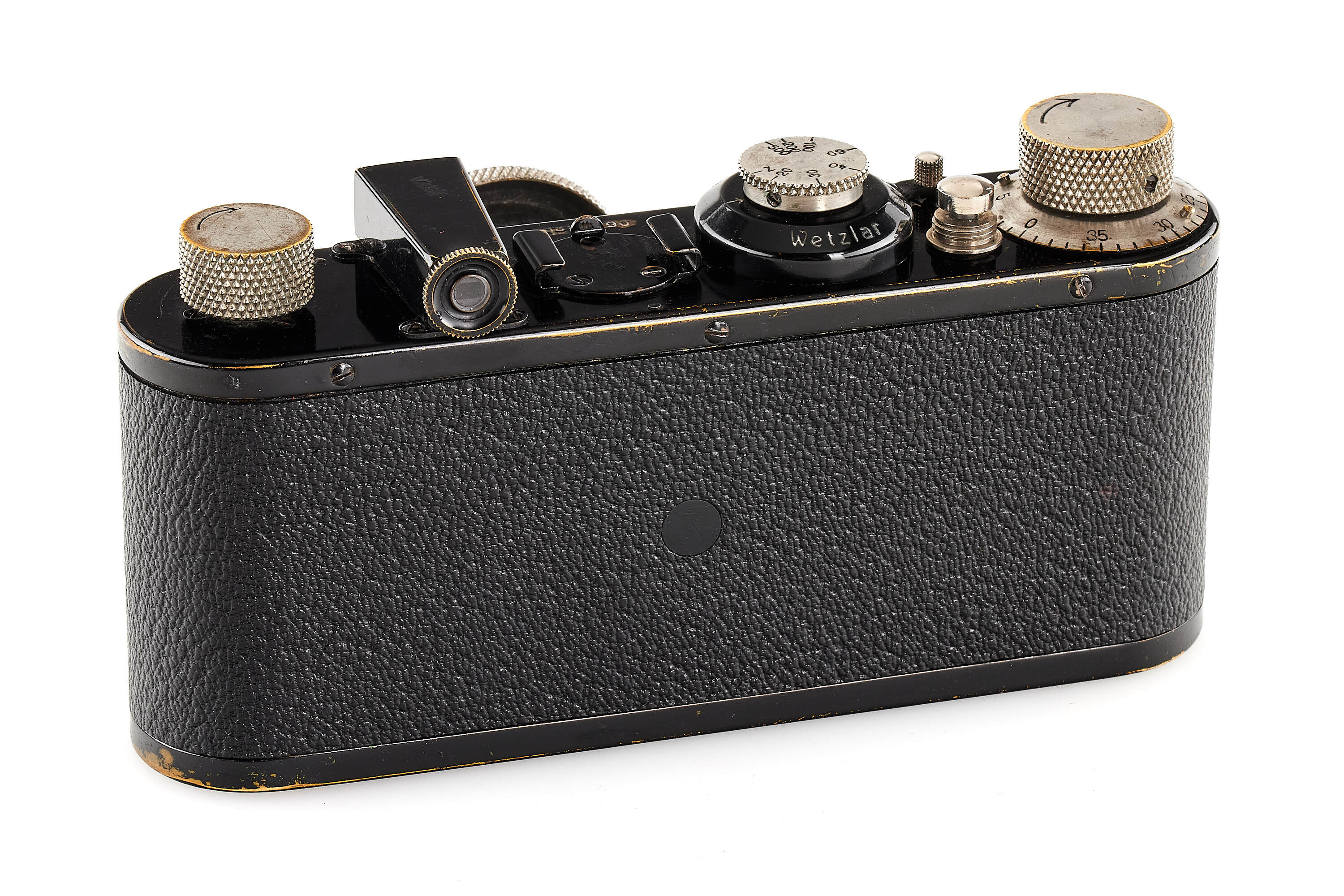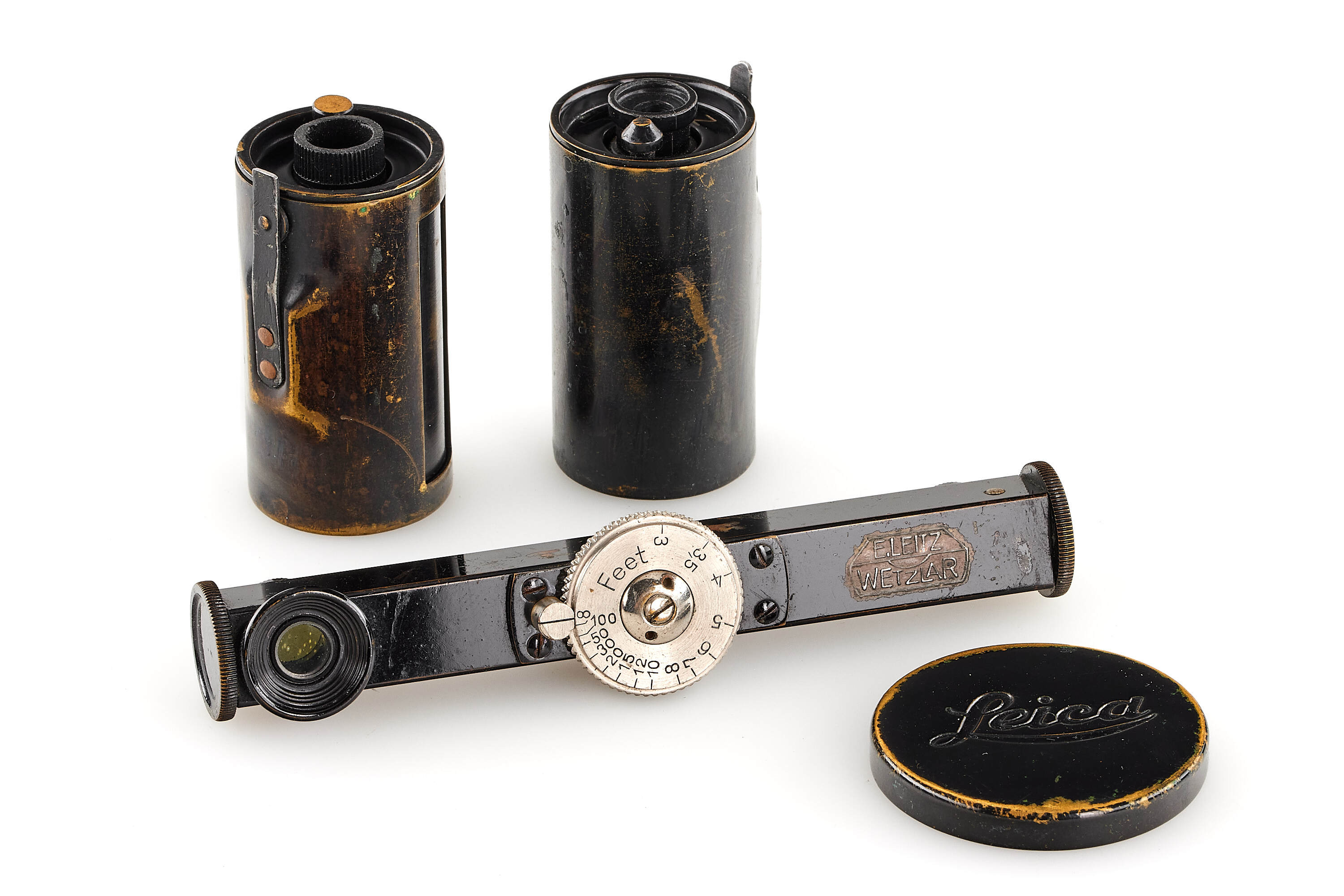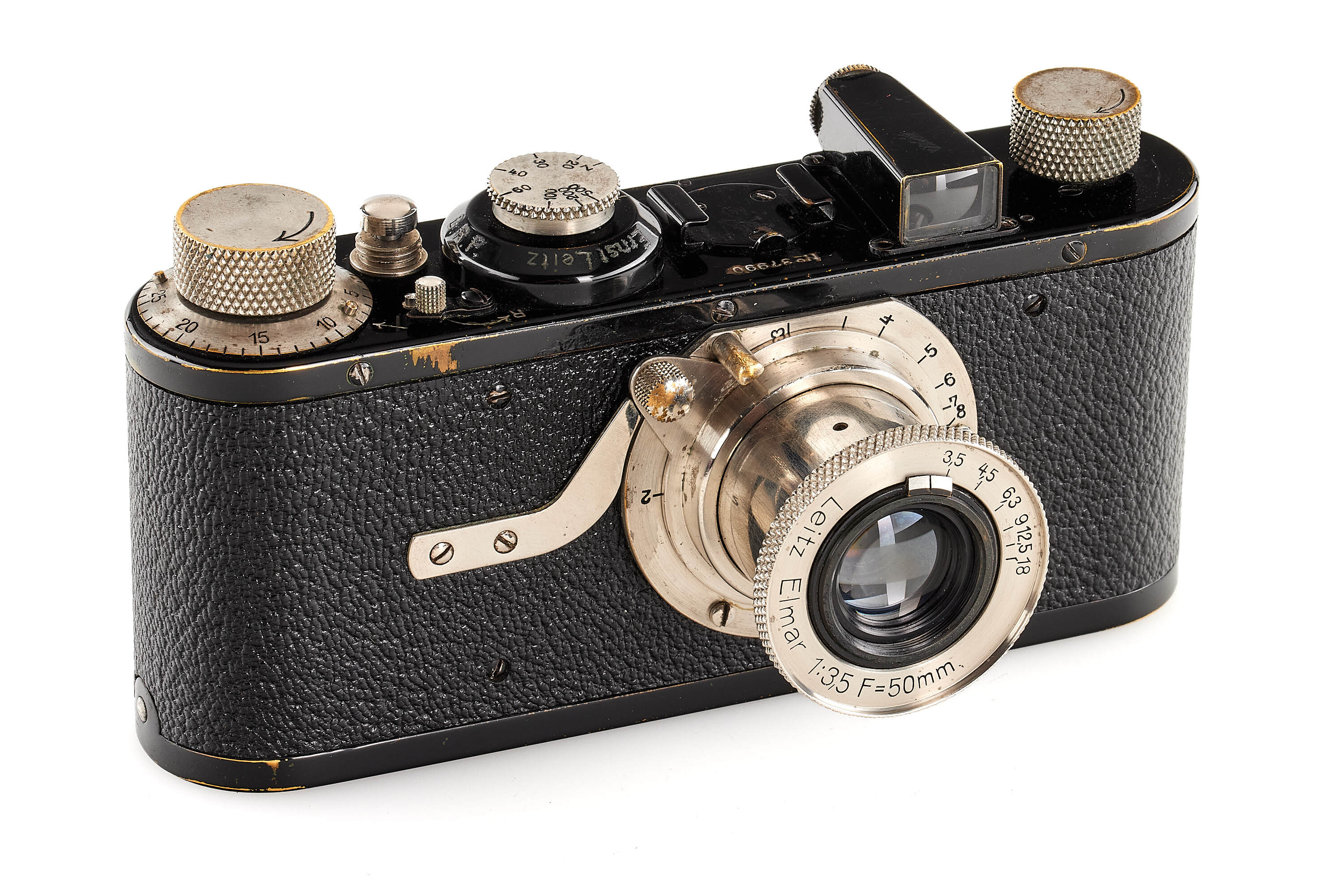 Nice 7th version (see von Einem 'Die 10 Varianten der klassischen Leica I A mit Elmar 1:3.5 F=50mm') in good, original condition, delivered to retailer Leisegang in Berlin on 09.04.1930, with close-focus Elmar 1:3.5 F=50mm in feet, focus until 1.5", base plate engraved with 'open-close', with FODIS rangefinder in feet, 3x film spools, black painted front lens cap, ETRIN leather case stamped with both Leitz and Leica, together with rare original dark red box.