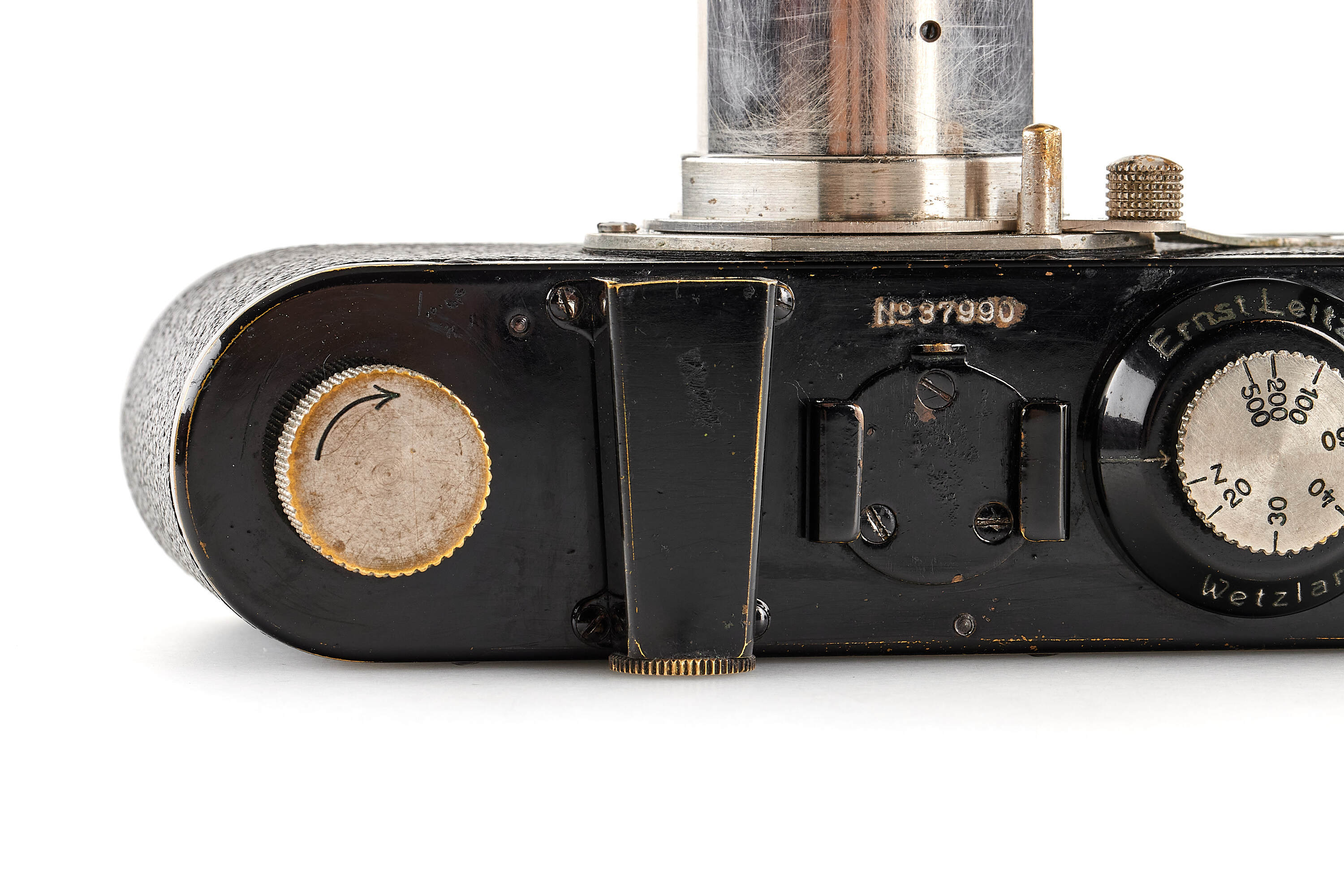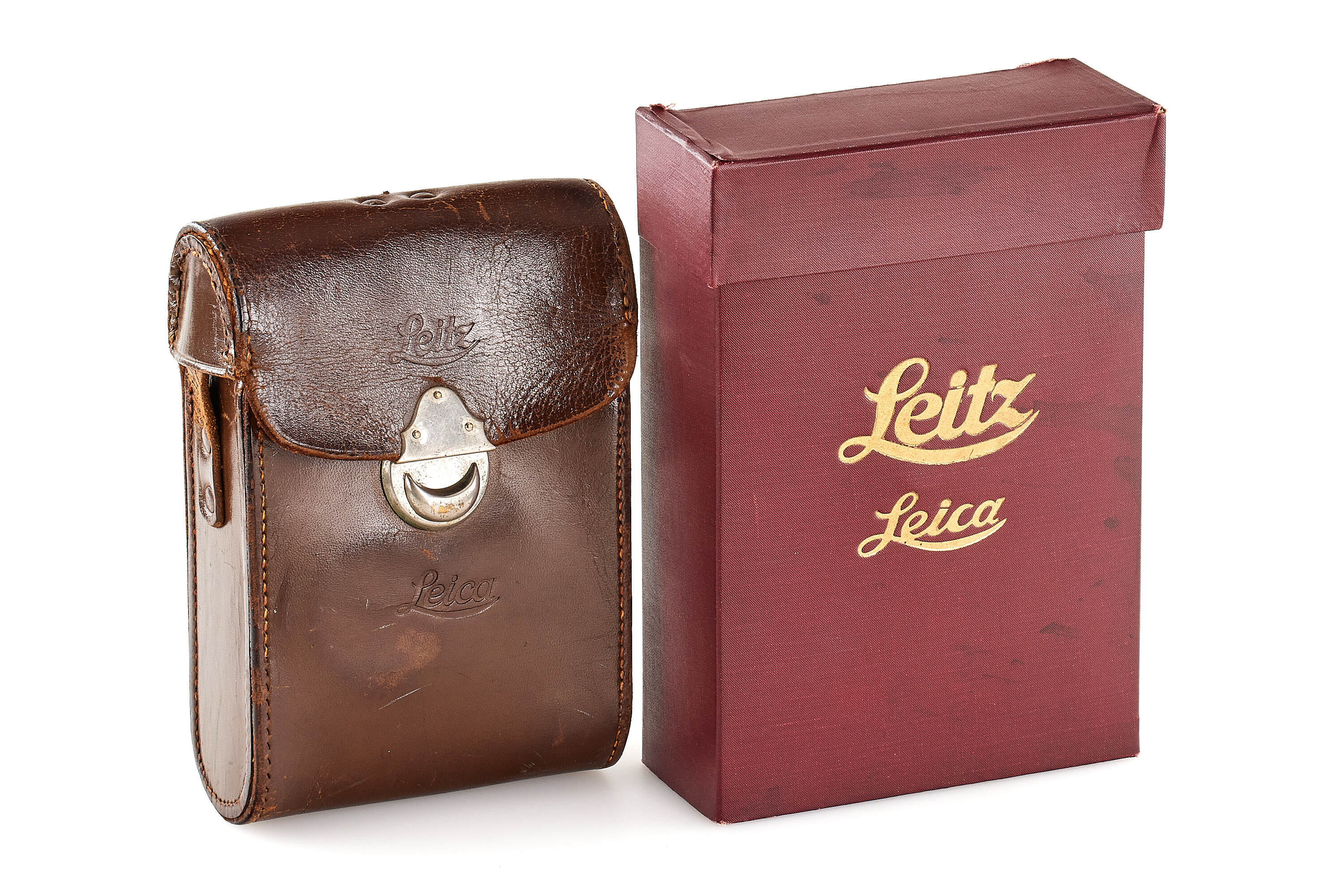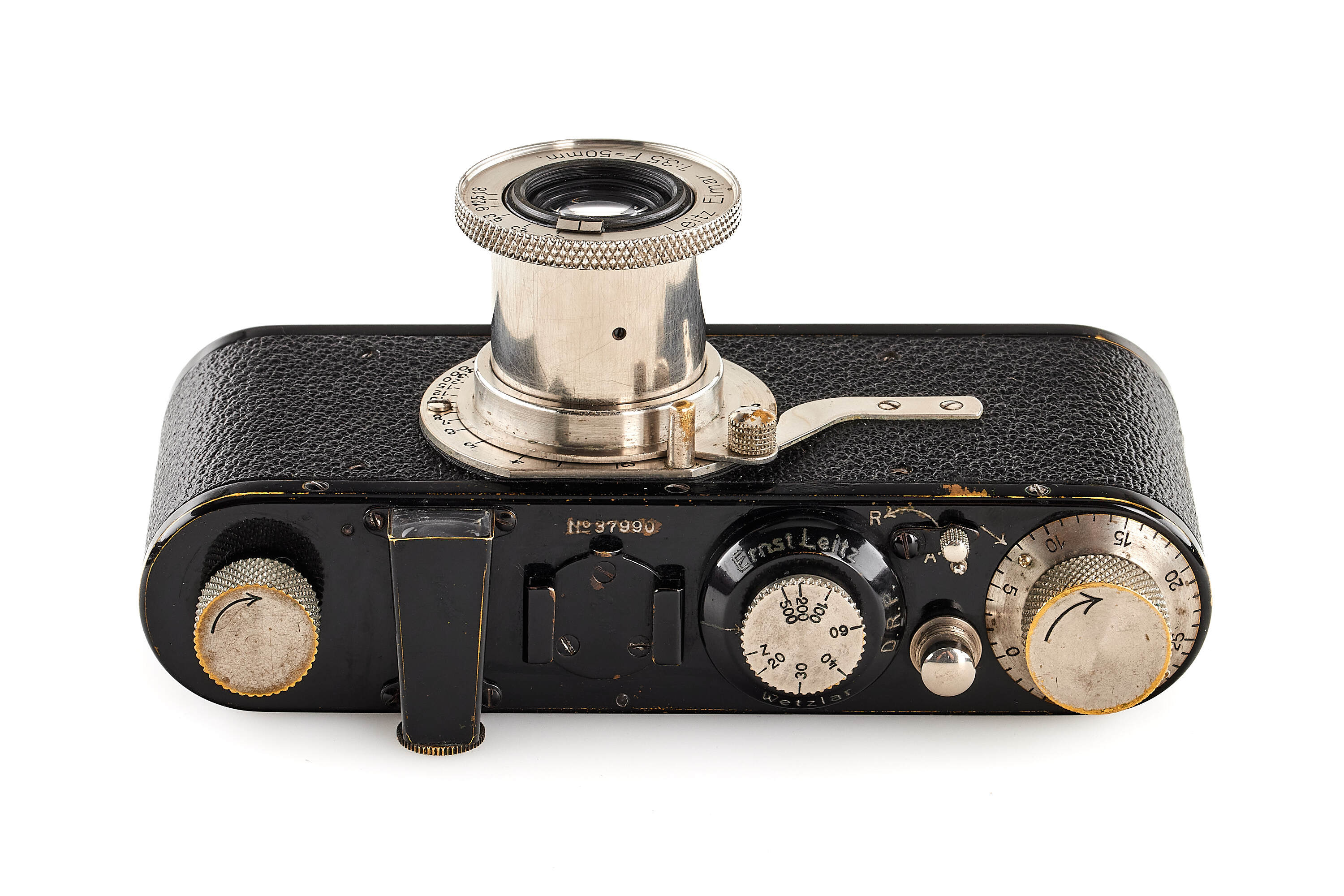 Nice 7th version (see von Einem 'Die 10 Varianten der klassischen Leica I A mit Elmar 1:3.5 F=50mm') in good, original condition, delivered to retailer Leisegang in Berlin on 09.04.1930, with close-focus Elmar 1:3.5 F=50mm in feet, focus until 1.5", base plate engraved with 'open-close', with FODIS rangefinder in feet, 3x film spools, black painted front lens cap, ETRIN leather case stamped with both Leitz and Leica, together with rare original dark red box.