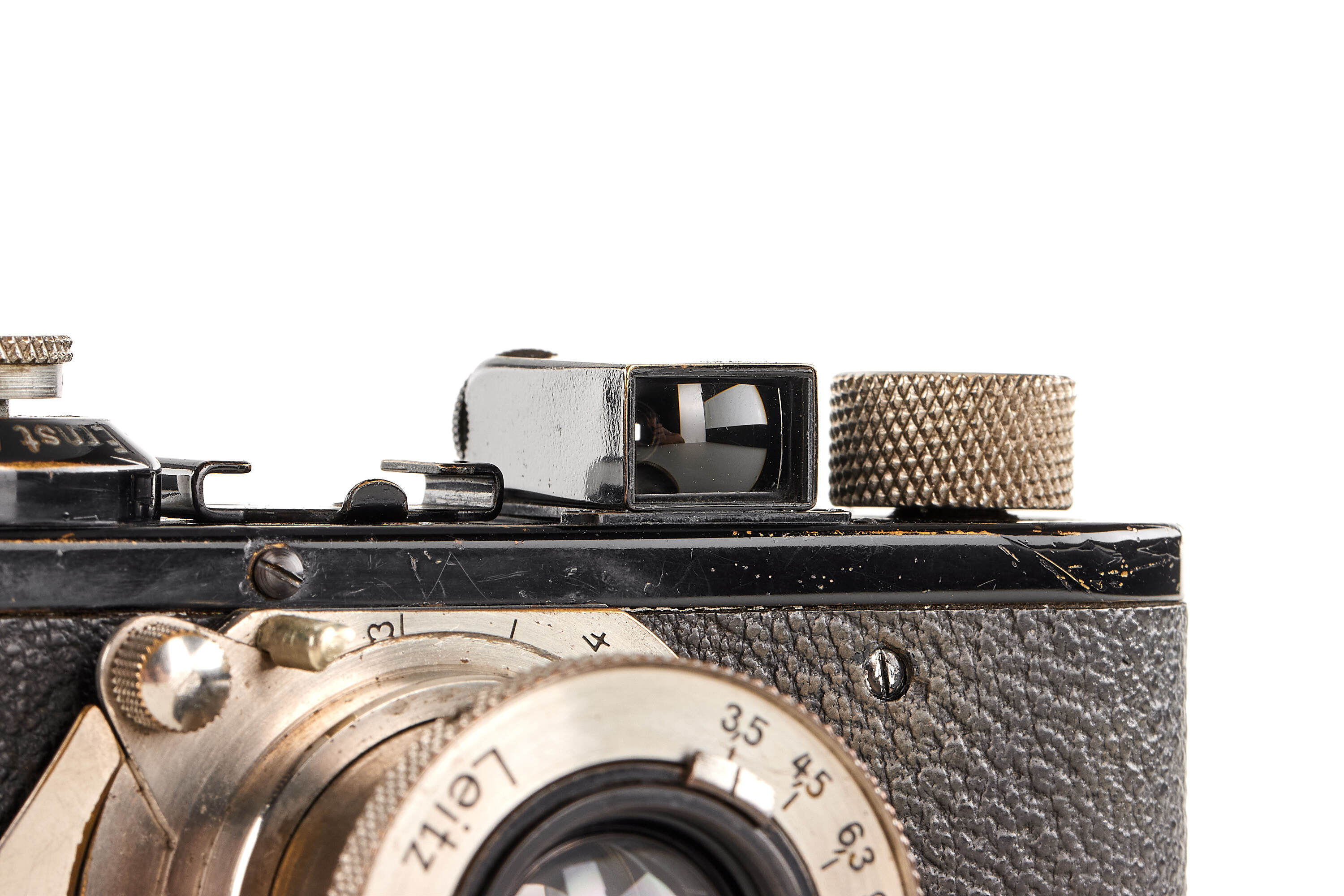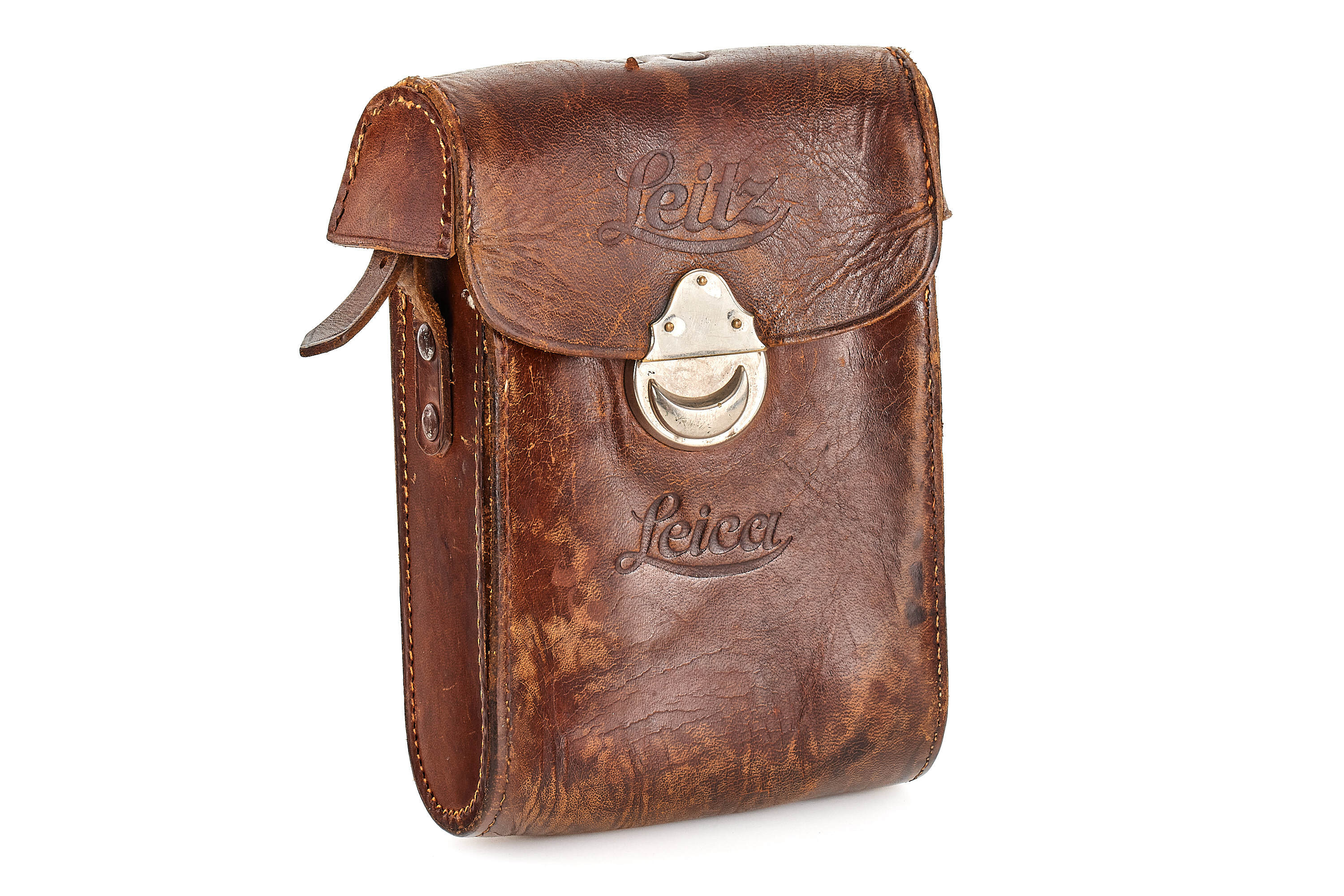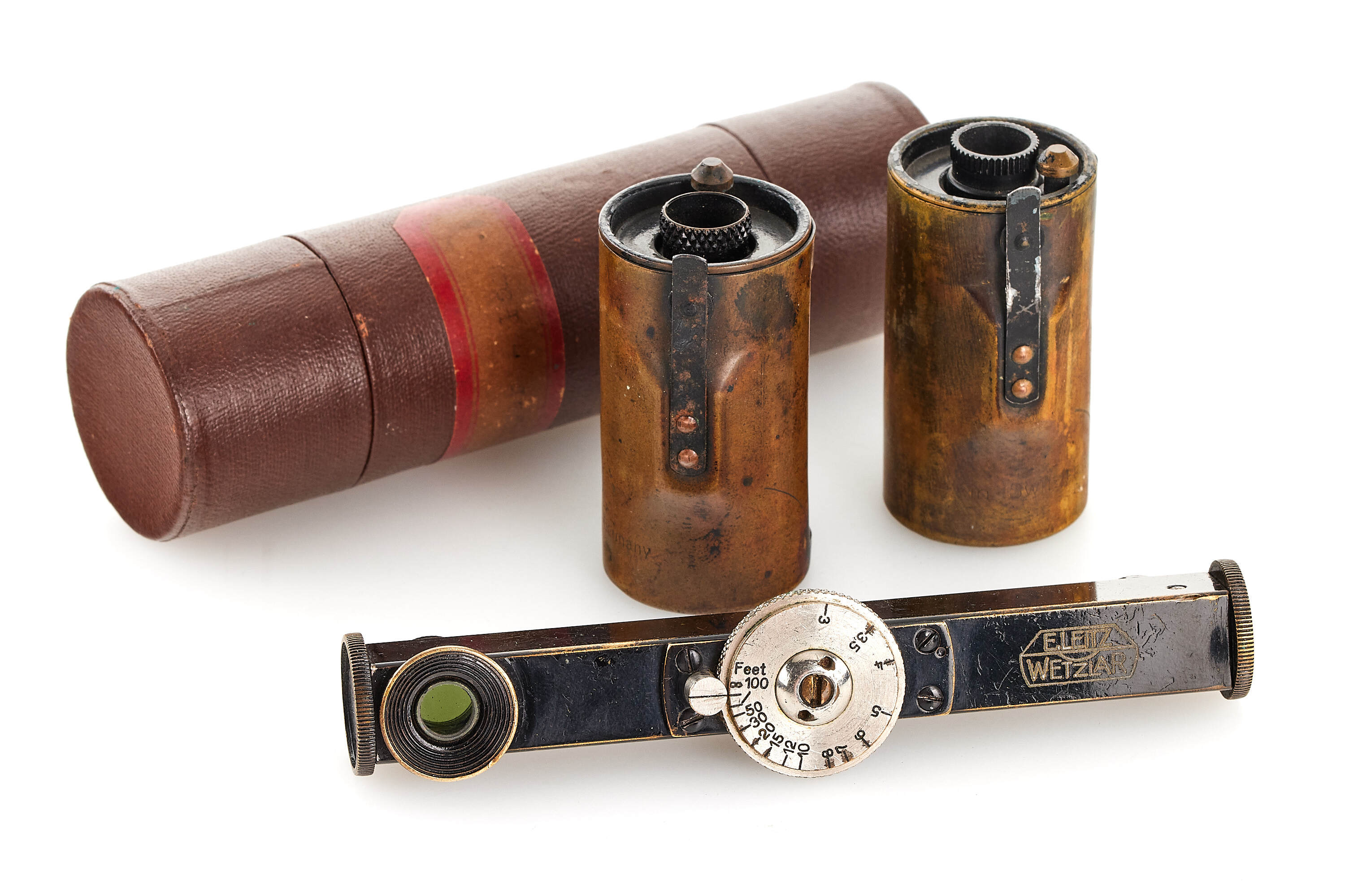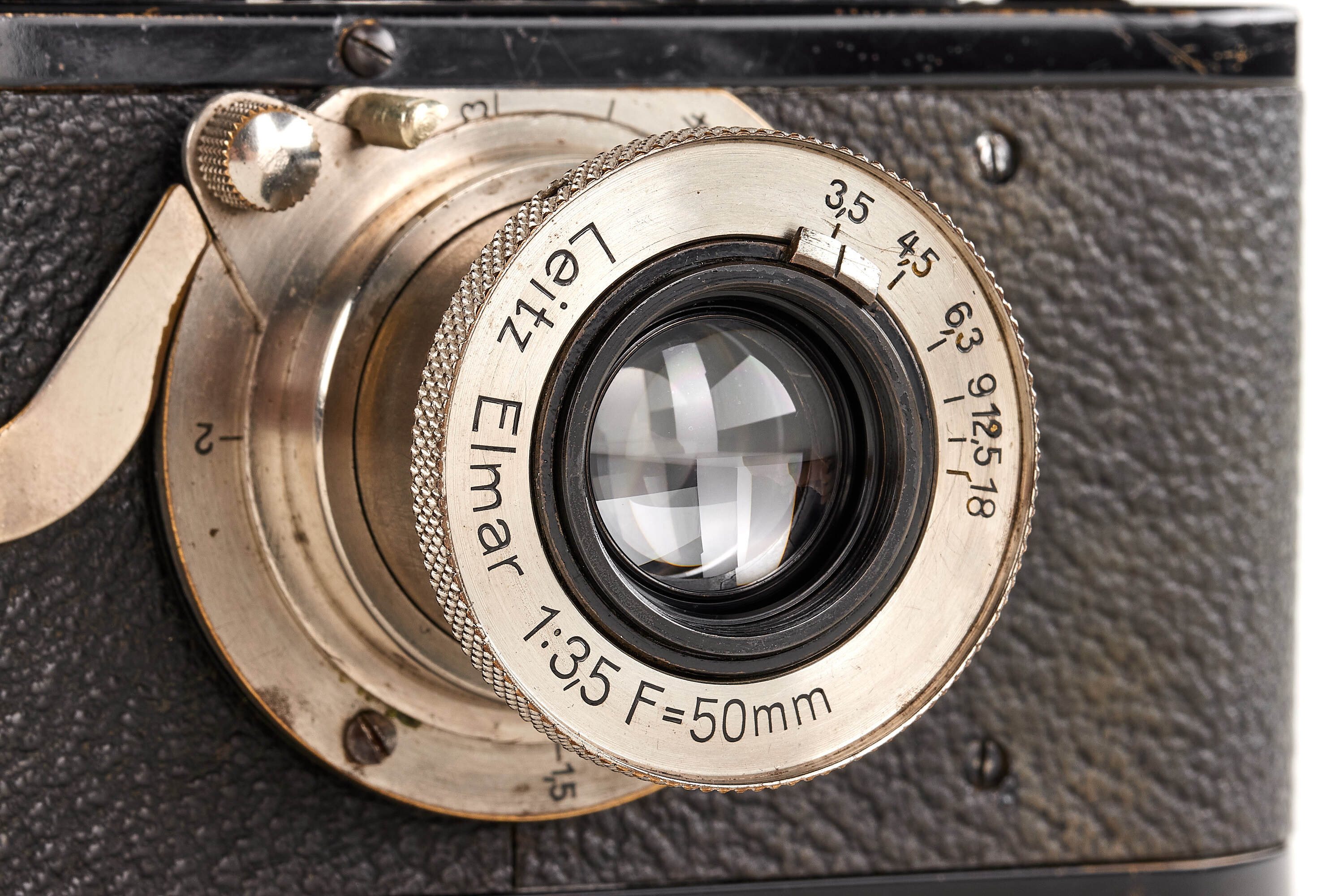 Nice 7th version (see von Einem 'Die 10 Varianten der klassischen Leica I A mit Elmar 1:3.5 F=50mm') in good condition, delivered to London on 06.06.1929, with close-focus Elmar 1:3.5 F=50mm in feet, focus until 1.5", front lens cap (with custom made hole and polished), base plate engraved with 'open-close', with 2x film magazines in cardboard canister, FODIS rangefinder no.13488 in feet scale, together in ETRIN leather case stamped with both Leitz and Leica.