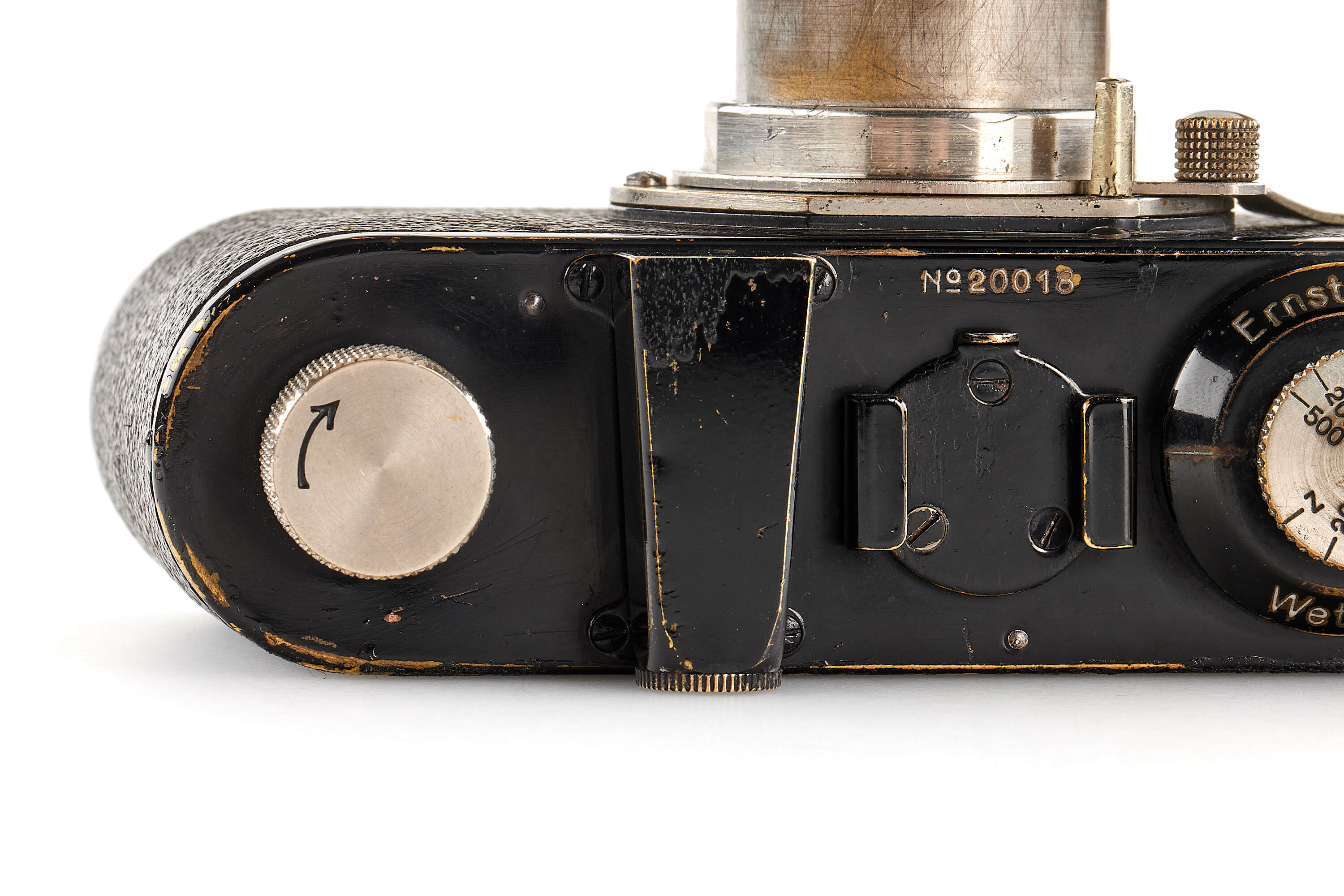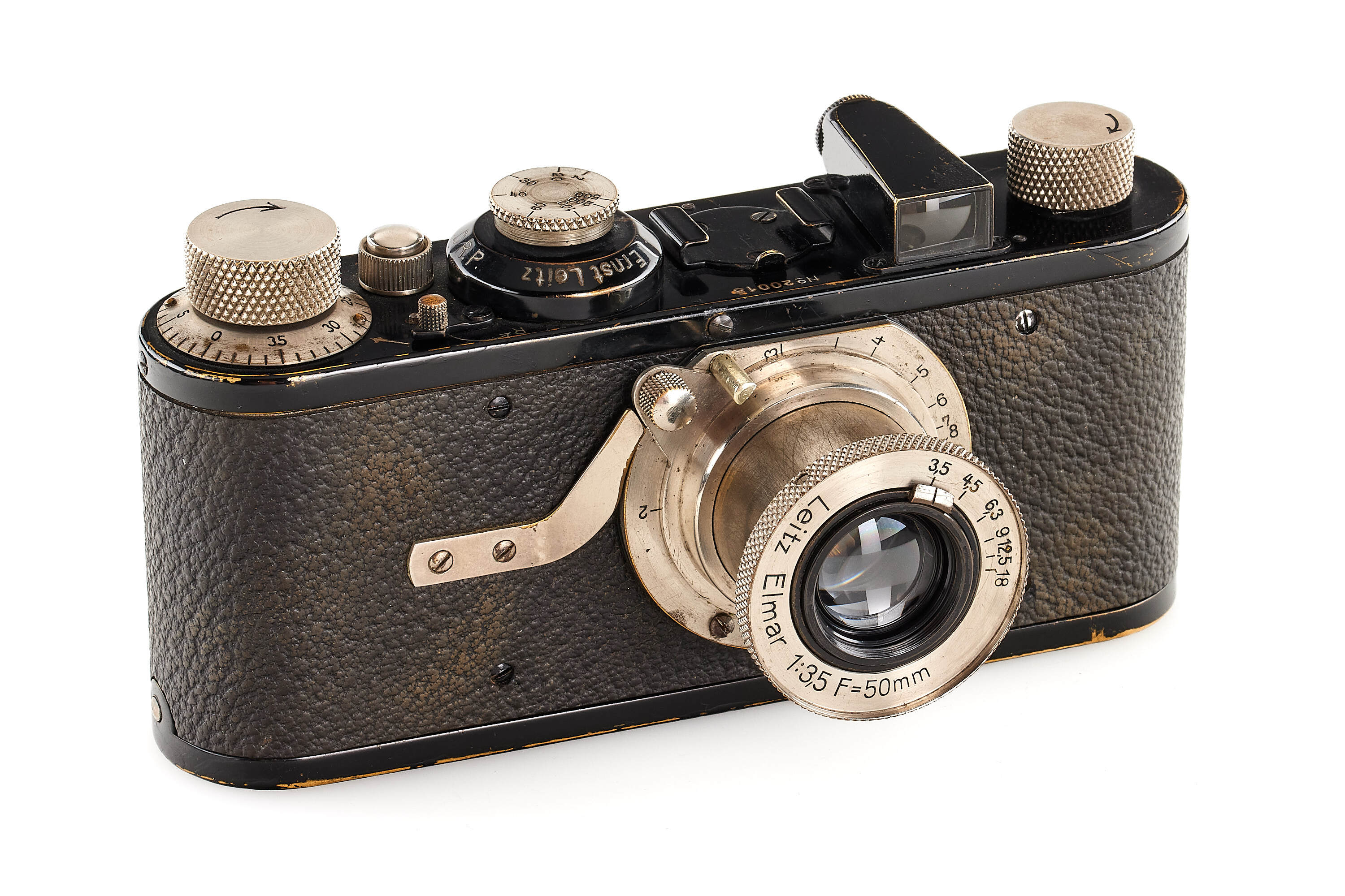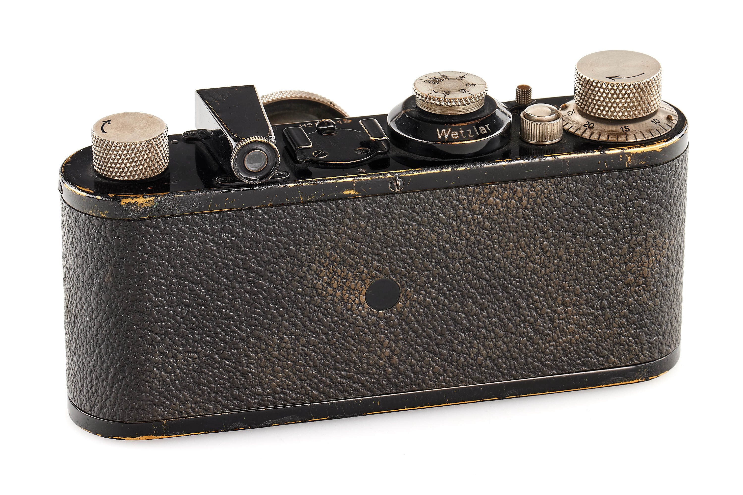 Nice 7th version (see von Einem 'Die 10 Varianten der klassischen Leica I A mit Elmar 1:3.5 F=50mm') in good condition, delivered to London on 06.06.1929, with close-focus Elmar 1:3.5 F=50mm in feet, focus until 1.5", front lens cap (with custom made hole and polished), base plate engraved with 'open-close', with 2x film magazines in cardboard canister, FODIS rangefinder no.13488 in feet scale, together in ETRIN leather case stamped with both Leitz and Leica.