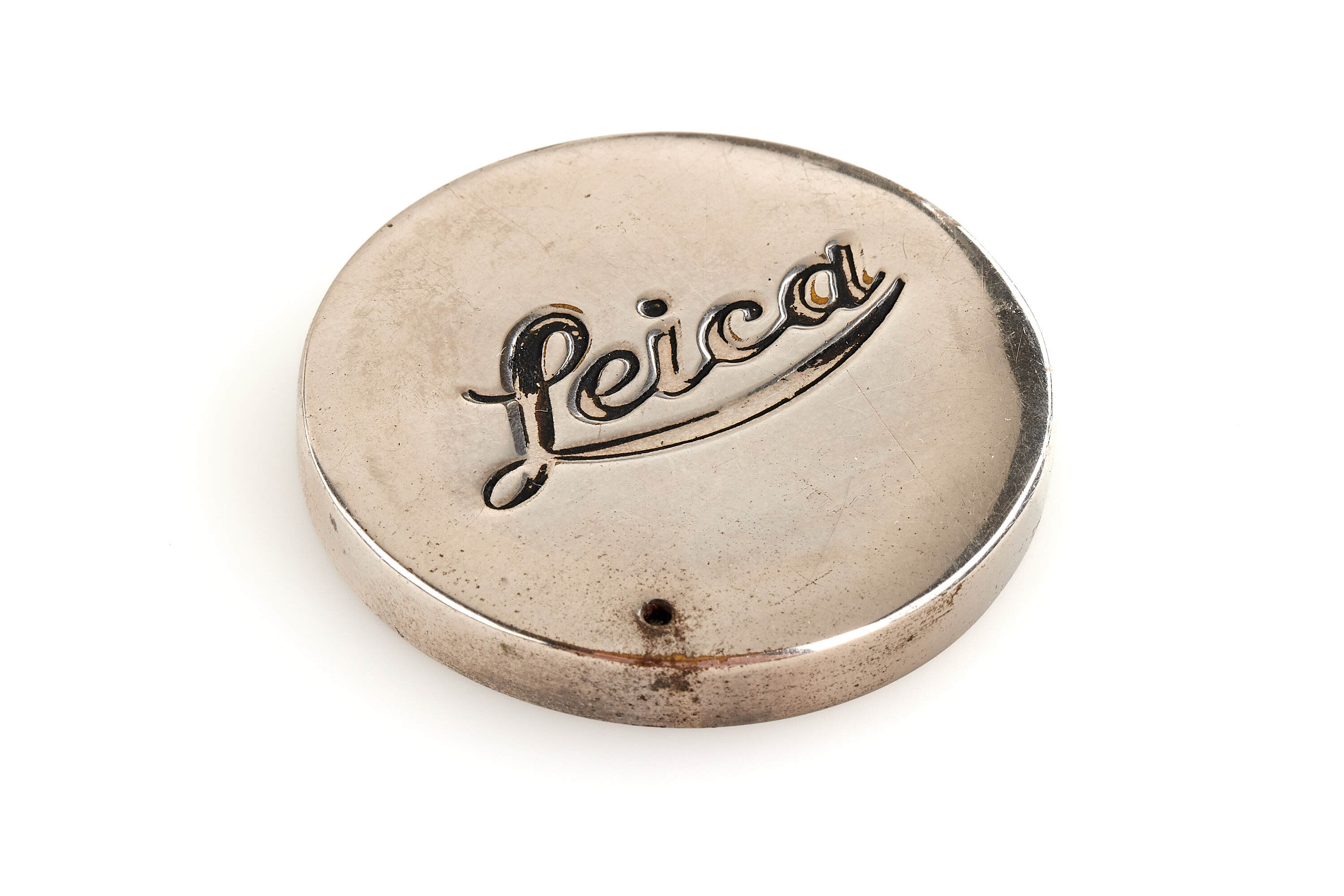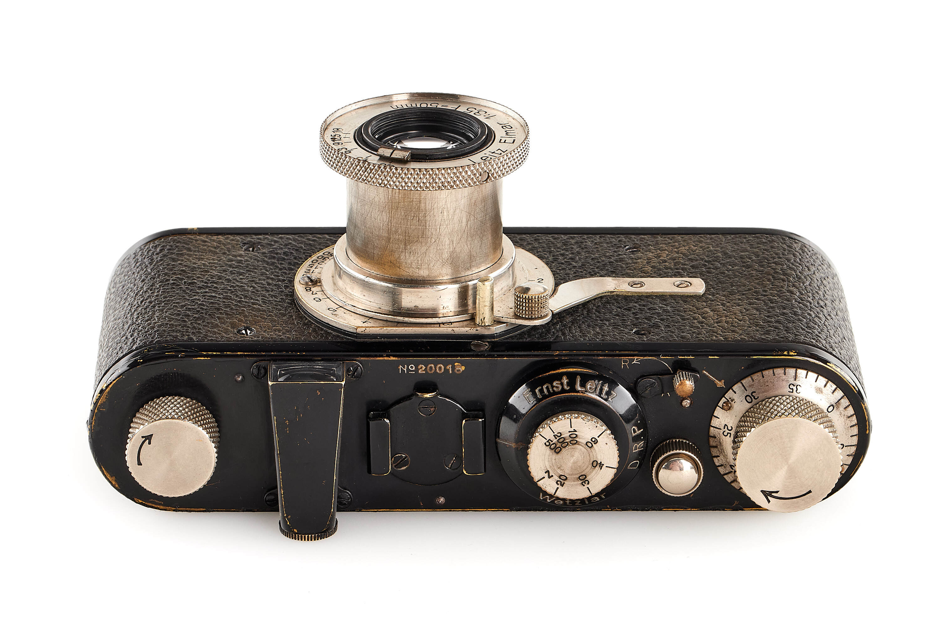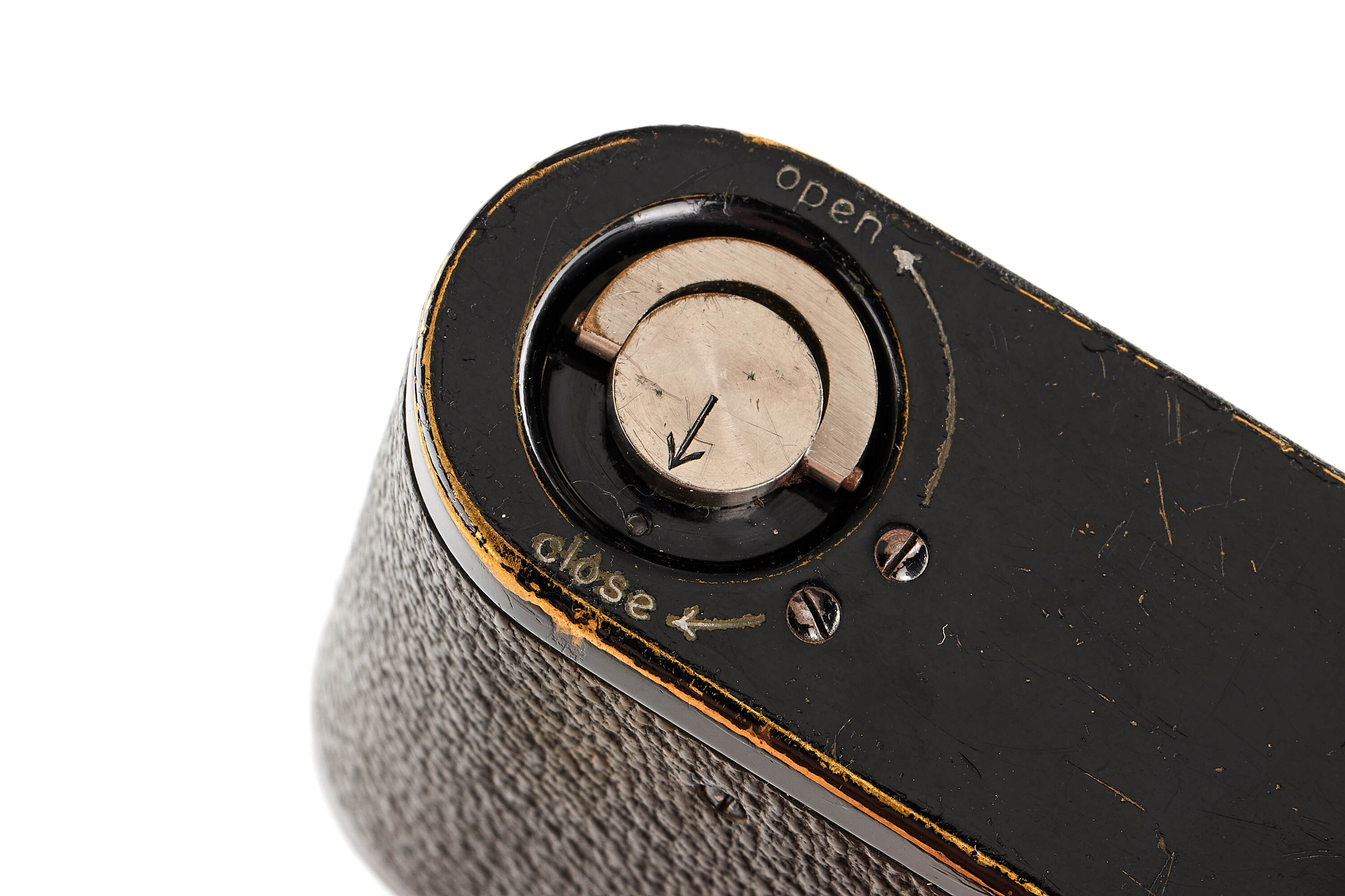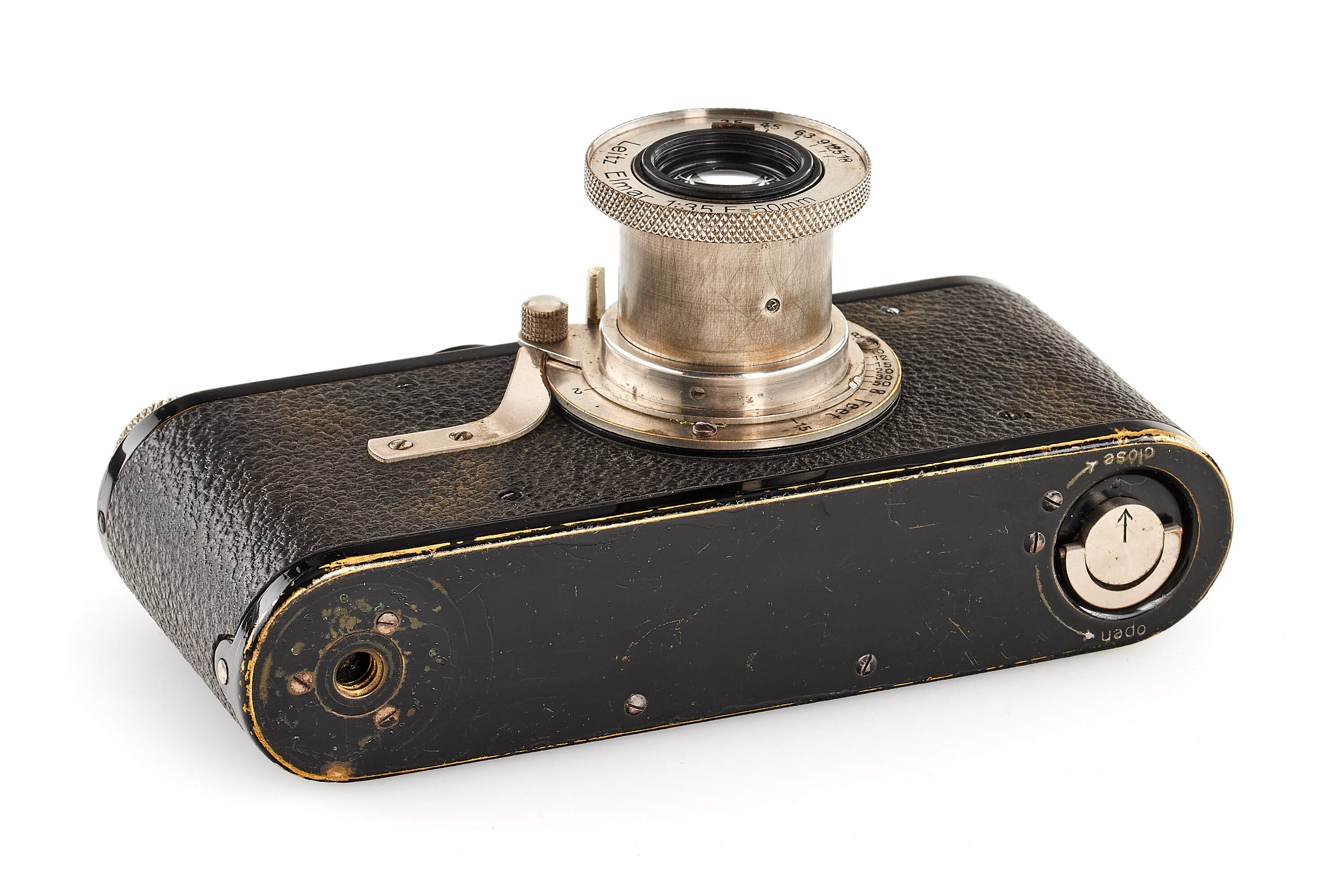 Nice 7th version (see von Einem 'Die 10 Varianten der klassischen Leica I A mit Elmar 1:3.5 F=50mm') in good condition, delivered to London on 06.06.1929, with close-focus Elmar 1:3.5 F=50mm in feet, focus until 1.5", front lens cap (with custom made hole and polished), base plate engraved with 'open-close', with 2x film magazines in cardboard canister, FODIS rangefinder no.13488 in feet scale, together in ETRIN leather case stamped with both Leitz and Leica.