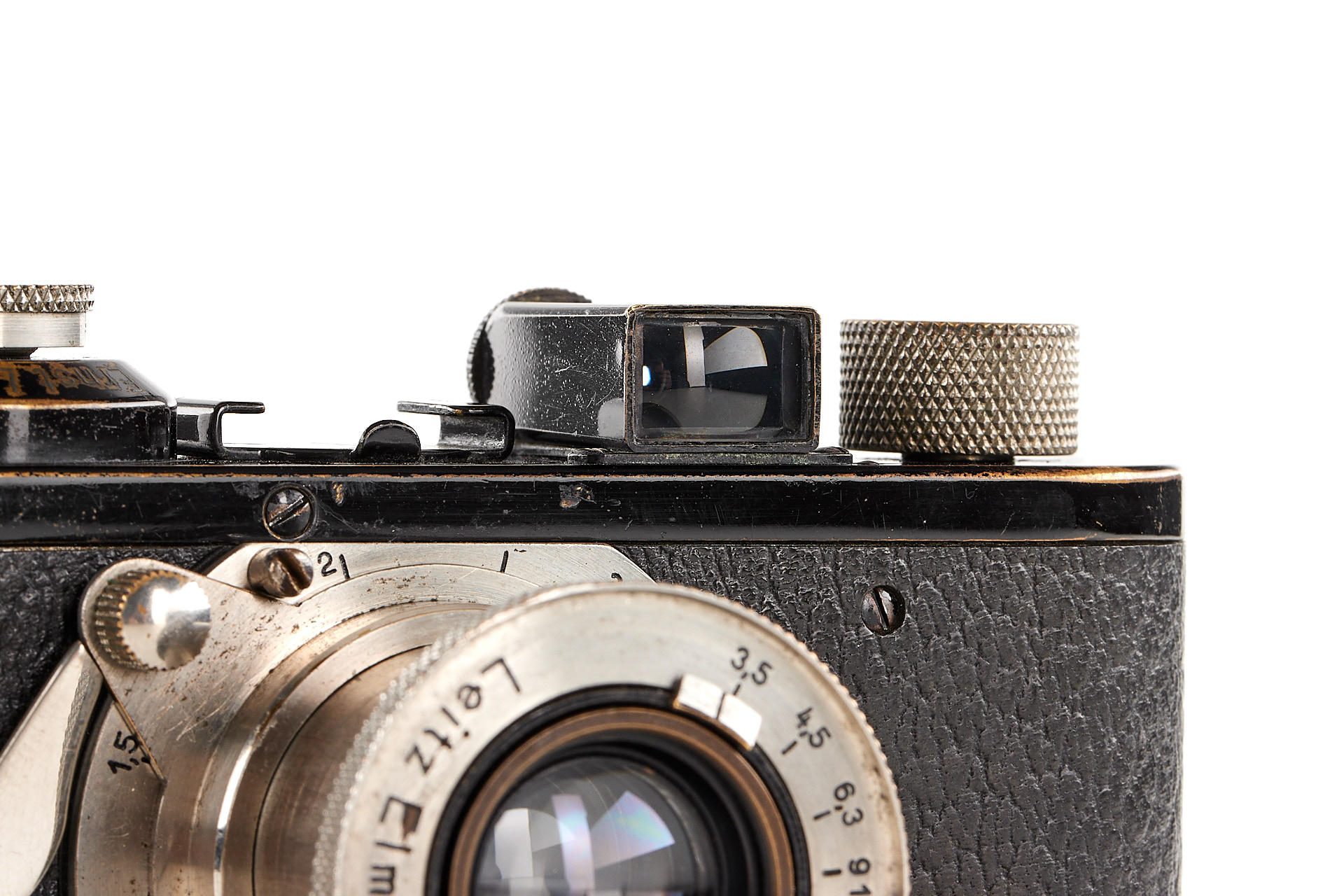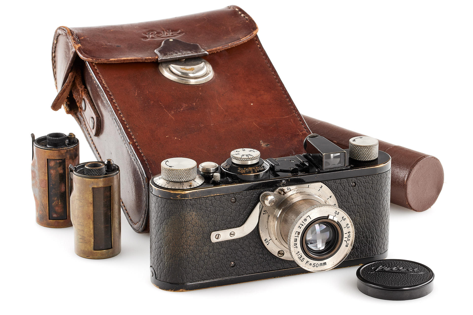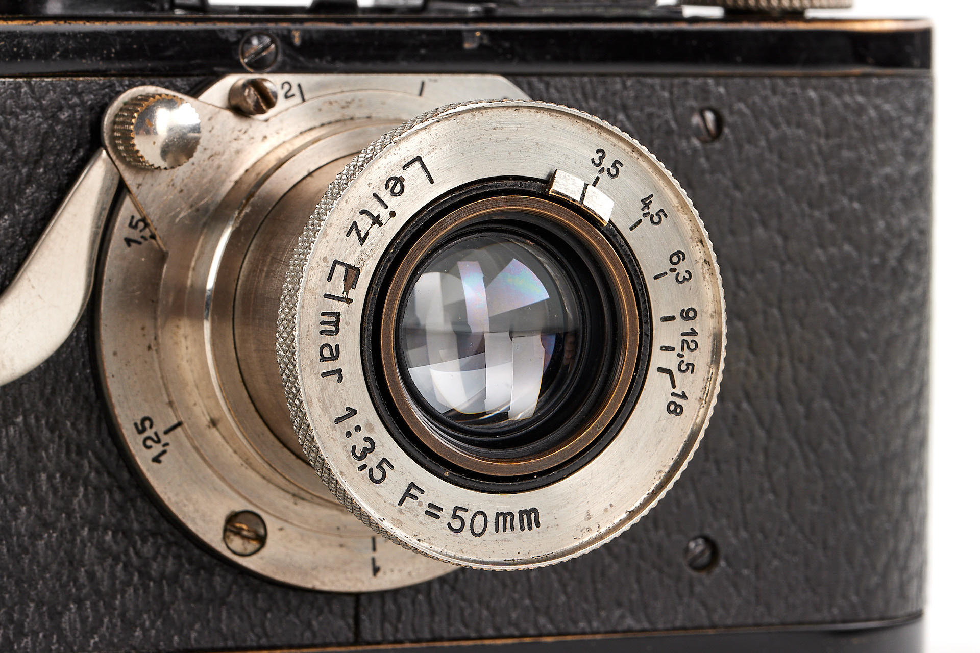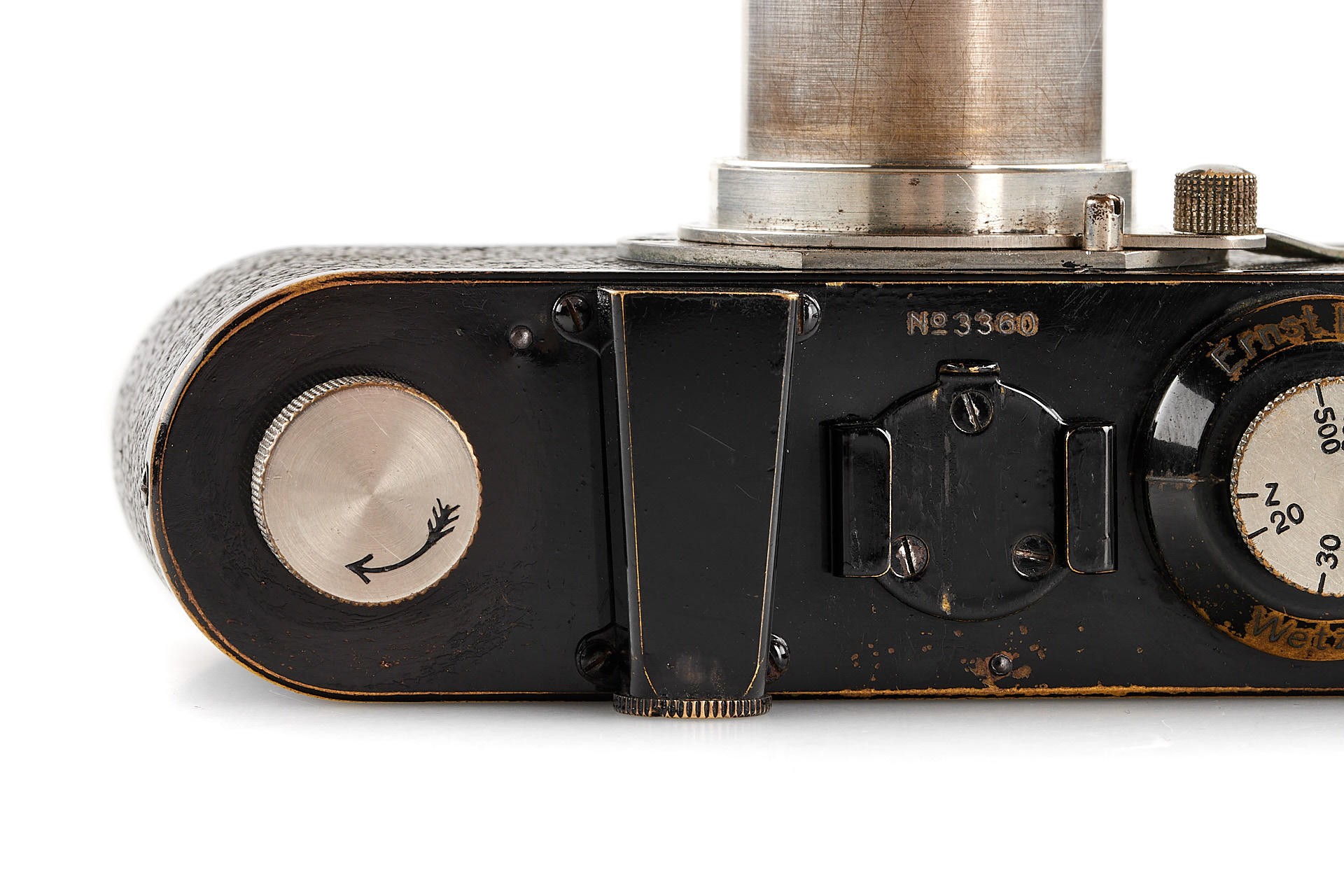 rare early Leica I with Elmar, 2nd version (see von Einem 'Die 10 Varianten der klassischen Leica I A mit Elmar 1:3.5 F=50mm') in good, original condition and working order, with mushroom type release button and feathered arrows on both winding and rewinding cranks, together with ETRIN case (cond. B), 2x spools and bakelite front cap, first delivered to Dresden on 31.5.1927