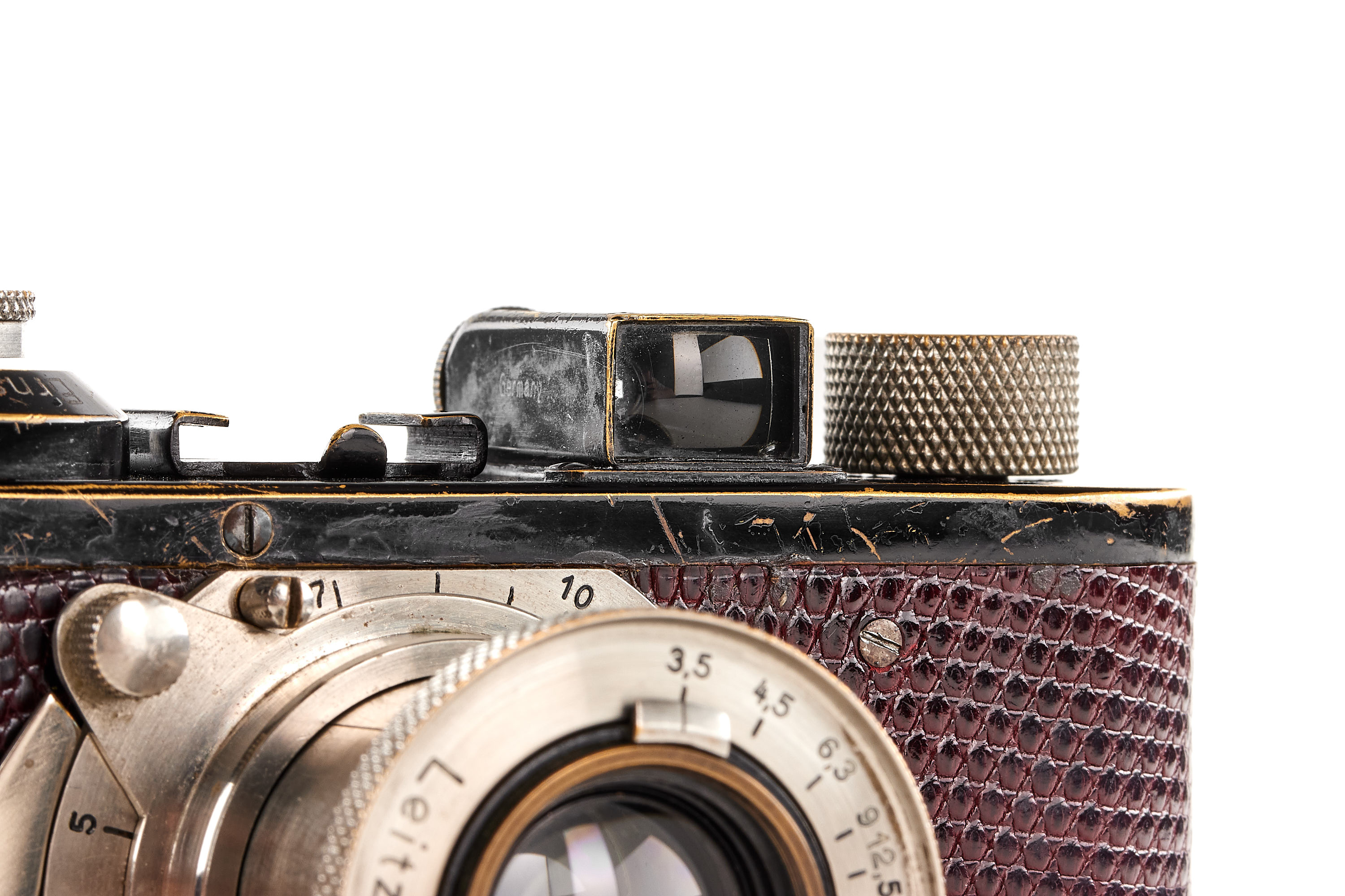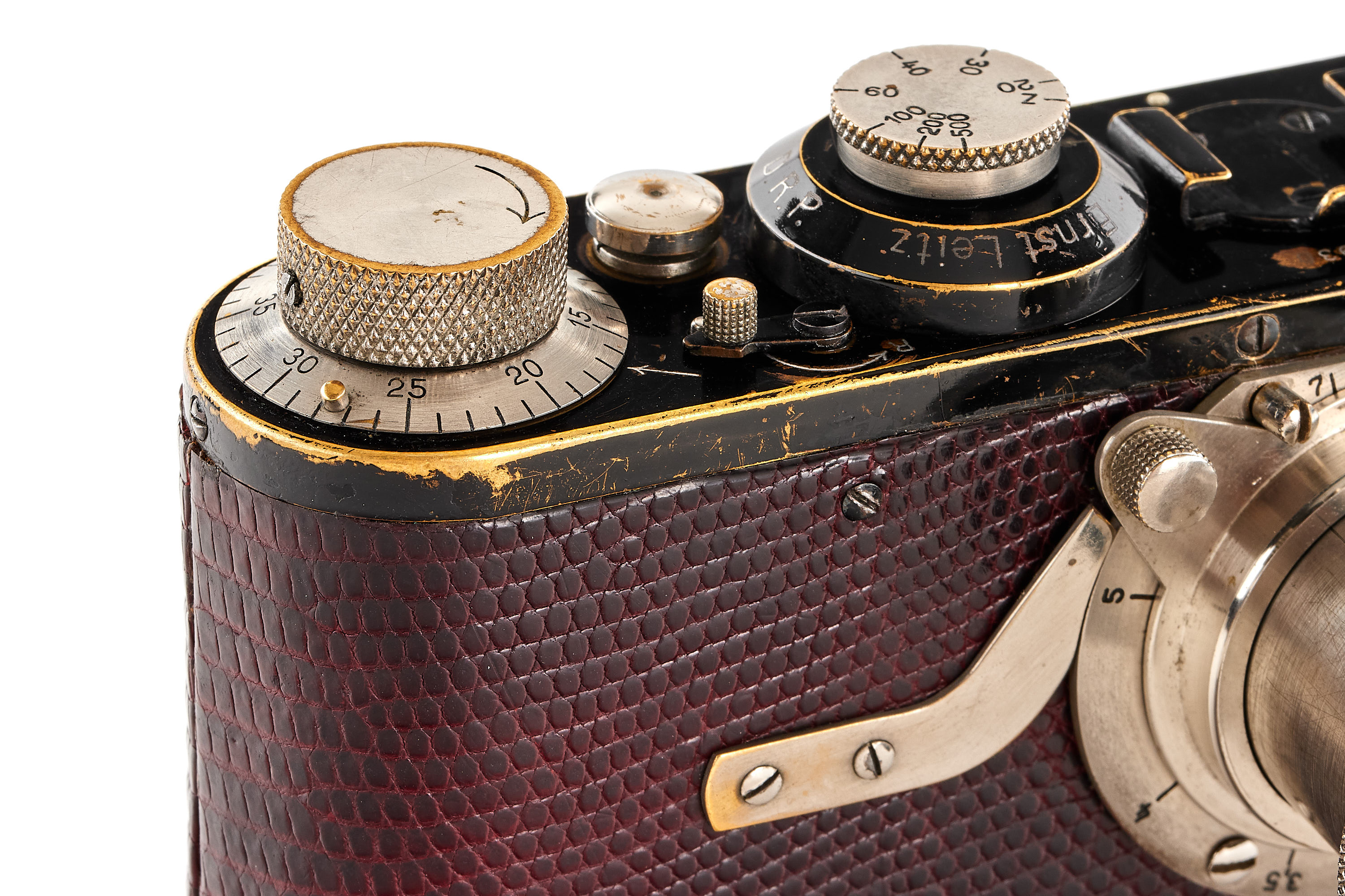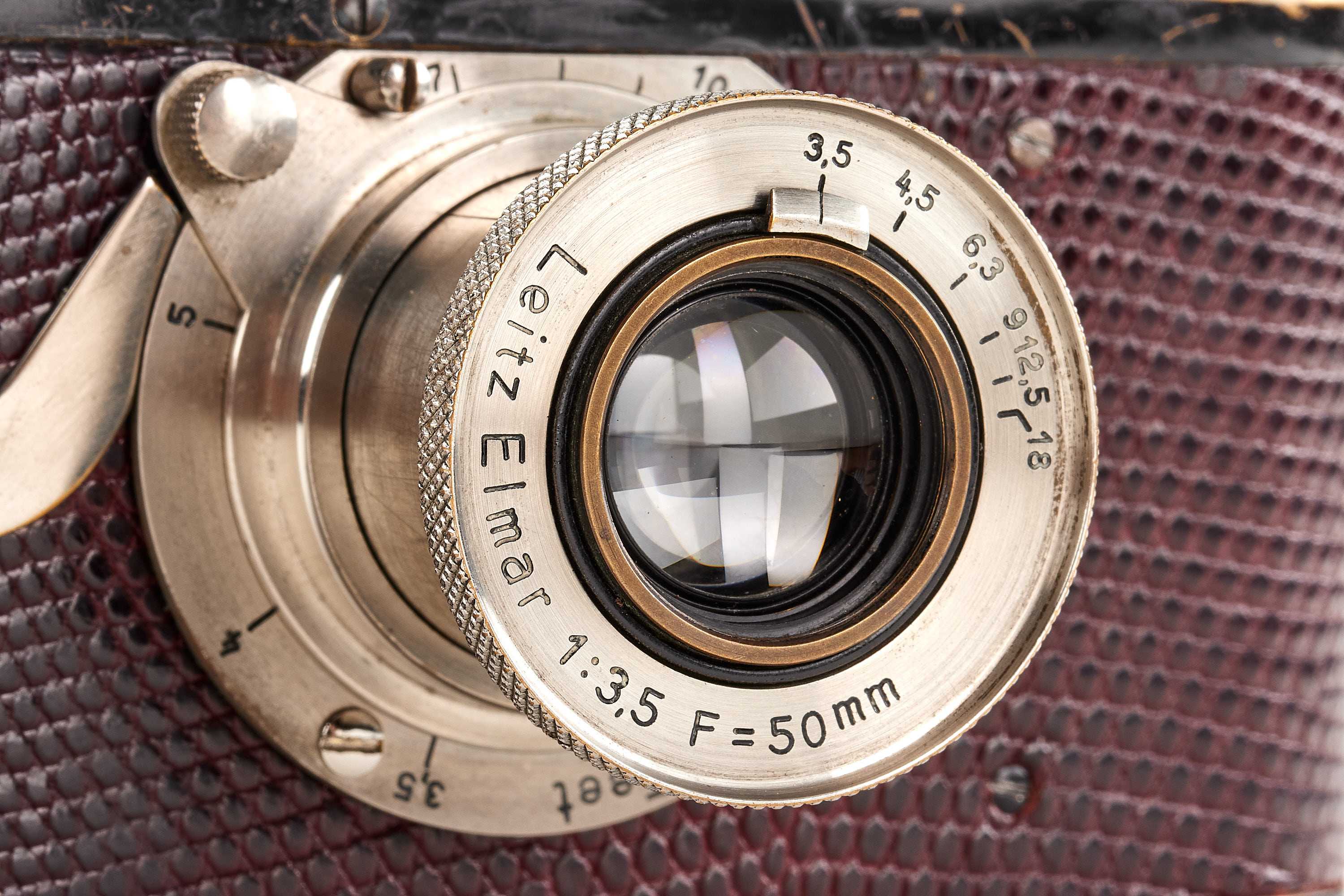 Early, 2nd version I Mod.A in good condition and working order, delivered to Ernst Leitz New York on 06.04.1927, in feet scale, note the later dimpled 'mushroom' style shutter release button and the special red lizard skin cover.