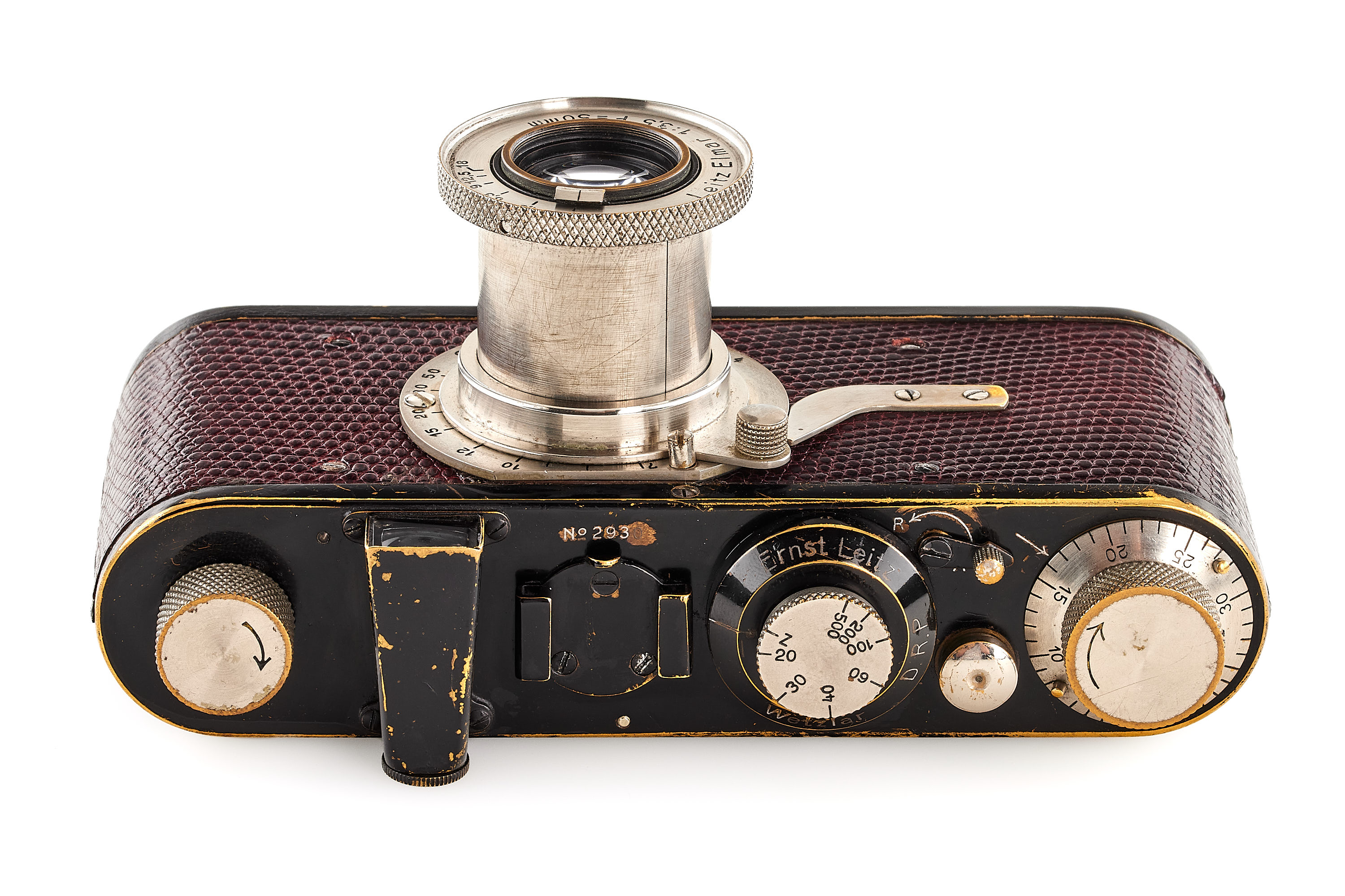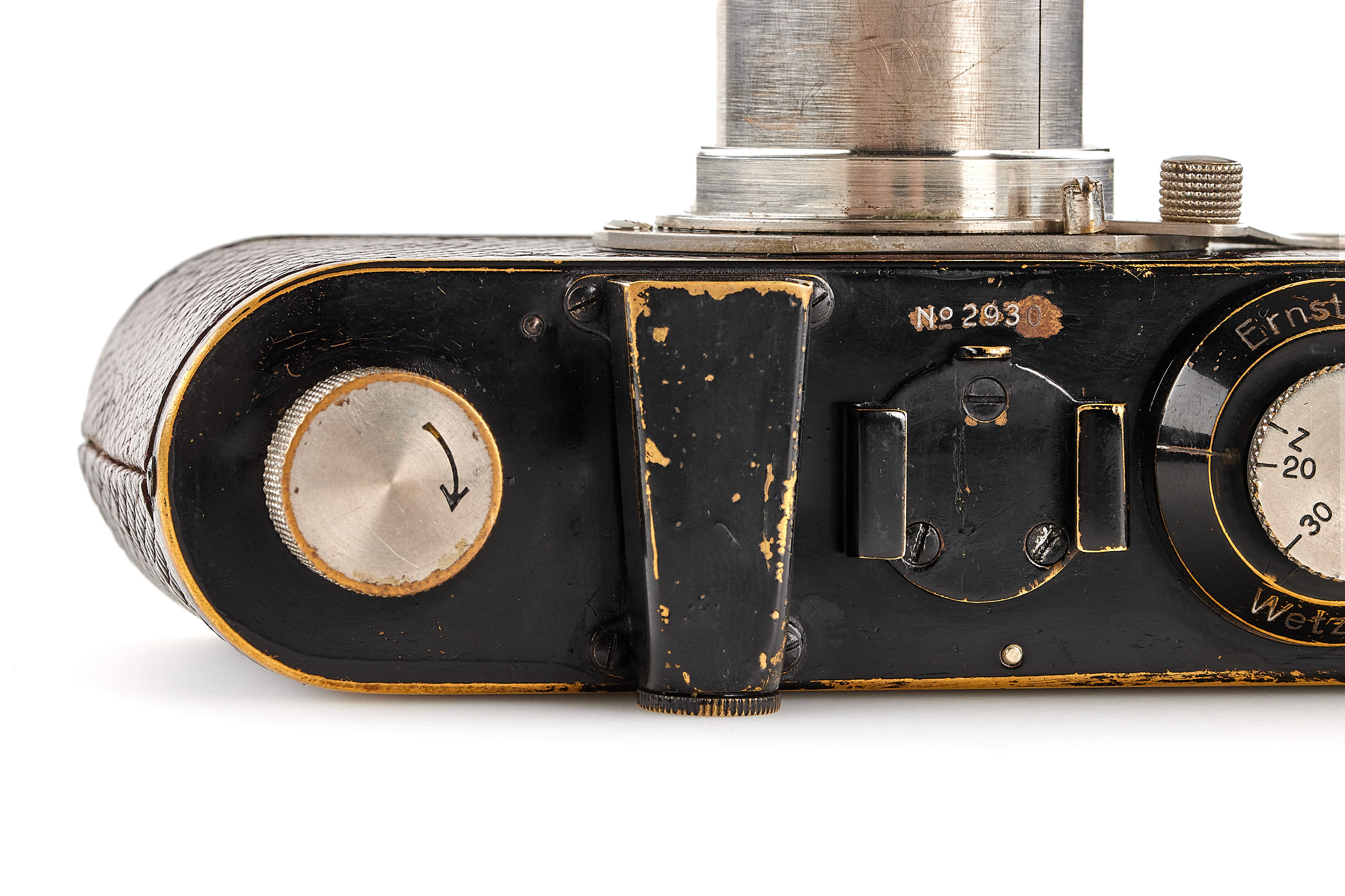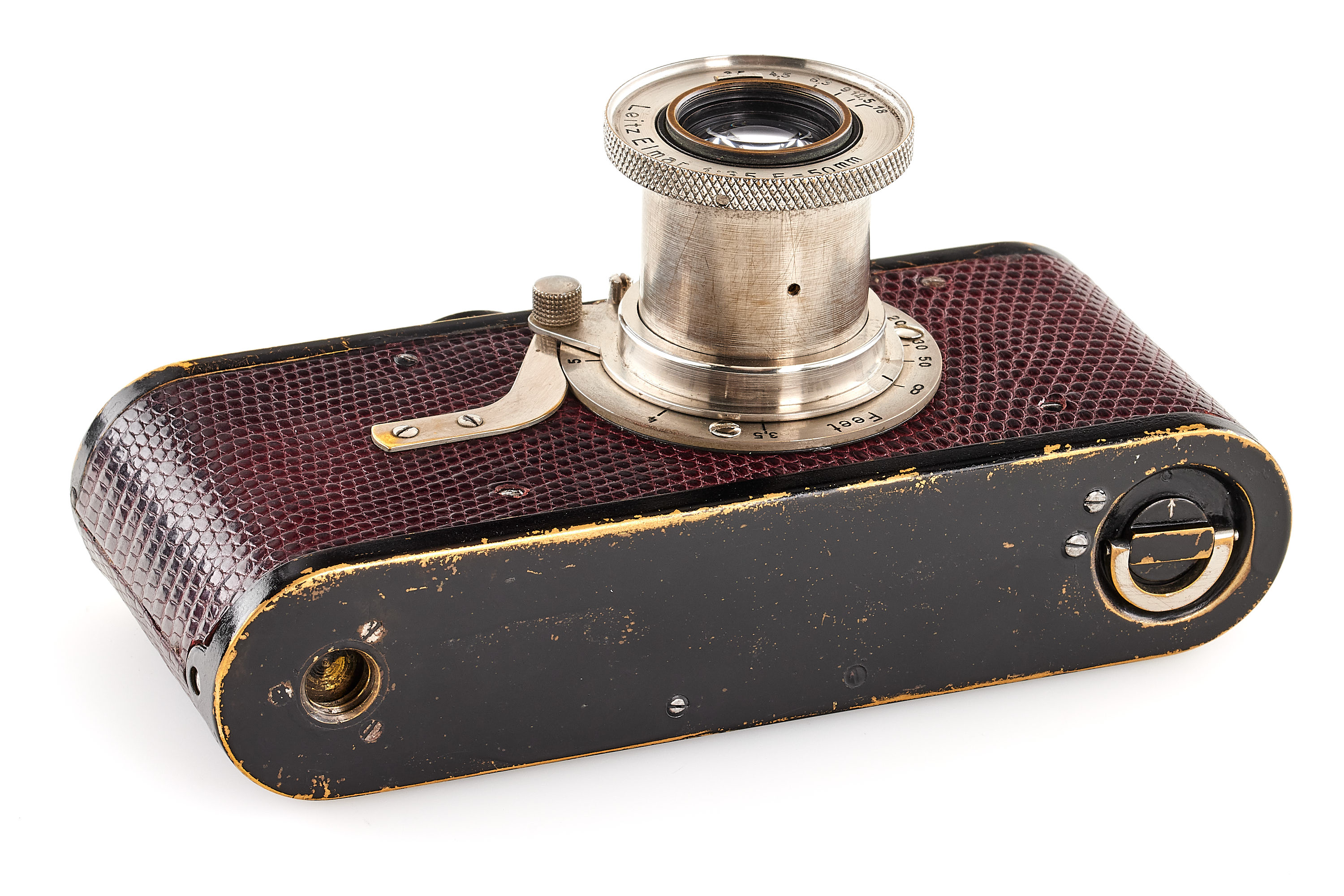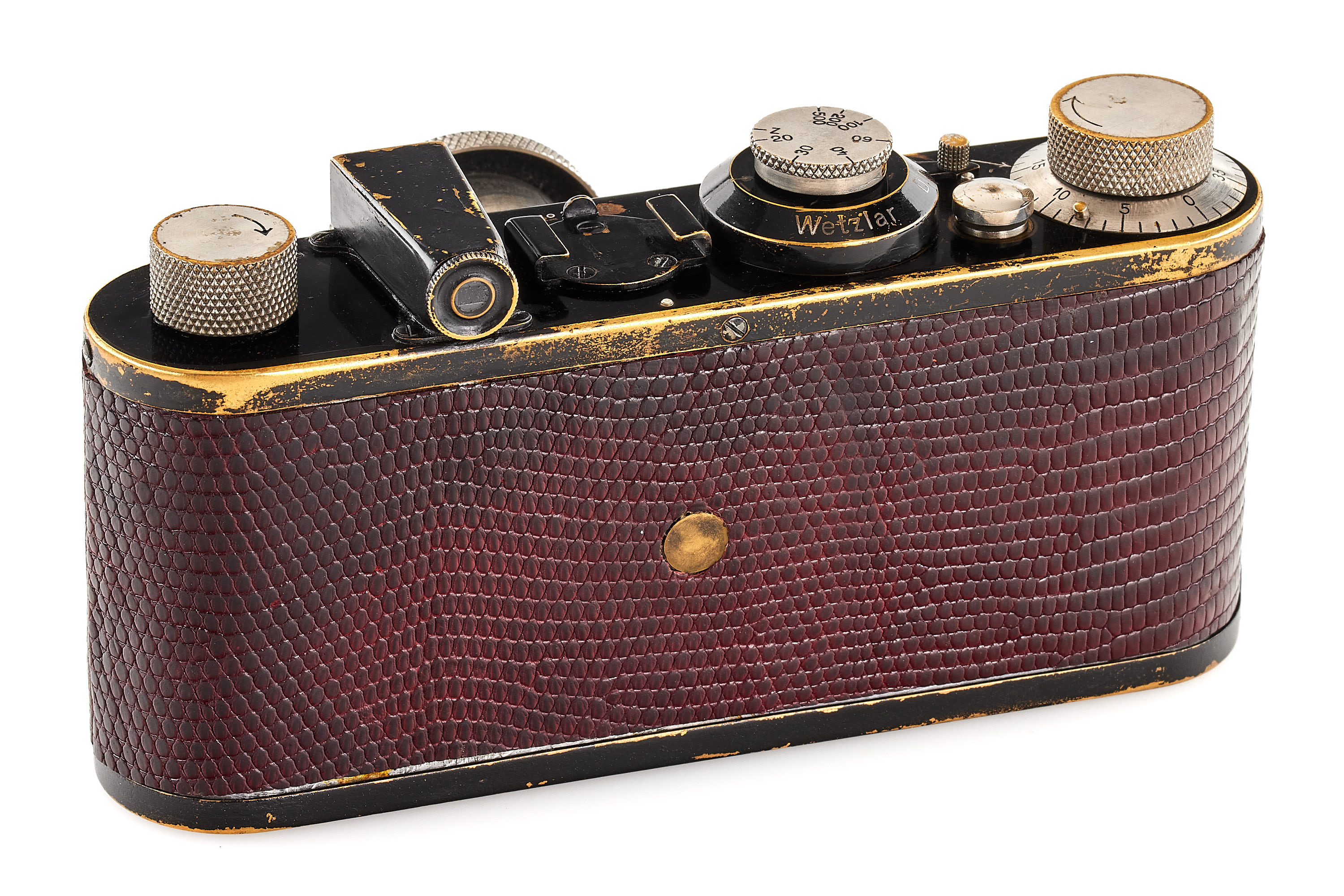 Early, 2nd version I Mod.A in good condition and working order, delivered to Ernst Leitz New York on 06.04.1927, in feet scale, note the later dimpled 'mushroom' style shutter release button and the special red lizard skin cover.