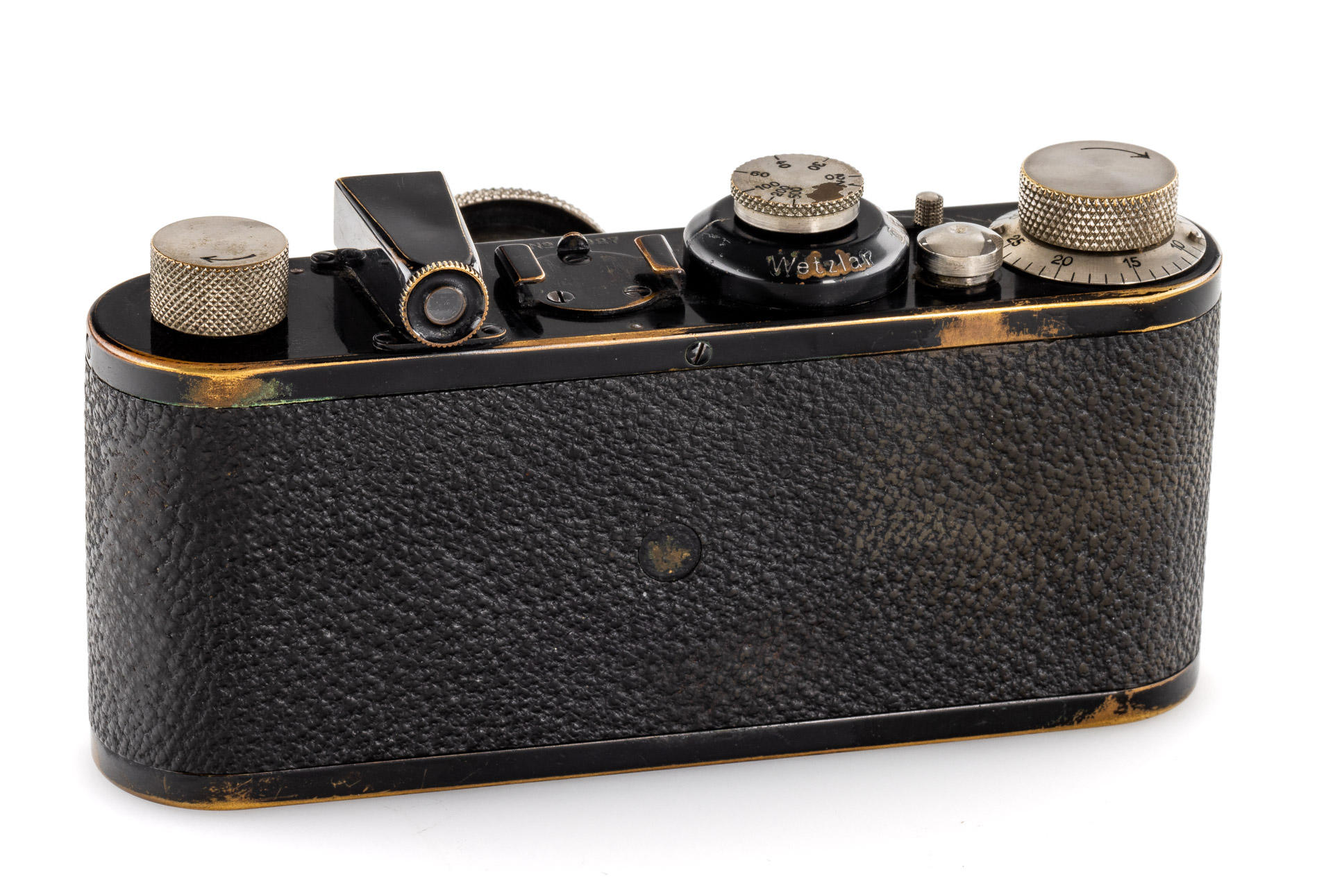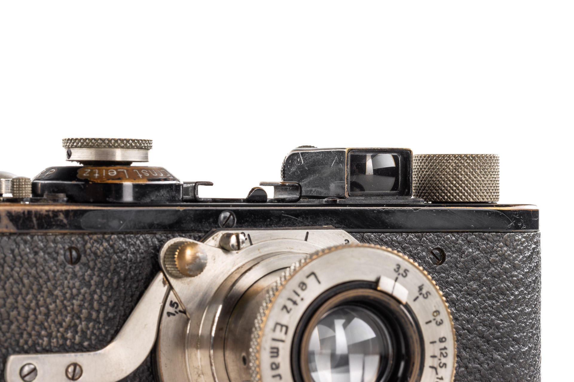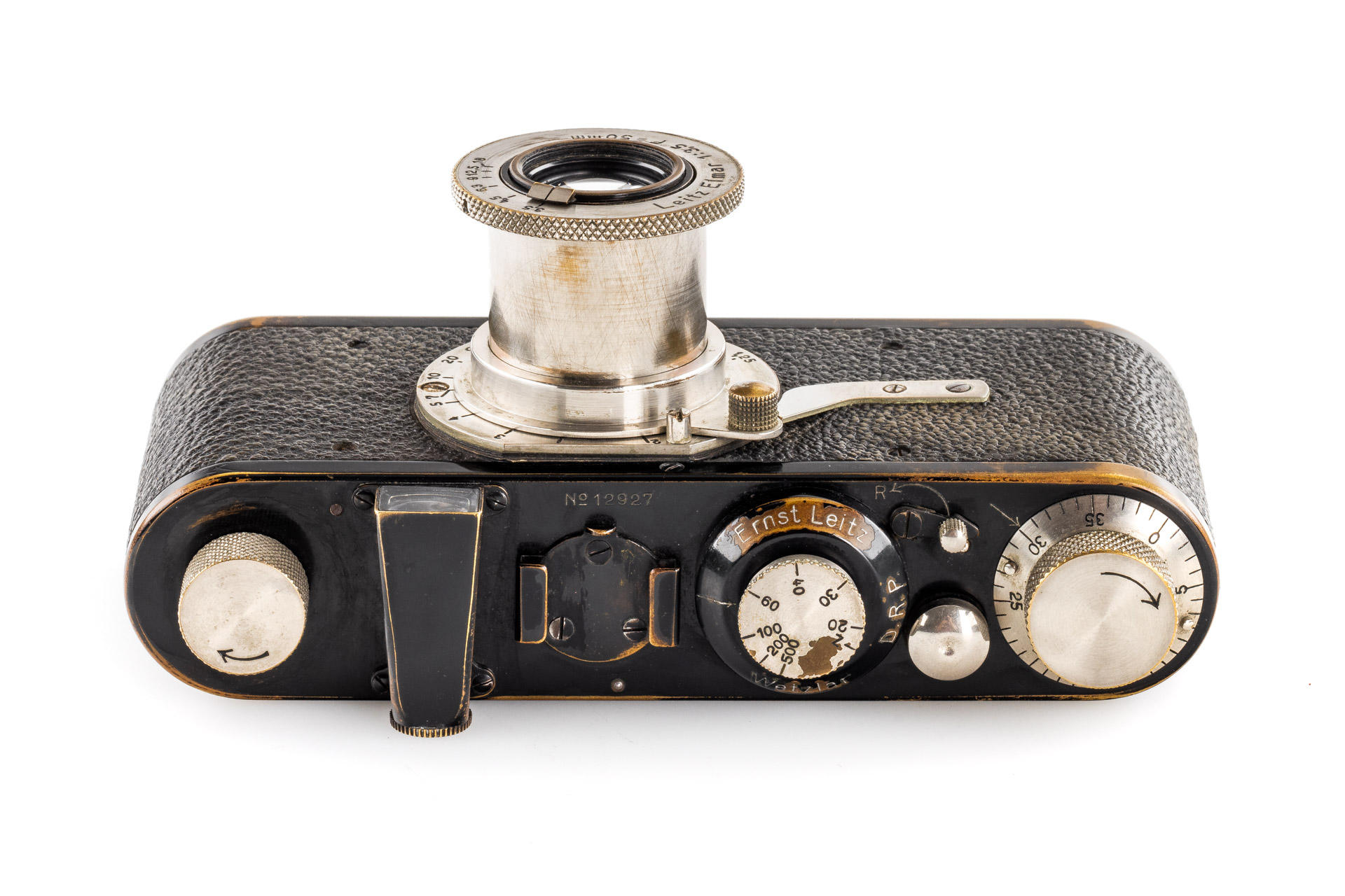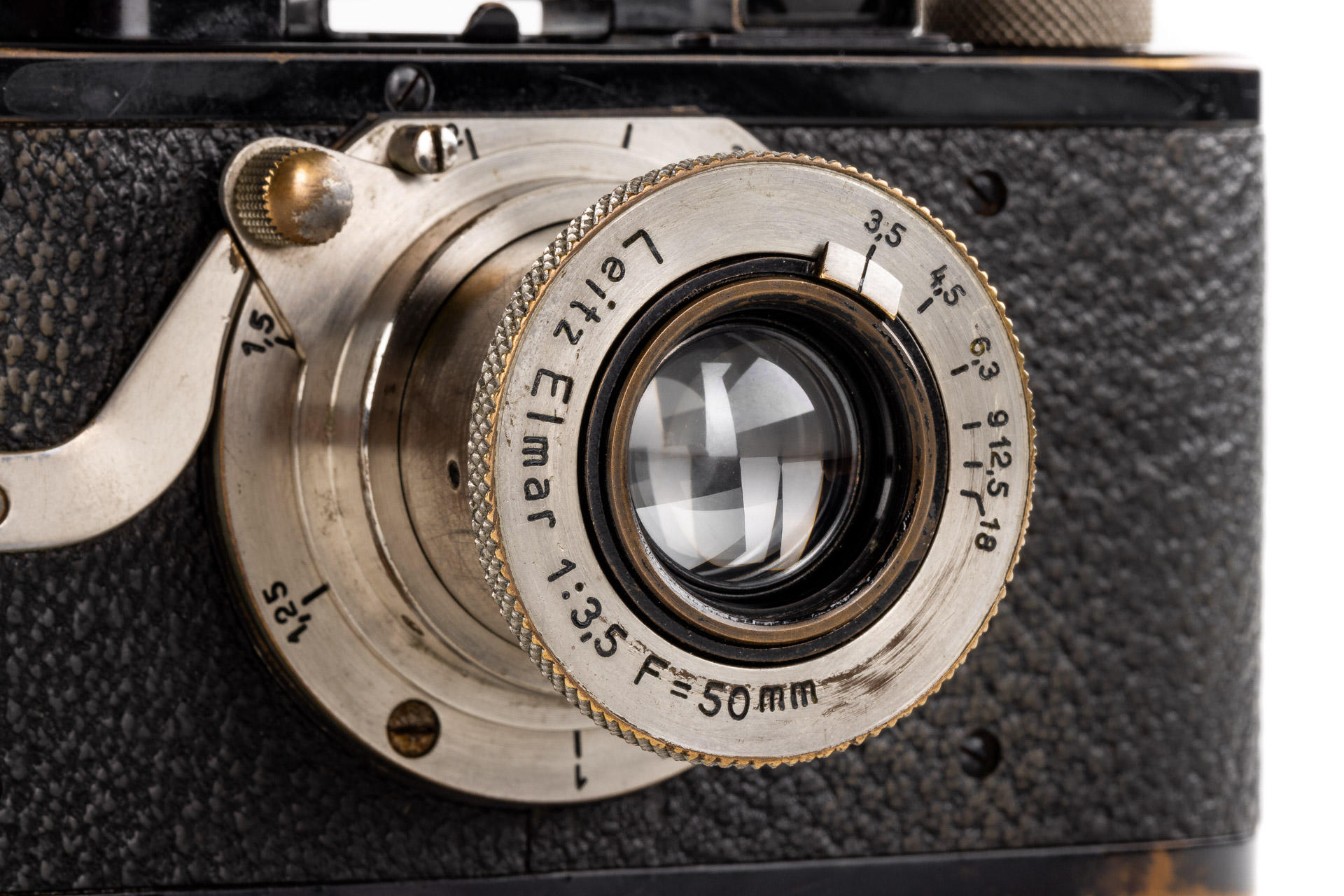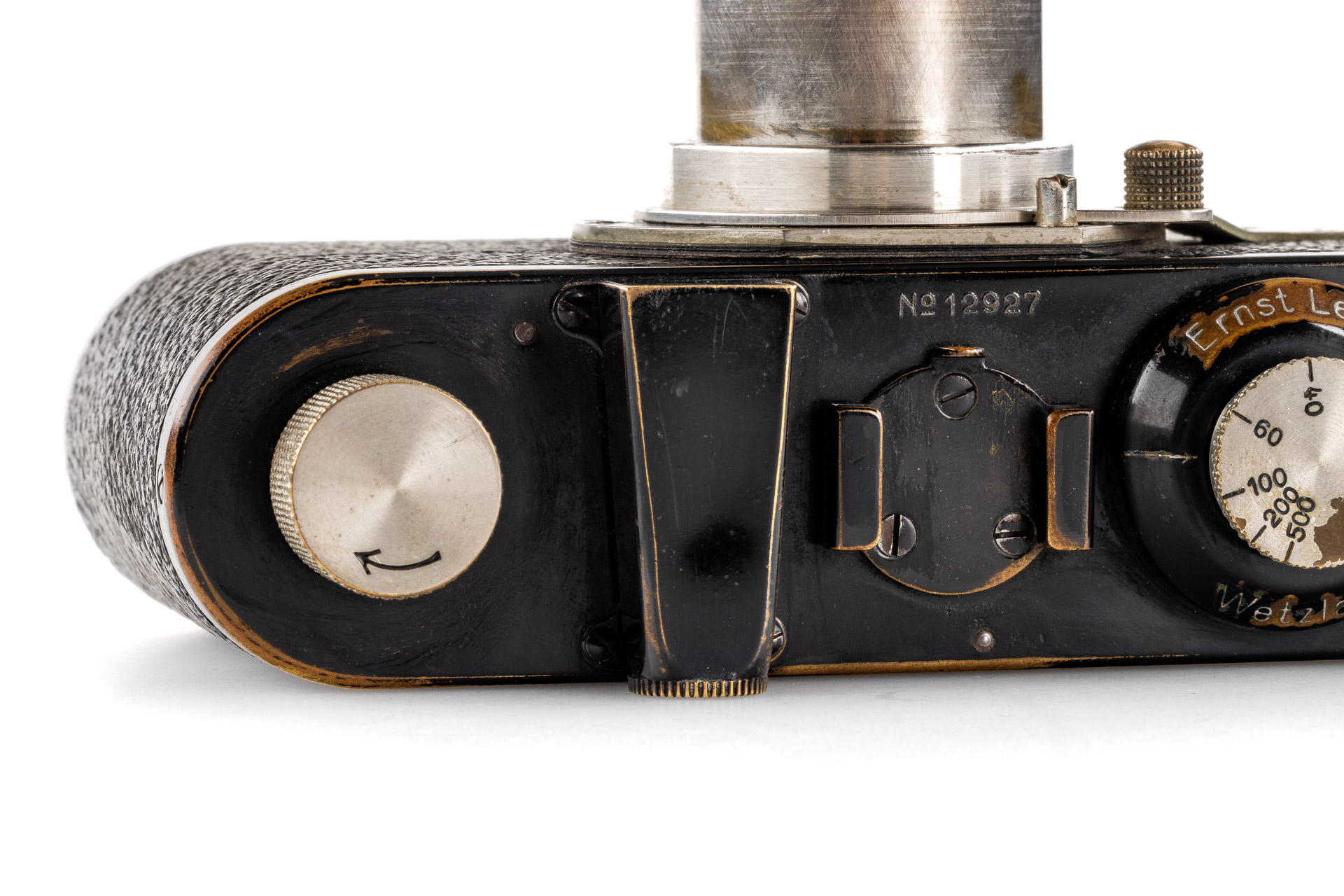 an early version I Mod. A, with a dimpled-mushroom shutter release and finely knurled knobs, early-type base plate, in good condition, lens front rim removed