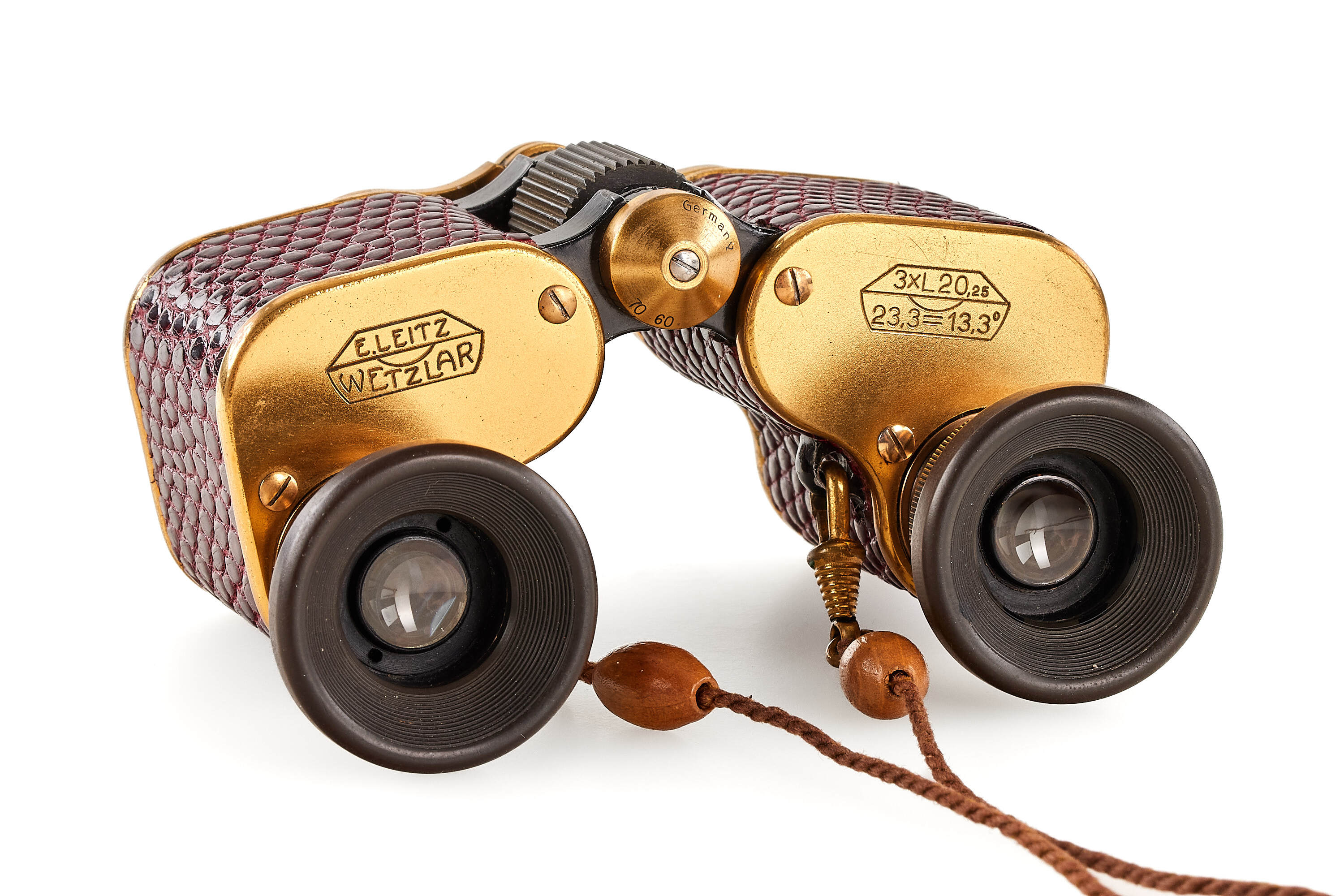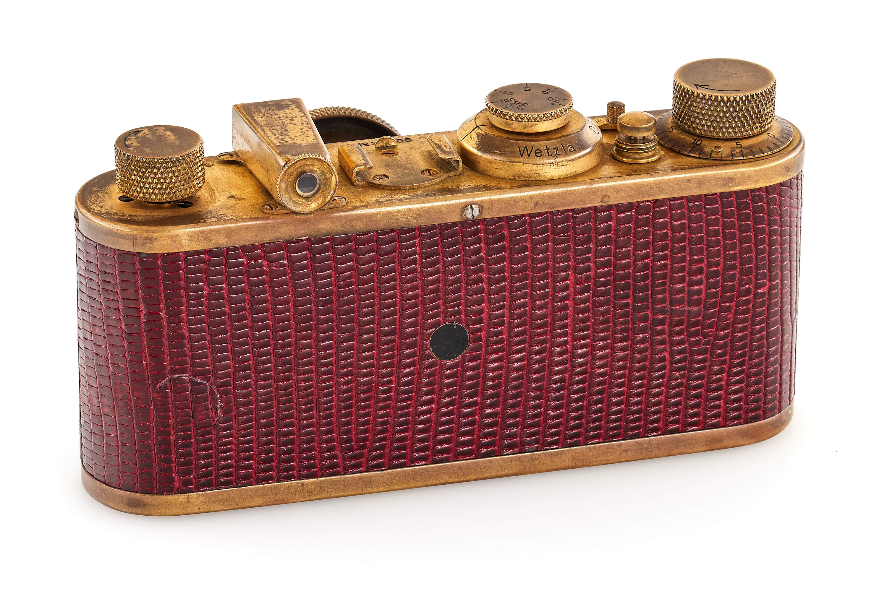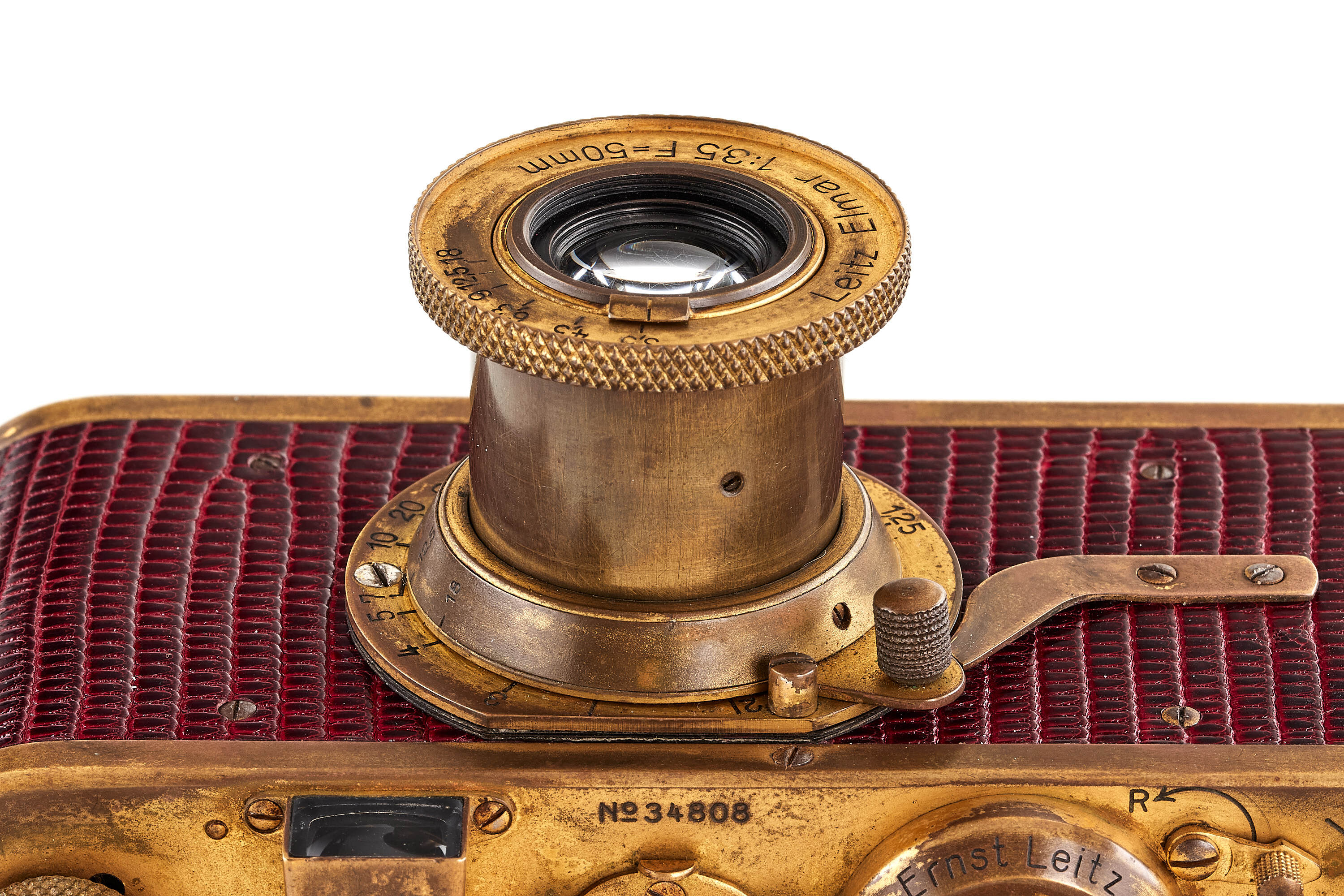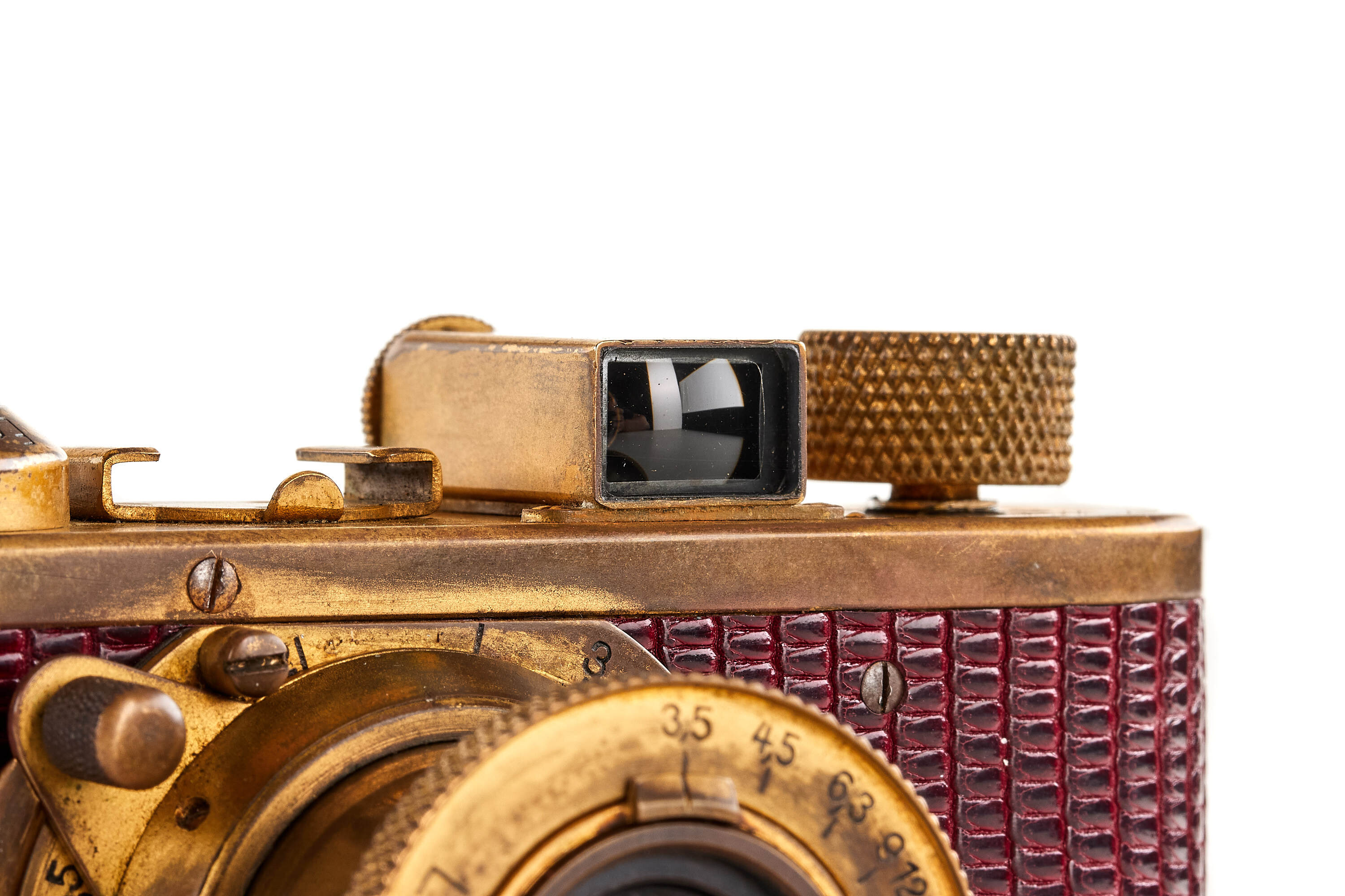 What elevates this set to true museum quality is the inclusion of exceptionally rare and fully matching Leitz 3x20 'Luxus' binoculars, also gold-plated and covered in identical red lizard skin. Complementing the ensemble are a gold-plated Leitz FINOT cable release, covered in brown woven fabric, and a FOFER-LUXUS gold-plated rangefinder—a combination virtually impossible to duplicate.