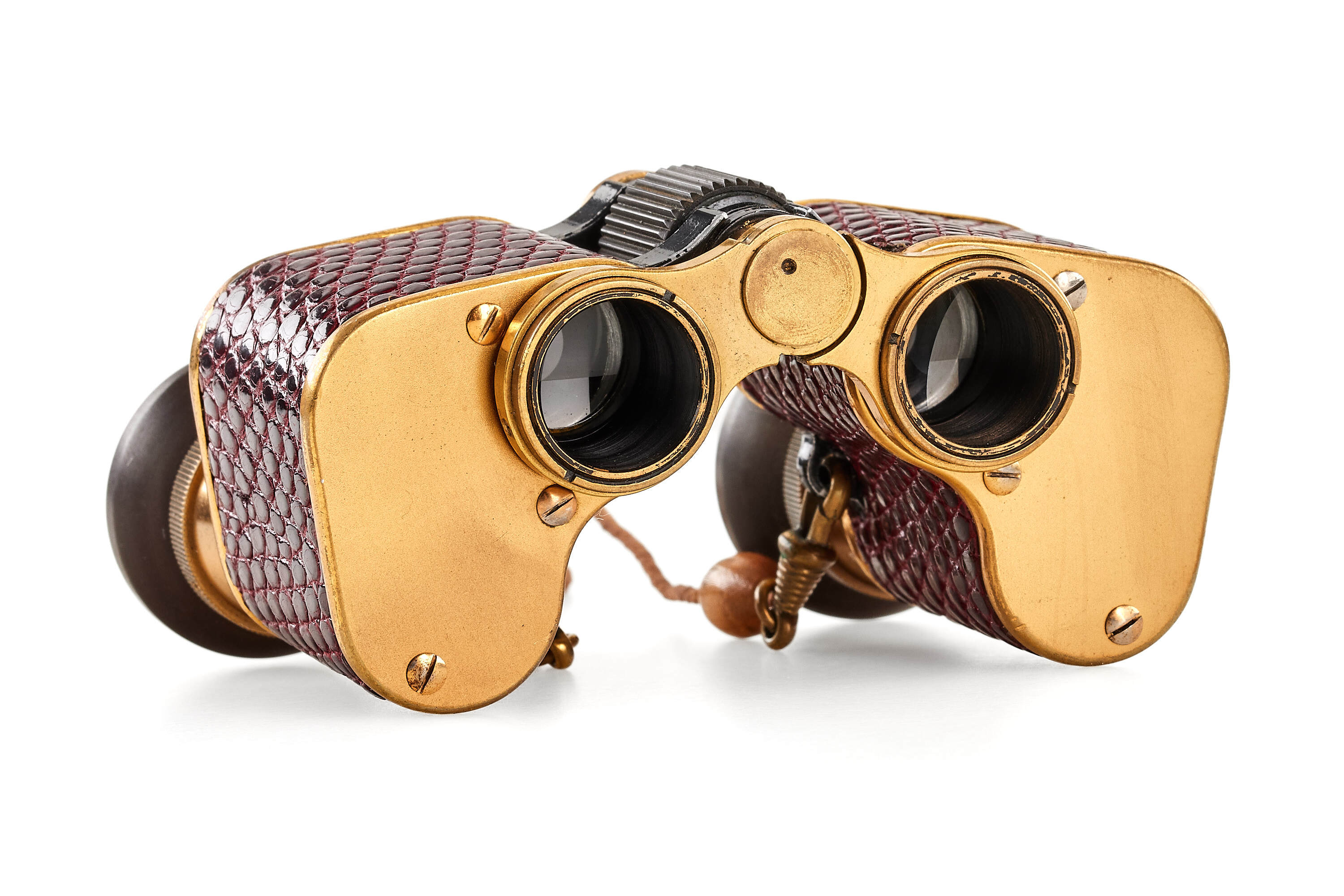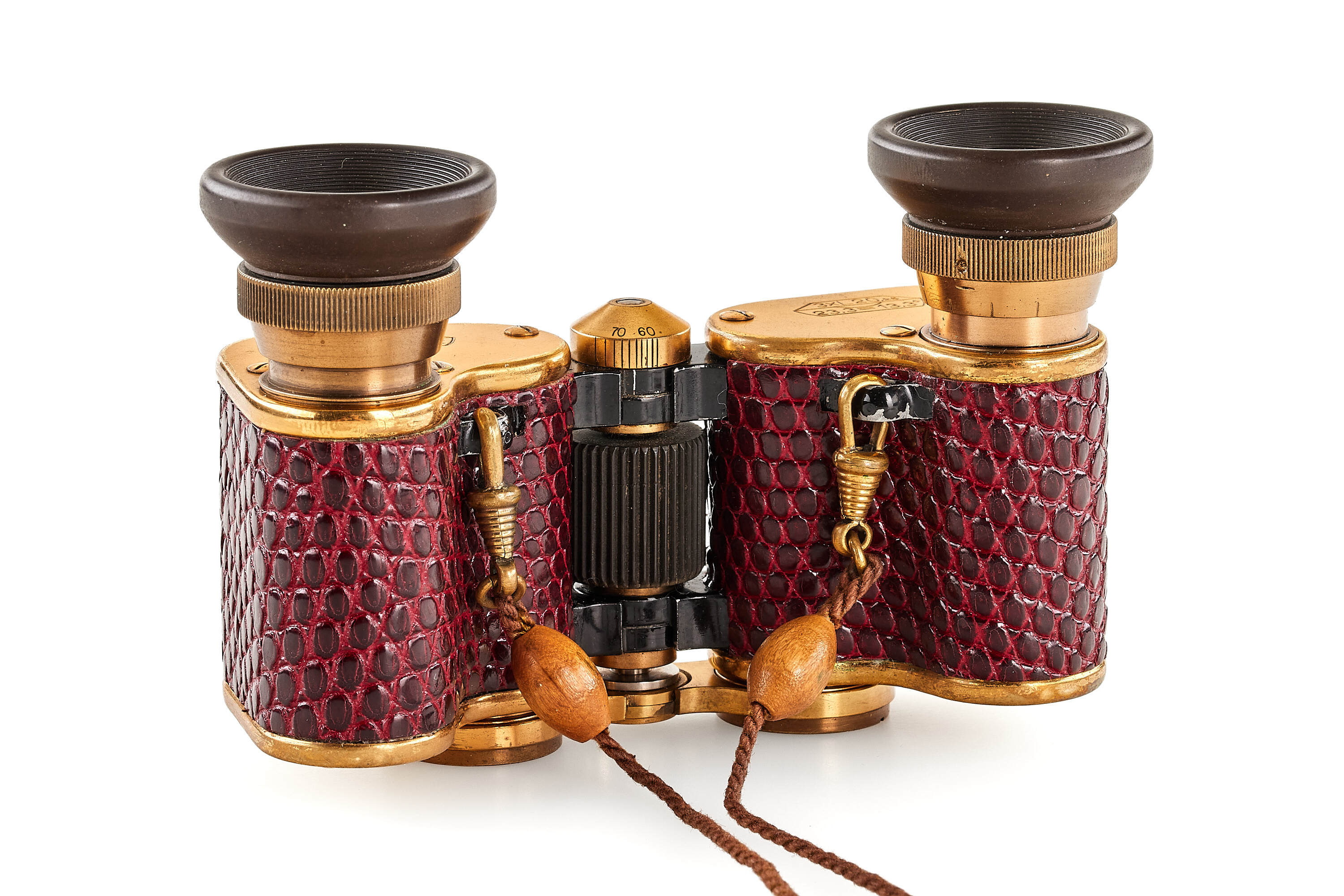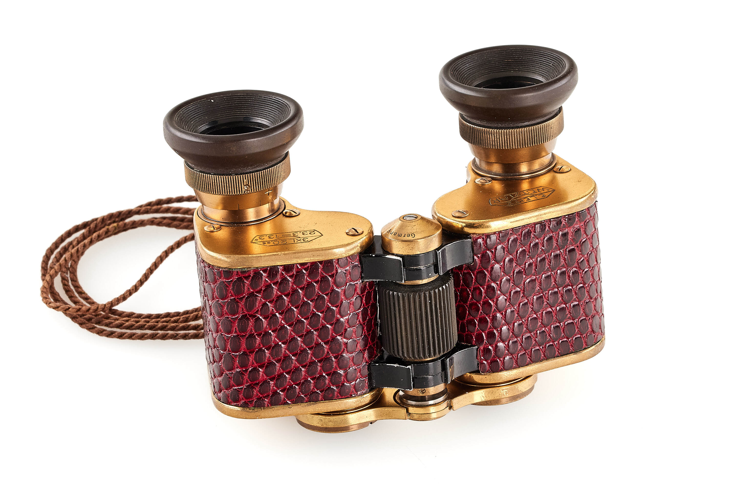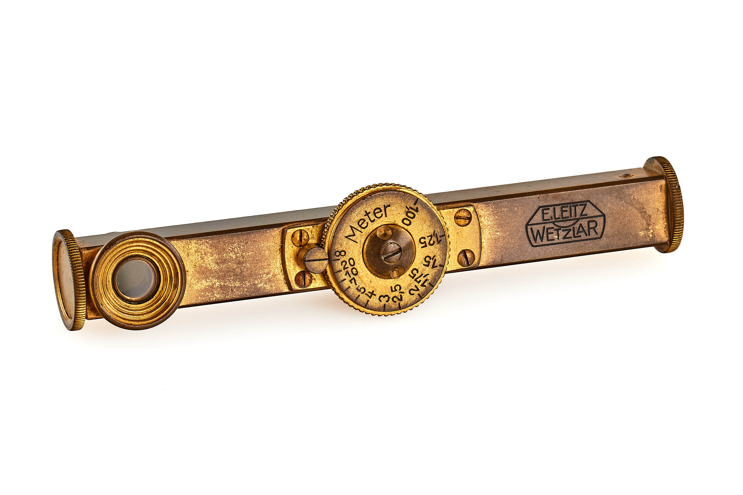 What elevates this set to true museum quality is the inclusion of exceptionally rare and fully matching Leitz 3x20 'Luxus' binoculars, also gold-plated and covered in identical red lizard skin. Complementing the ensemble are a gold-plated Leitz FINOT cable release, covered in brown woven fabric, and a FOFER-LUXUS gold-plated rangefinder—a combination virtually impossible to duplicate.