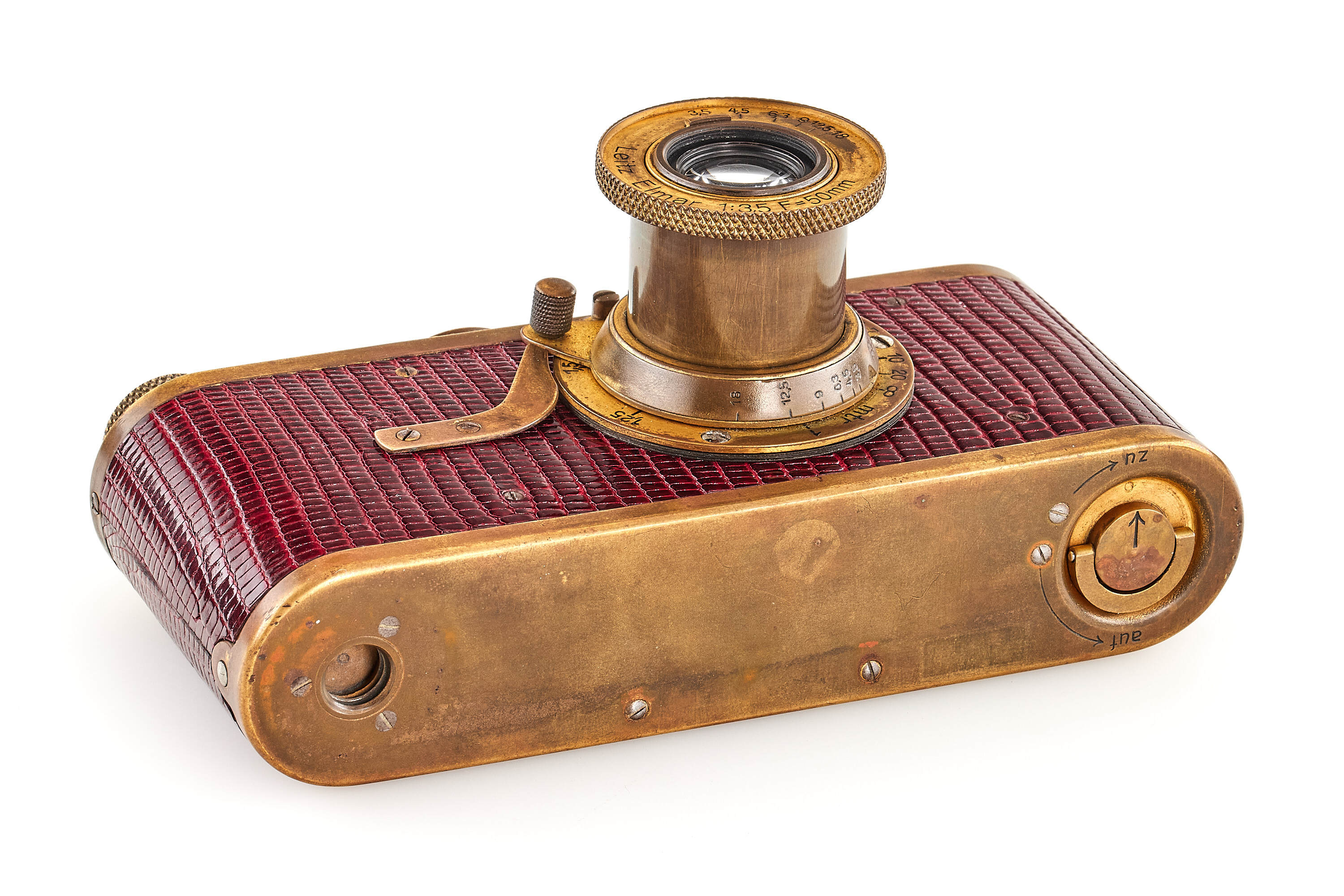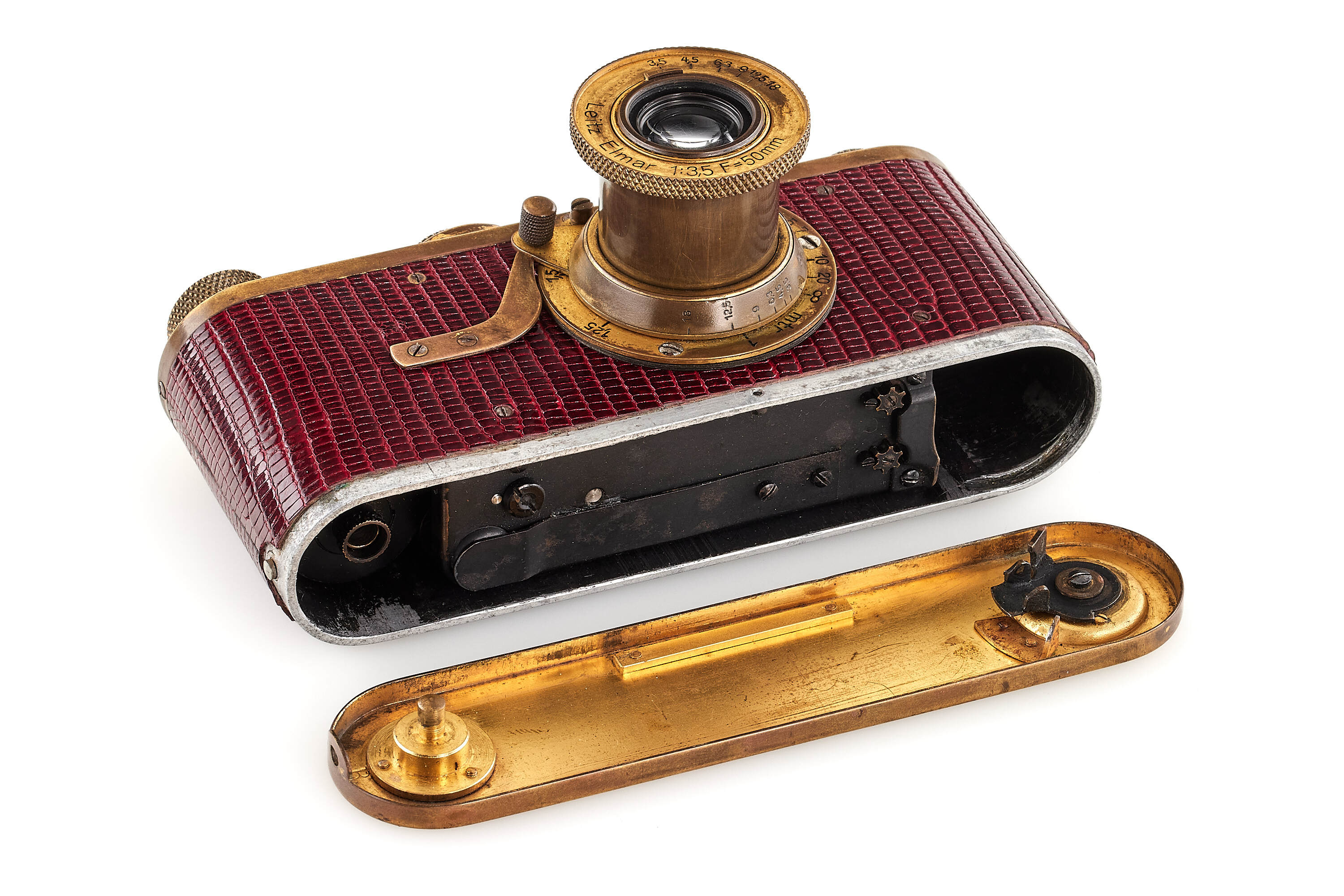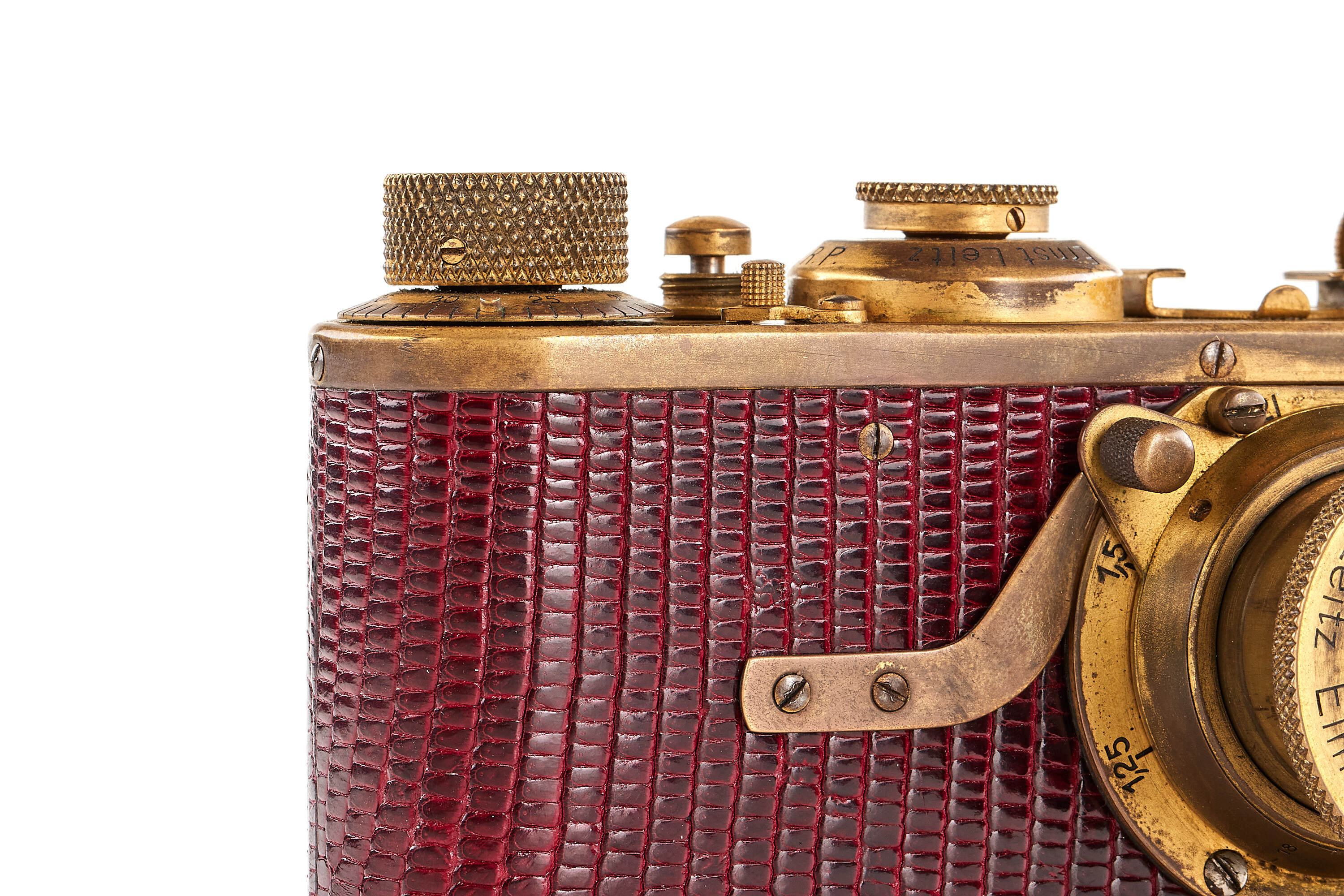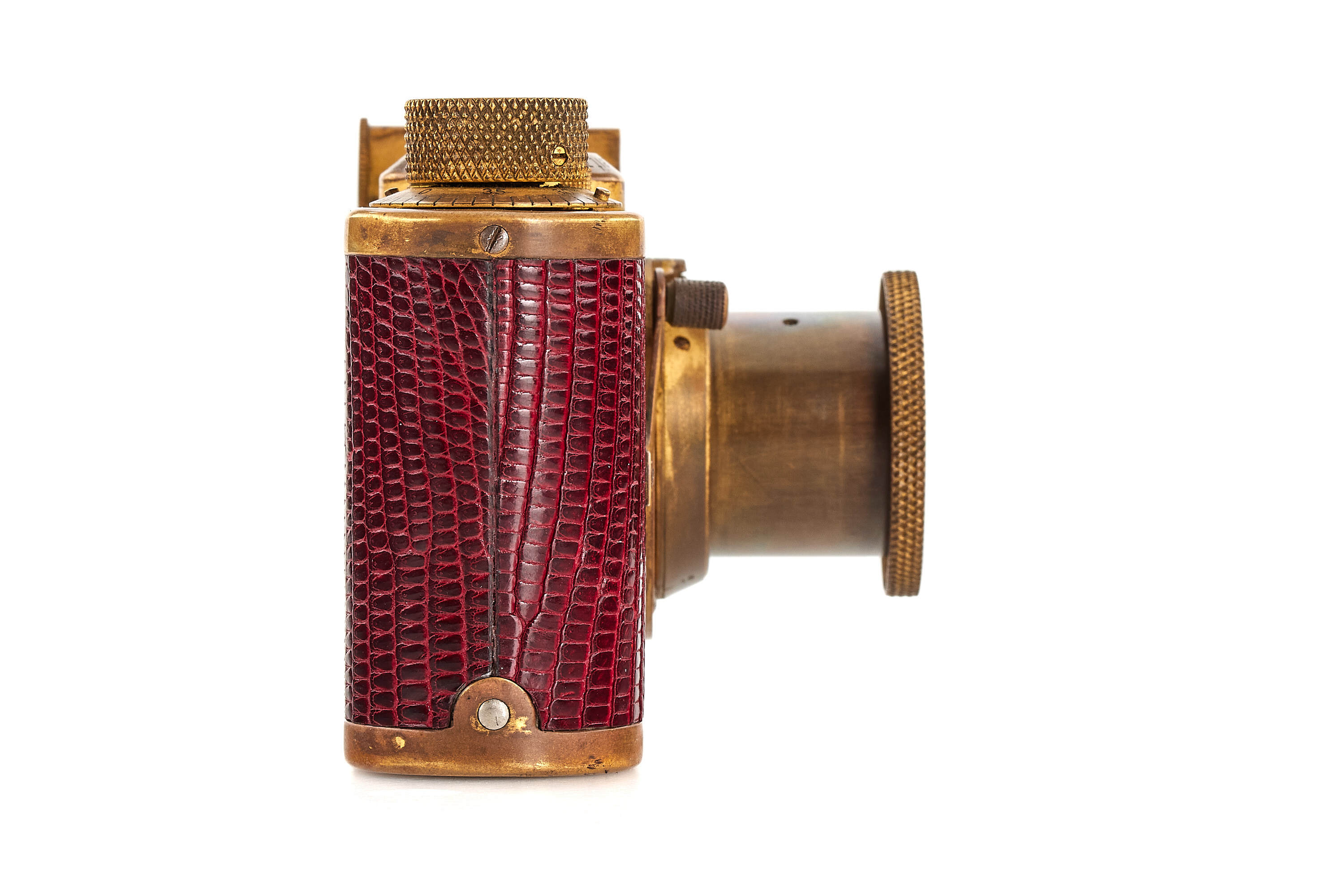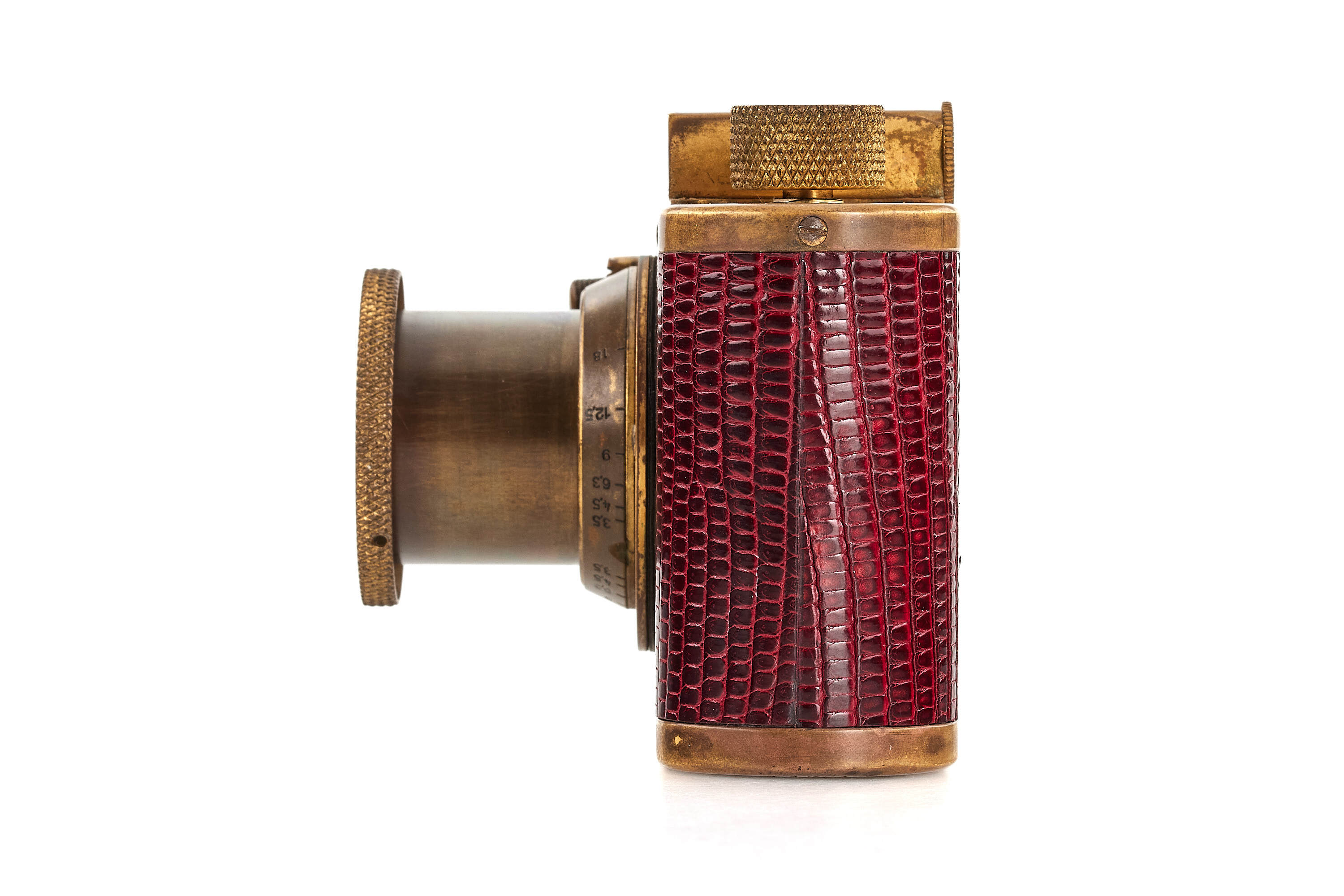 The present camera, is one of the finest preserved examples we have encountered. Featuring gold-plated metal fittings and its original deep red lizard-skin covering, the camera has never been restored and displays only minimal, graceful signs of use—a remarkable testament to its authenticity and rarity.