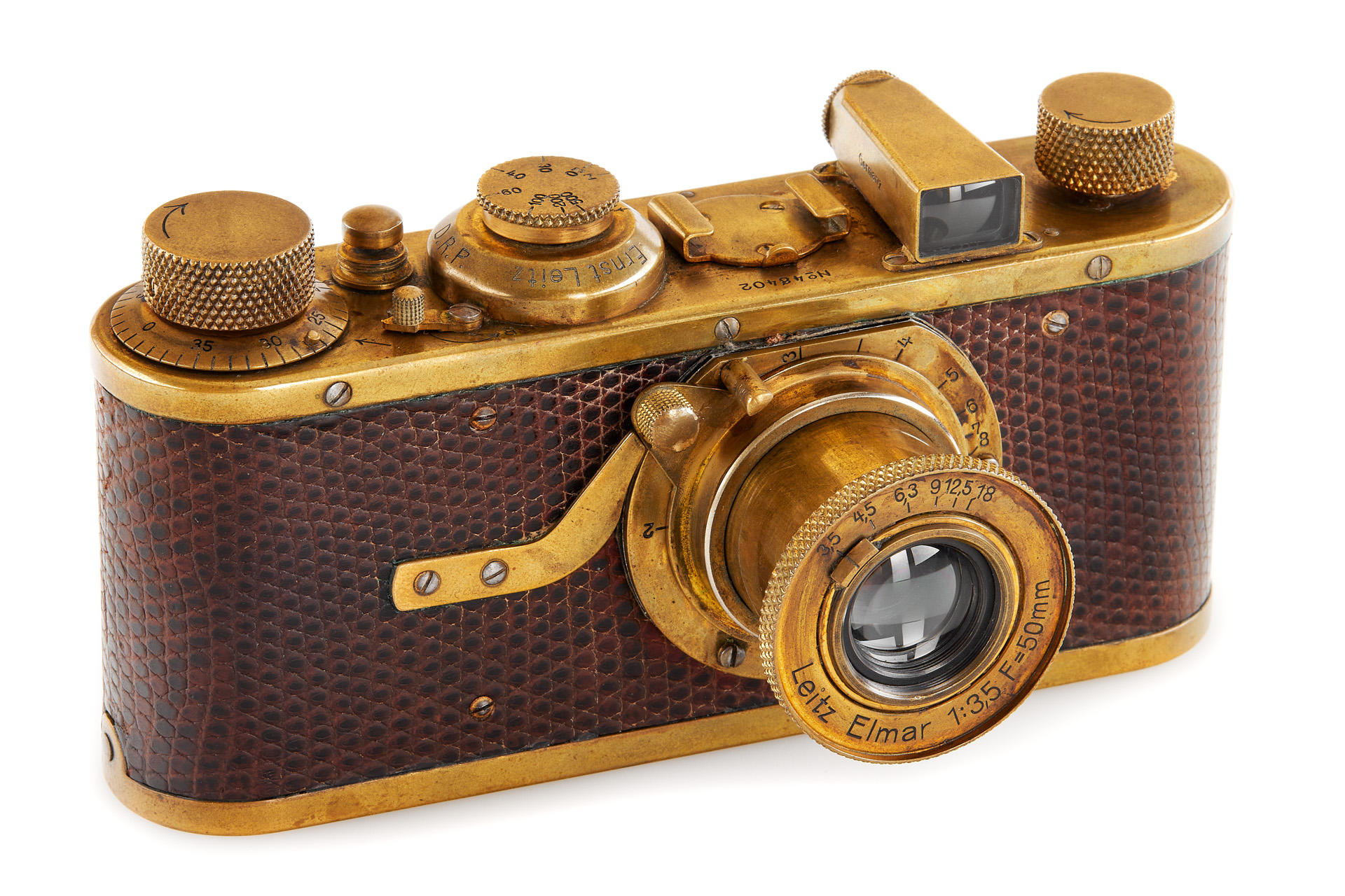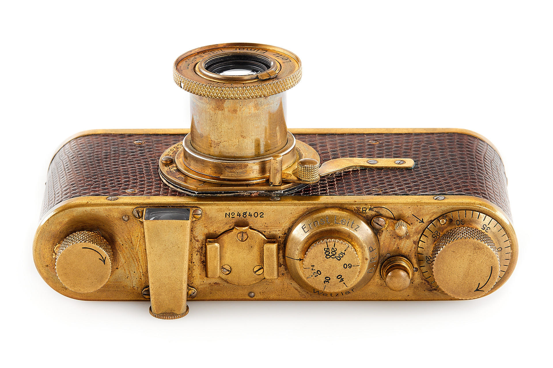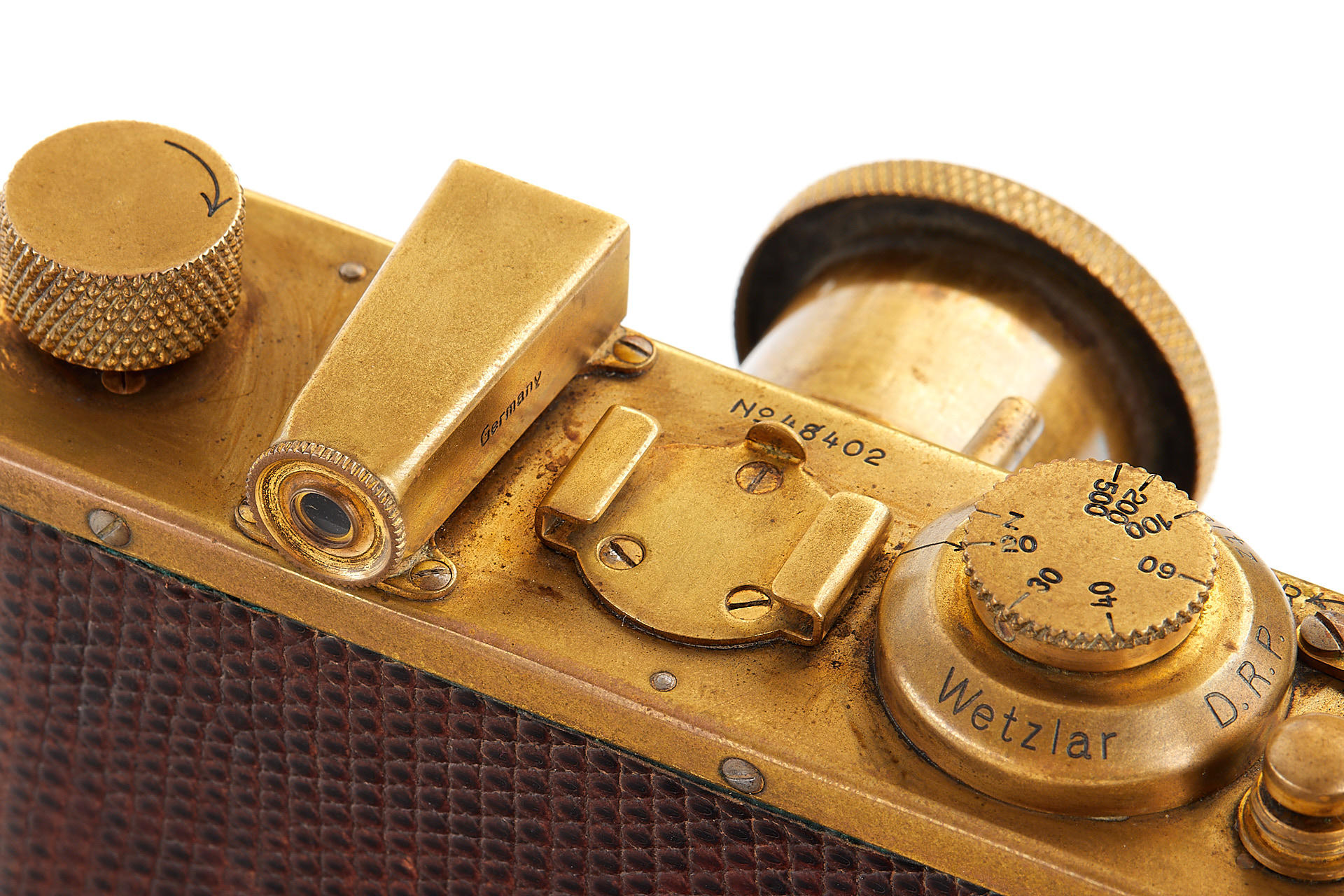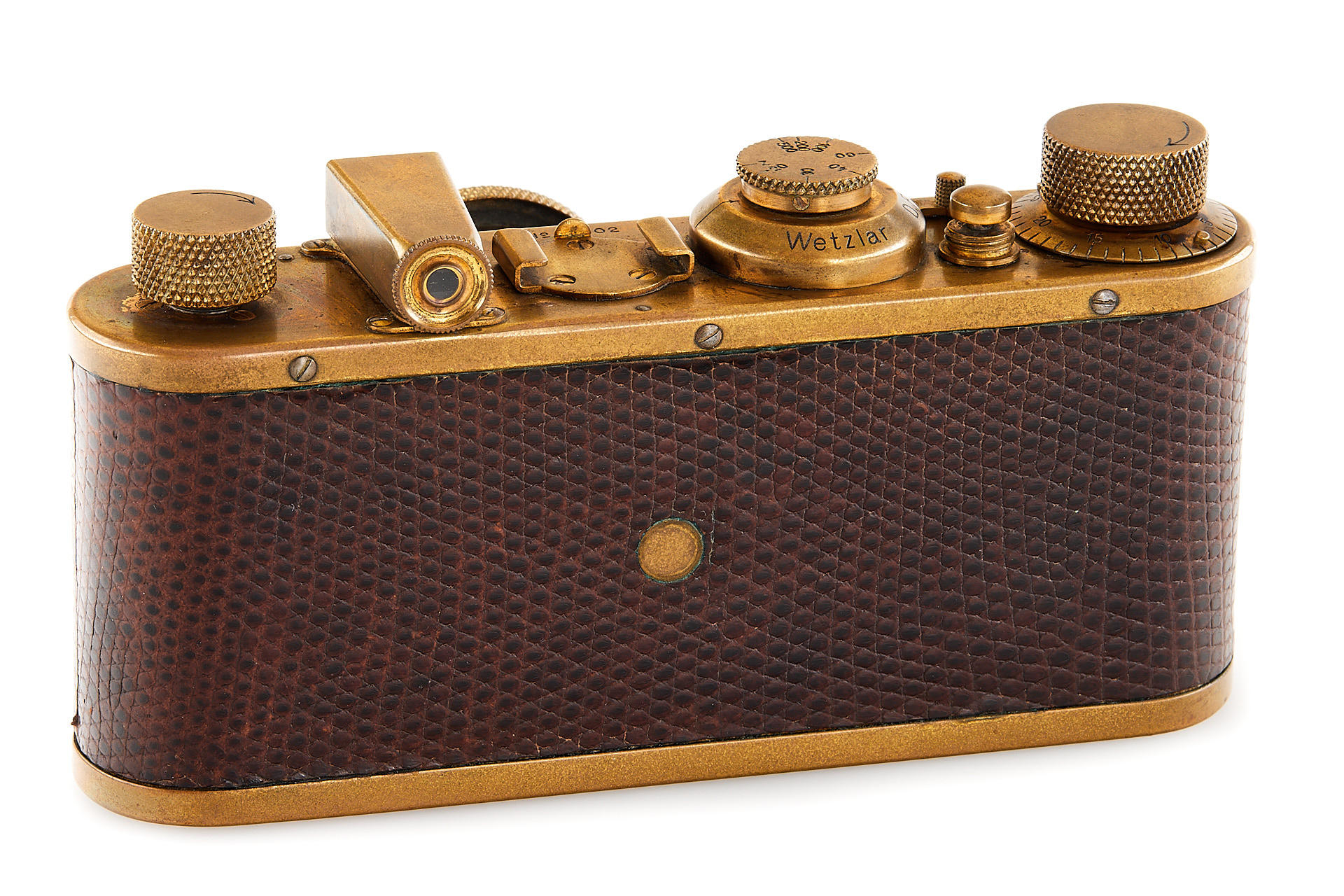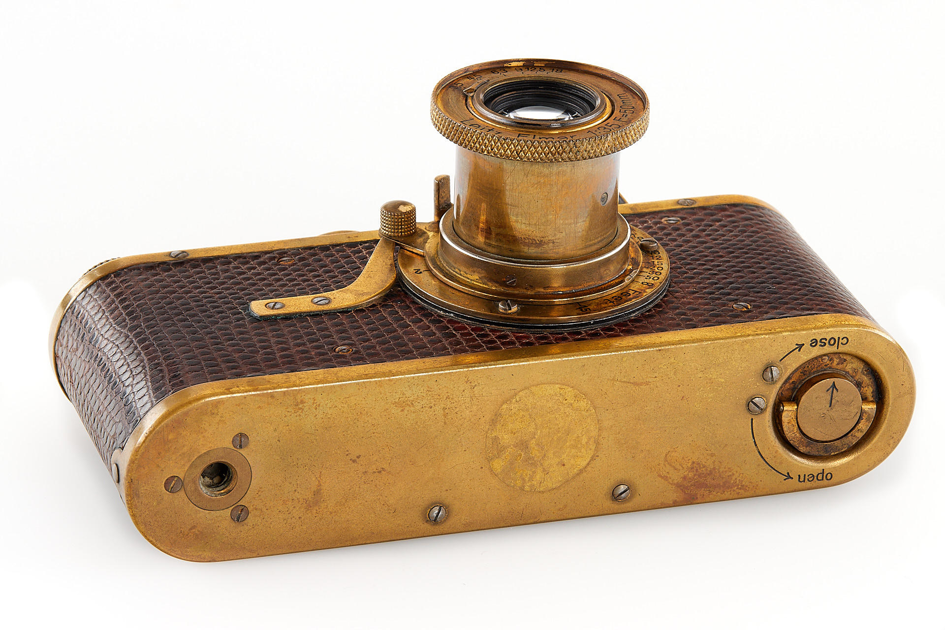 The elusive 'Luxus' Leica in 100% original and very good condition. The camera with gold plated metal parts and a lizard-skin covered body was never restored and shows the typical light patina. Only 95 'Luxus' Leicas were produced from 1929 to 1931; some were later converted or upgraded - only a handful of cameras exist in this original condition. An original Luxus Leica is one of the major rarities in the Leica world. The offered example was delivered to New York in 1930 as LESSALUX (Leica Luxus). See Lager I page 26 for an antecedent camera no.48401.