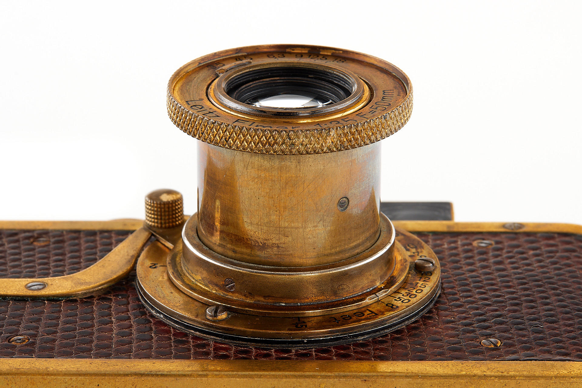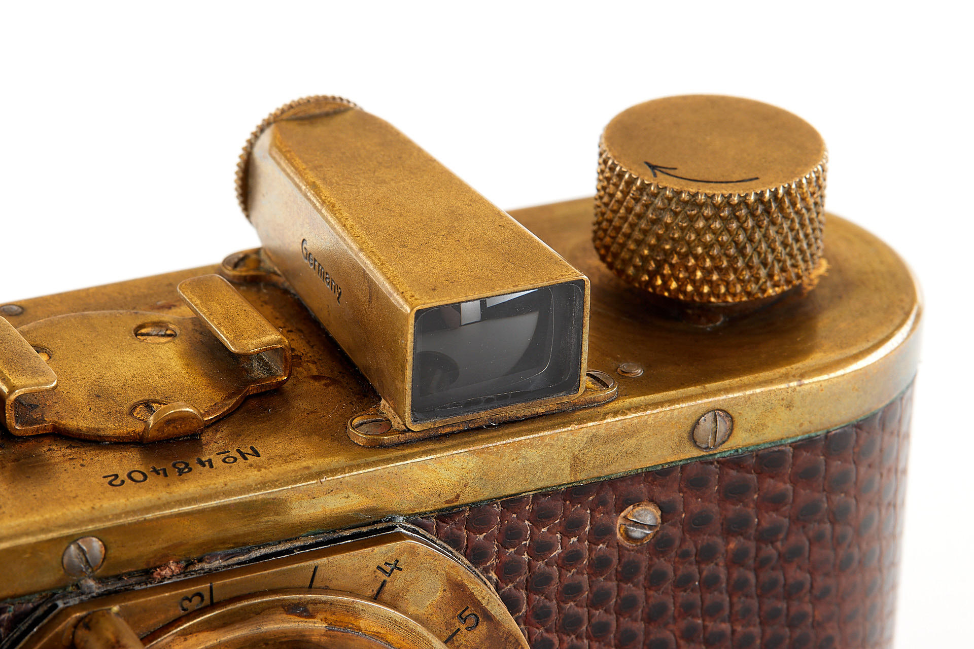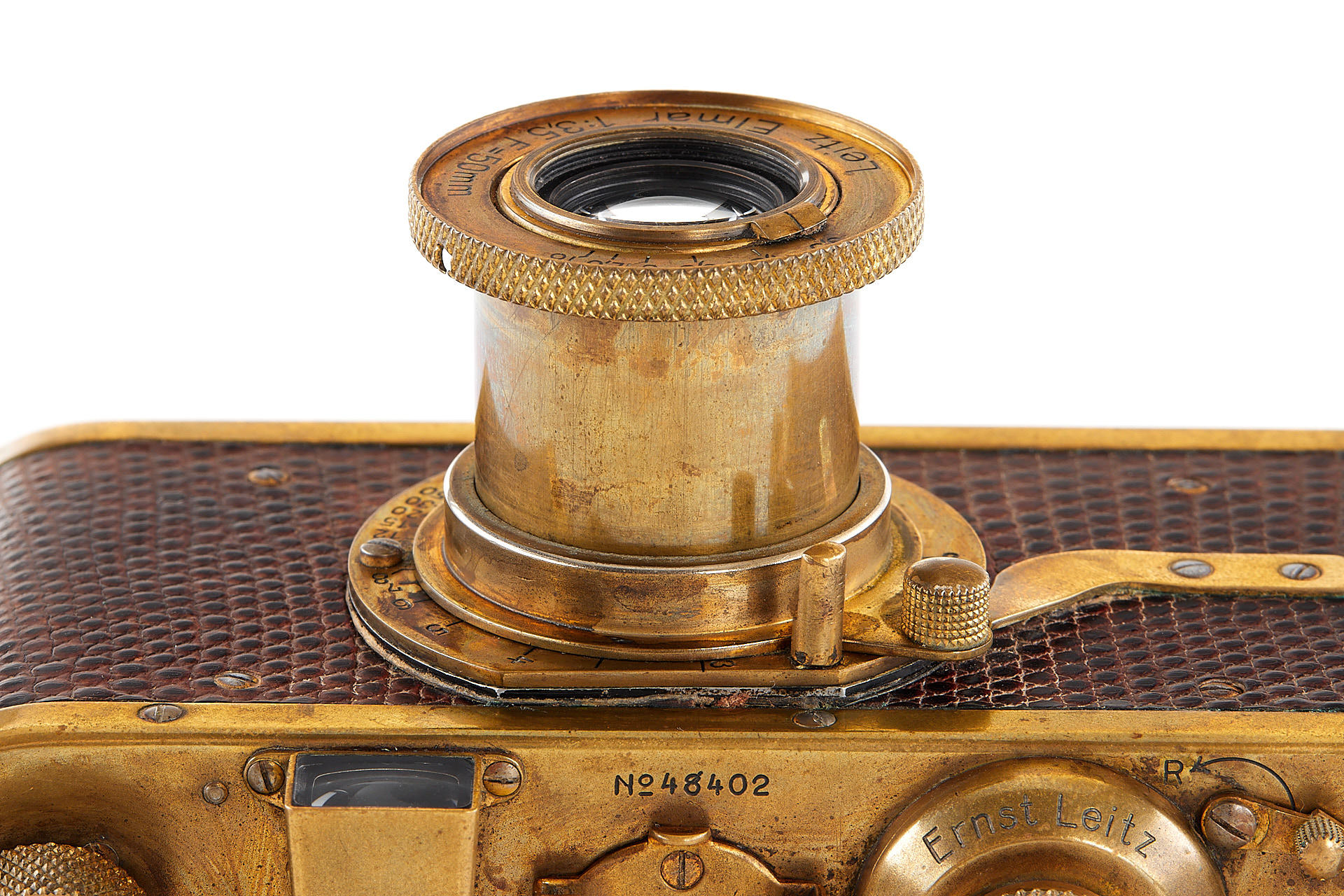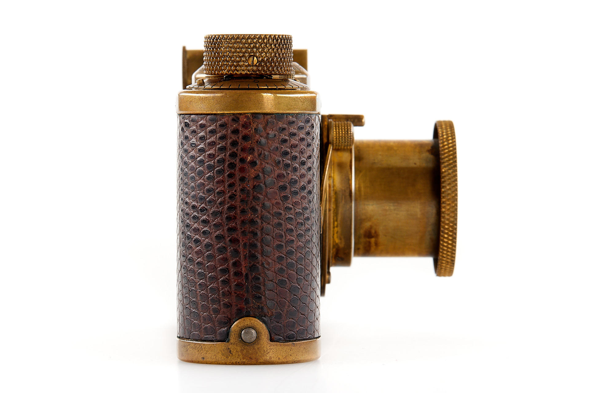 The elusive 'Luxus' Leica in 100% original and very good condition. The camera with gold plated metal parts and a lizard-skin covered body was never restored and shows the typical light patina. Only 95 'Luxus' Leicas were produced from 1929 to 1931; some were later converted or upgraded - only a handful of cameras exist in this original condition. An original Luxus Leica is one of the major rarities in the Leica world. The offered example was delivered to New York in 1930 as LESSALUX (Leica Luxus). See Lager I page 26 for an antecedent camera no.48401.