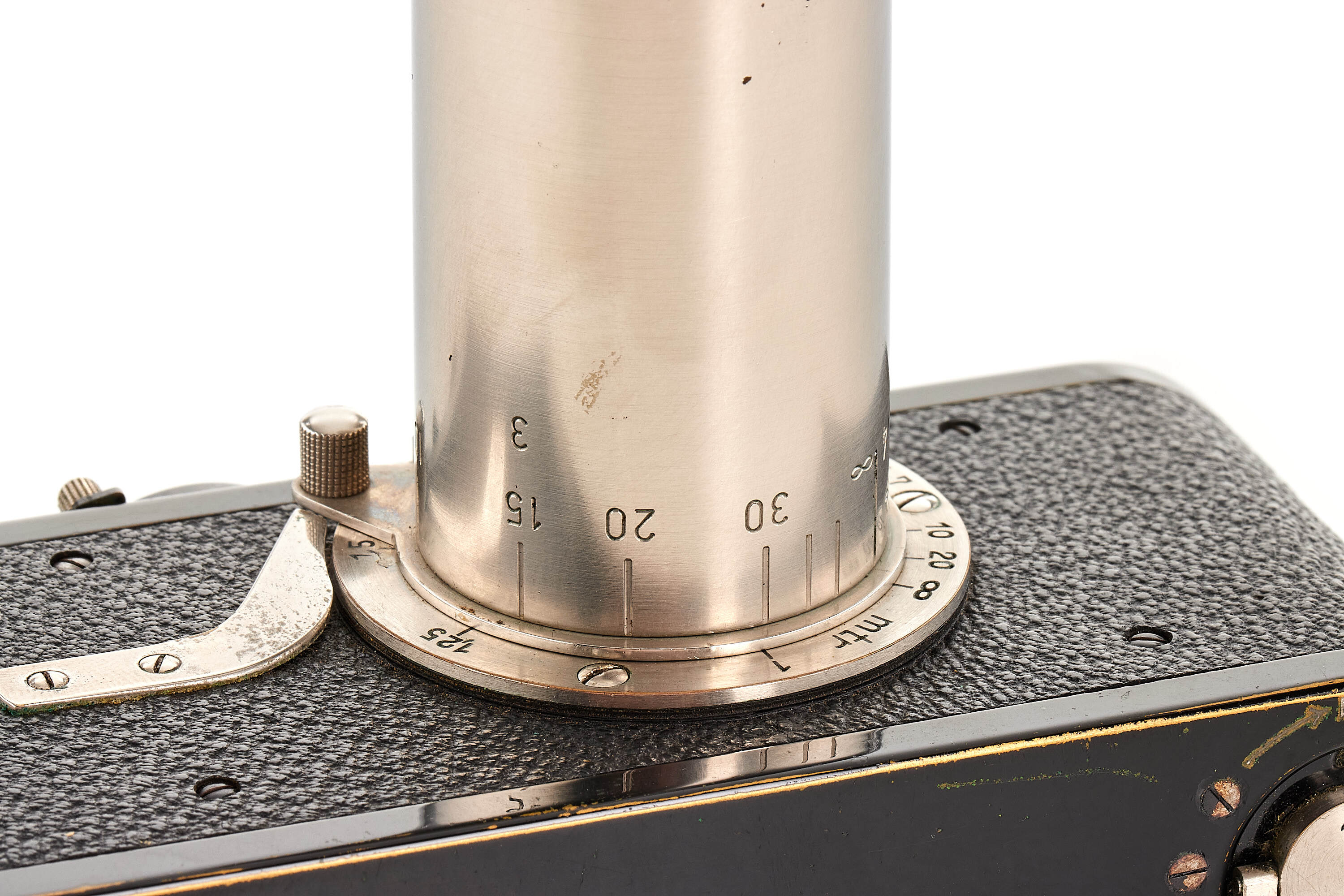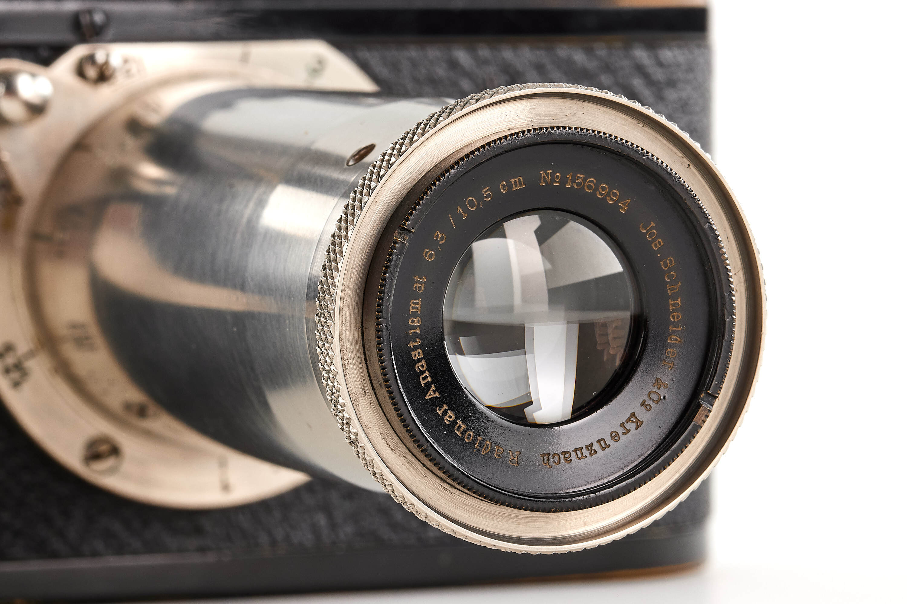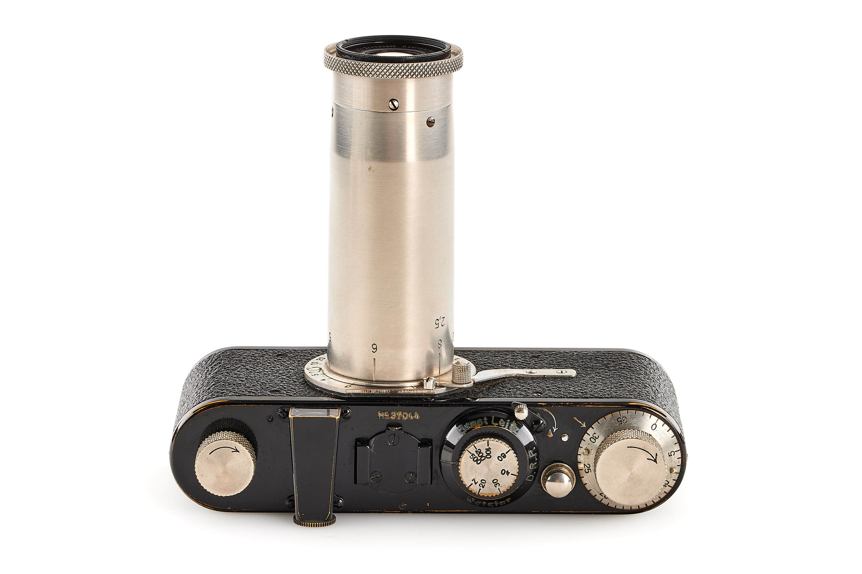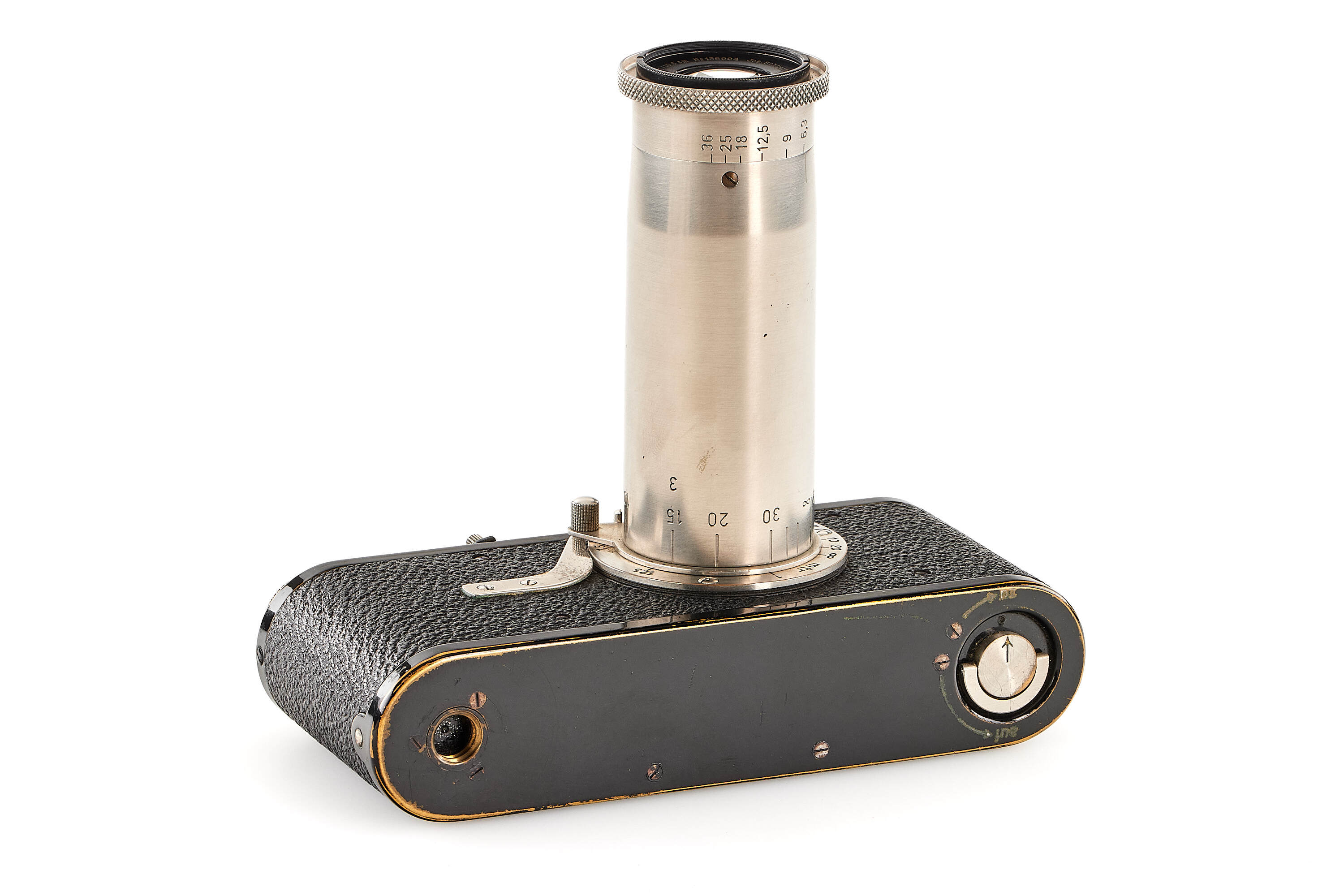 Interesting Leica I Mod. A 7th version (see von Einem 'Die 10 Varianten der klassischen Leica I A mit Elmar 1:3.5 F=50mm') in very good condition, originally fitted with an Elmar 3.5/50mm and delivered to retailer Wünsche, Frankfurt, on 17.04.1930, here professionally modified (not by Leica) with fixed tele-lens Schneider Anastigmat Radionar 6.3/10.5cm no.136994 (1926), this type of lens comes from a 6x9 folding cameras, mounted at the end of a nickel plated lens barrel scaled in meter, together with Leica black paint front lens cap.