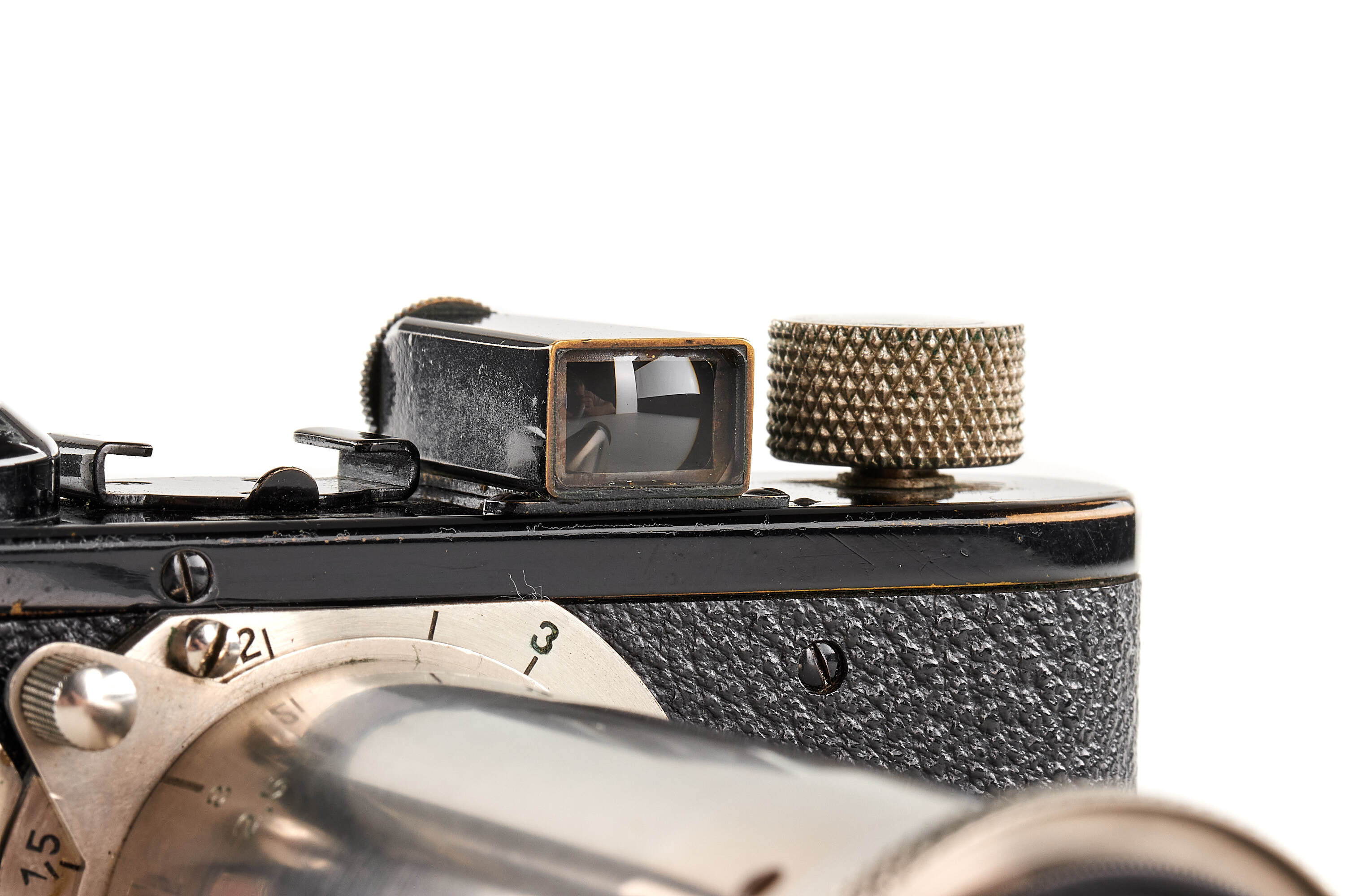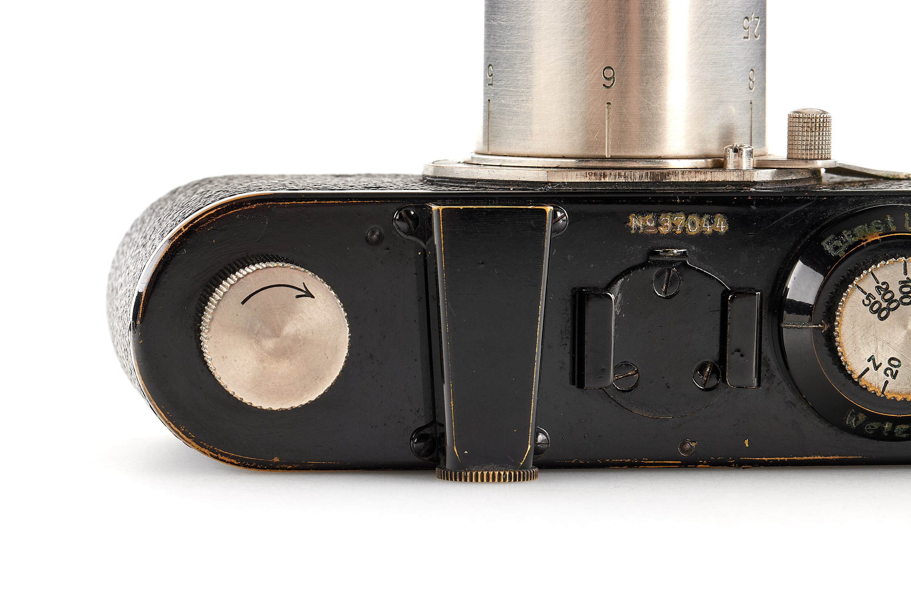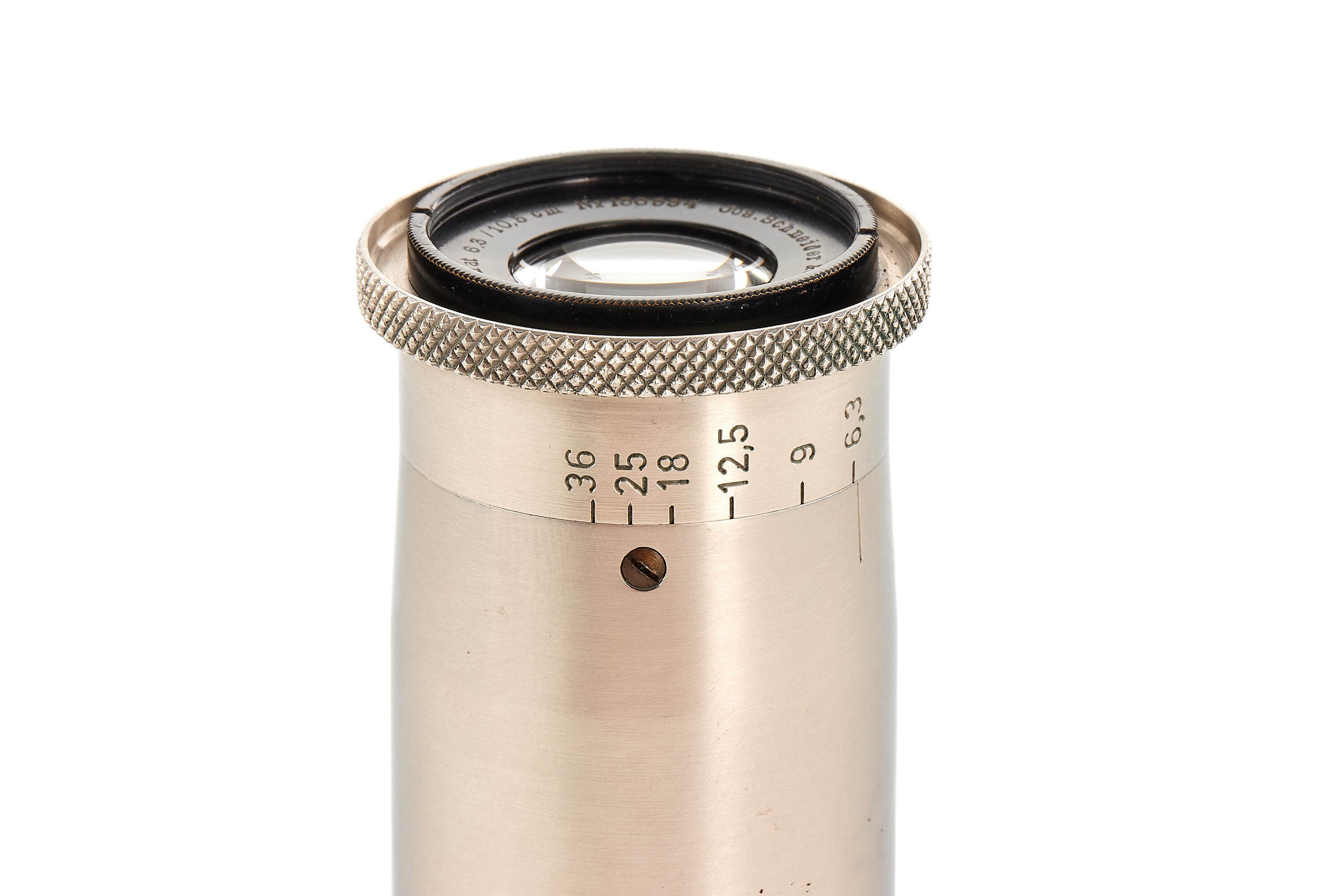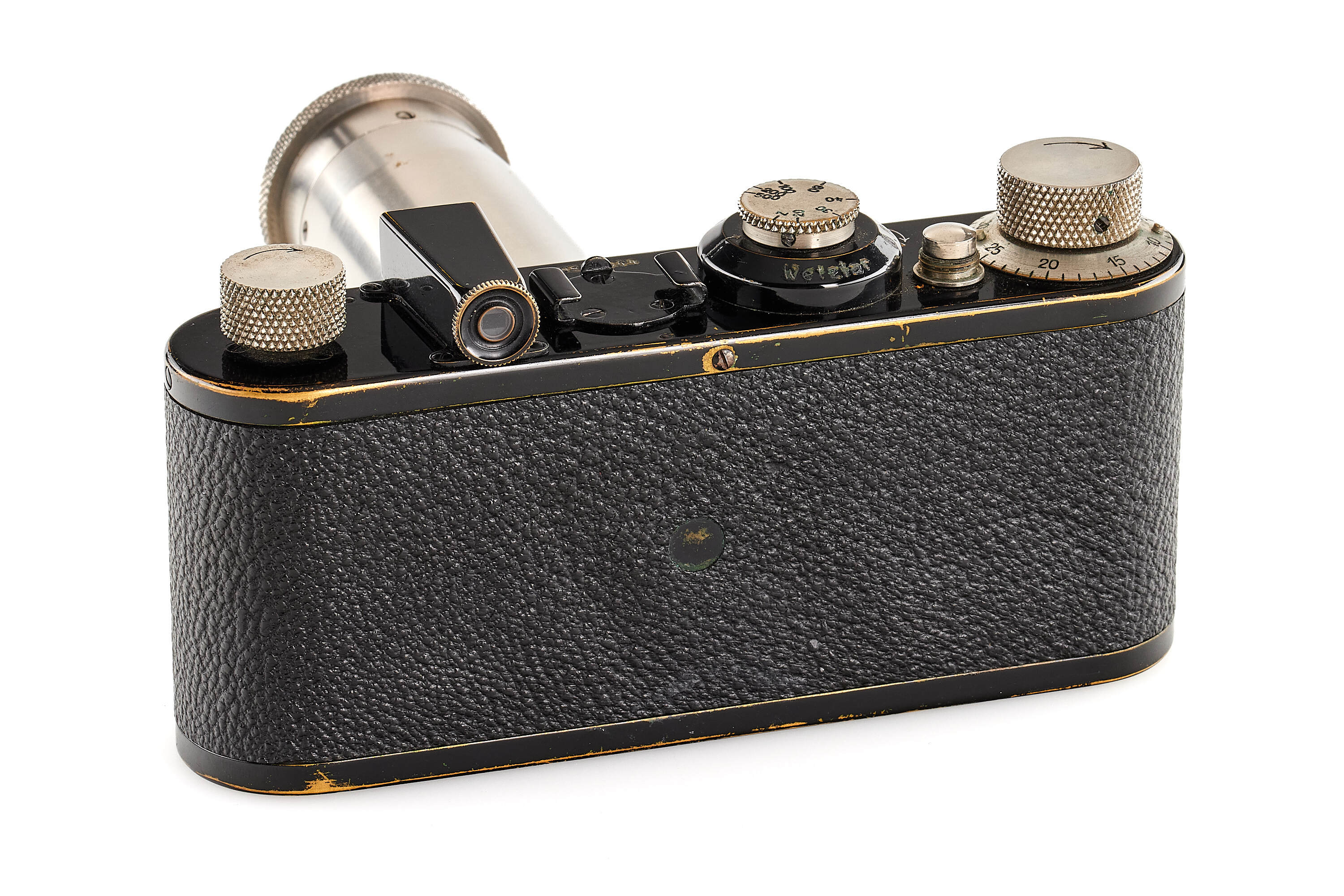 Interesting Leica I Mod. A 7th version (see von Einem 'Die 10 Varianten der klassischen Leica I A mit Elmar 1:3.5 F=50mm') in very good condition, originally fitted with an Elmar 3.5/50mm and delivered to retailer Wünsche, Frankfurt, on 17.04.1930, here professionally modified (not by Leica) with fixed tele-lens Schneider Anastigmat Radionar 6.3/10.5cm no.136994 (1926), this type of lens comes from a 6x9 folding cameras, mounted at the end of a nickel plated lens barrel scaled in meter, together with Leica black paint front lens cap.
