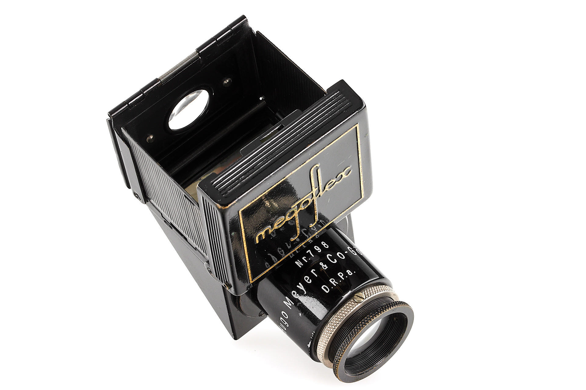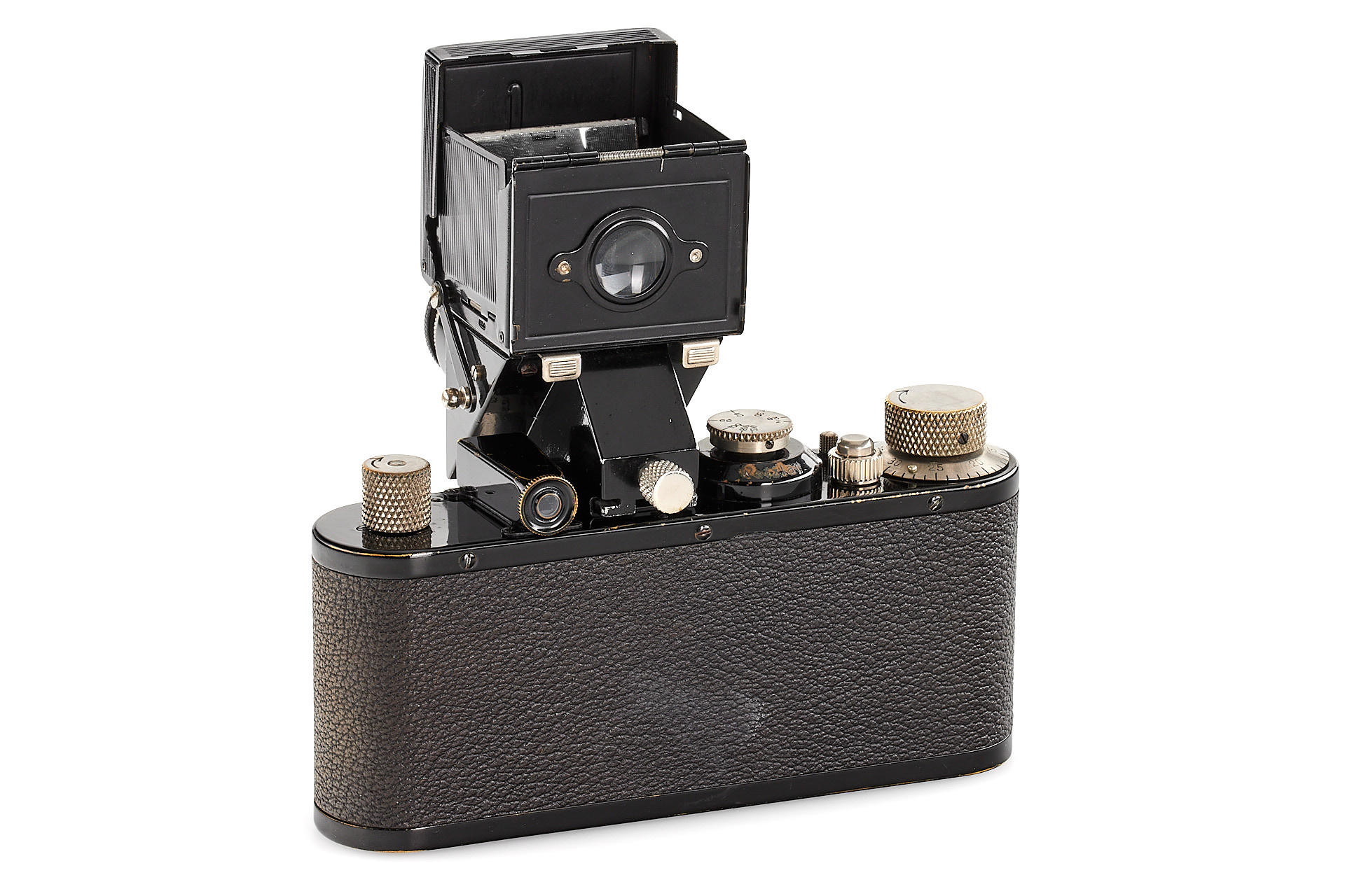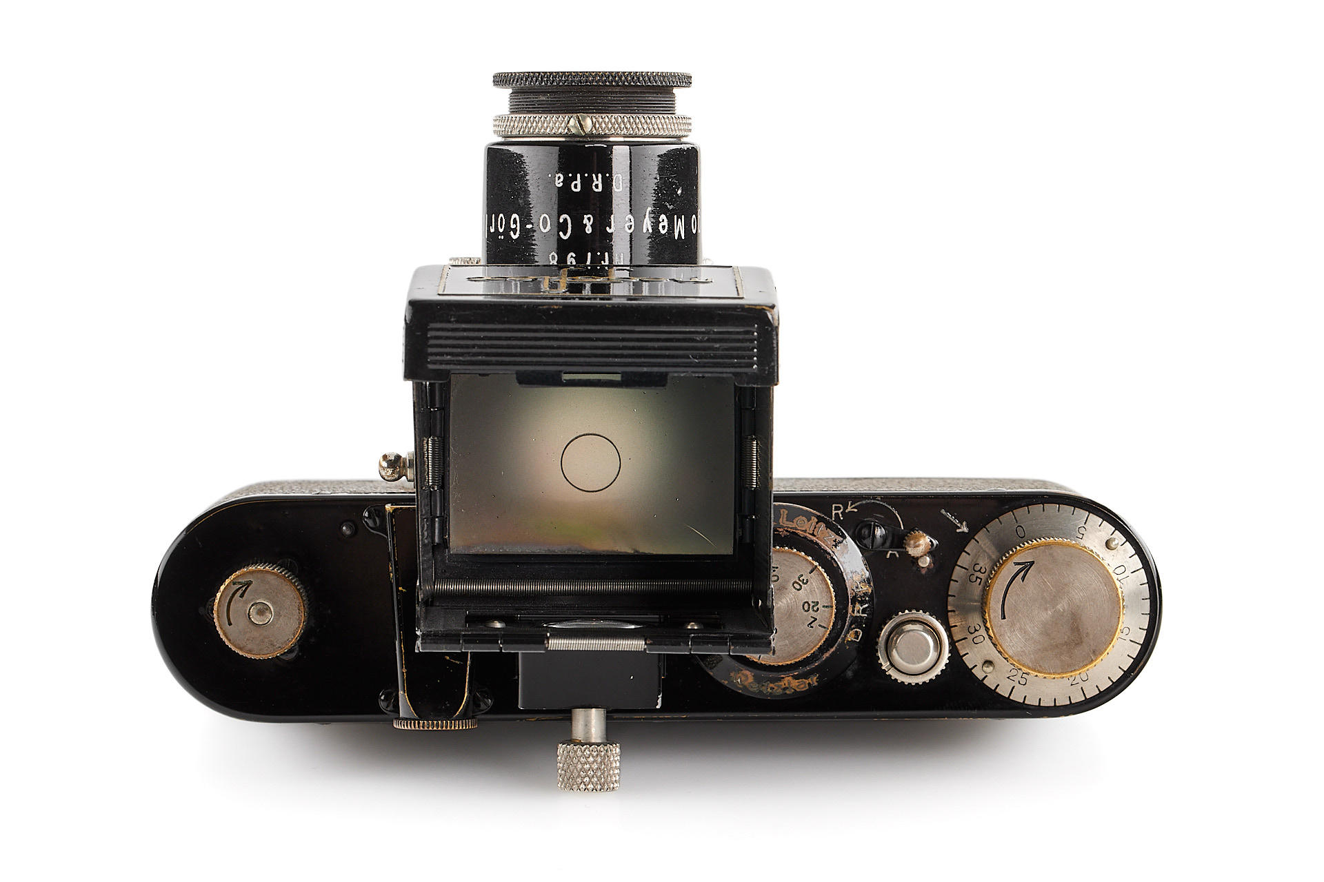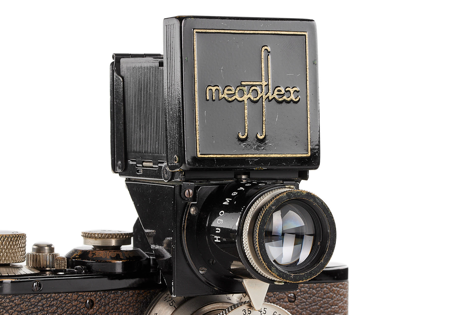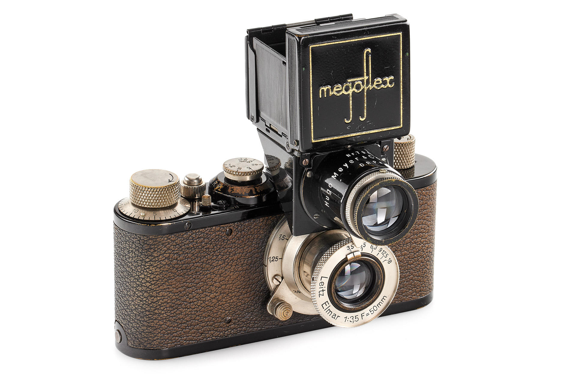 original IC with standardized mount in good condition and working order, with unnumbered nickel Elmar 3.5/50mm, with Hugo Meyer Megoflex no.798, early reflex-finder for Leica I with Elmar, engraved D.R.P.a., in original condition (see: v.Einem 'Die 10 Varianten der klassischen Leica I A mit Elmar 1:3.5 F=50mm')