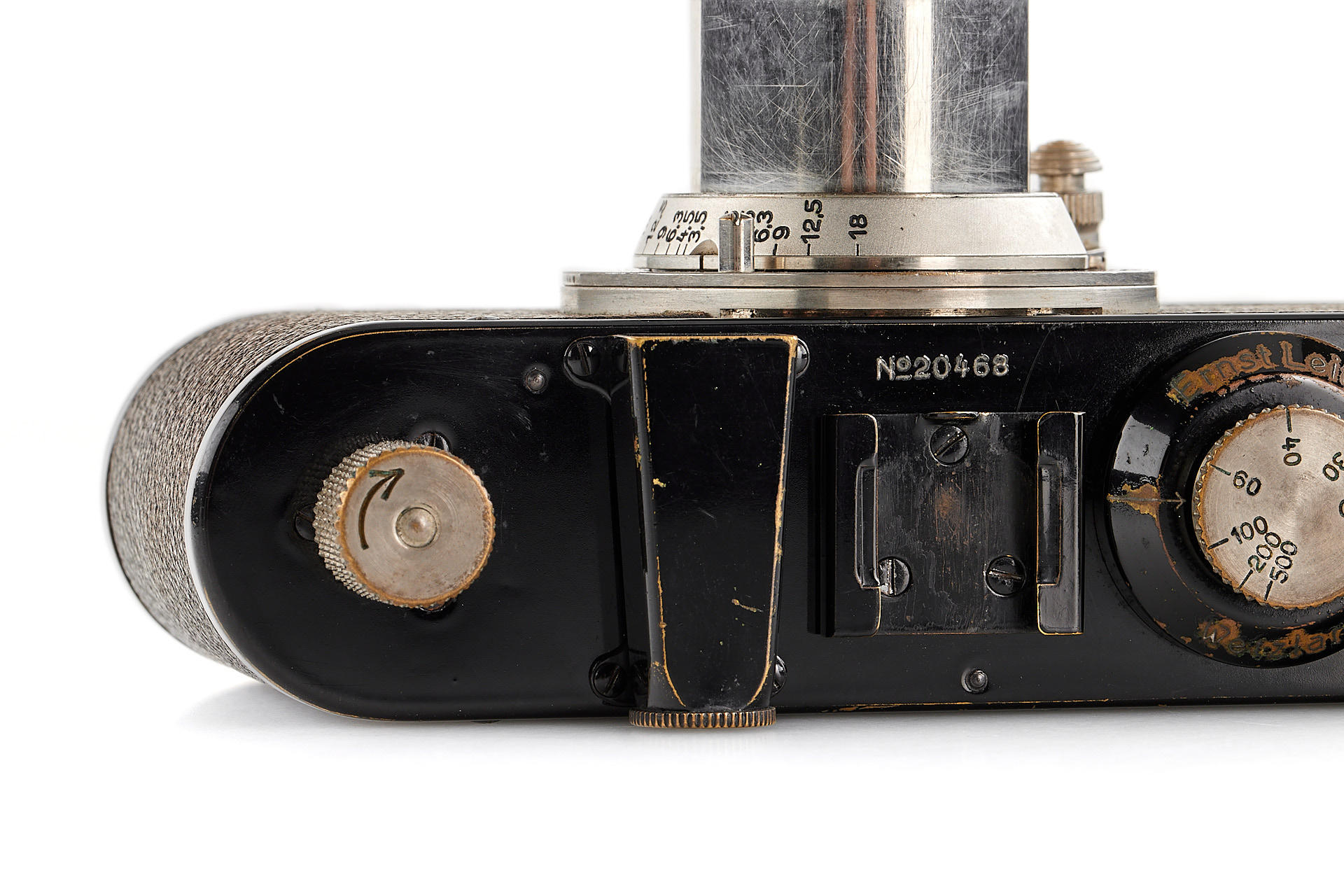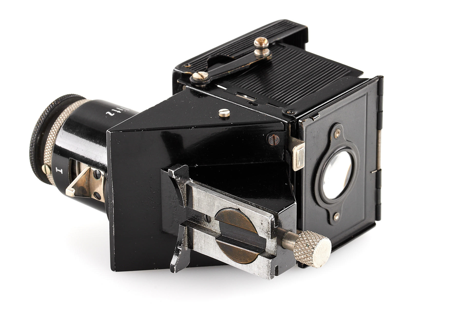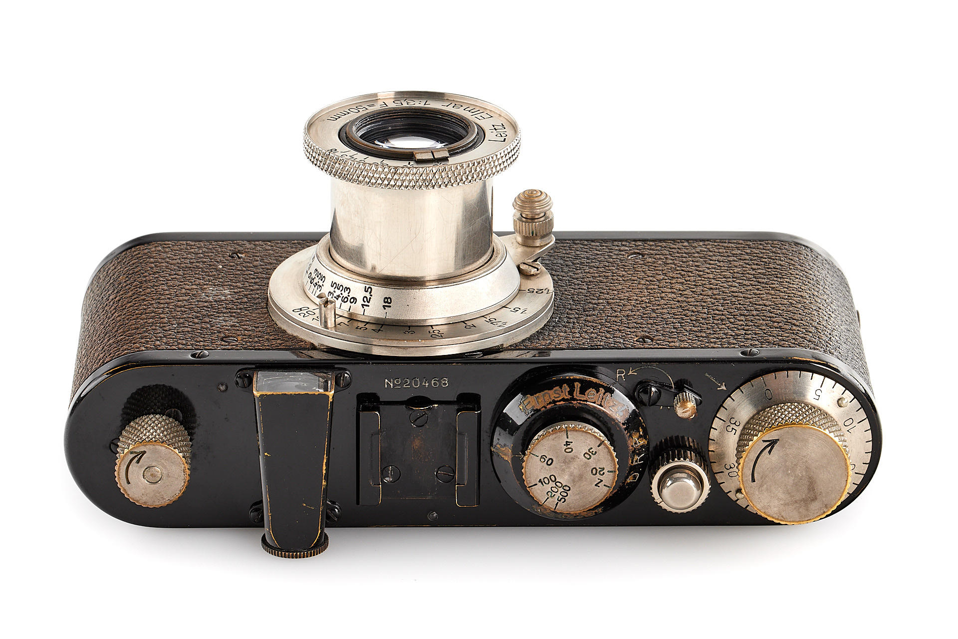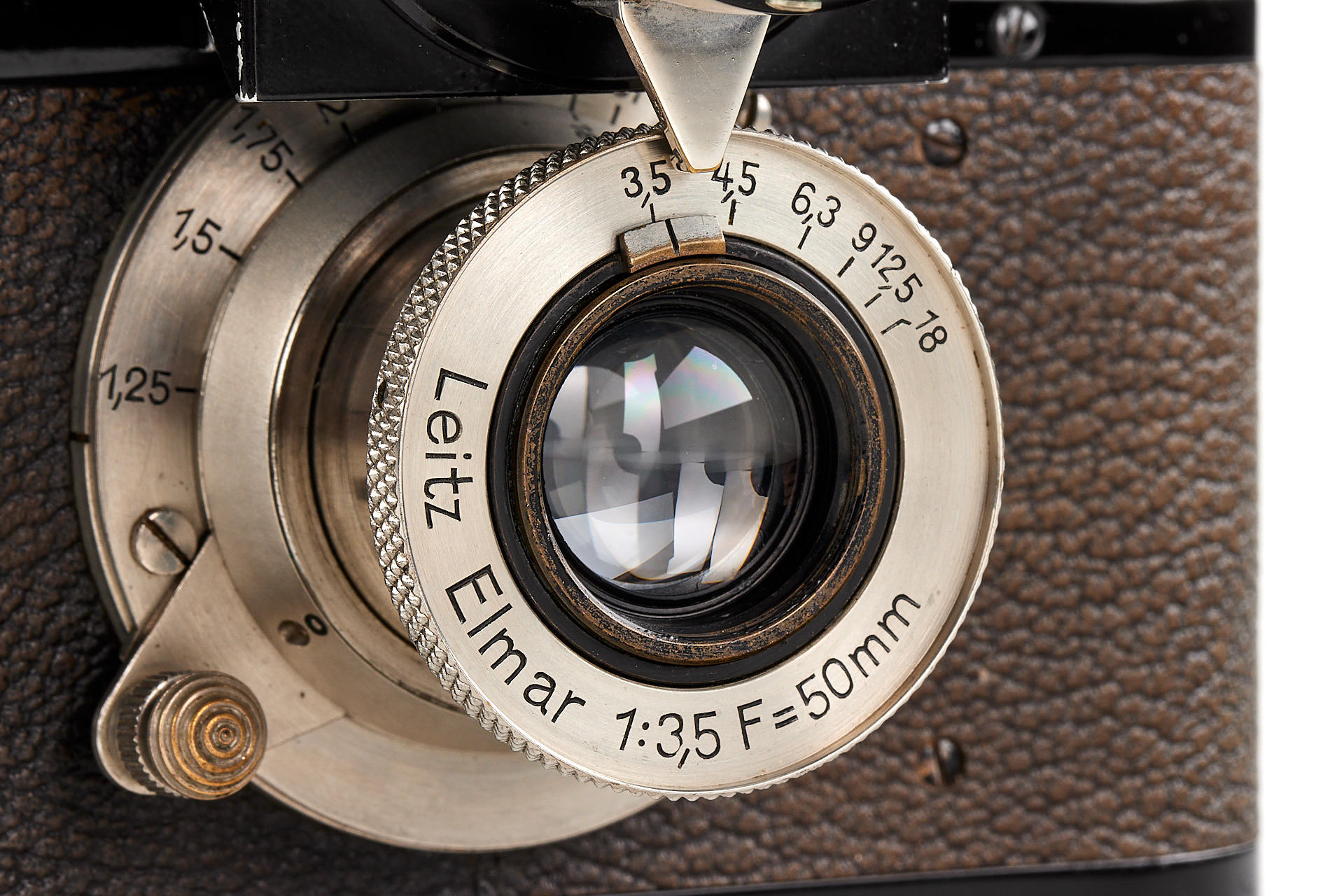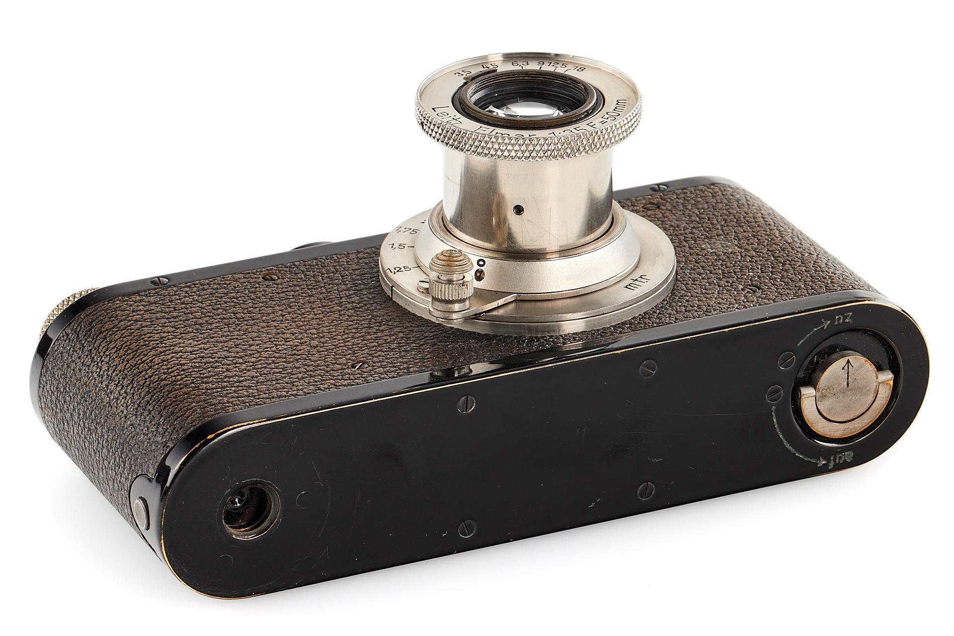 original IC with standardized mount in good condition and working order, with unnumbered nickel Elmar 3.5/50mm, with Hugo Meyer Megoflex no.798, early reflex-finder for Leica I with Elmar, engraved D.R.P.a., in original condition (see: v.Einem 'Die 10 Varianten der klassischen Leica I A mit Elmar 1:3.5 F=50mm')