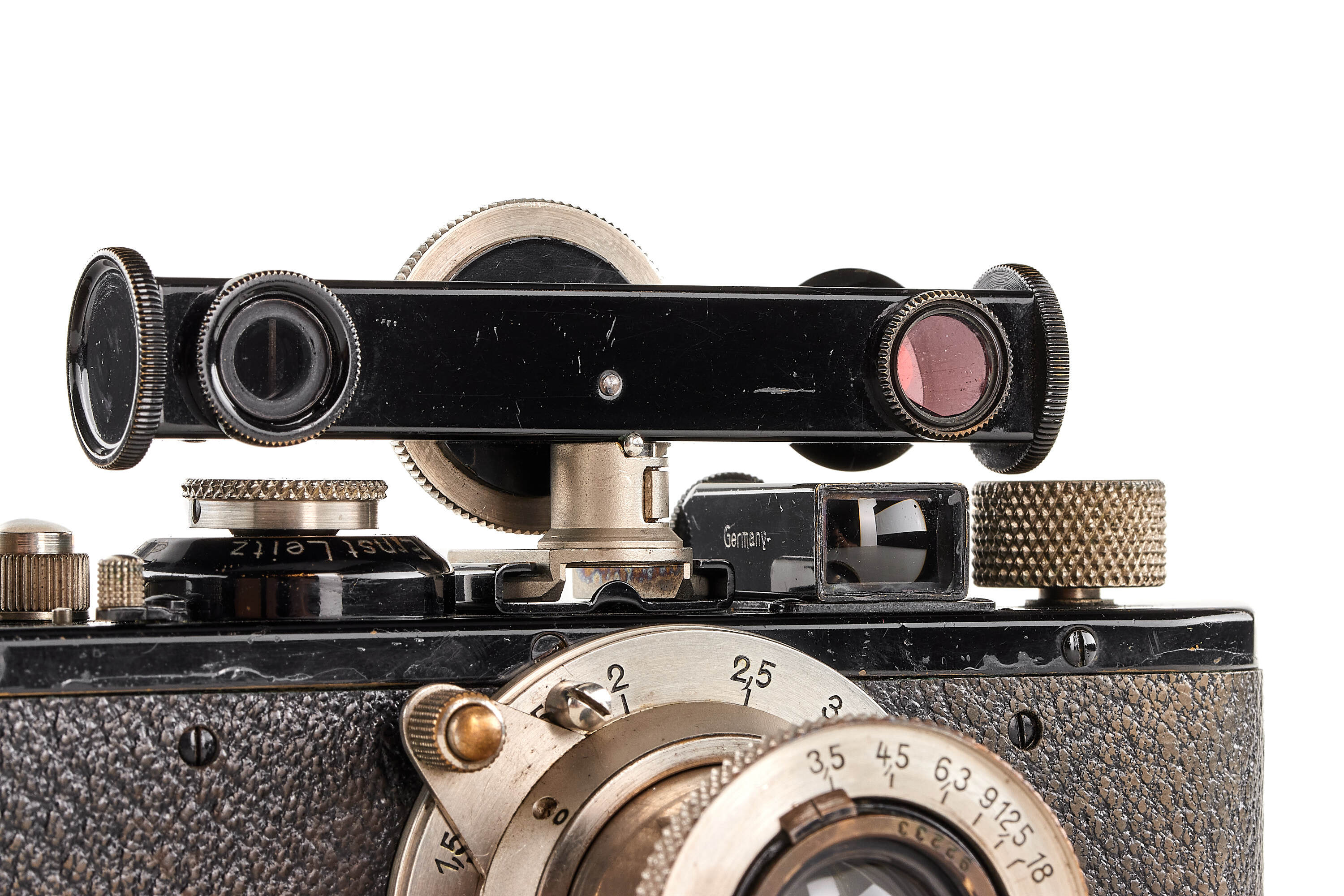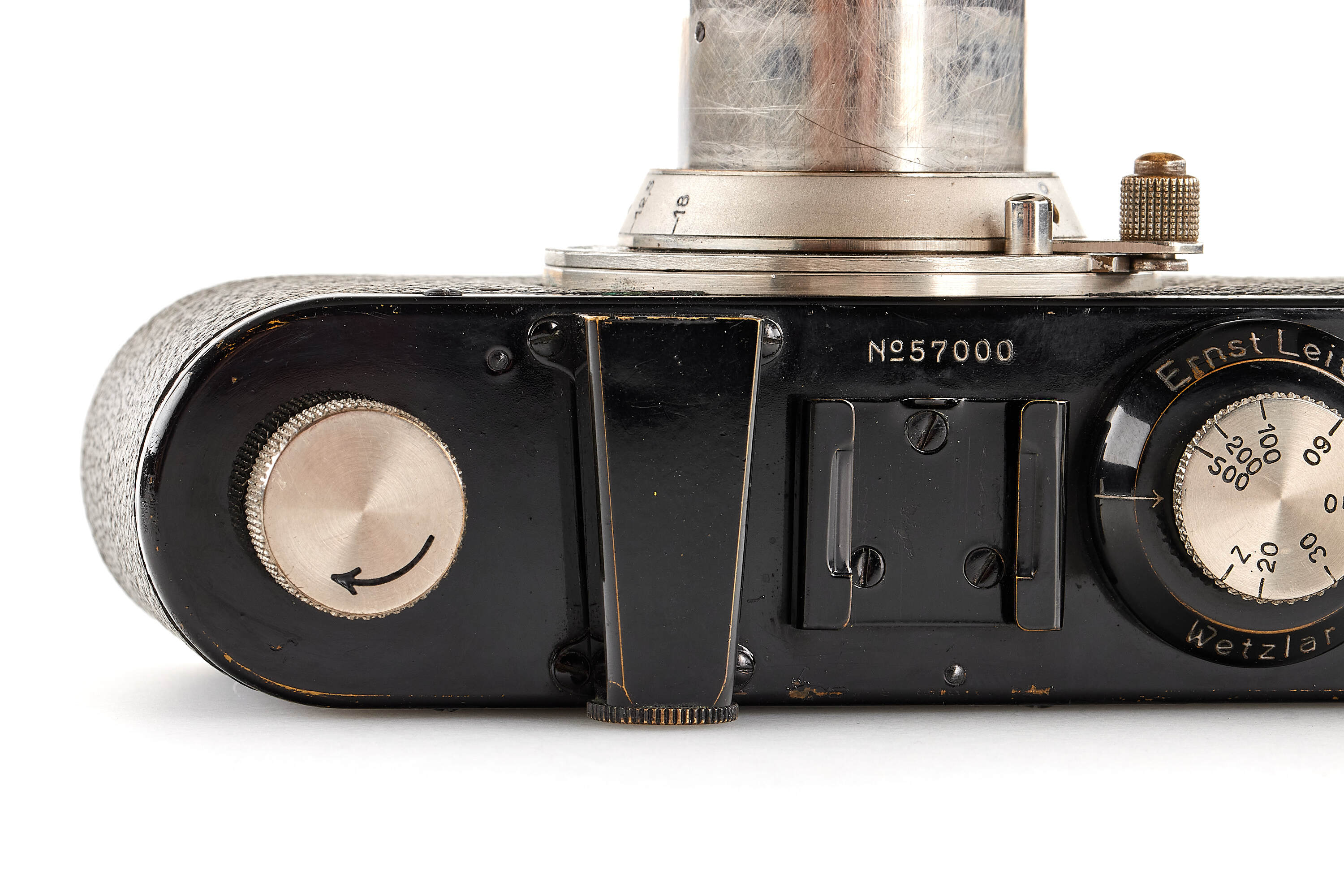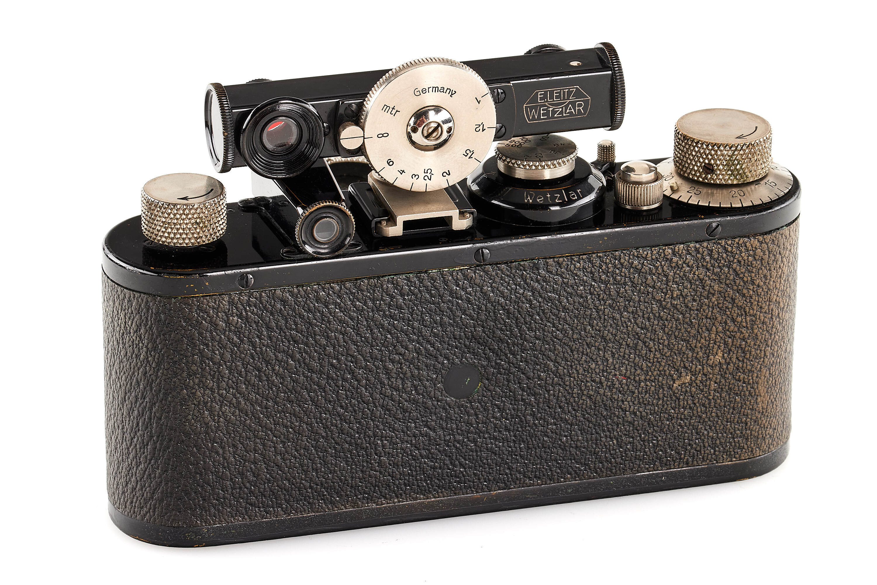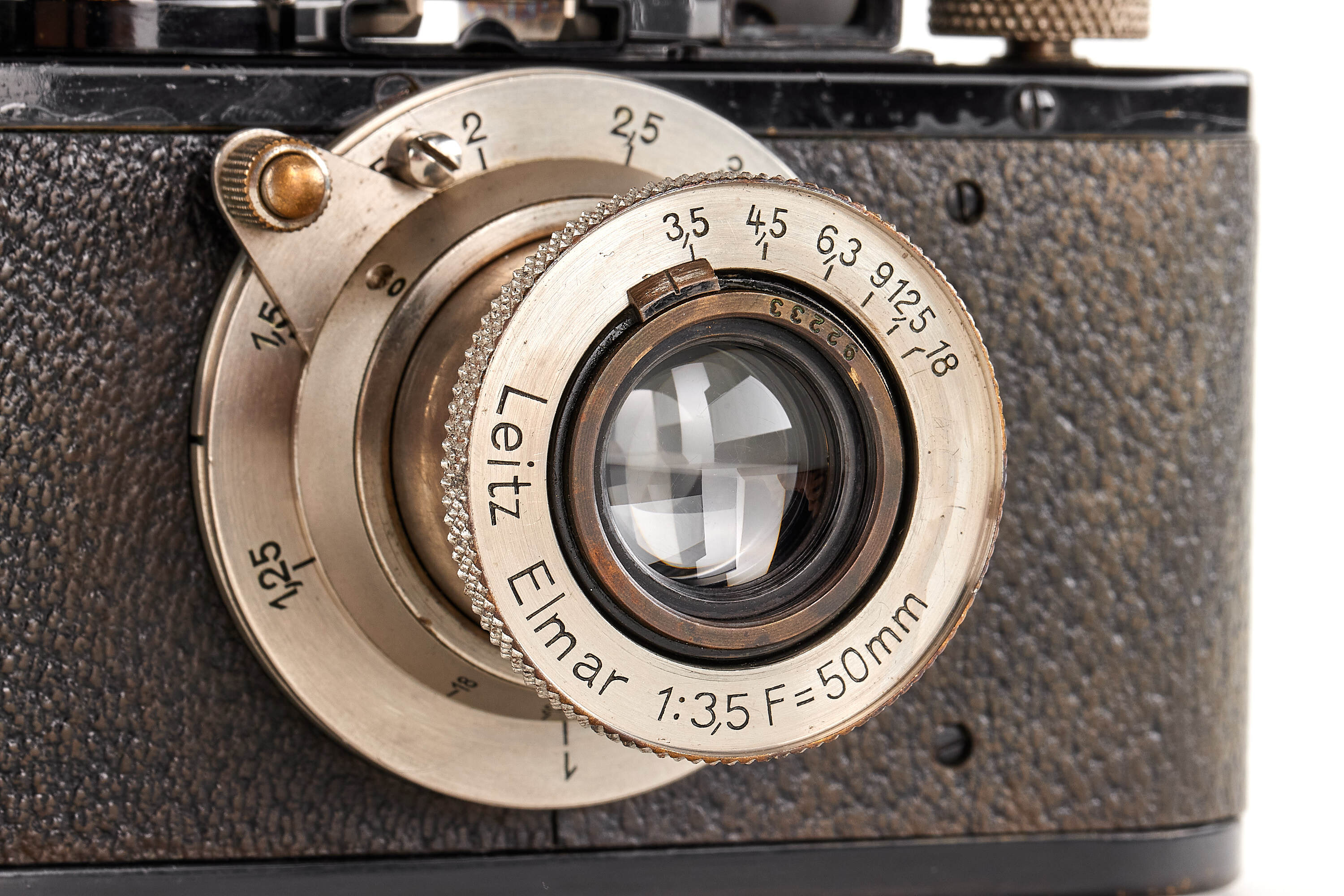 Beautiful standardized version with round serial number, in very good condition, with Elmar 3.5/50mm no.92233, optics showing some cleaning marks on the front element, with front lens cap and black/nickel FOKOS meter scale with shoe allowing the flip.