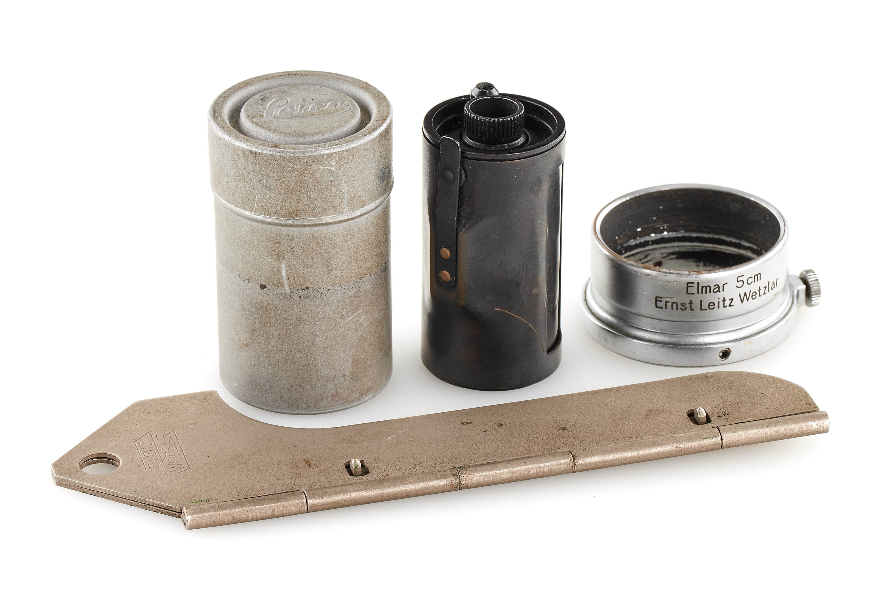 Nice outfit including a body Leica II Mod. D, in very good, original condition, nickel Elmar 3.5/35mm no.171464 (light haze and discrete cleaning marks) with both caps, nickel Elmar 3.5/50mm no.170215 (minimal haze cleaning marks) with front cap, chrome FISON hood, ELPIK and ELPRO close-up lenses (maker's boxes), black/chrome Elmar 4/9cm no.454407 (light haze) with both caps, VIDOOH universal finder no.33157, nickel ABLON film trimming template, black WINKO right-angle finder, green and yellow filters, 2x FILCA reloadable film cassettes with one chrome metal box, in ETTRE outfit case.
