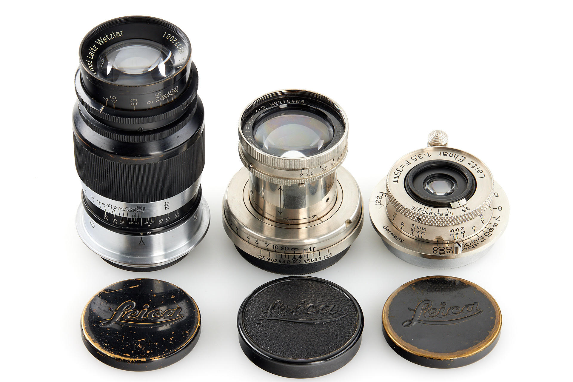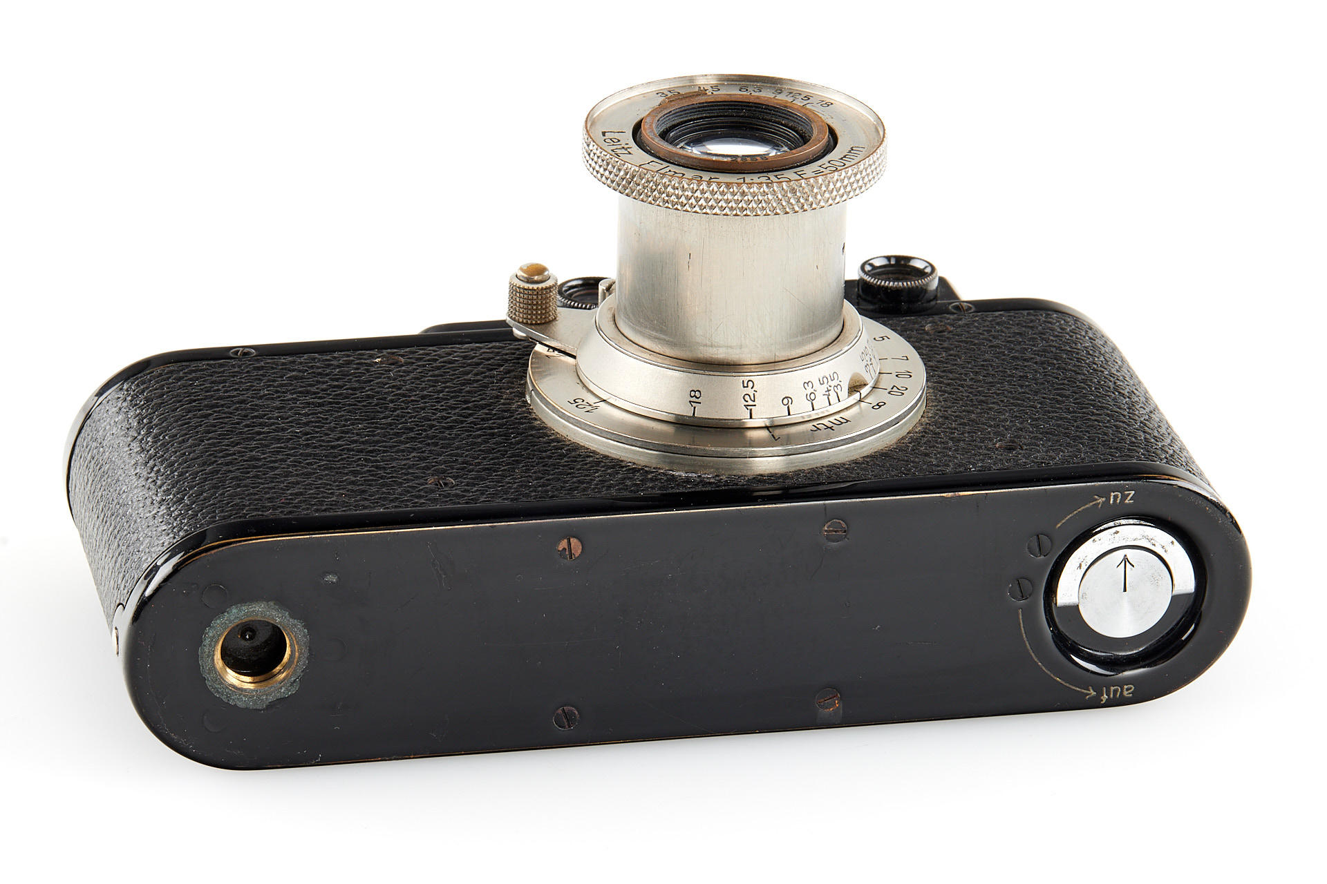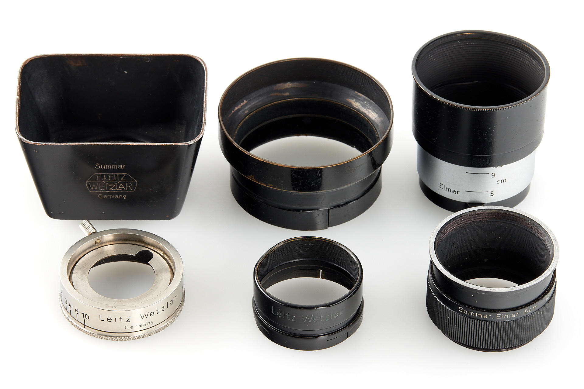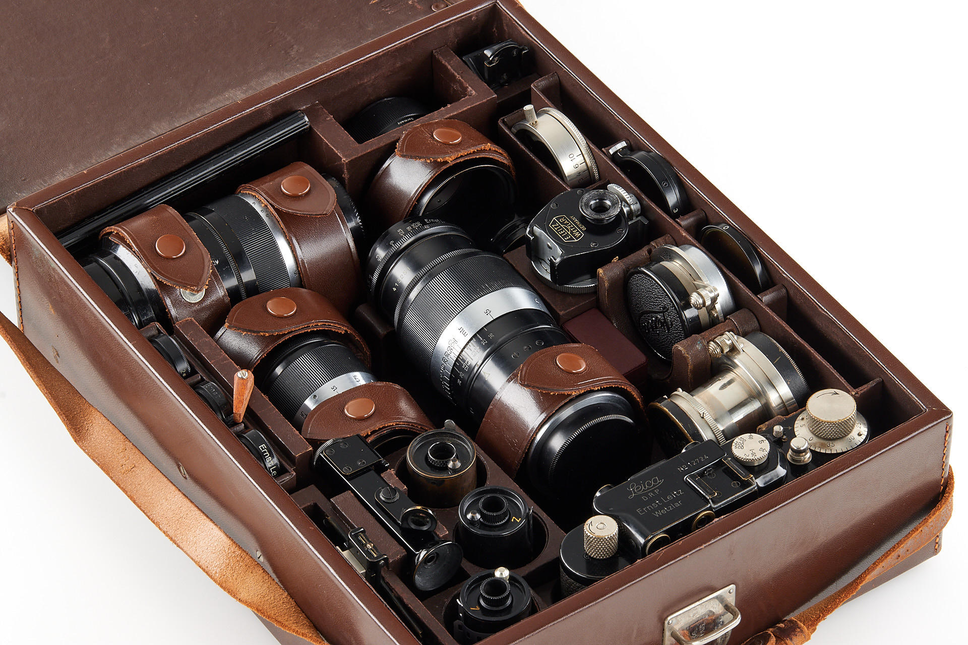 Extensive outfit including a body Leica I Mod. A upgraded to II Mod. D in very good condition, unnumbered nickel Elmar 3.5/35mm (light haze) with both caps and hood, nickel Elmar 3.5/50mm no.132888 (minimal cleaning marks) with front cap, nickel Summar 2/5cm no.216468 (light cleaning marks) with both caps and hood, black/chrome Elmar 4/9cm no.372001 showing some haze, black/chrome meter scale Thambar 2.2/9cm no.375329 (light haze) with spot filter and hood, manually engraved with feet scale, Hektor 4.5/13.5cm no.415251 showing some haze, with rear cap, VIDOOH finder no.80908, black RASUK finder, AUFSU type 2, black WINTU, BEKUR 1:2 extension ring, black/chrome FIKUS 5-13.5cm, close-up filter set 1-2-3, 'Hepet' (maker's box), slip-on orange filter, hand film winder AGRIF, UV filter, 3x film spools, aperture ring for Elmar 3.5/5cm as enlarger lens, in ETGUS outfit case
