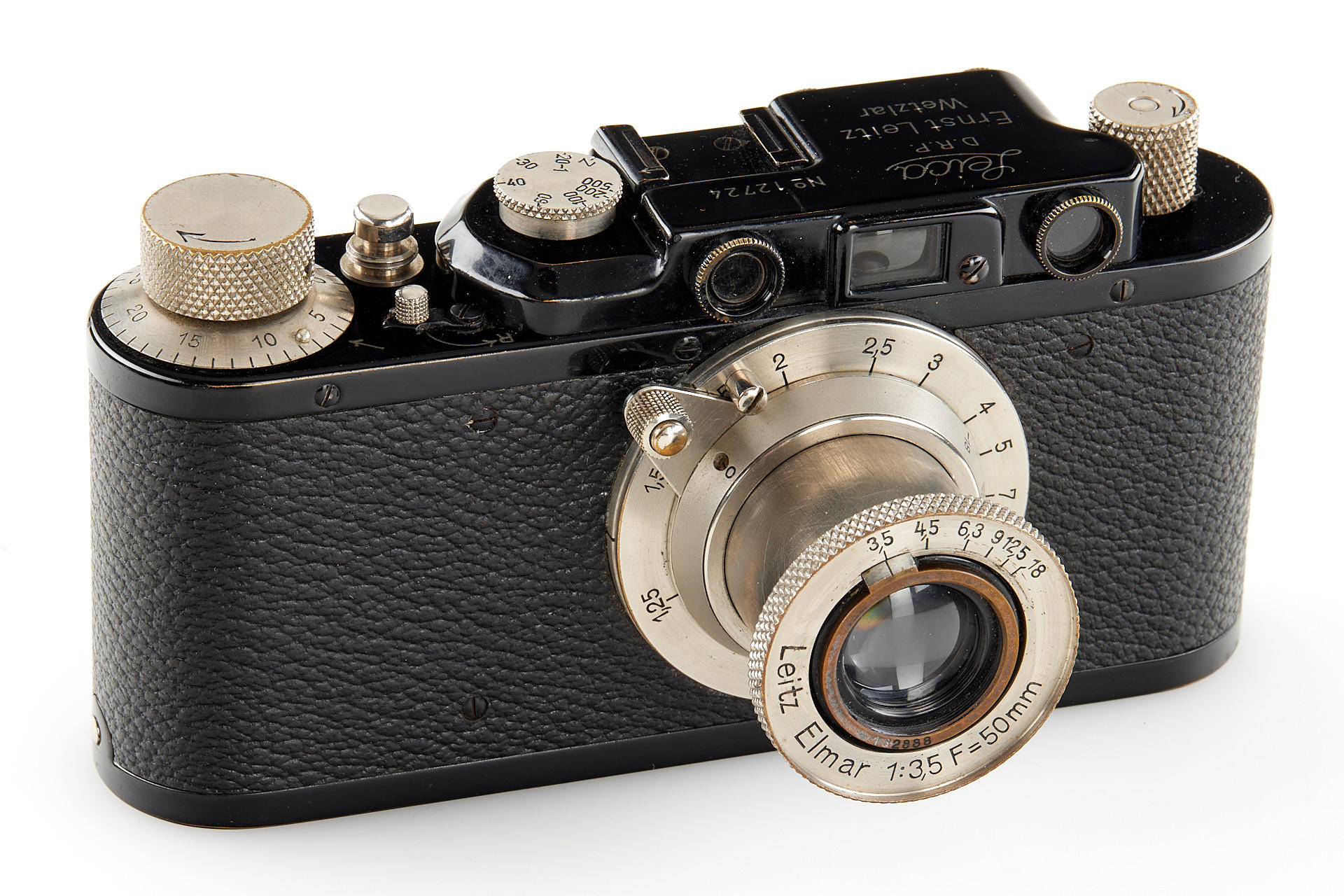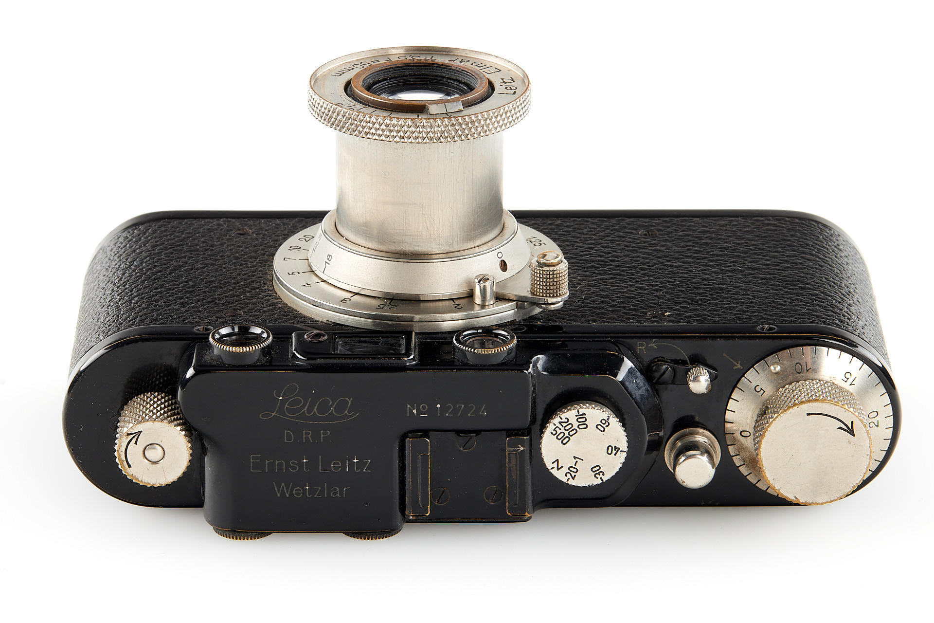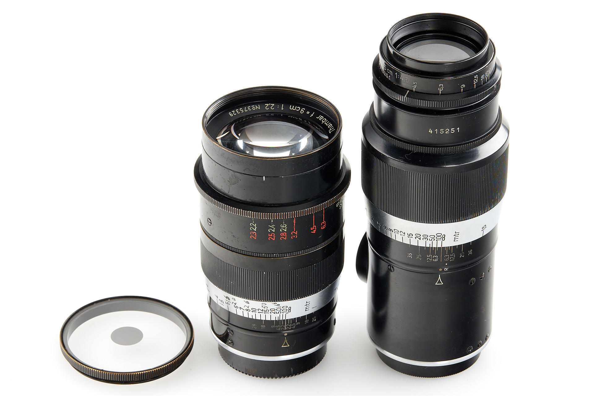 Extensive outfit including a body Leica I Mod. A upgraded to II Mod. D in very good condition, unnumbered nickel Elmar 3.5/35mm (light haze) with both caps and hood, nickel Elmar 3.5/50mm no.132888 (minimal cleaning marks) with front cap, nickel Summar 2/5cm no.216468 (light cleaning marks) with both caps and hood, black/chrome Elmar 4/9cm no.372001 showing some haze, black/chrome meter scale Thambar 2.2/9cm no.375329 (light haze) with spot filter and hood, manually engraved with feet scale, Hektor 4.5/13.5cm no.415251 showing some haze, with rear cap, VIDOOH finder no.80908, black RASUK finder, AUFSU type 2, black WINTU, BEKUR 1:2 extension ring, black/chrome FIKUS 5-13.5cm, close-up filter set 1-2-3, 'Hepet' (maker's box), slip-on orange filter, hand film winder AGRIF, UV filter, 3x film spools, aperture ring for Elmar 3.5/5cm as enlarger lens, in ETGUS outfit case
