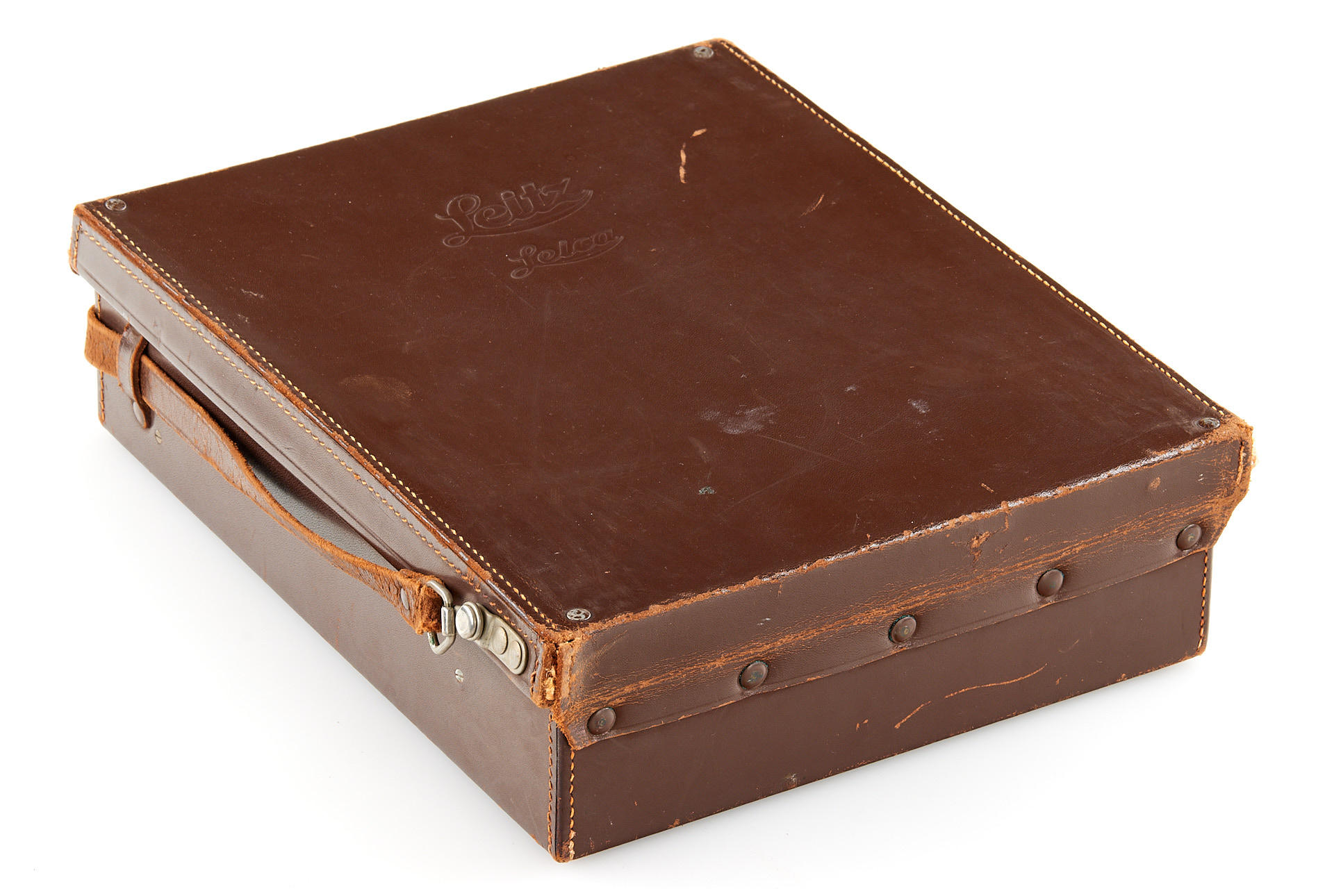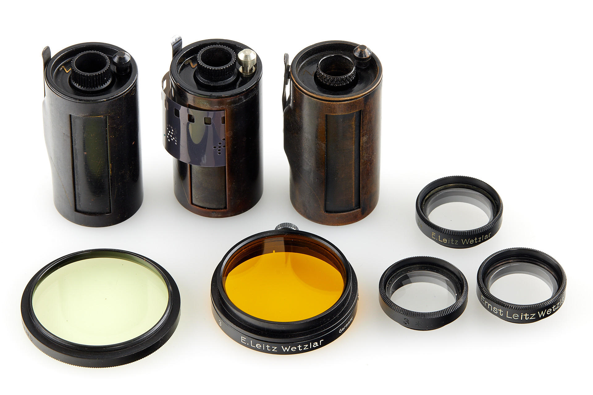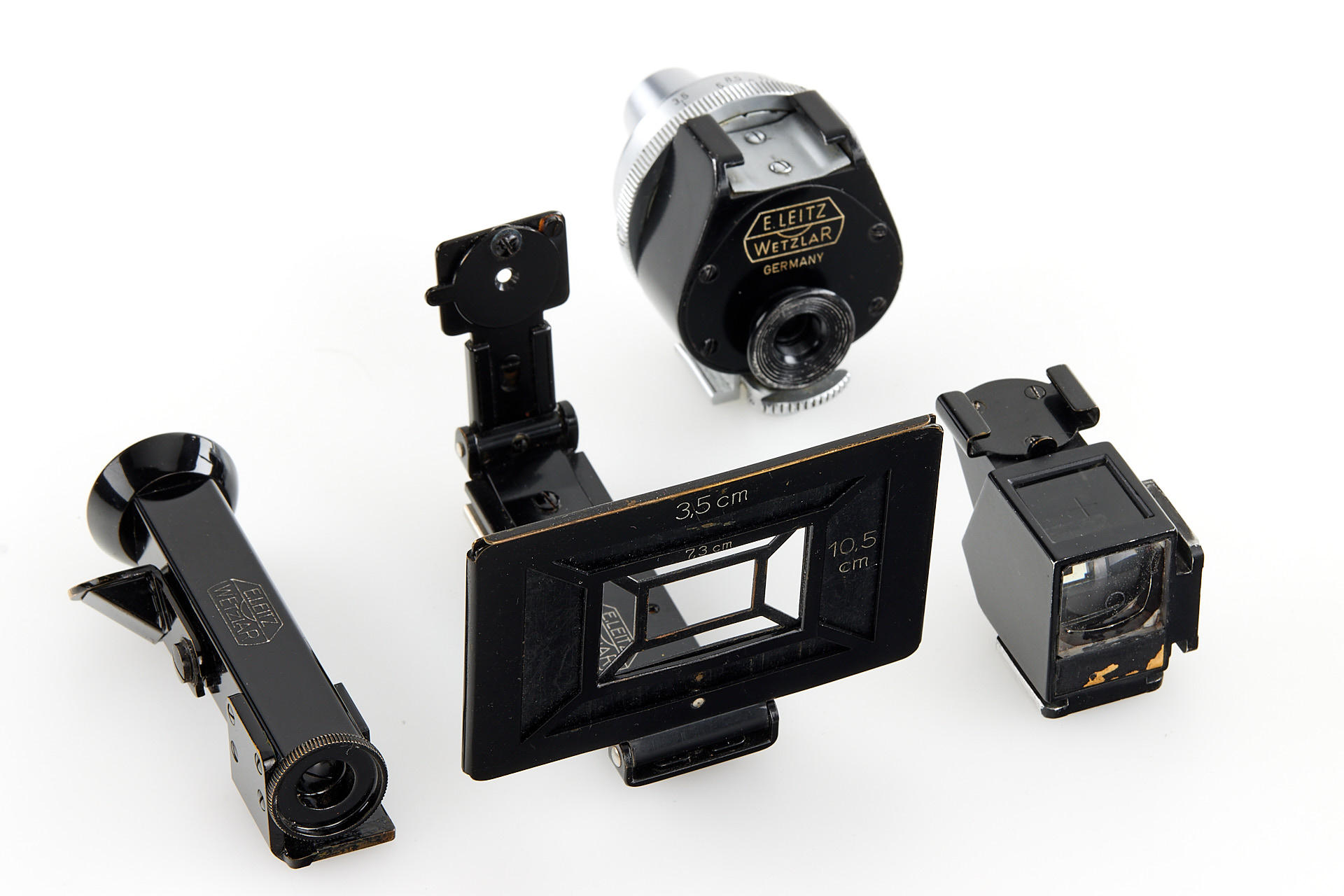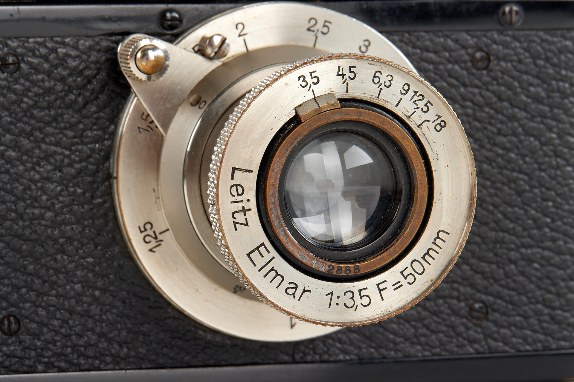 Extensive outfit including a body Leica I Mod. A upgraded to II Mod. D in very good condition, unnumbered nickel Elmar 3.5/35mm (light haze) with both caps and hood, nickel Elmar 3.5/50mm no.132888 (minimal cleaning marks) with front cap, nickel Summar 2/5cm no.216468 (light cleaning marks) with both caps and hood, black/chrome Elmar 4/9cm no.372001 showing some haze, black/chrome meter scale Thambar 2.2/9cm no.375329 (light haze) with spot filter and hood, manually engraved with feet scale, Hektor 4.5/13.5cm no.415251 showing some haze, with rear cap, VIDOOH finder no.80908, black RASUK finder, AUFSU type 2, black WINTU, BEKUR 1:2 extension ring, black/chrome FIKUS 5-13.5cm, close-up filter set 1-2-3, 'Hepet' (maker's box), slip-on orange filter, hand film winder AGRIF, UV filter, 3x film spools, aperture ring for Elmar 3.5/5cm as enlarger lens, in ETGUS outfit case