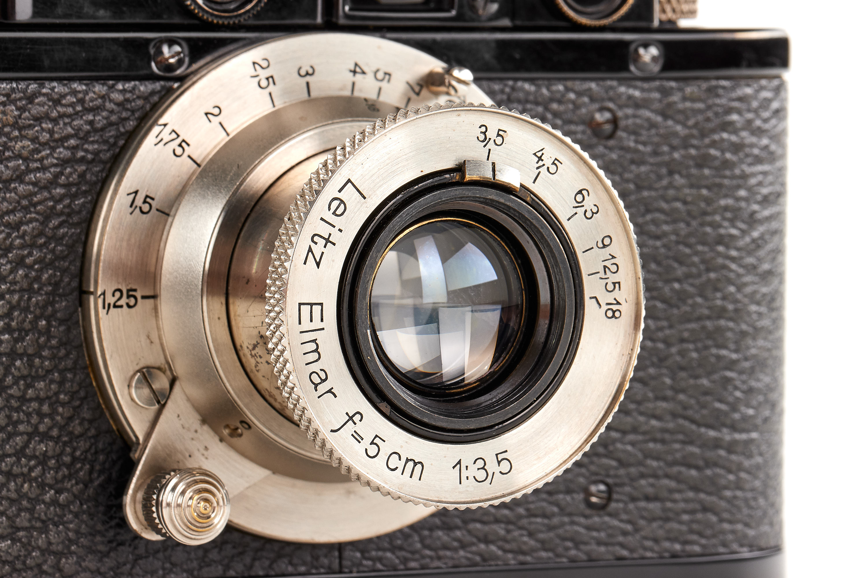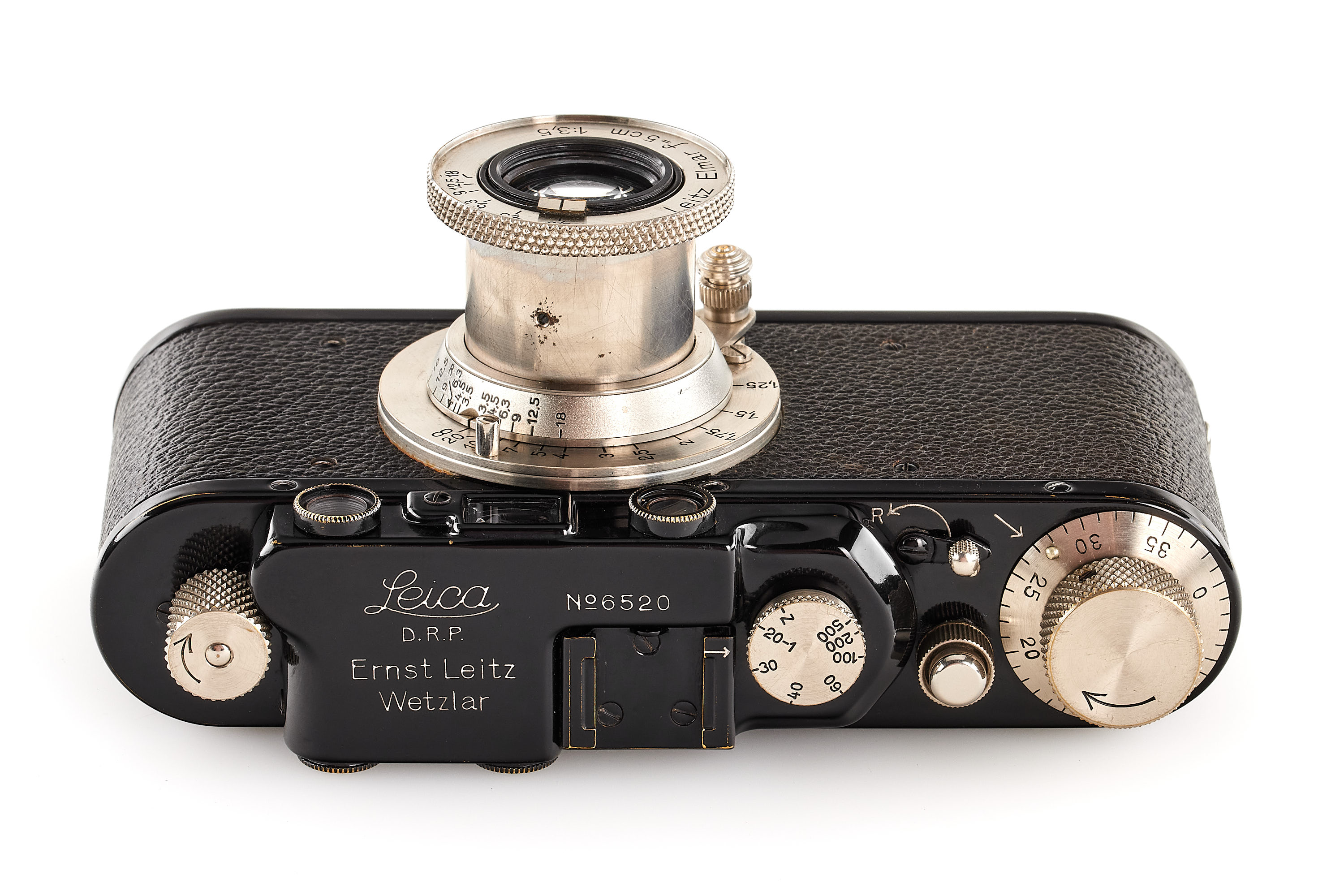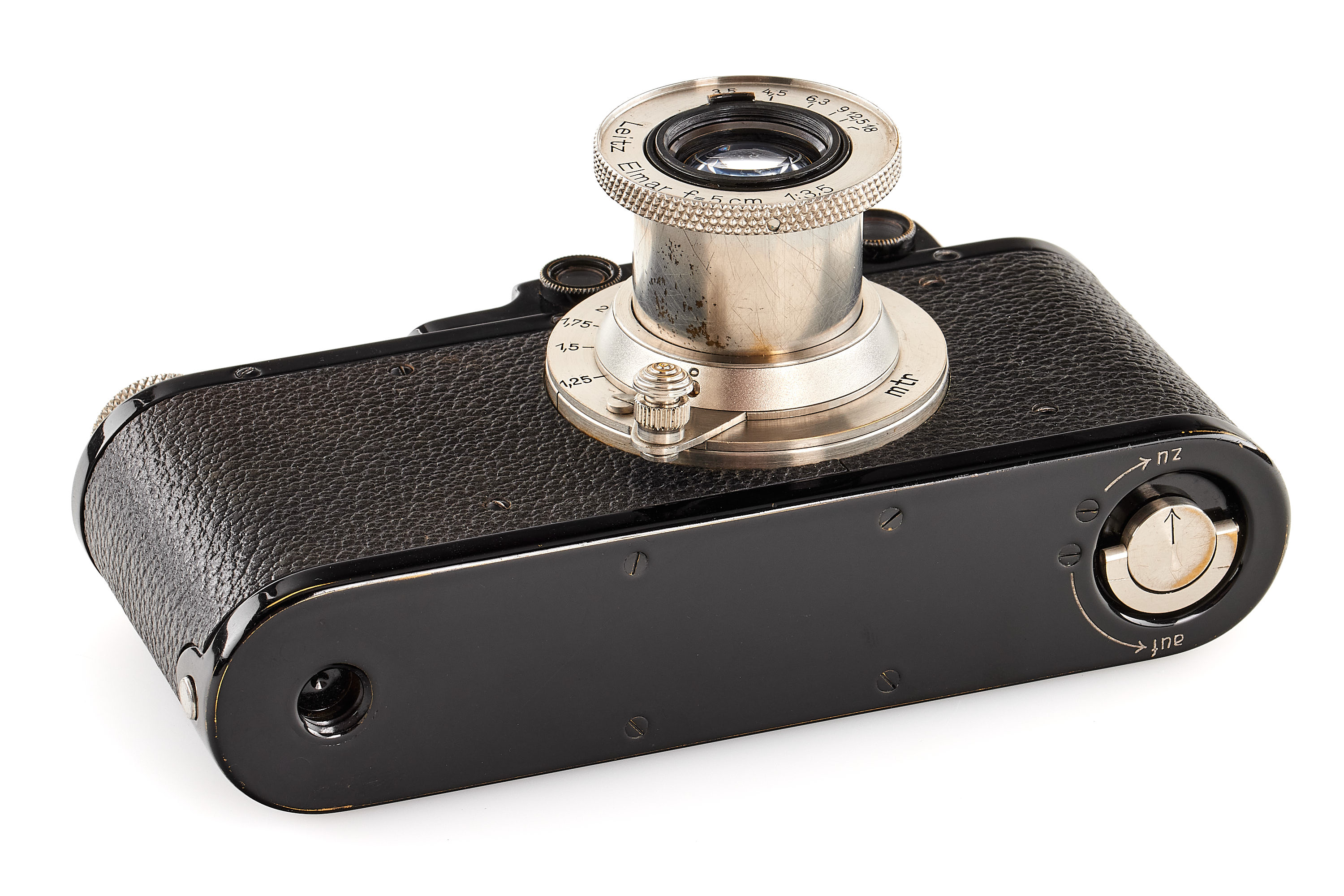 Beautiful black/nickel version in almost mint condition and working order, originally an early Leica I Model A delivered in 1928, upgraded to Leica II Mod. D by Leica, together with matching unnumbered nickel Elmar 3.5/5cm, meter scale version with good optics.