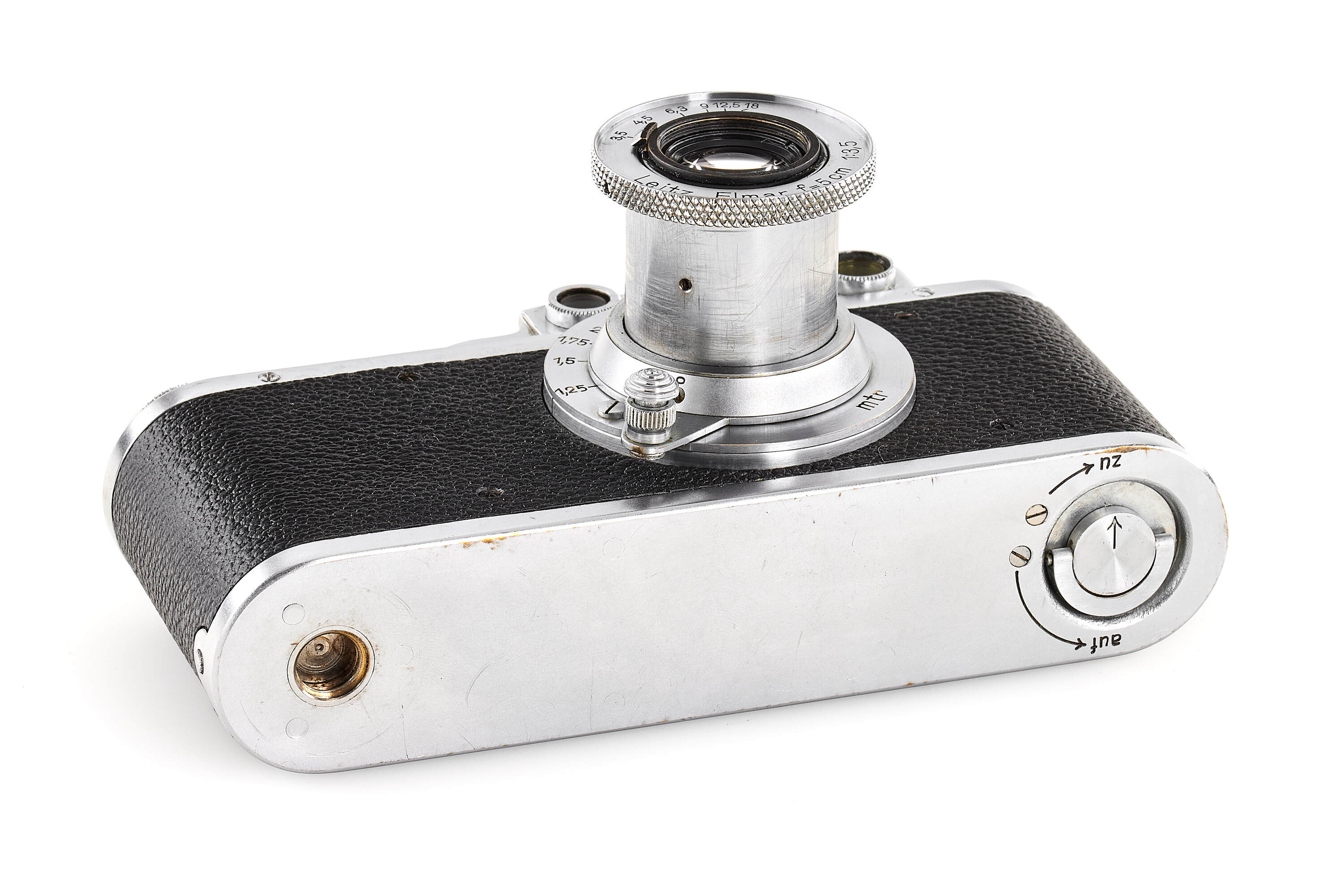 Very early and rare version in unusual bright chrome finish and doughnut-shaped shutter speed platform, in almost mint condition, delivered on 01.06.1933 to Berlin, with Elmar 3.5/5cm no.233514, good optics with minimal cleaning marks, with front lens cap.