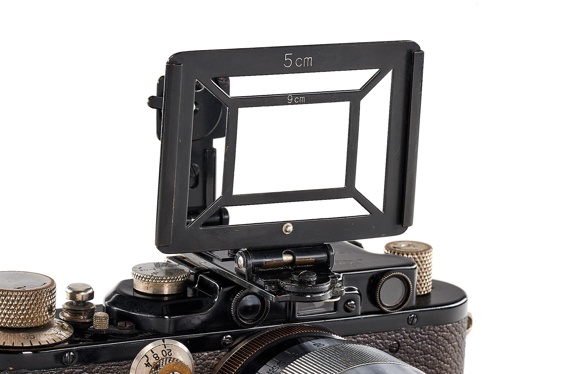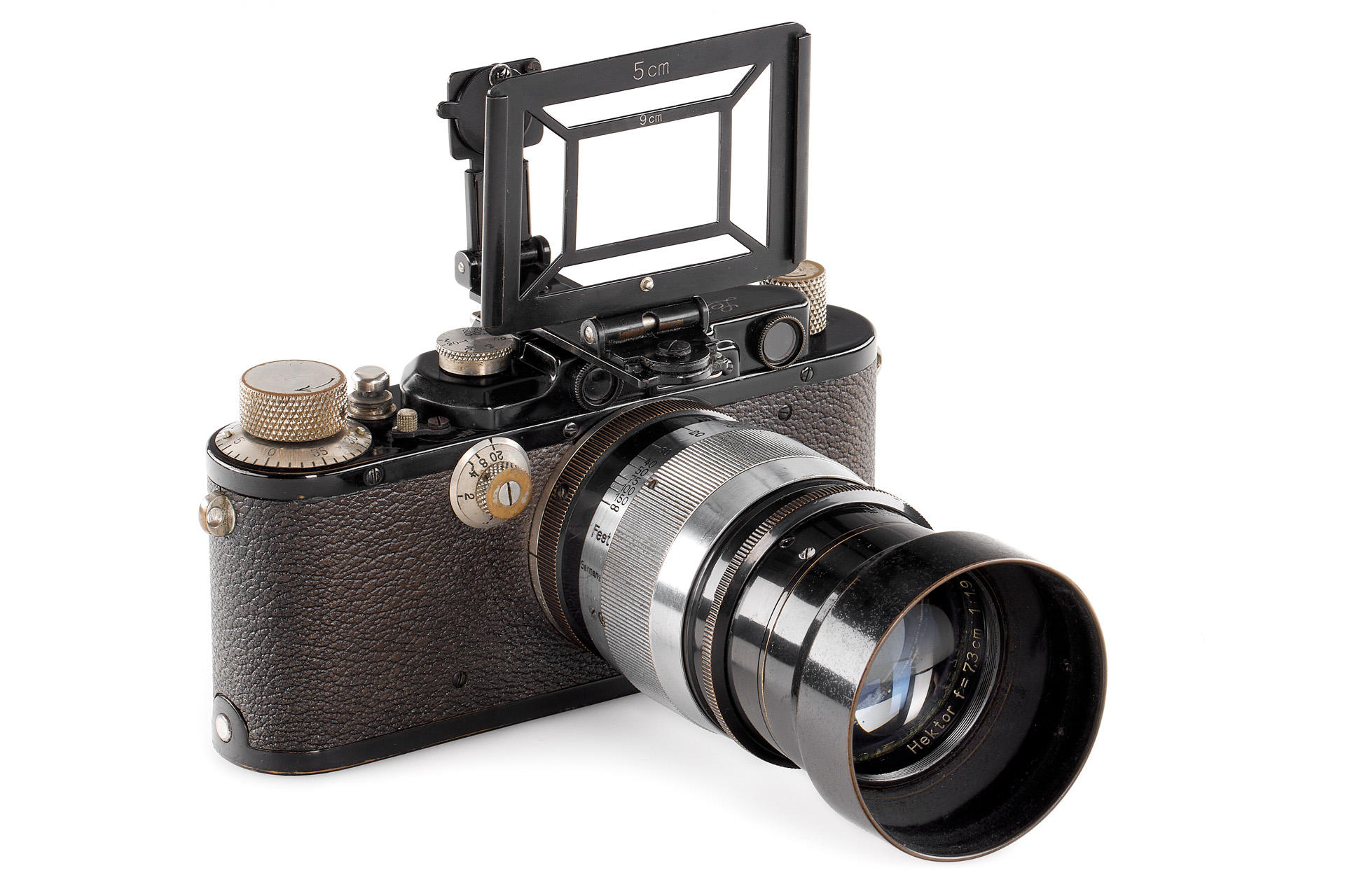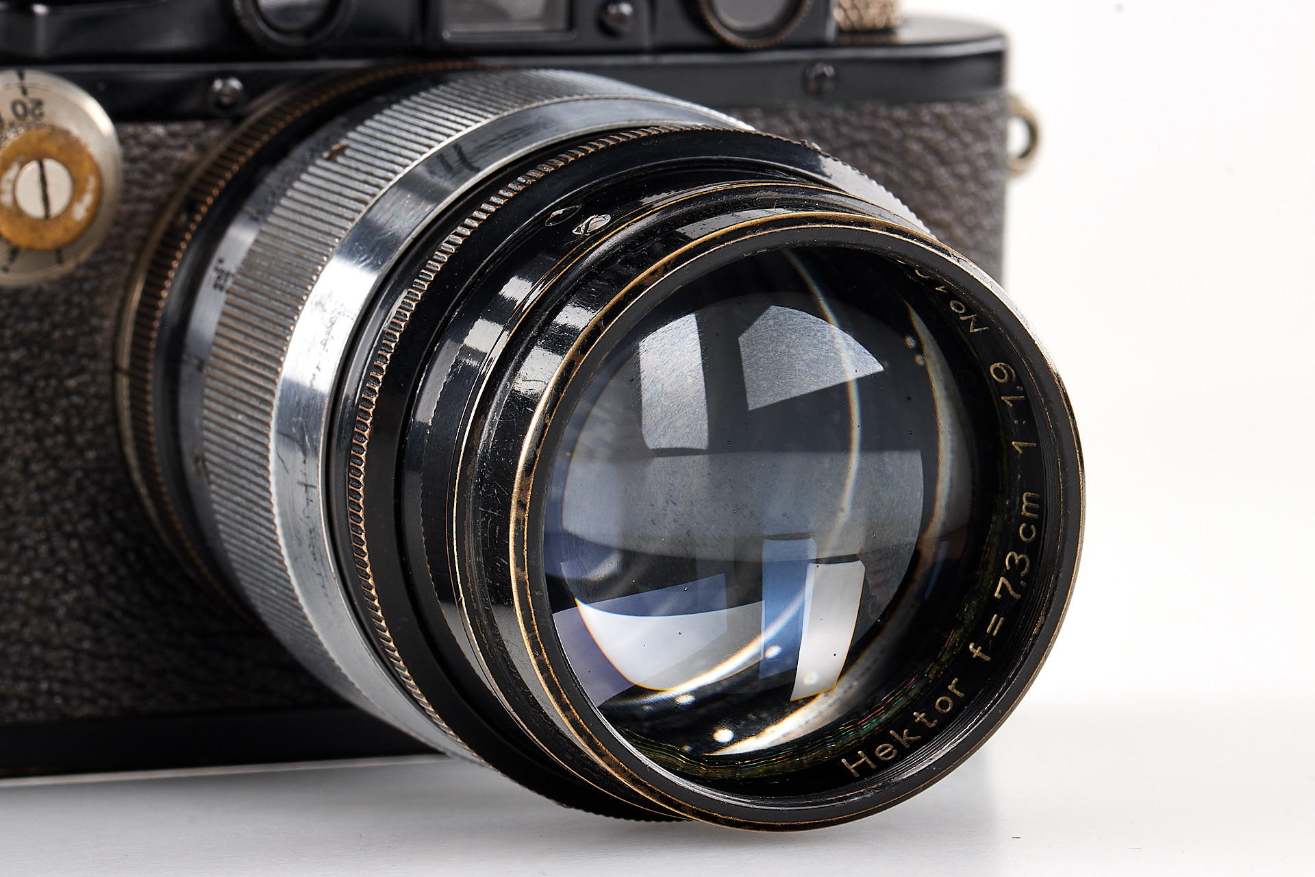 early black/nickel body, in very good condition, rangefinder with very good contrast, with matching Hektor 1.9/7.3cm no.166493 (1933) rangefinder coupled, export version, with optics later coated showing some flakes and cleaning marks, with hood, and early black painted universal frame finder RASUK