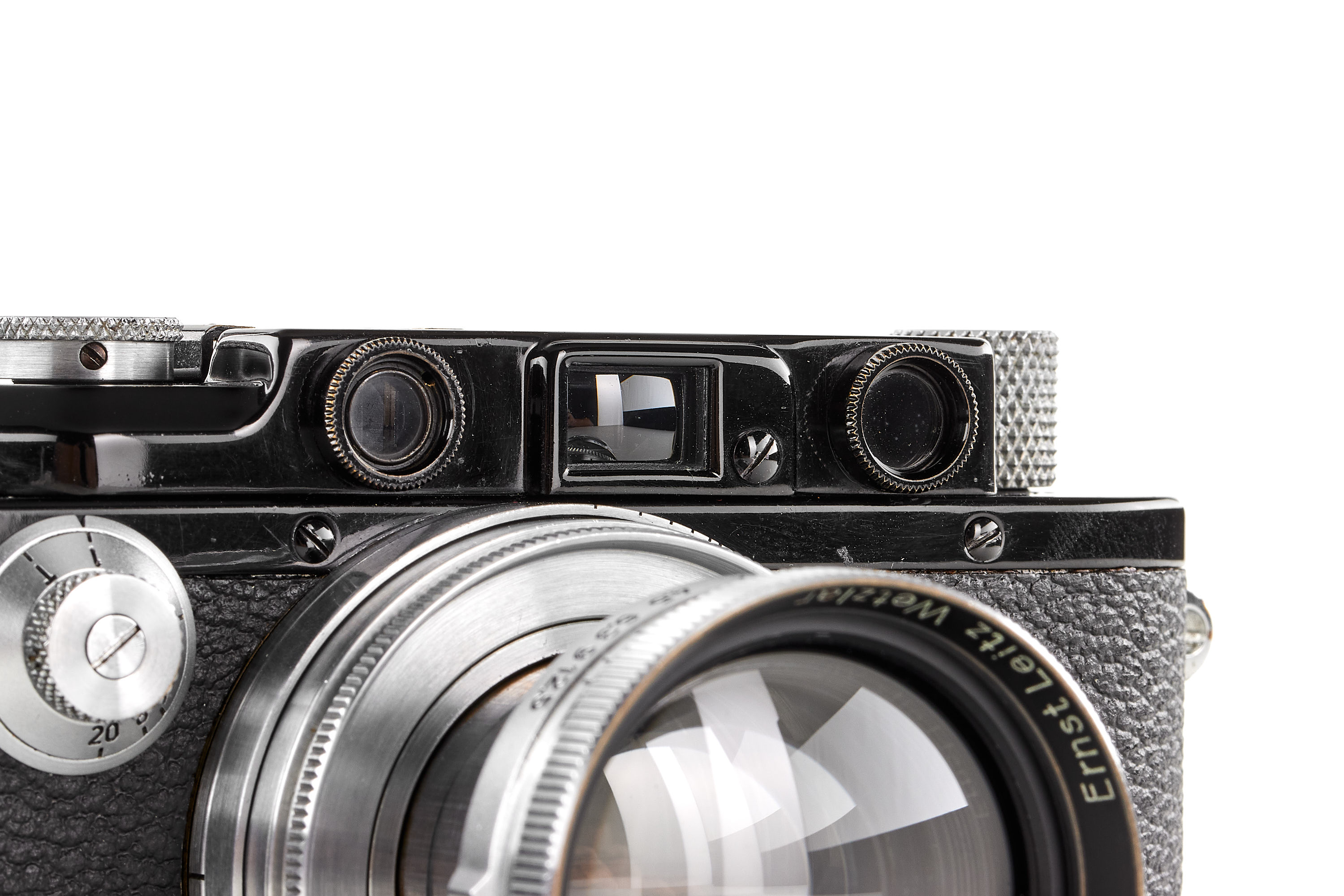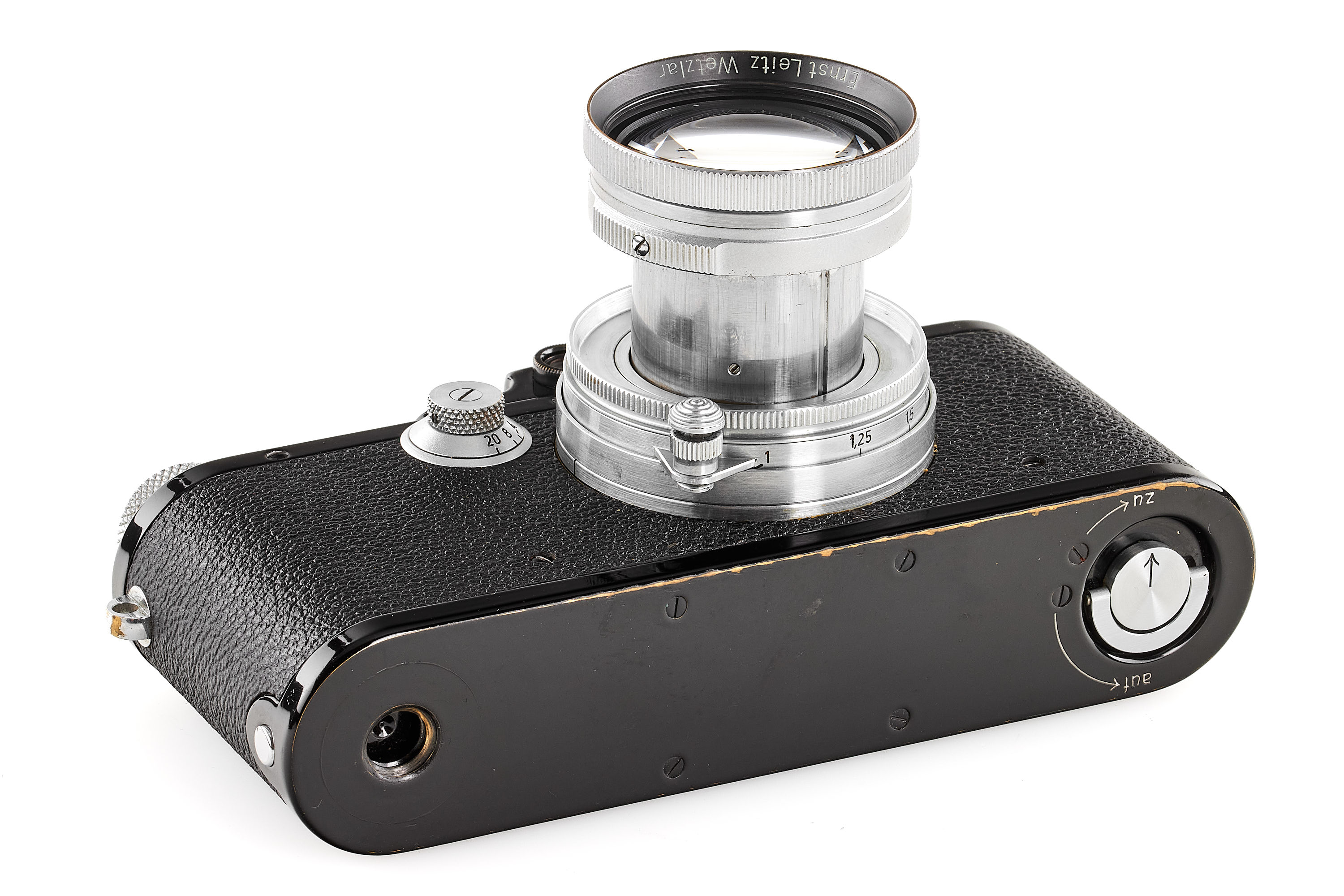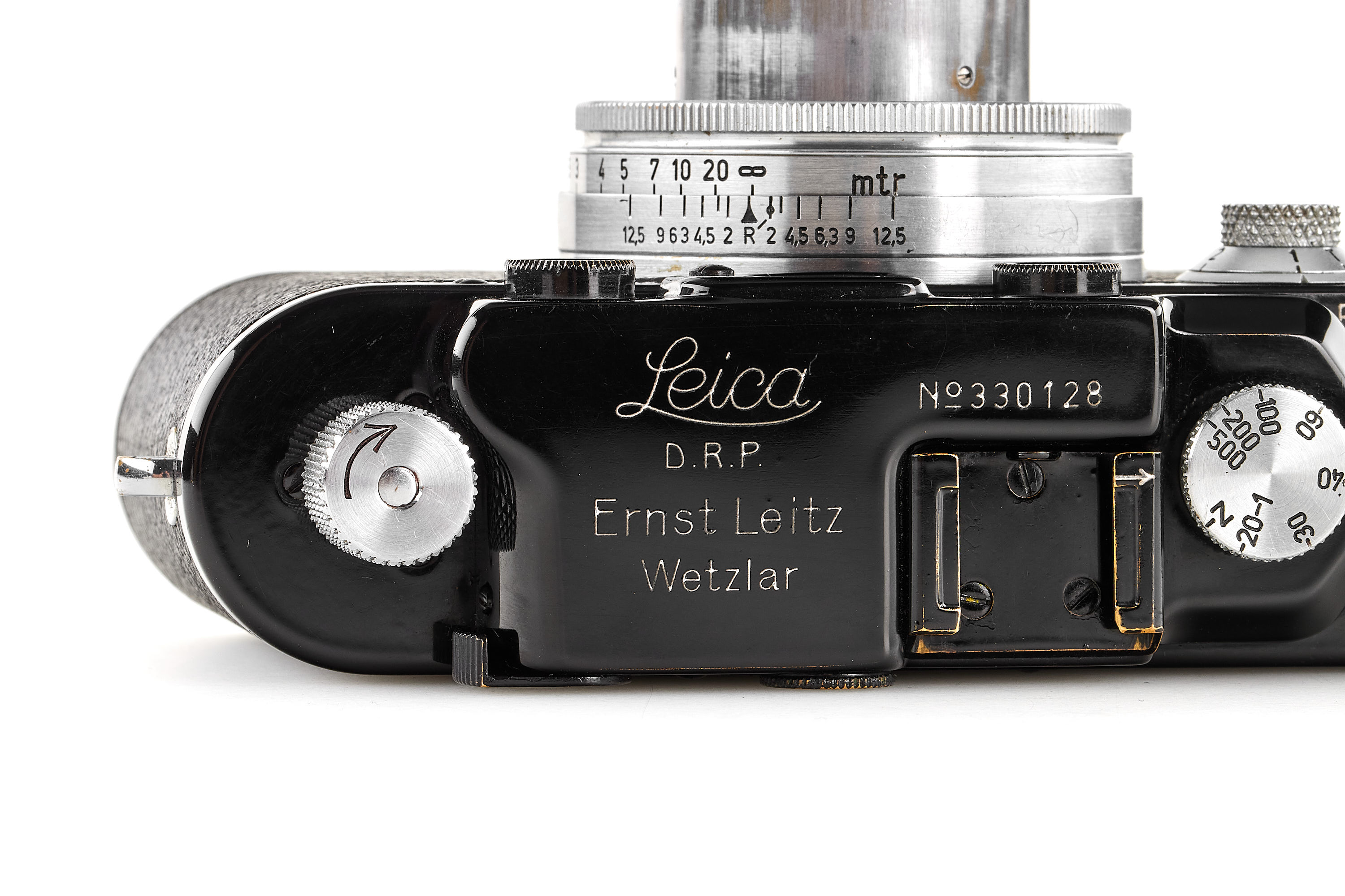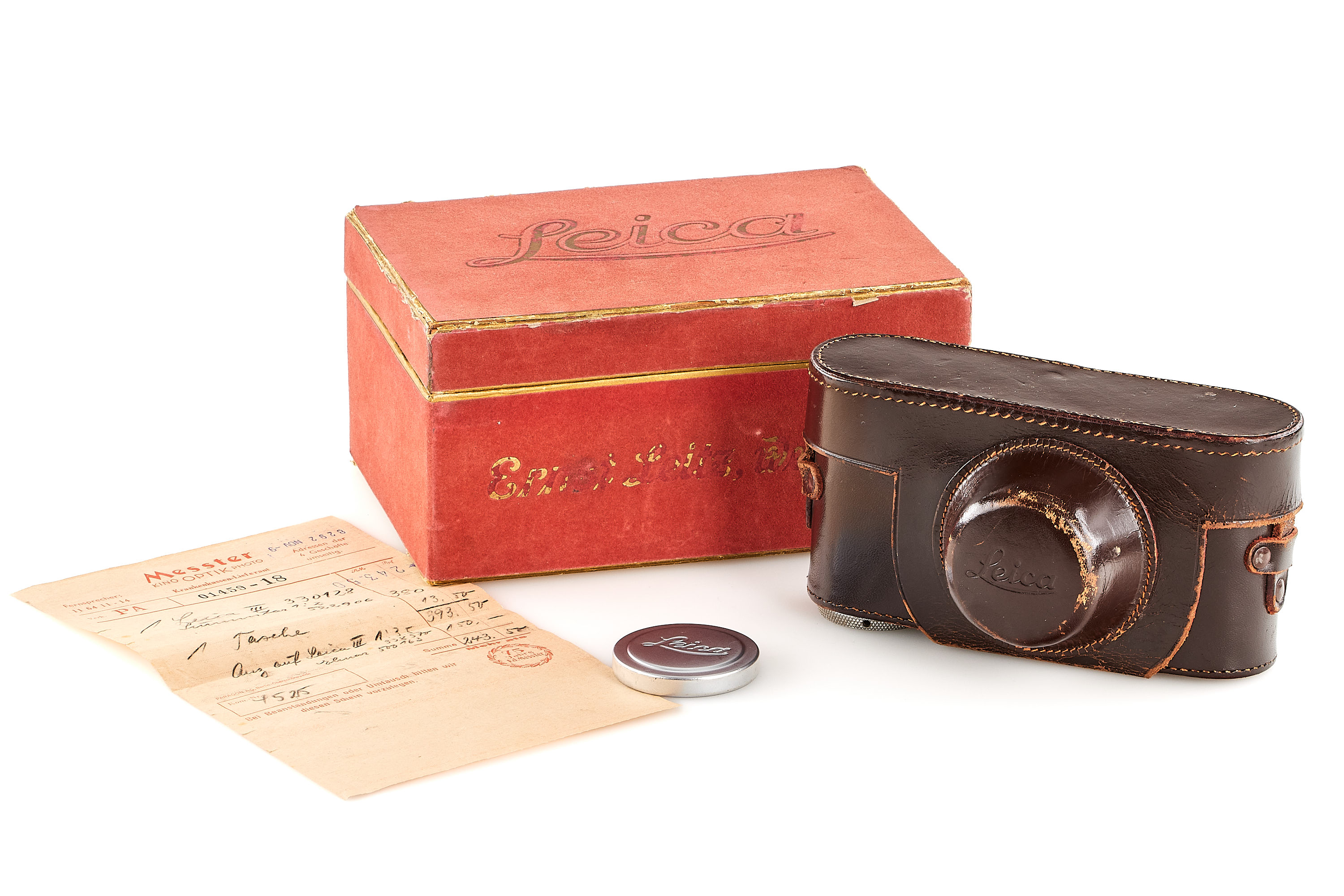 Beautiful black/chrome body in outstanding, mint condition and in working order, together with its matching uncoated Summitar 2/5cm no.522906, clean and clear optics (front lens cap), both delivered to Berlin on 03.11.1939, with eveready case, maker's box (cond. B) and the original receipt (showing the trade with a Leica III Mod. F chrome + Elmar).