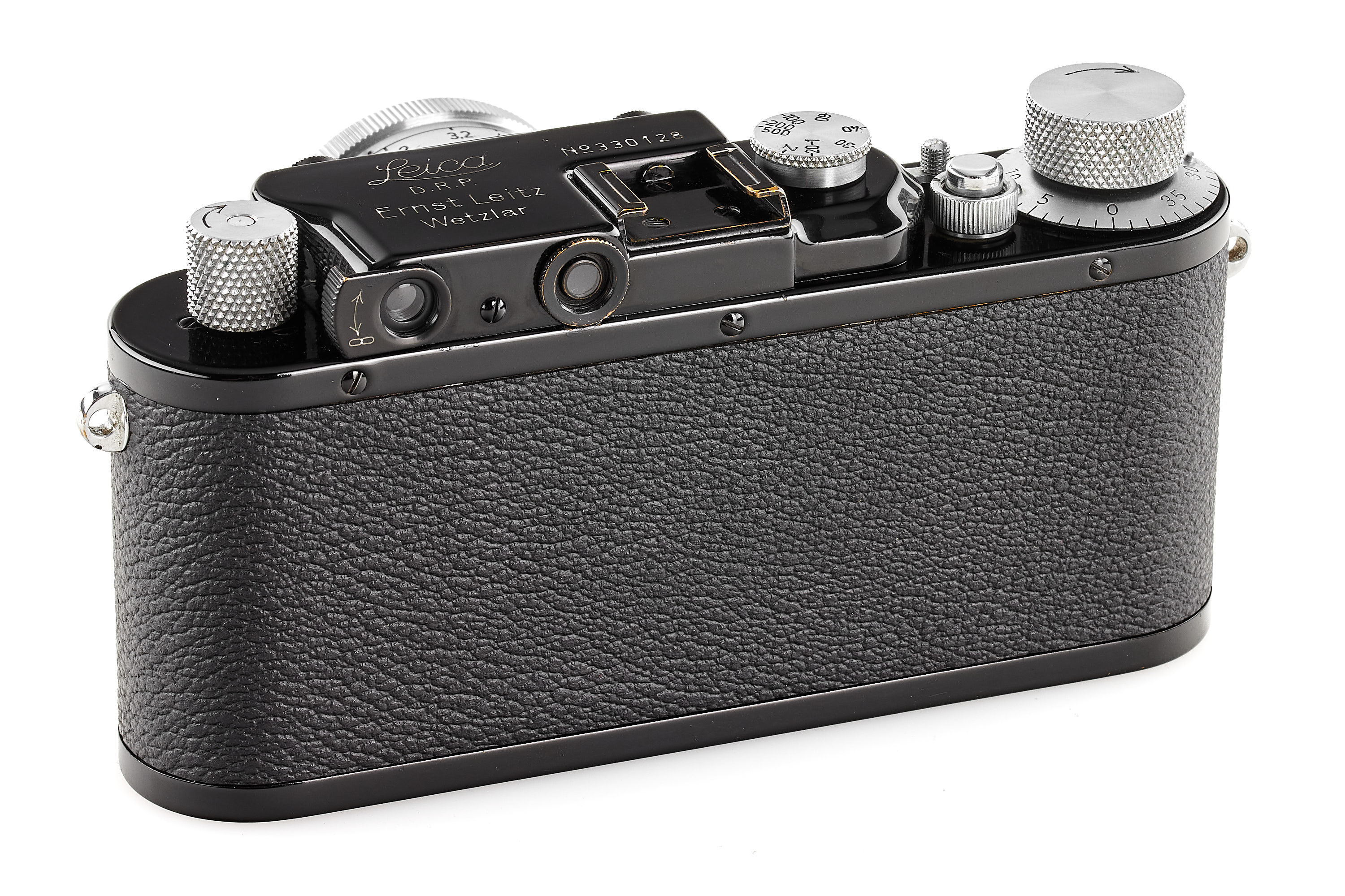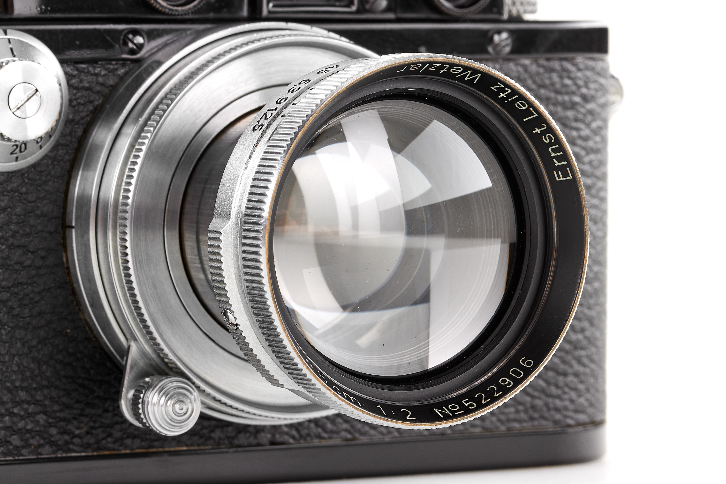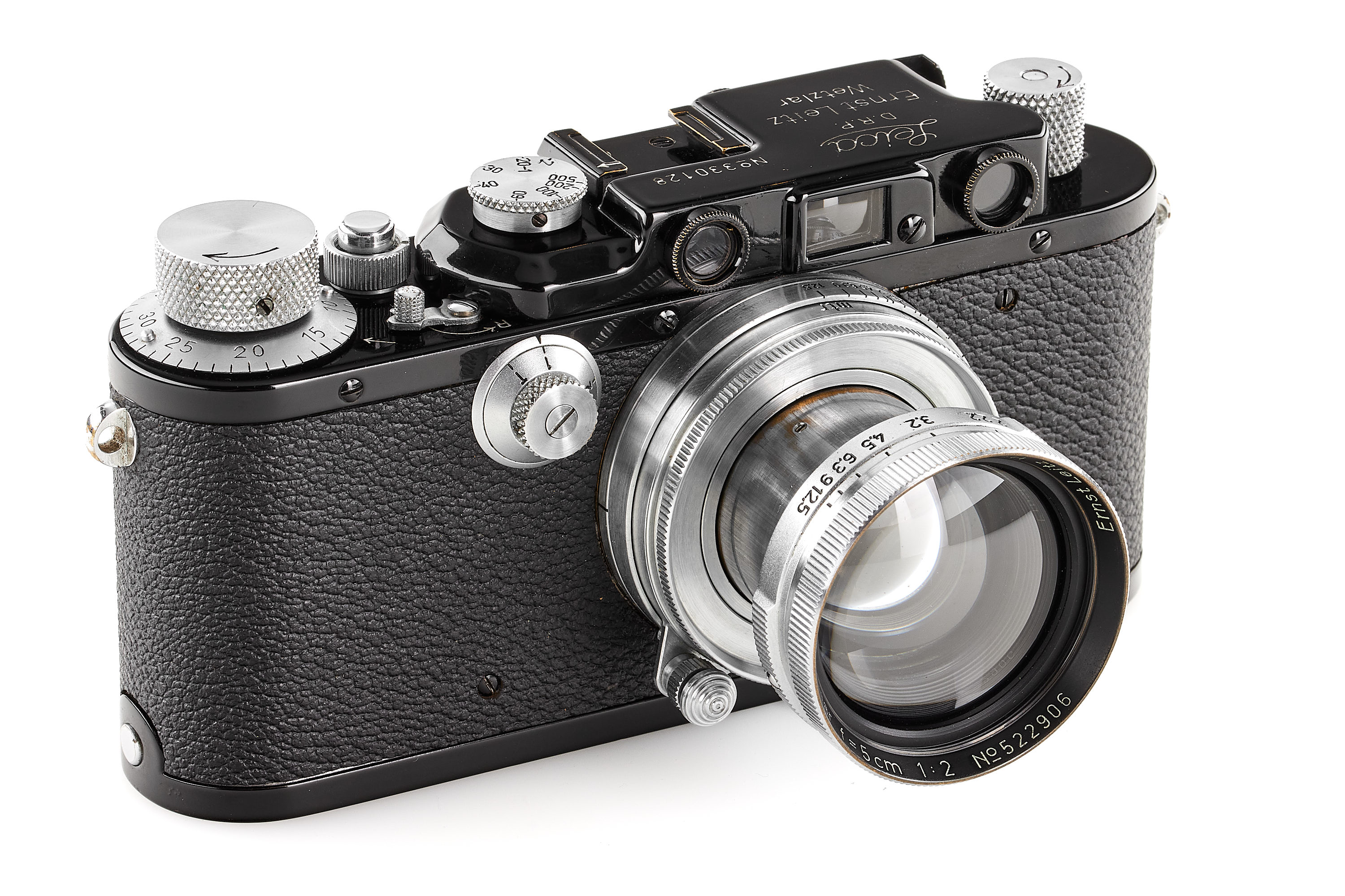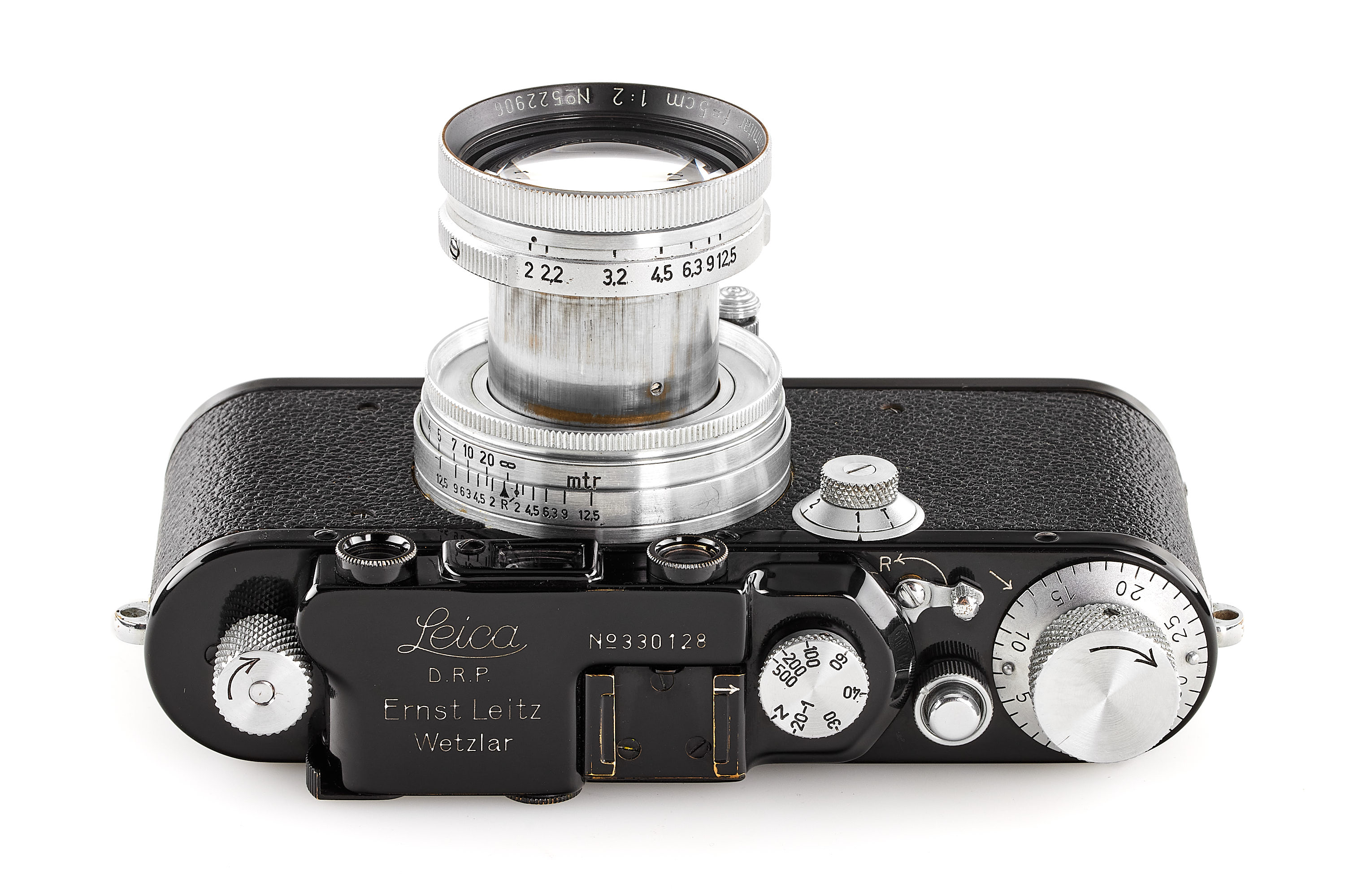 Beautiful black/chrome body in outstanding, mint condition and in working order, together with its matching uncoated Summitar 2/5cm no.522906, clean and clear optics (front lens cap), both delivered to Berlin on 03.11.1939, with eveready case, maker's box (cond. B) and the original receipt (showing the trade with a Leica III Mod. F chrome + Elmar).