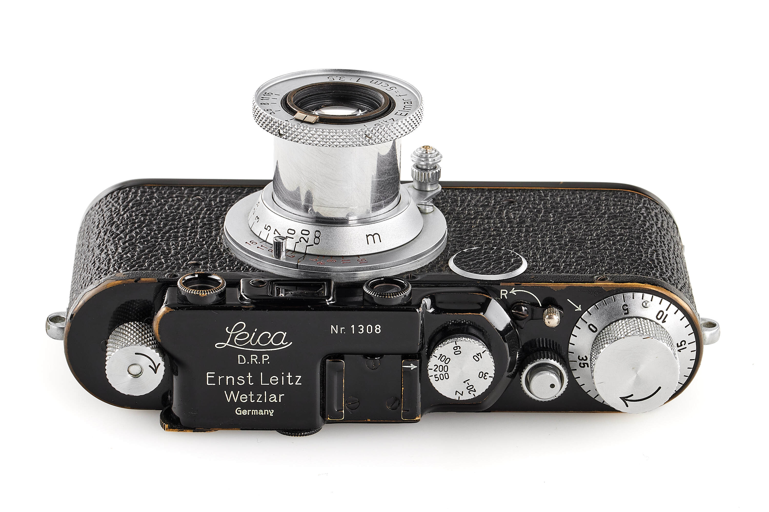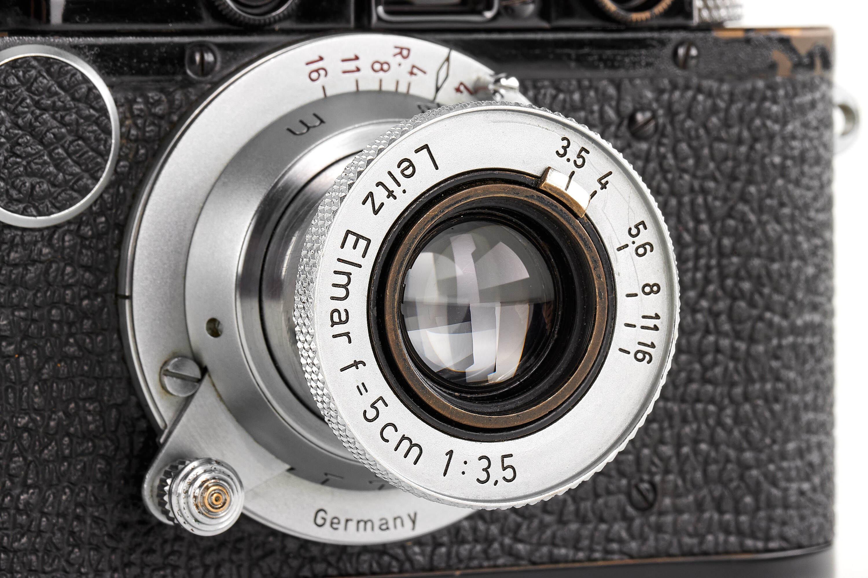 Very interesting black/chrome III mod. F without slow speed, originally an extremely early Leica I Mod. A Elmar delivered to retailer Besier, Wiesbaden (Germany), on 26.04.1926, serviced several times by Leica and finally upgraded in 1956 to its present form, together with unusual unnumbered Elmar chrome with red scale, in fact the original lens remounted in M39 standardized Elmar (front lens cap), note the very peculiar and original nickel aperture tab, in very good condition, showing a light patina, still uncoated optics with a few light cleaning marks, the owner wanted to keep his/her Leica as original as possible, even upgraded!