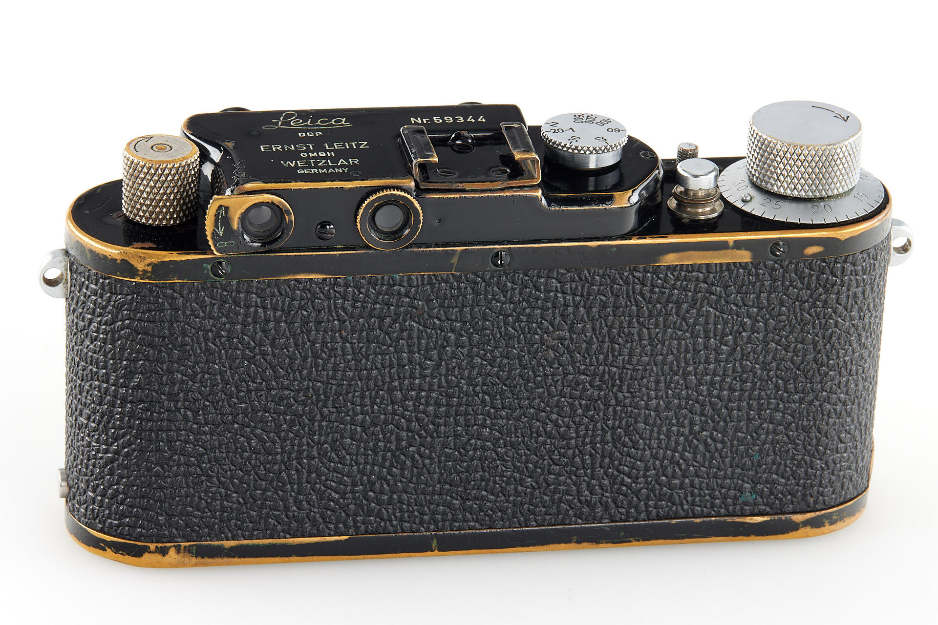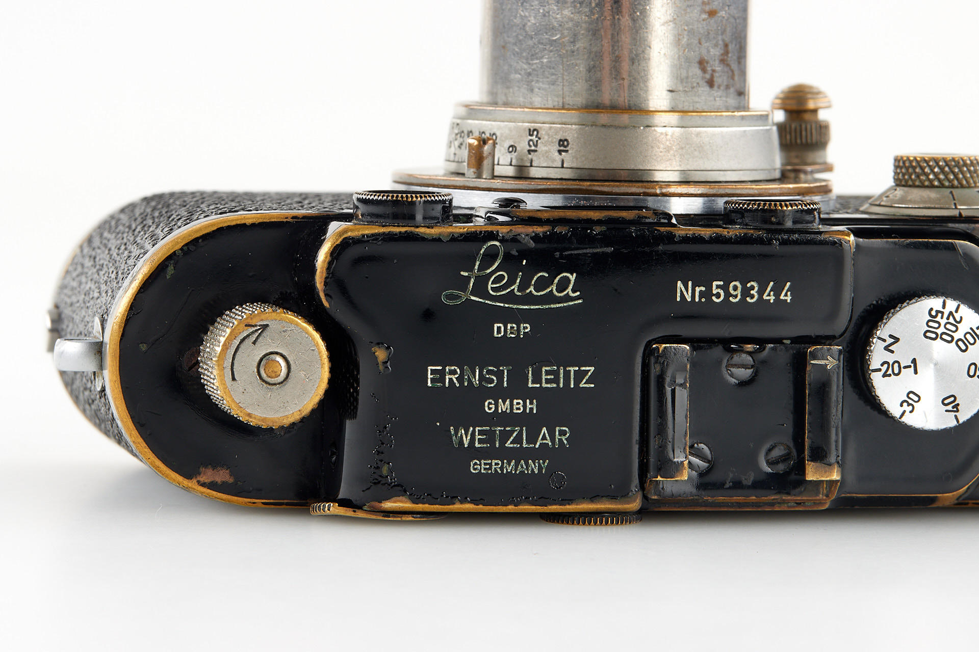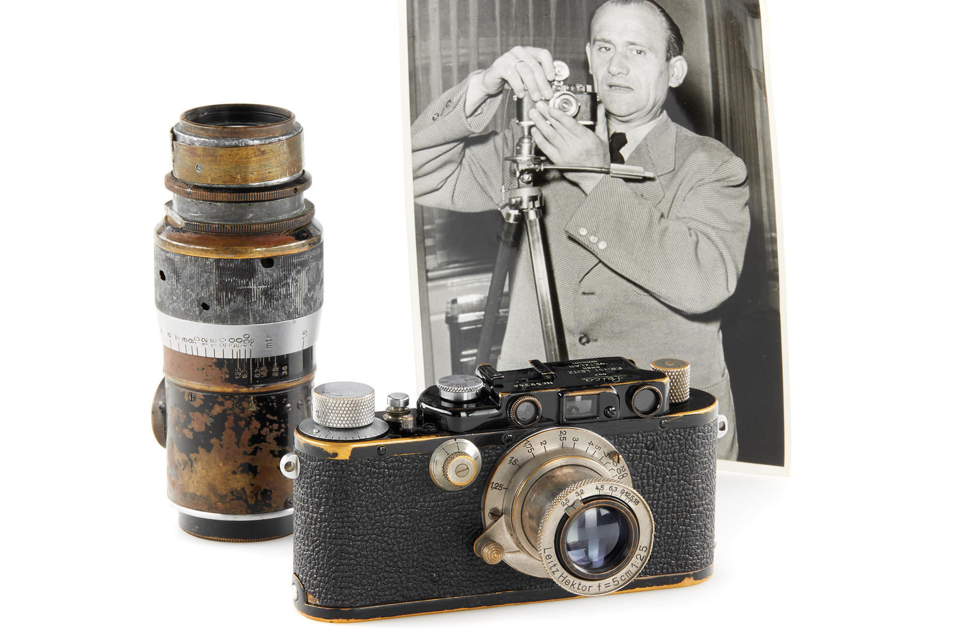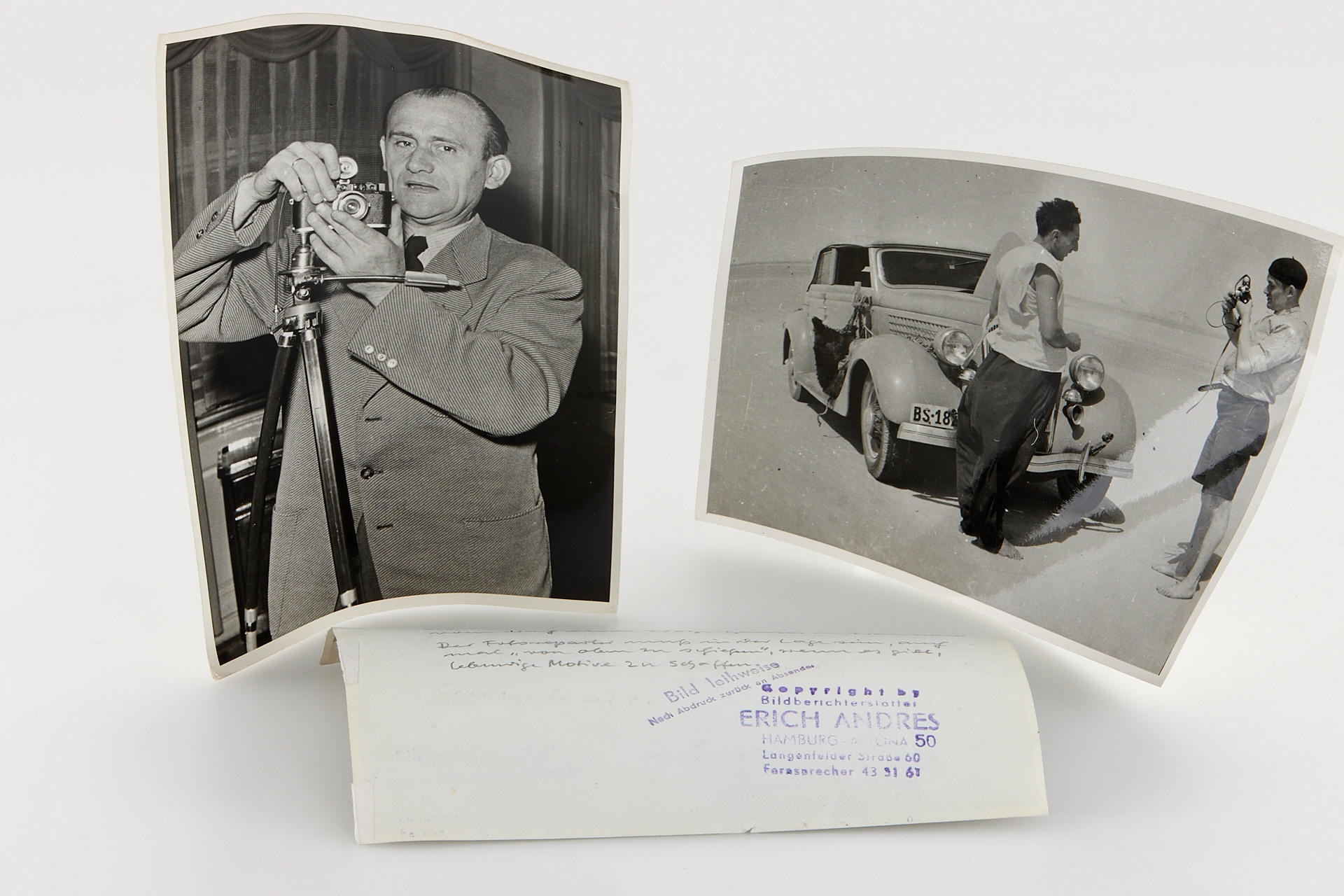Leica Model III, owned and used by the famous German photographer Erich Andres. The camera has been delivered to Berlin on 09.04.1931 and shows significant signs of years of professional use. The hard life of this Leica in the hands of a professional photographer can also be confirmed by numerous visits in Leitz workshop (where it has been converted to Model III on 15.03.1935). On careful inspection, the name and address of Mr. Andres can still be seen scrawled on the base plate. It comes with an unnumbered Hektor 2.5/5cm and Elmar 4.5/13.5cm no.176377. Included in this lot are also three vintage silver gelatine prints from the estate of the photographer, showing Andres using exactly this camera. Erich Andres (1905-1992) Erich Andres was a German photo reporter. At a young age he took photos with a self-made camera and used the images for diary-like recordings. In 1923 he moved to Hamburg and, in addition to his work in a printing company, worked as a photo reporter. He was denied classical training as a photographer because, according to experts, he lacked the necessary talent. In the end, however, the quality of his pictures prevailed, and many photo reports made his name known. Andres was also one of the first Hamburg photographers to use the newly developed Leica with 35mm roll film in 1931!