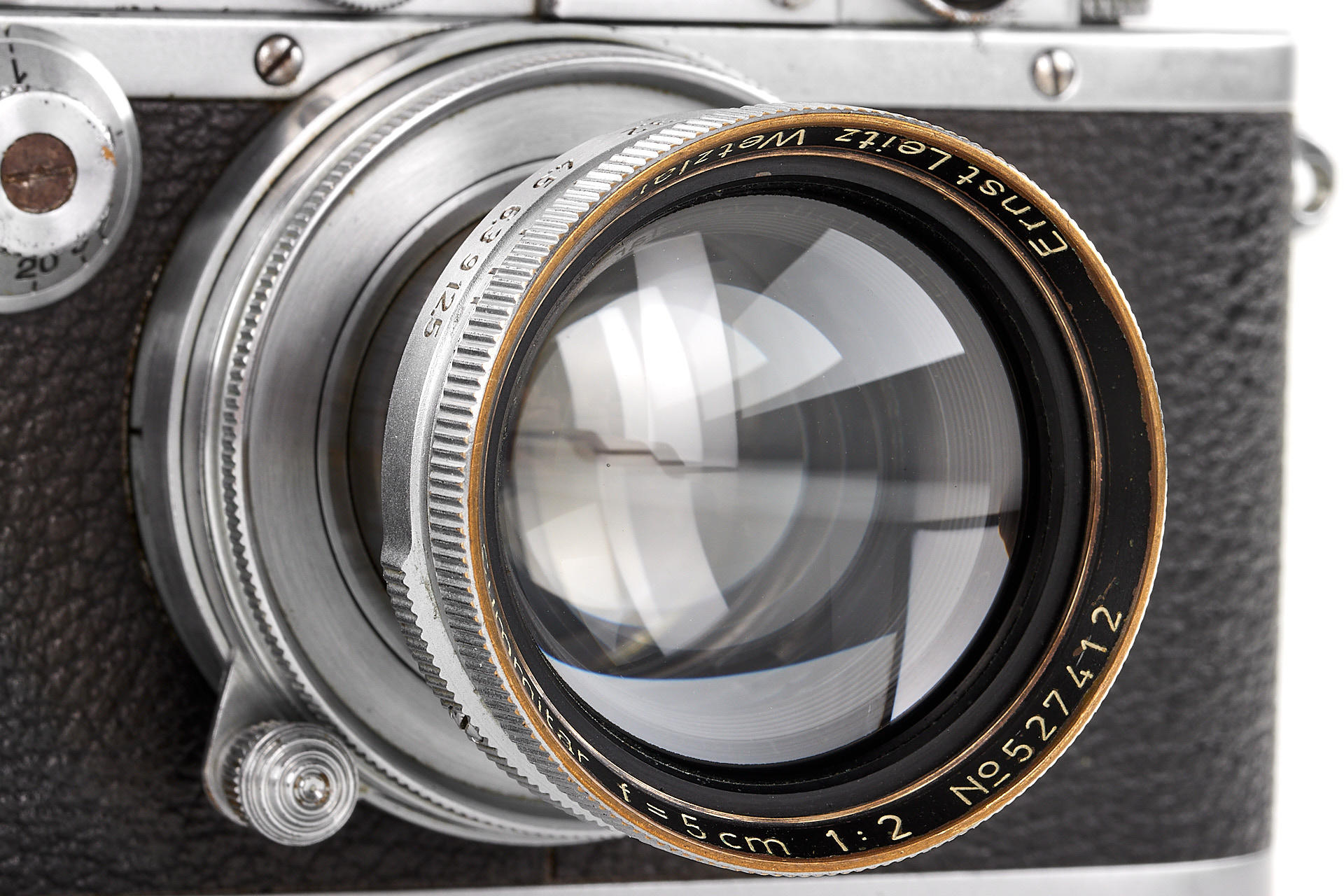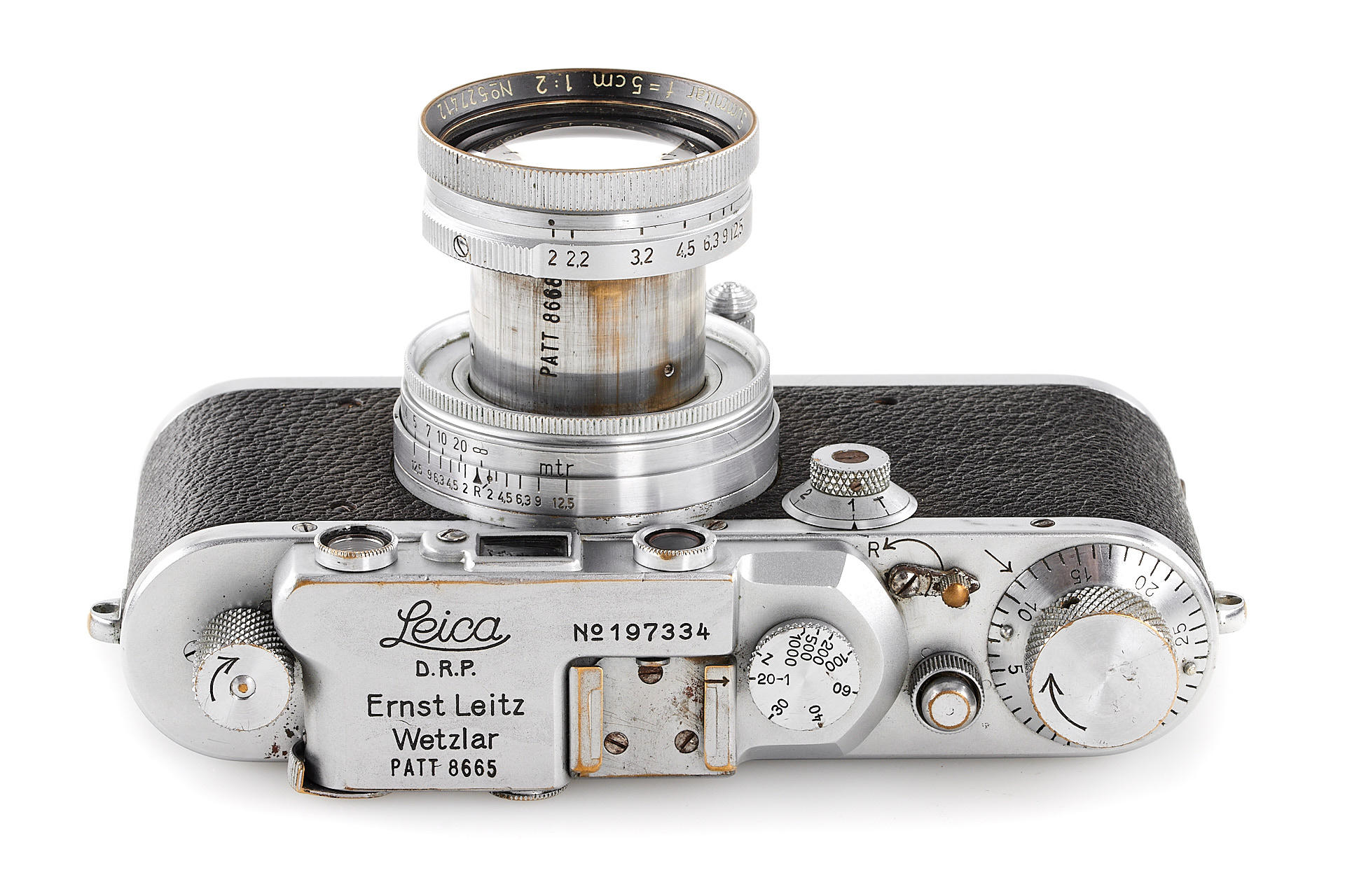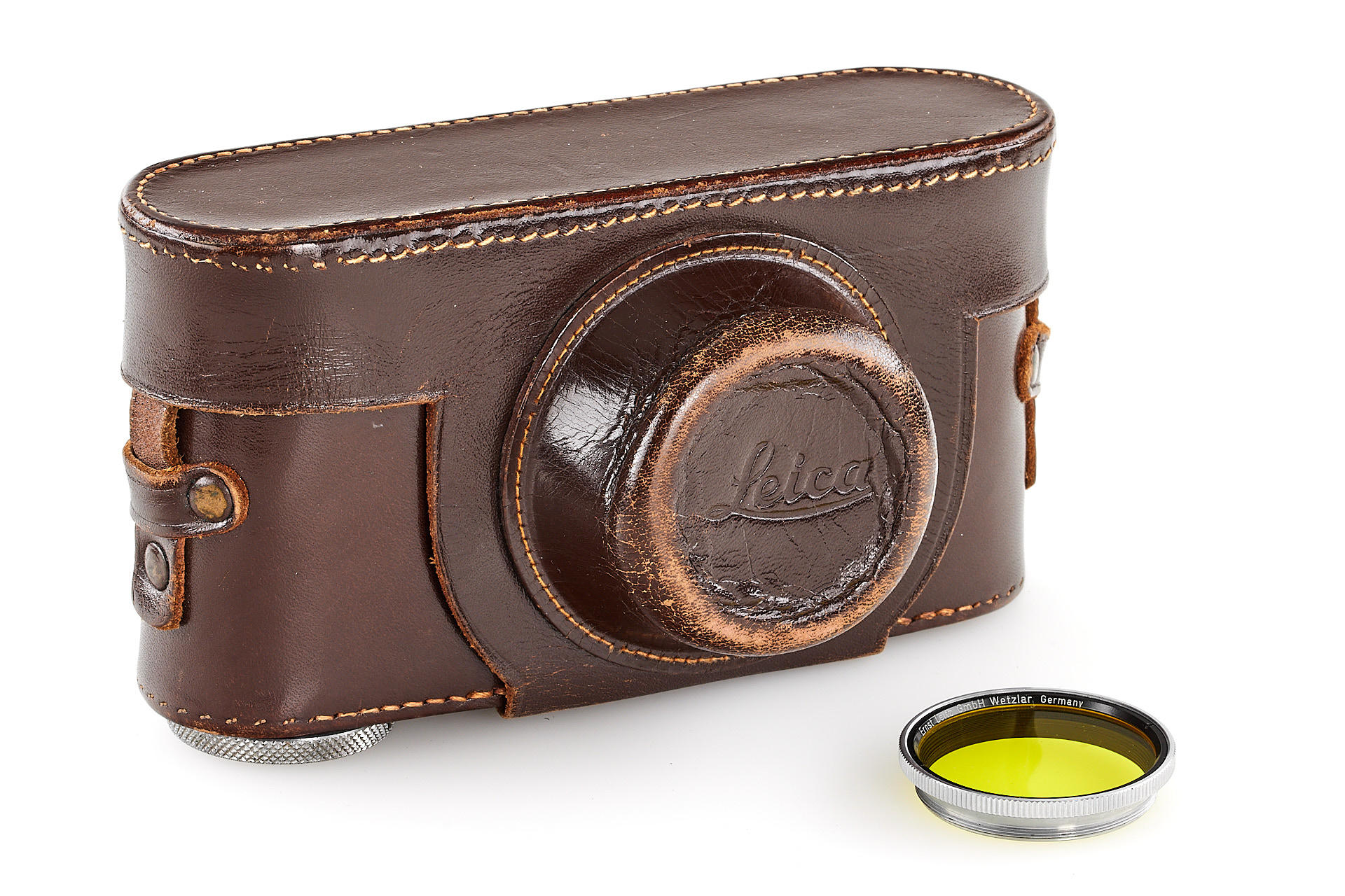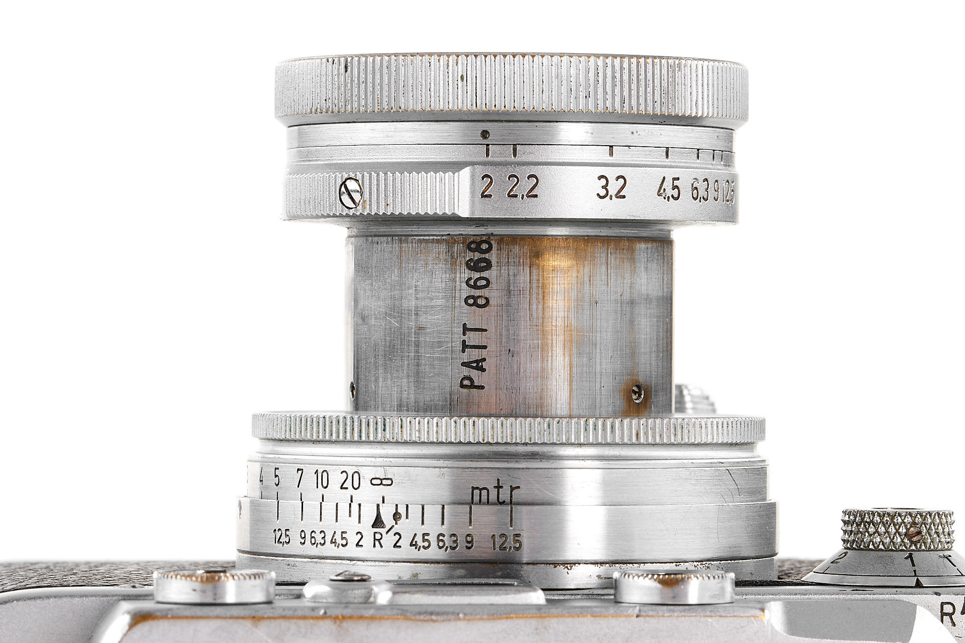 very rare Leica IIIa engraved with 'PATT 8665' on the top plate (unusually placed on the left side), used by the British Royal Navy during WWII, in good condition, with matching Summitar 2/5cm no.527412 with same engravings, with yellow filter and ever-ready case