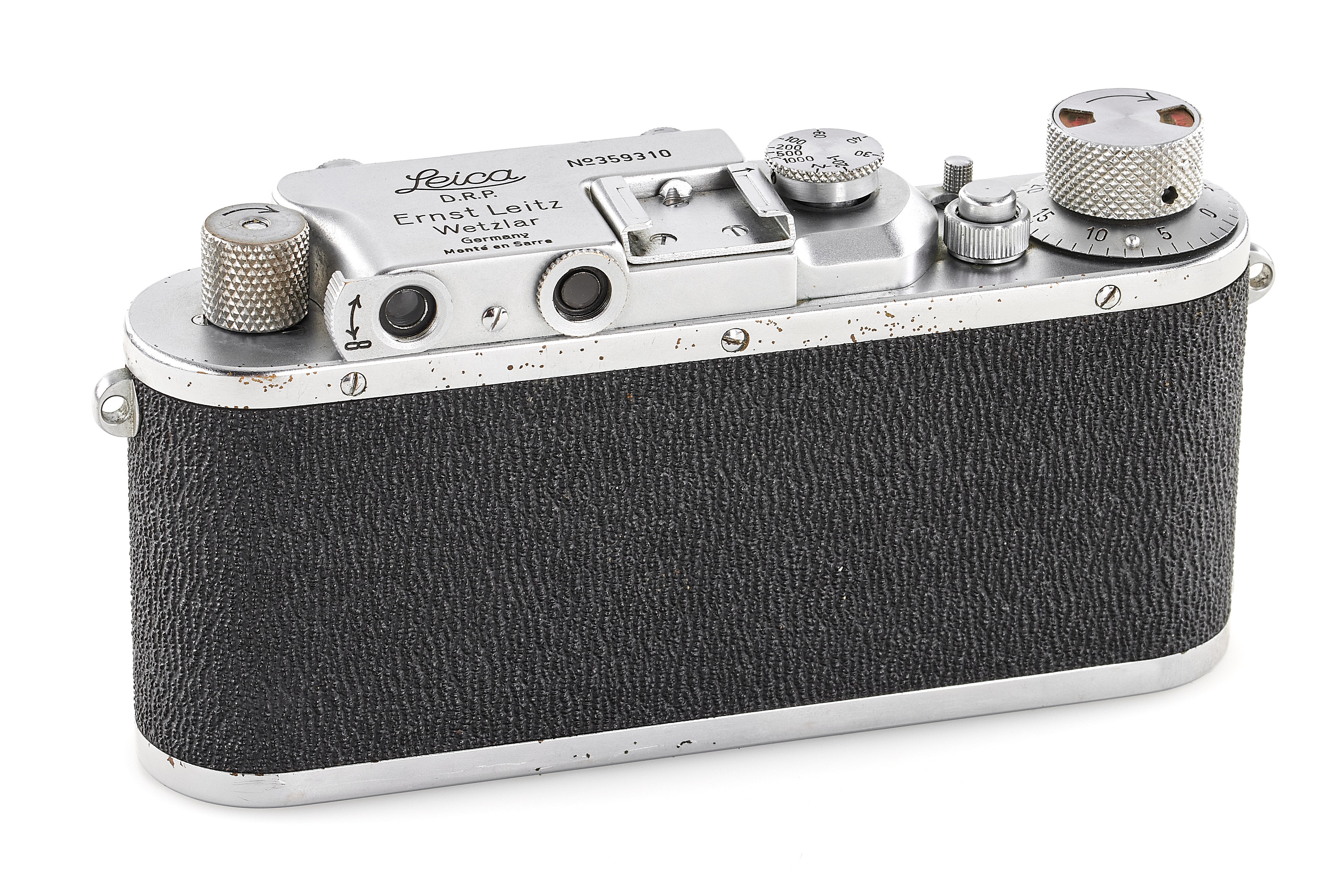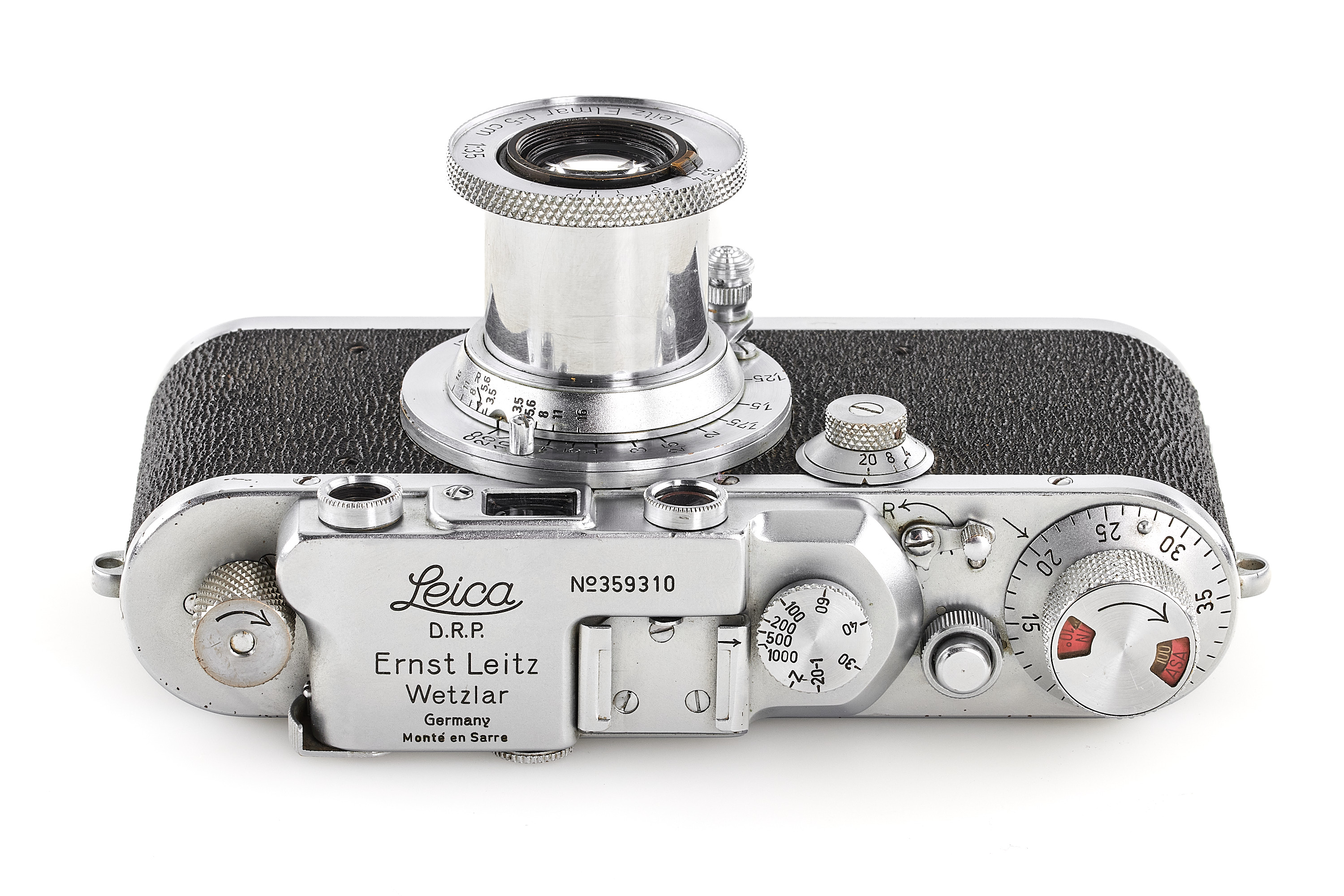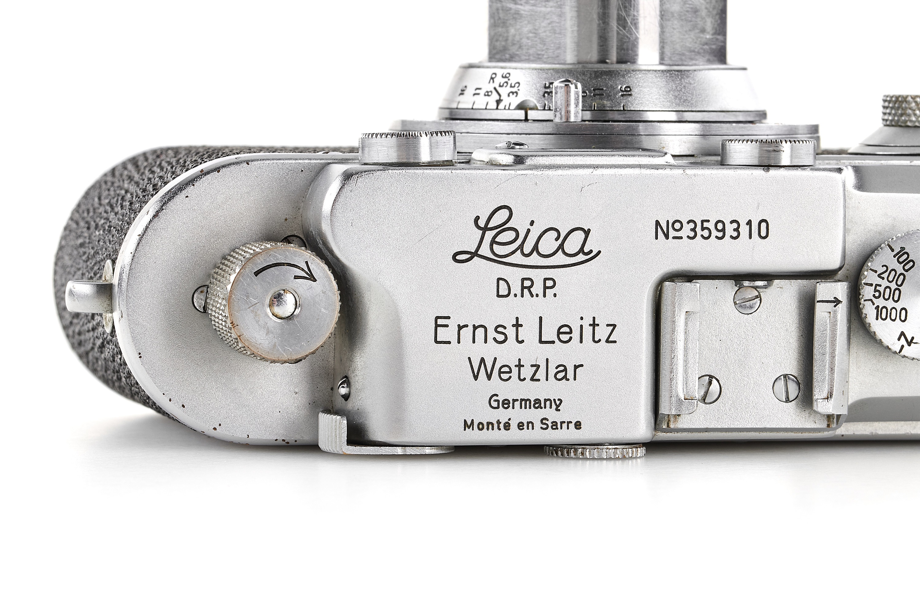 Very rare IIIa assembled in the French occupied zone of Germany (Saarland) to avoid too high customs charges at the time, engraved on the top plate with 'Monté en Sarre' (mounted in the Sarre), in original and very good condition, in working order, sharkskin covering, with Elmar 3.5/5cm no.647625 showing some cleaning marks (front cap) and eveready case, only about 400 of these cameras have been made.