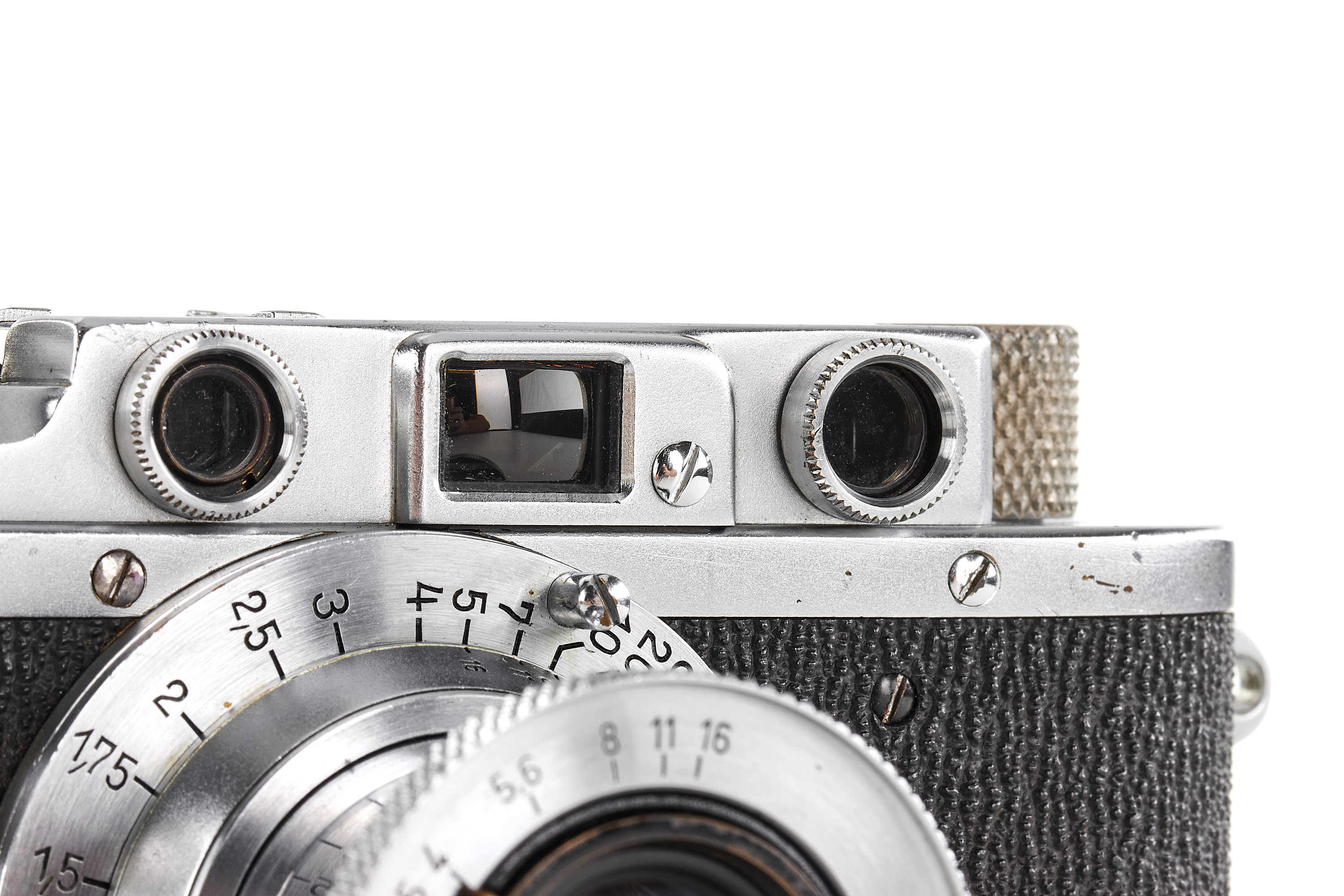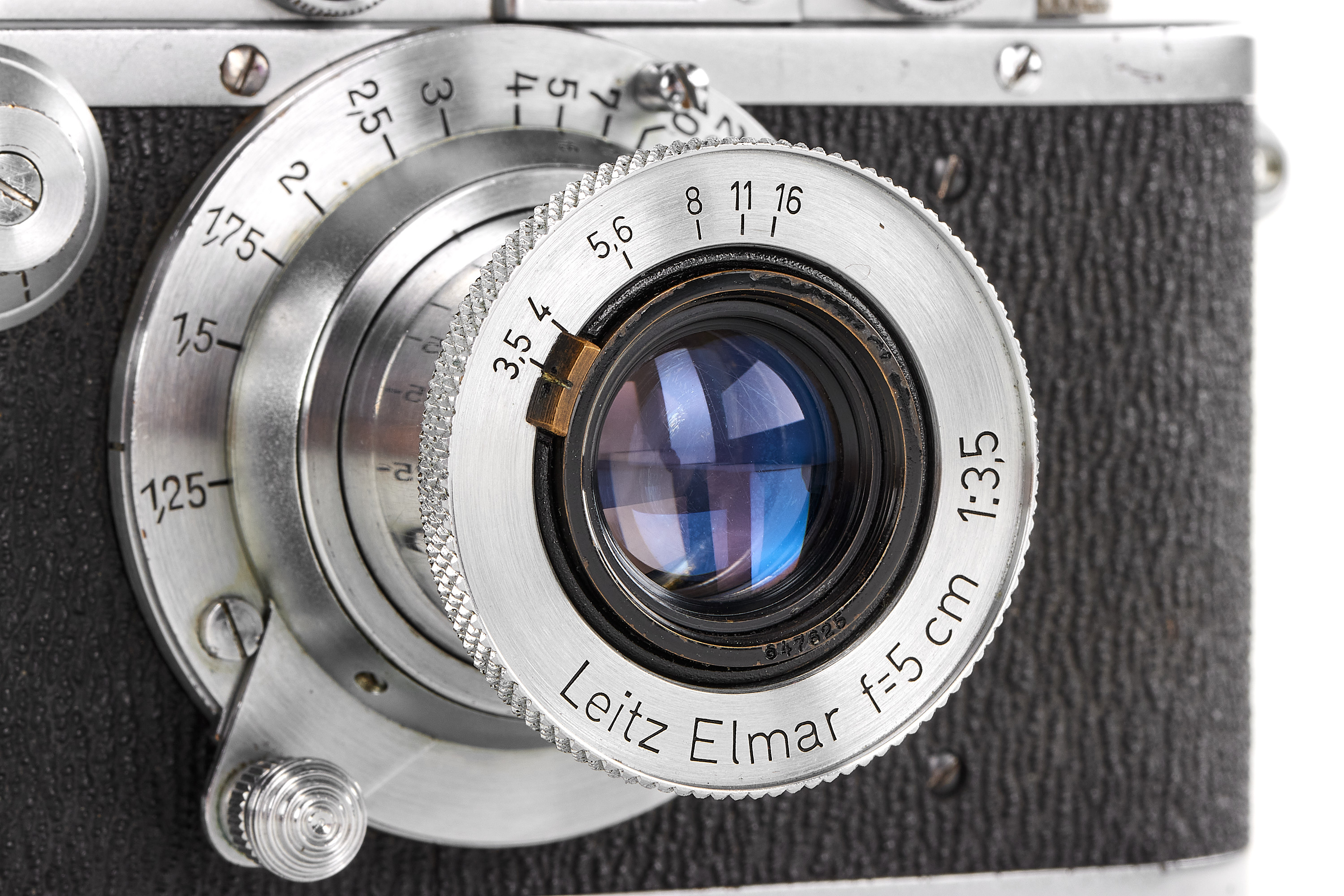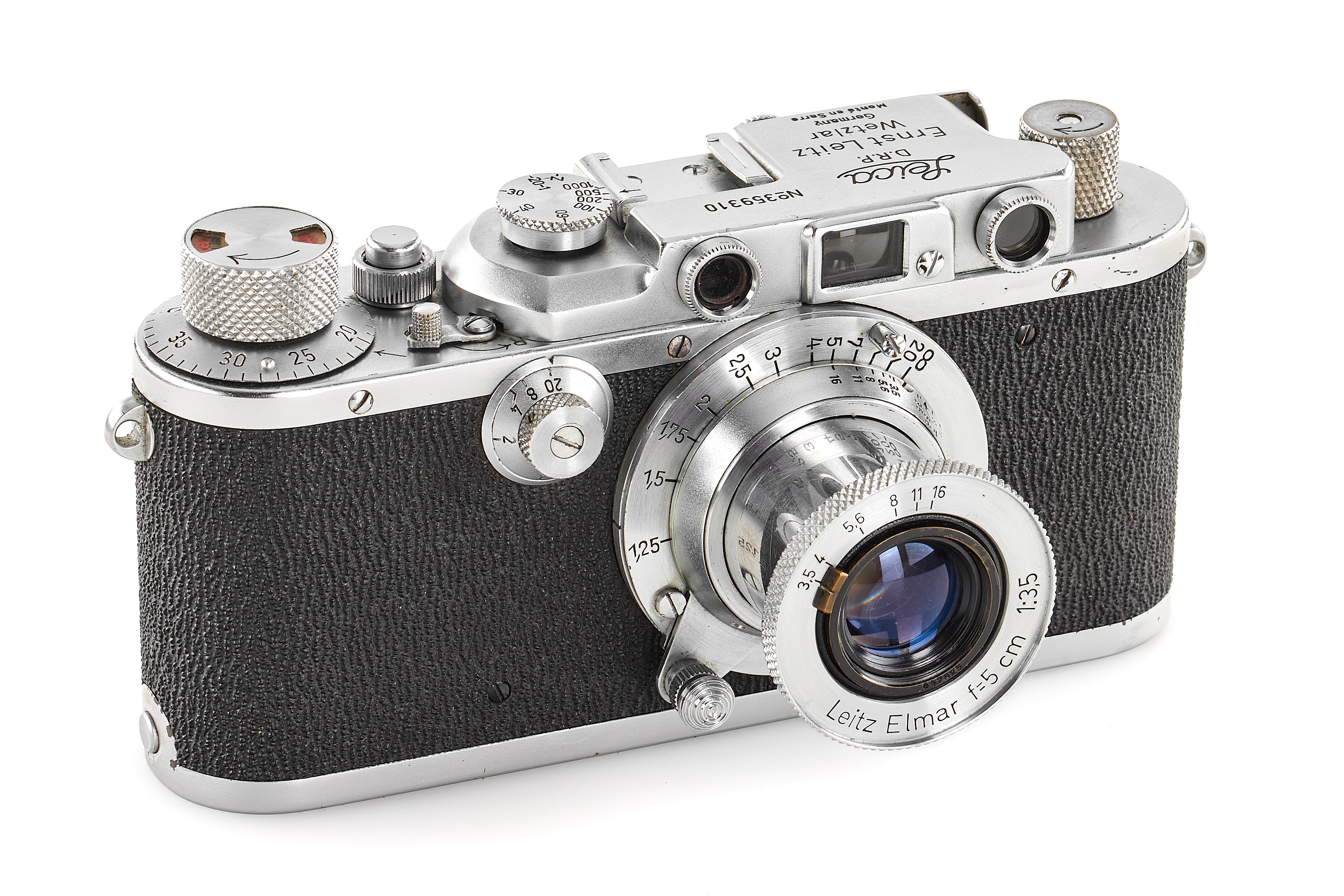 Very rare IIIa assembled in the French occupied zone of Germany (Saarland) to avoid too high customs charges at the time, engraved on the top plate with 'Monté en Sarre' (mounted in the Sarre), in original and very good condition, in working order, sharkskin covering, with Elmar 3.5/5cm no.647625 showing some cleaning marks (front cap) and eveready case, only about 400 of these cameras have been made.