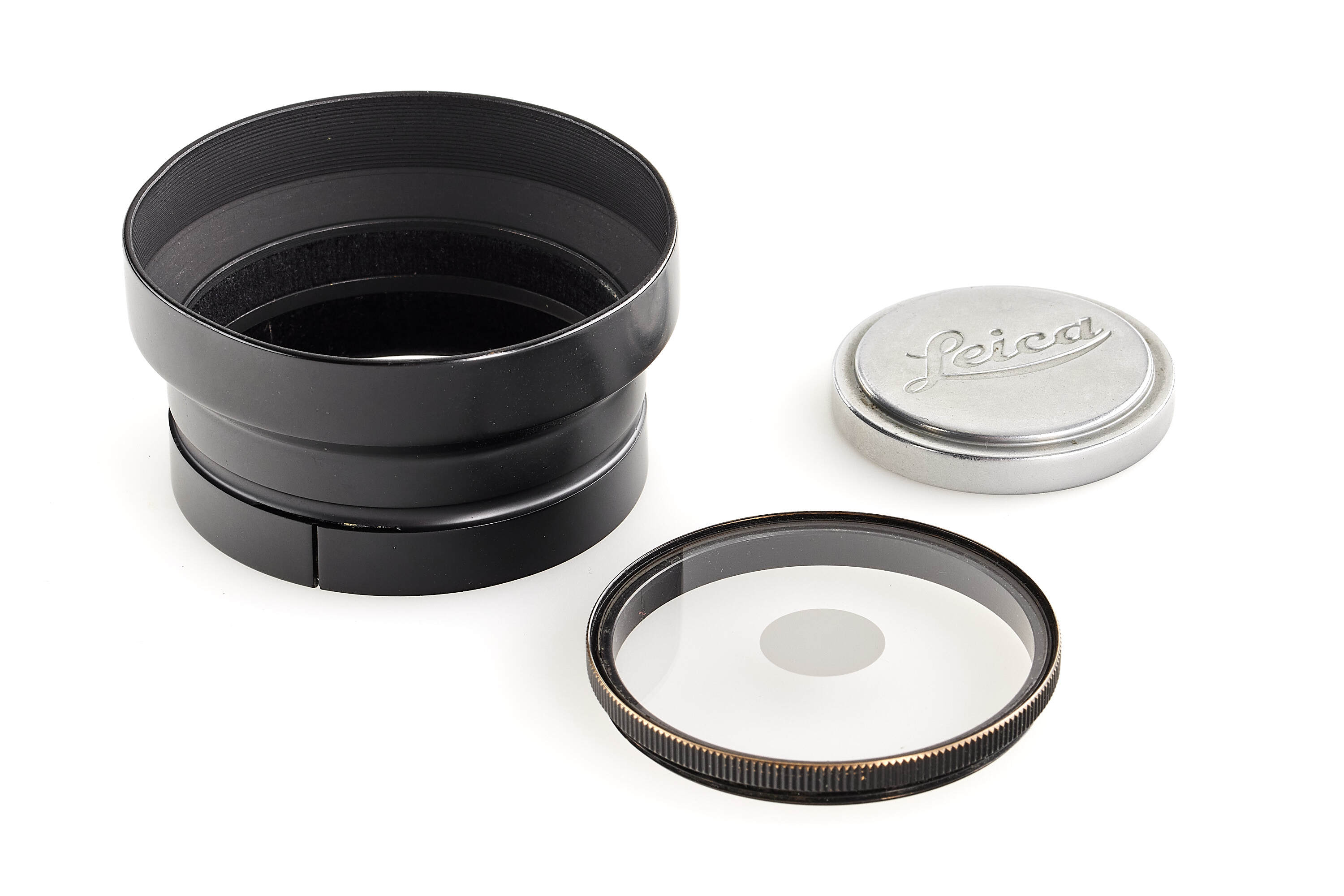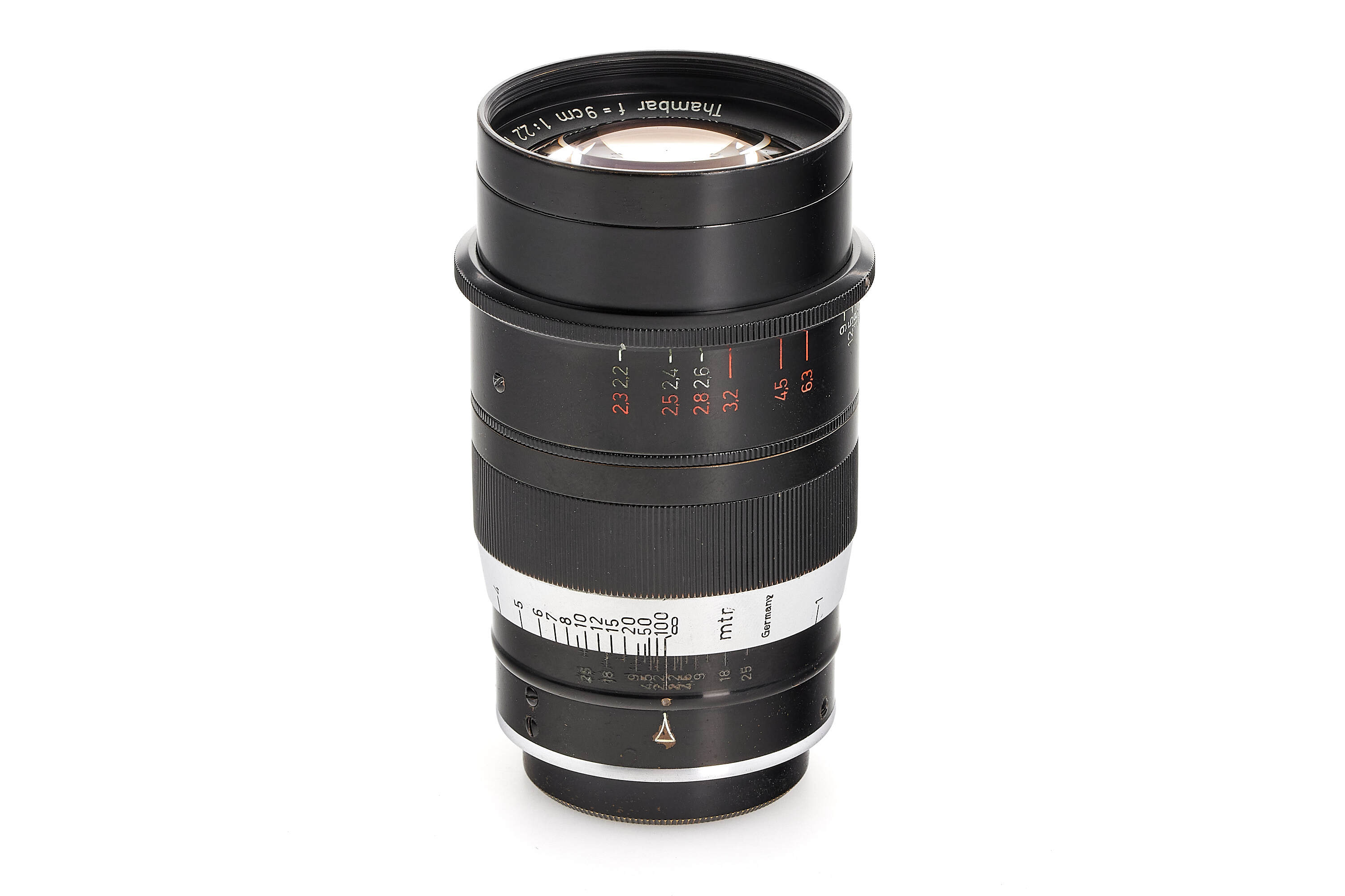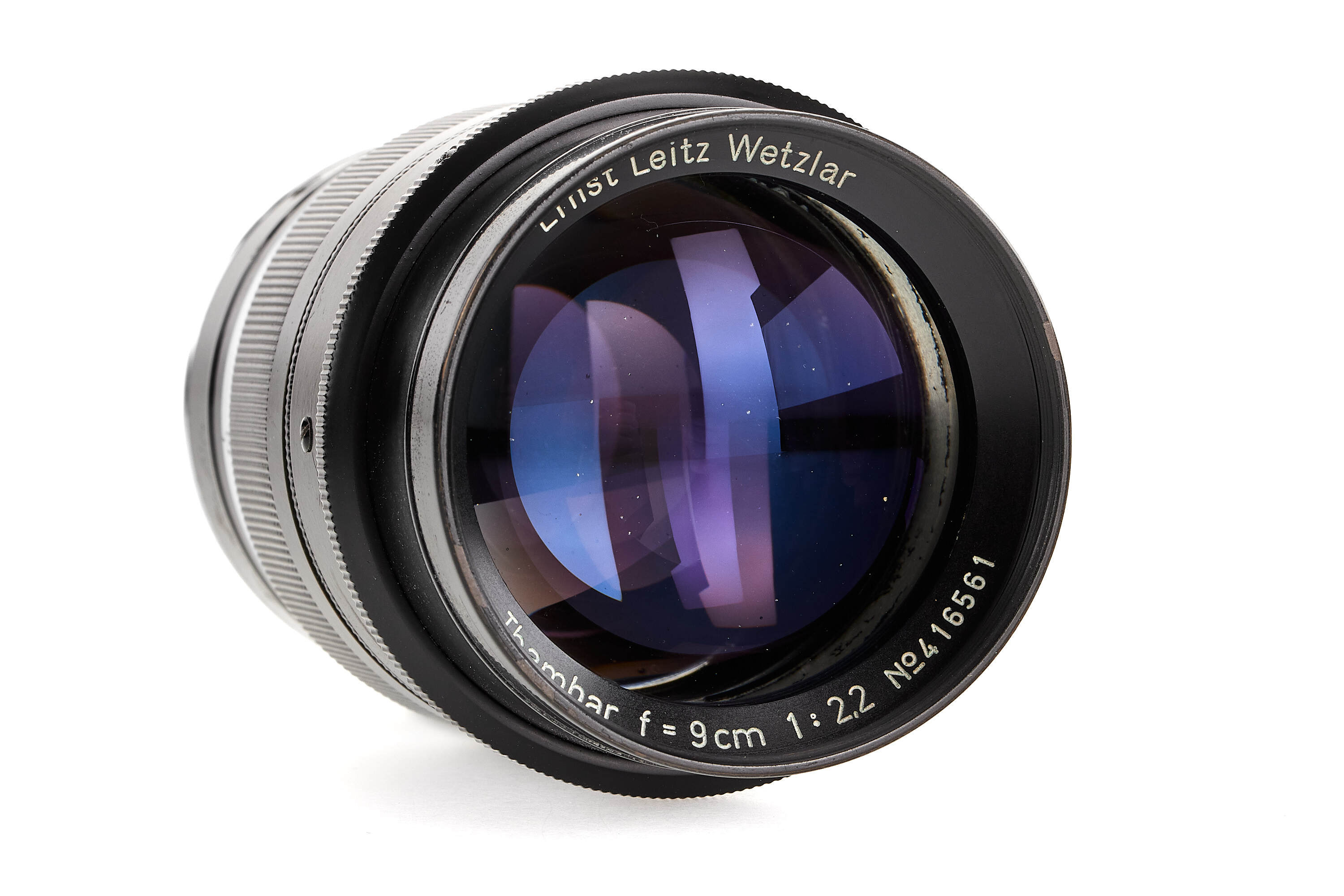 Nice outfit including a Leica IIIa chrome no.205829 in very good condition, with SCNOO rapid winder with 'open-close' engraving, matching Summar chrome 2/5cm no.319240, optics showing haze and marks, with front lens cap, Thambar 2.2/9cm no.416561, optics later coated only showing a few light cleaning marks, with spot filter, hood, rear cap and chrome SAIOO 9cm finder.