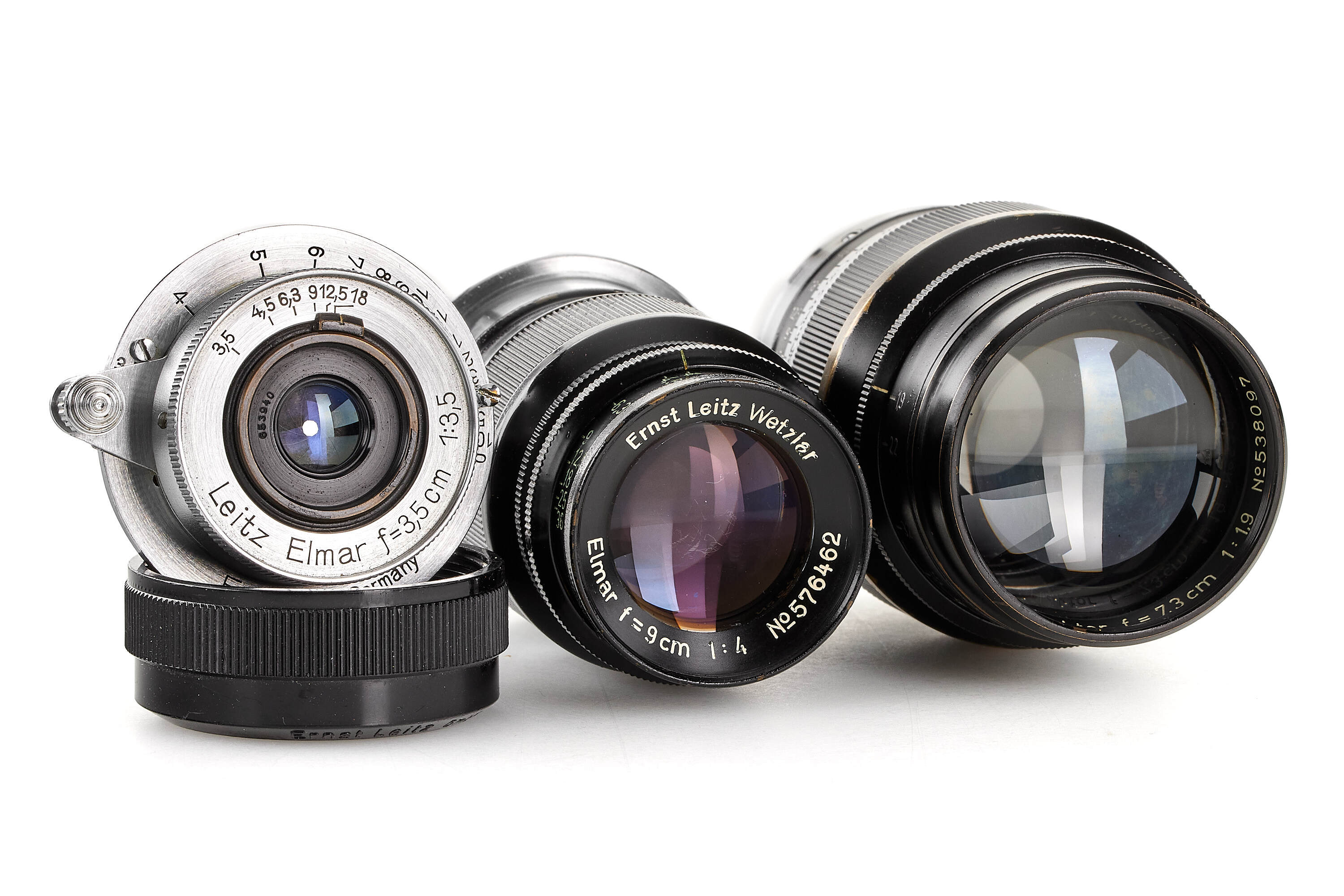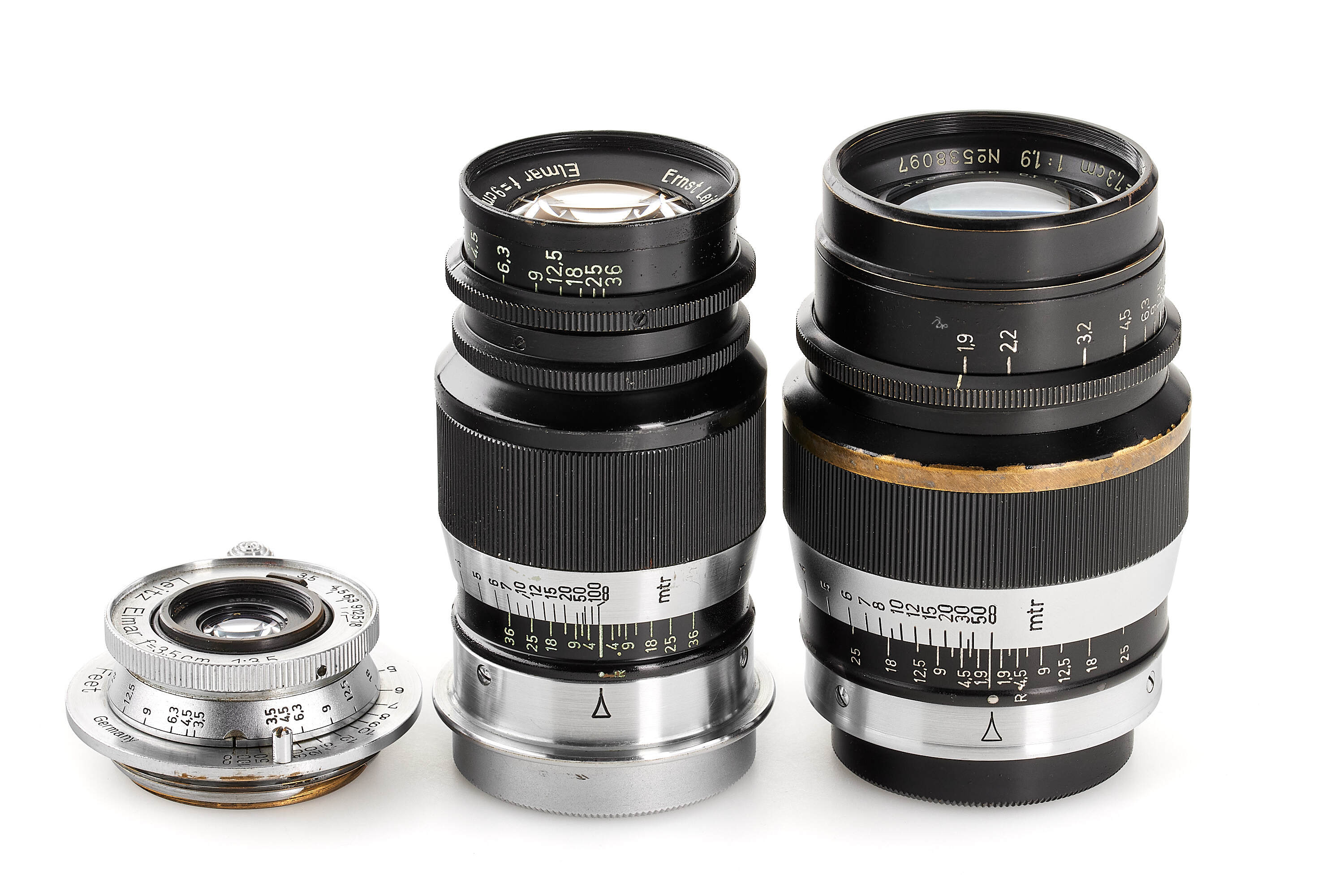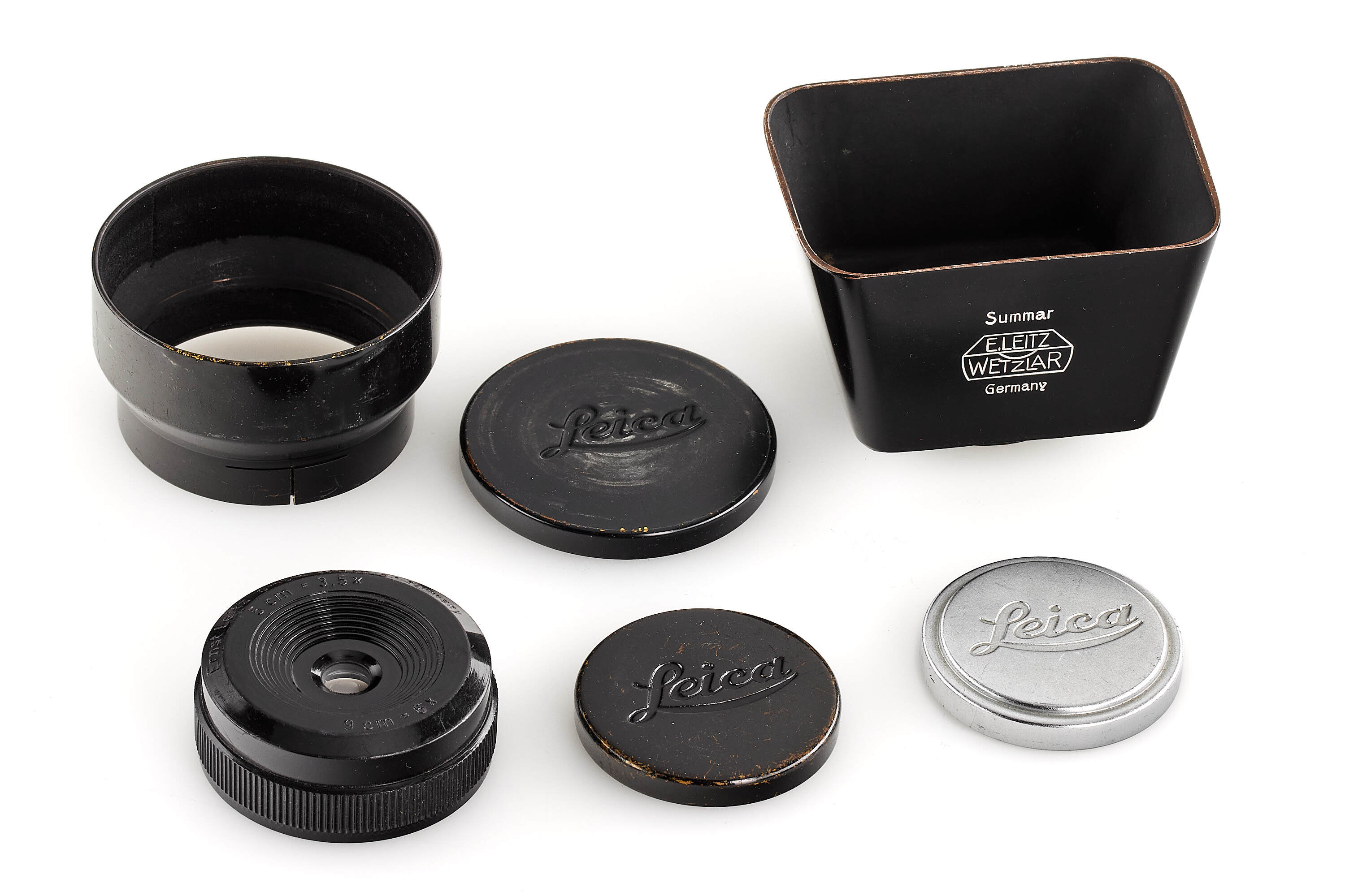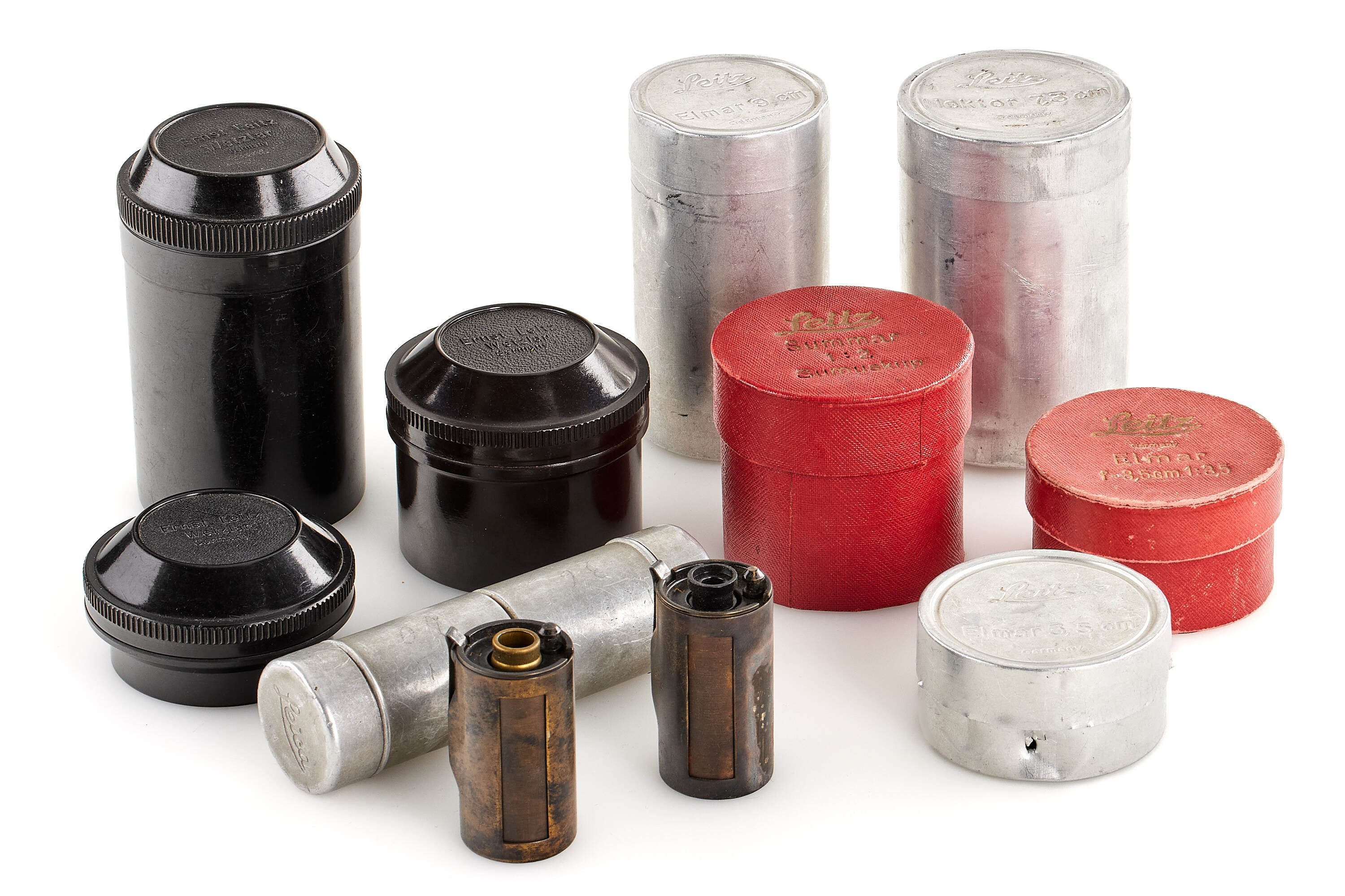 Nice outfit including a Leica IIIa chrome no.302385 in very good condition, delivered to Berlin on 14.10.1938, with matching Summar chrome 2/5cm no.467731, optics only showing a light haze and a few cleaning marks, with front lens cap, red maker's box and black bakelite box, post-war Elmar 3.5/3.5cm no.653940, in feet scale, coated optics showing some cleaning marks, with front lens cap, red maker's box, black bakelite box and rare tropen aluminium box, black/chrome Hektor 1.9/7.3cm no.538097, with both caps, hood and rare tropen aluminium box, wartime black/chrome Elmar 4/9cm no.576432 with very good optics (later coated), with both caps, black bakelite box and rare tropen aluminium box, VIOOH universal finder, OSBLOO telescope adapter, leather eveready case, MBROO metal waterproof metal eveready case, red maker's box (matching body serial number) and 2x film magazines in aluminium double canister.