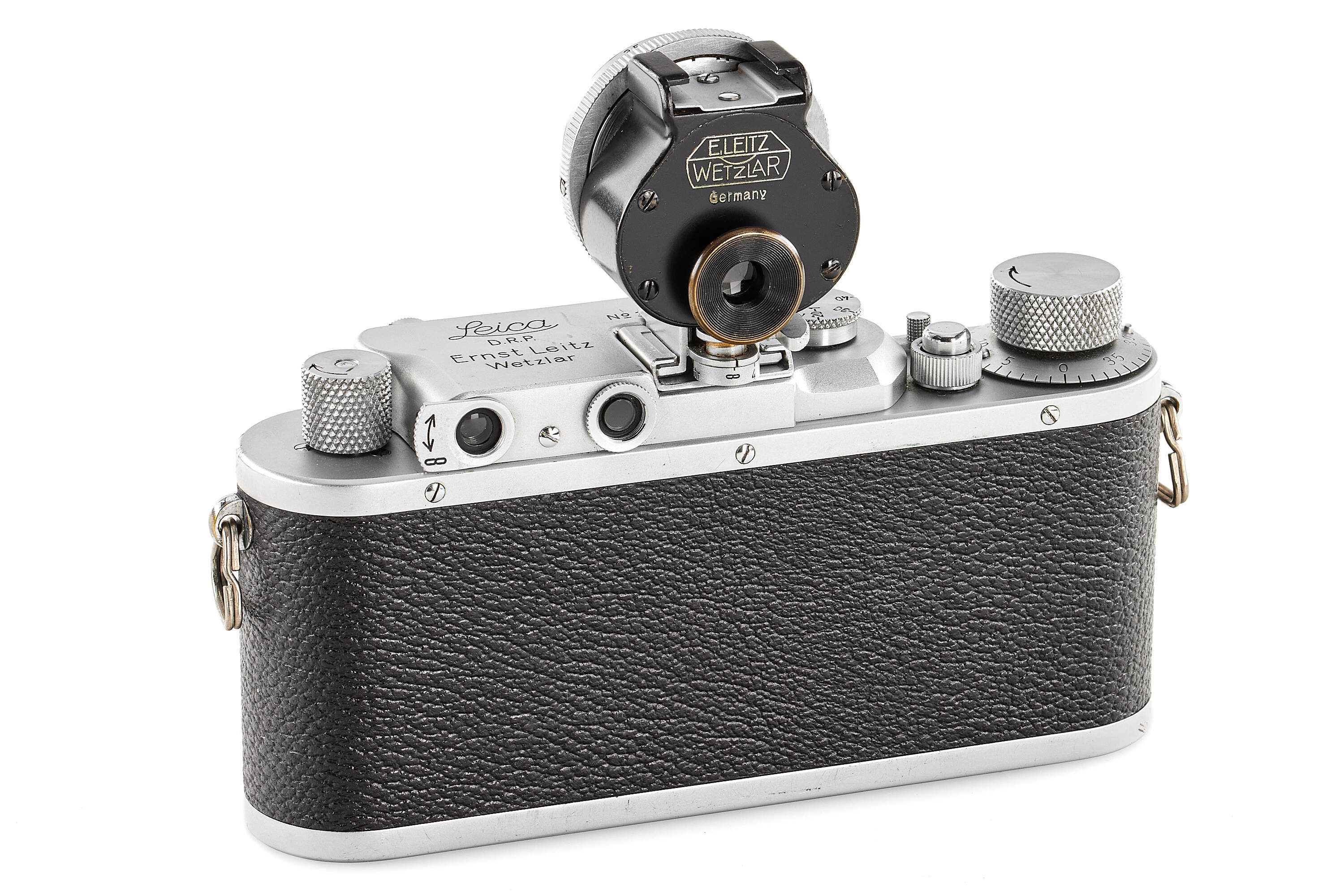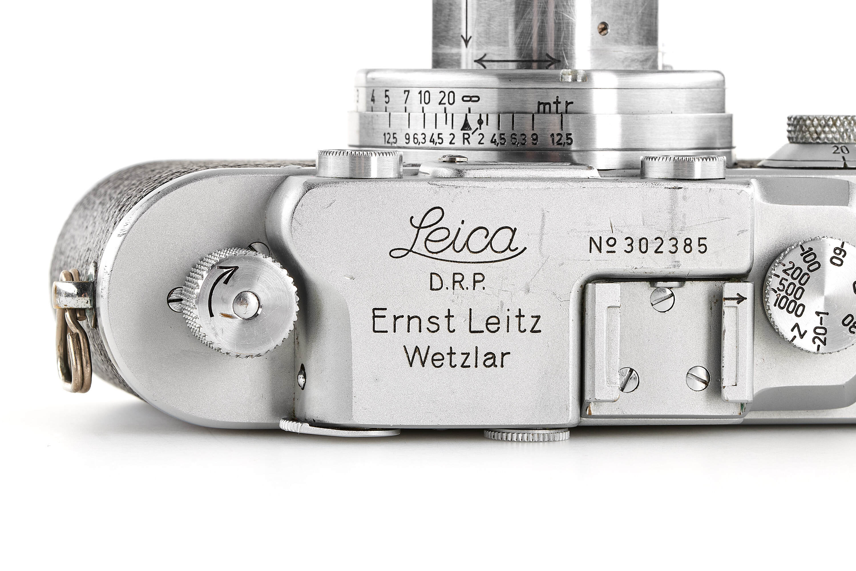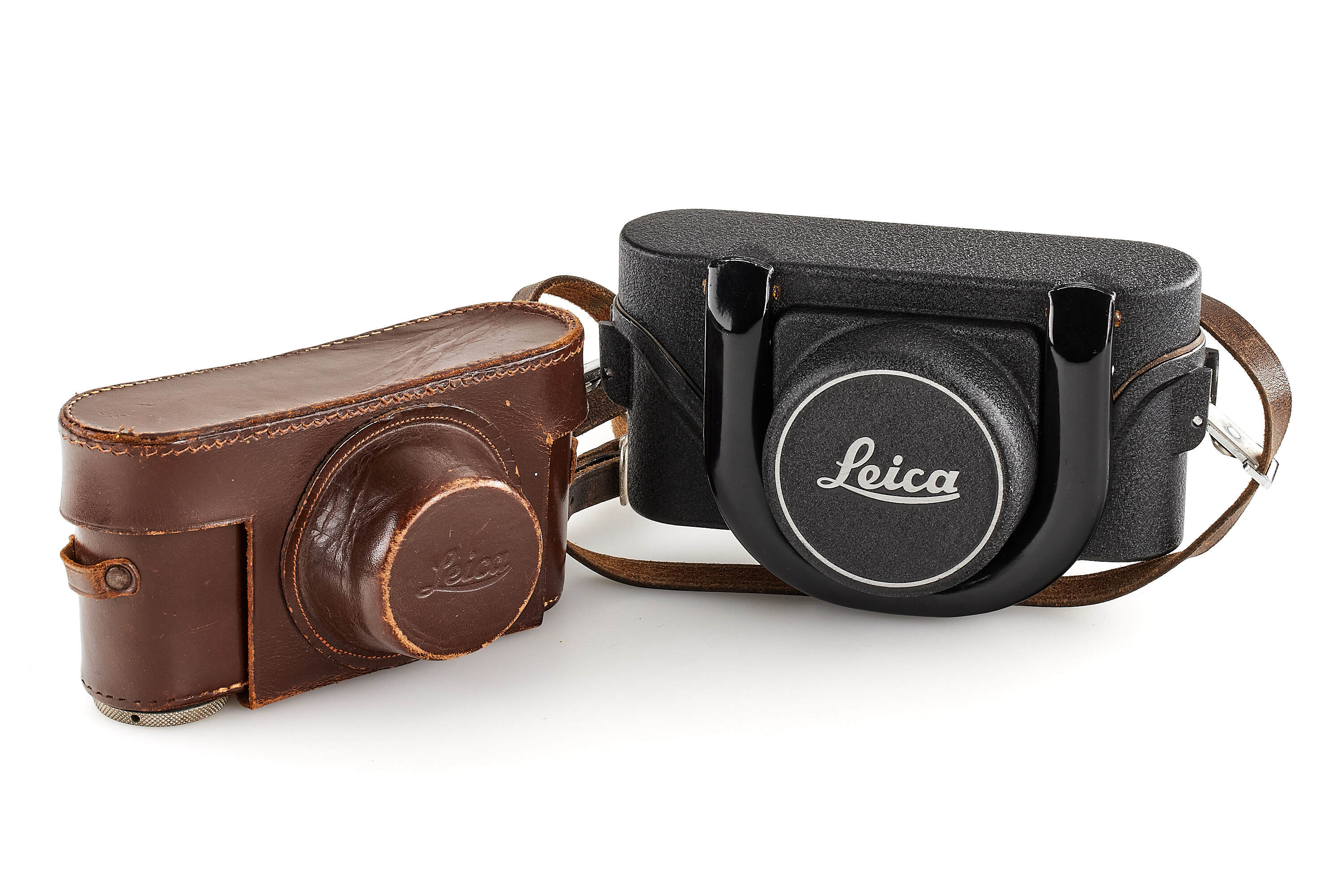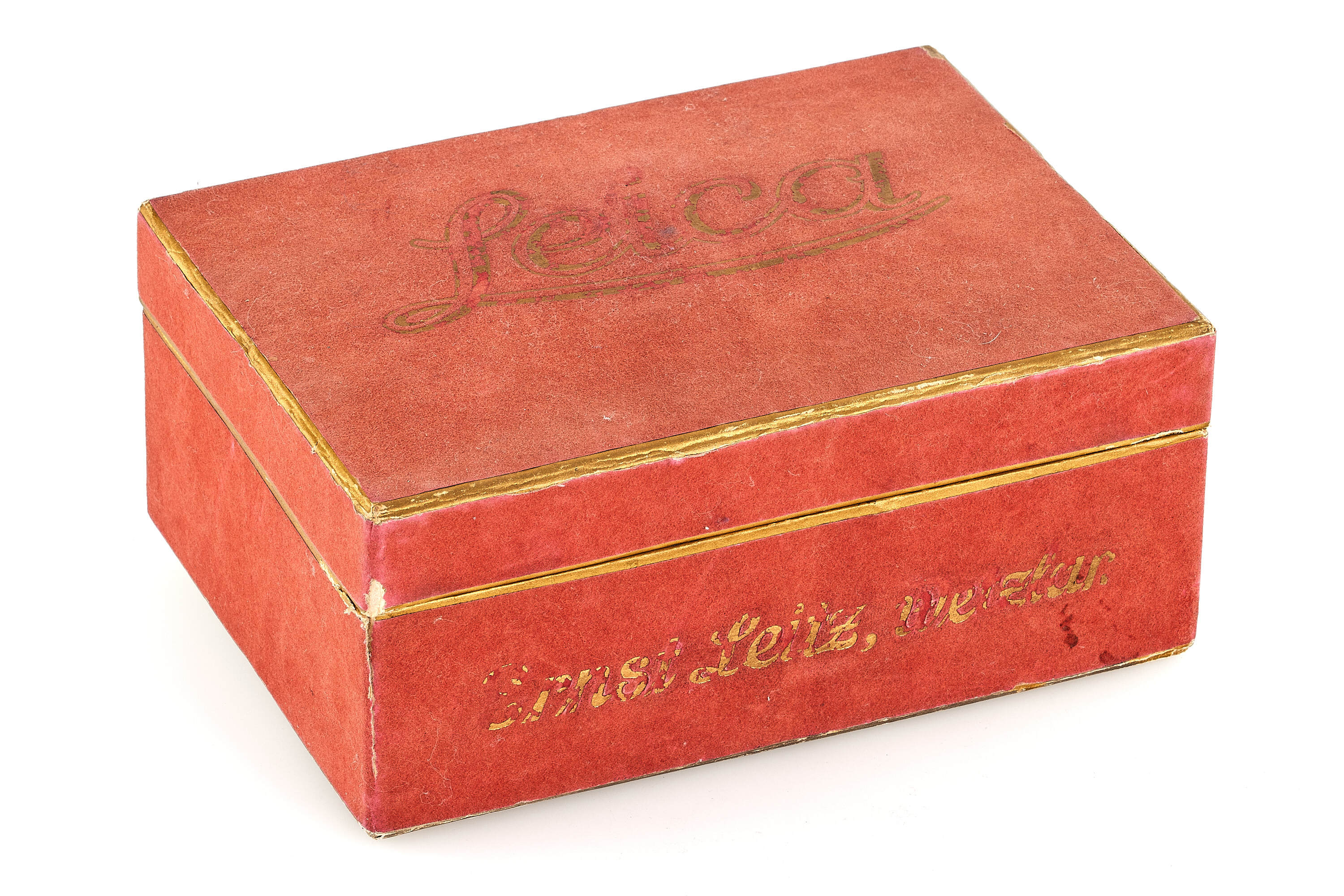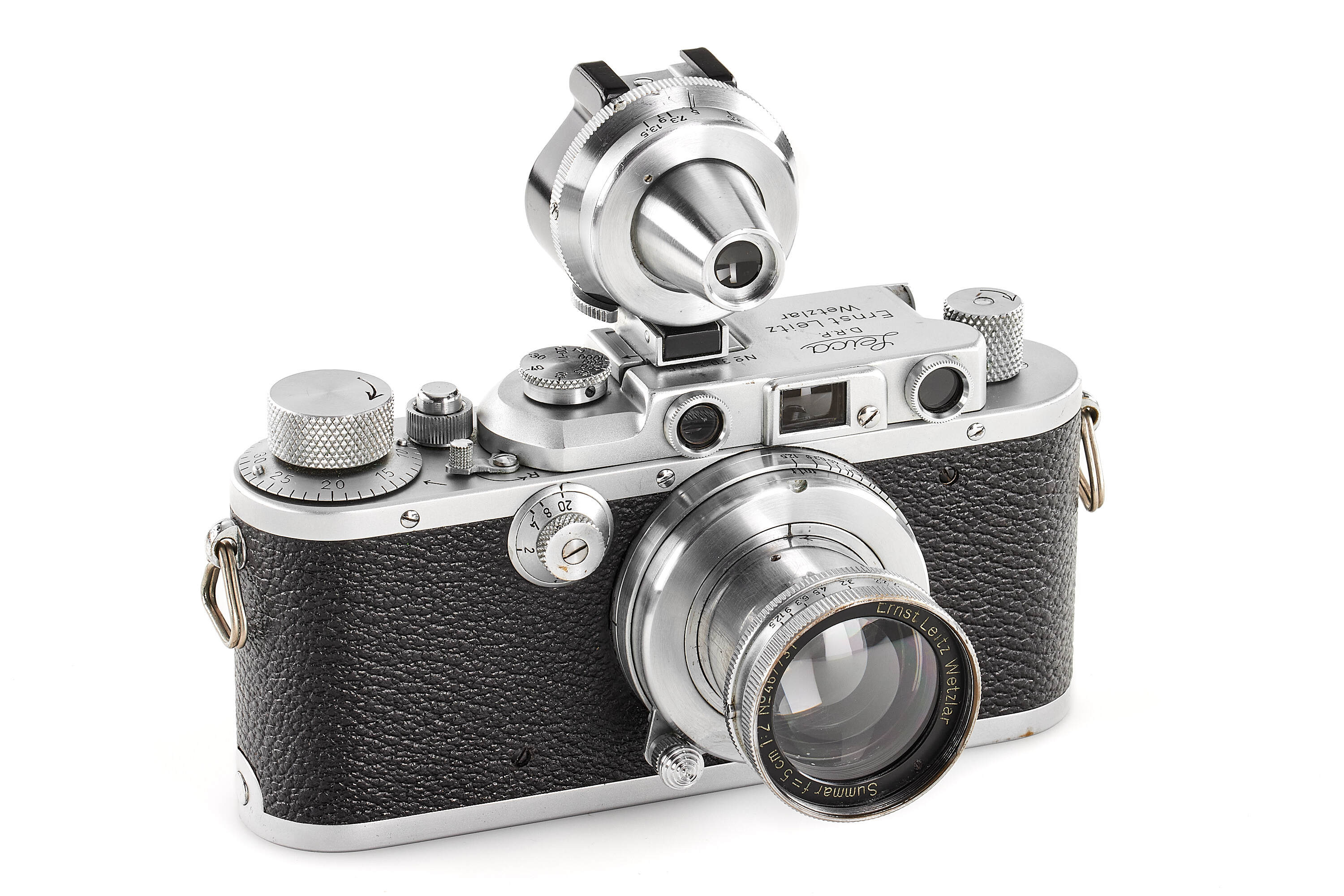Nice outfit including a Leica IIIa chrome no.302385 in very good condition, delivered to Berlin on 14.10.1938, with matching Summar chrome 2/5cm no.467731, optics only showing a light haze and a few cleaning marks, with front lens cap, red maker's box and black bakelite box, post-war Elmar 3.5/3.5cm no.653940, in feet scale, coated optics showing some cleaning marks, with front lens cap, red maker's box, black bakelite box and rare tropen aluminium box, black/chrome Hektor 1.9/7.3cm no.538097, with both caps, hood and rare tropen aluminium box, wartime black/chrome Elmar 4/9cm no.576432 with very good optics (later coated), with both caps, black bakelite box and rare tropen aluminium box, VIOOH universal finder, OSBLOO telescope adapter, leather eveready case, MBROO metal waterproof metal eveready case, red maker's box (matching body serial number) and 2x film magazines in aluminium double canister.