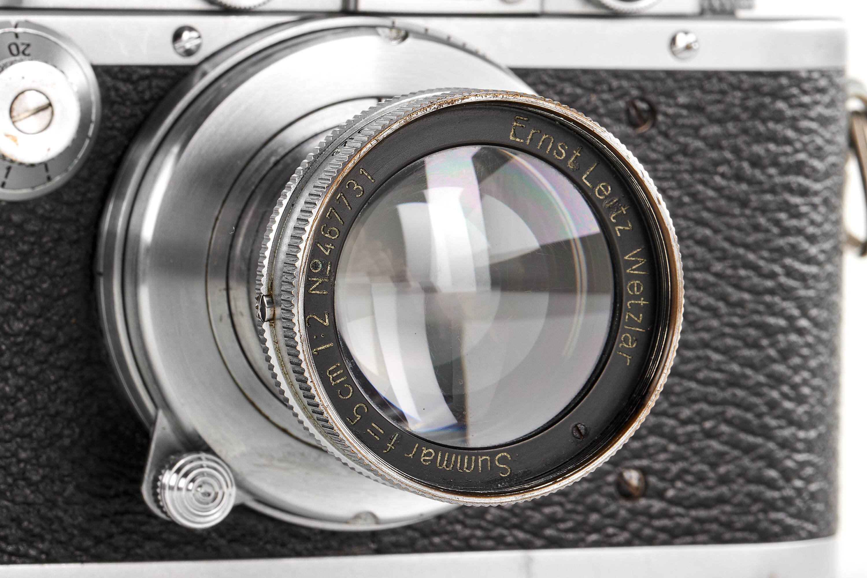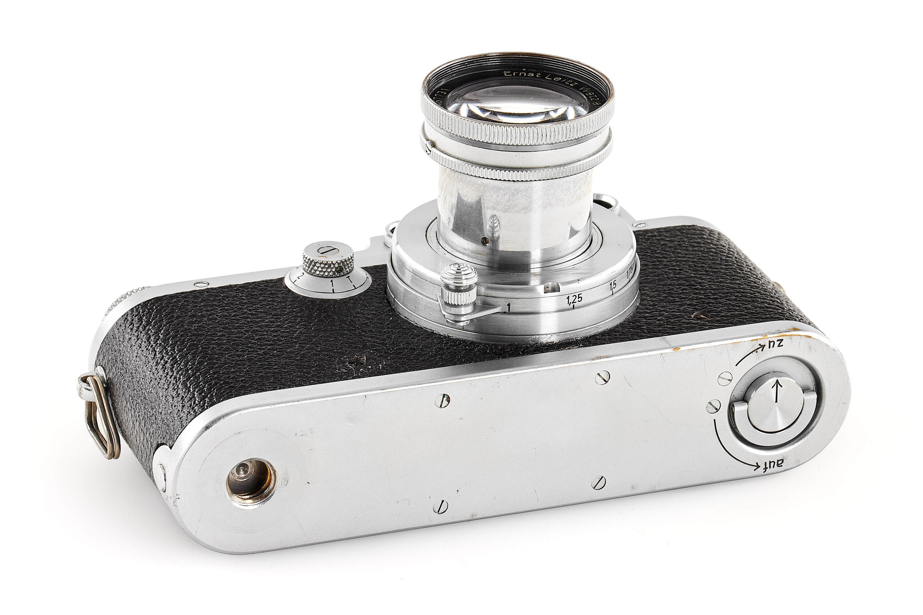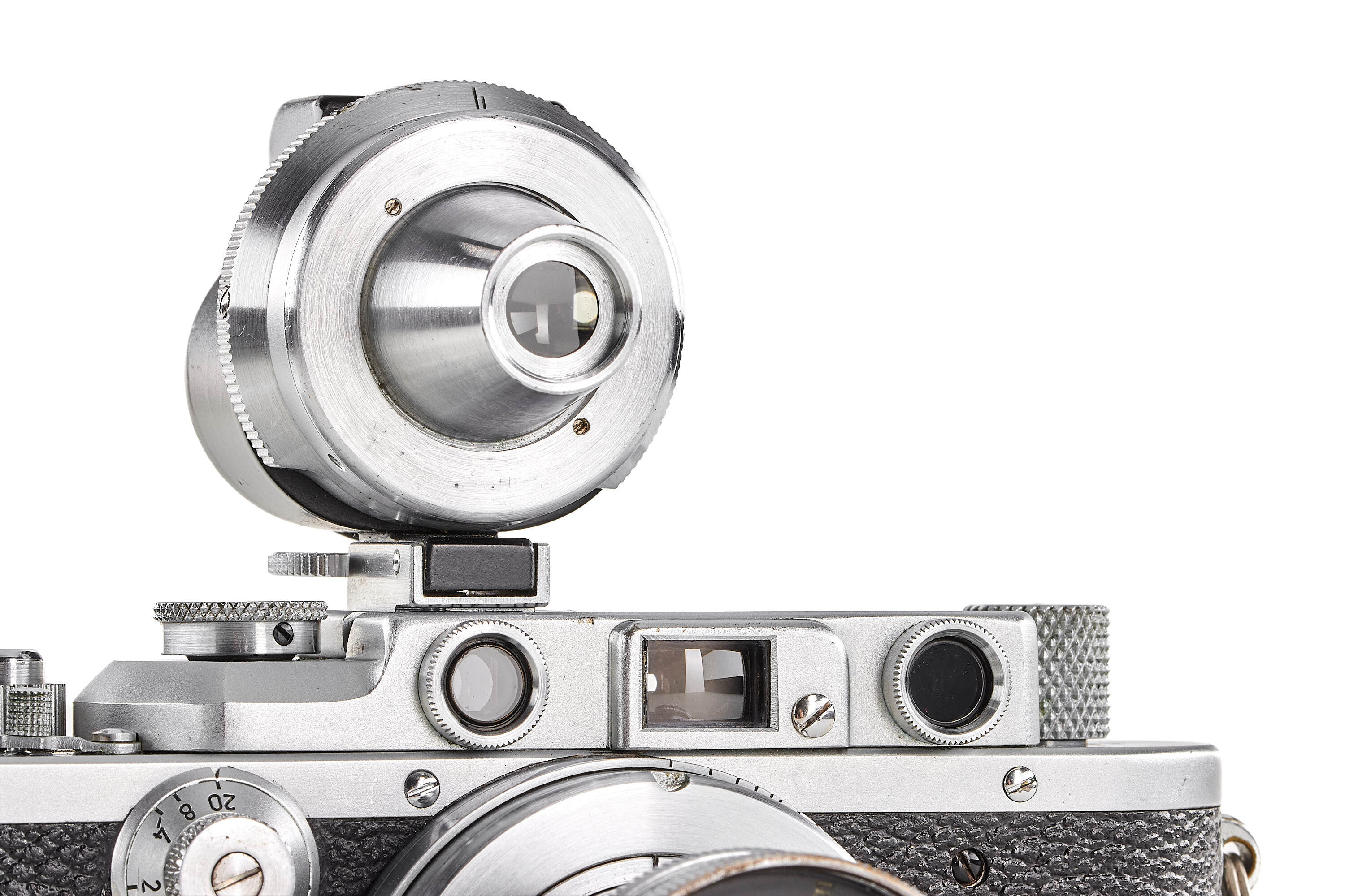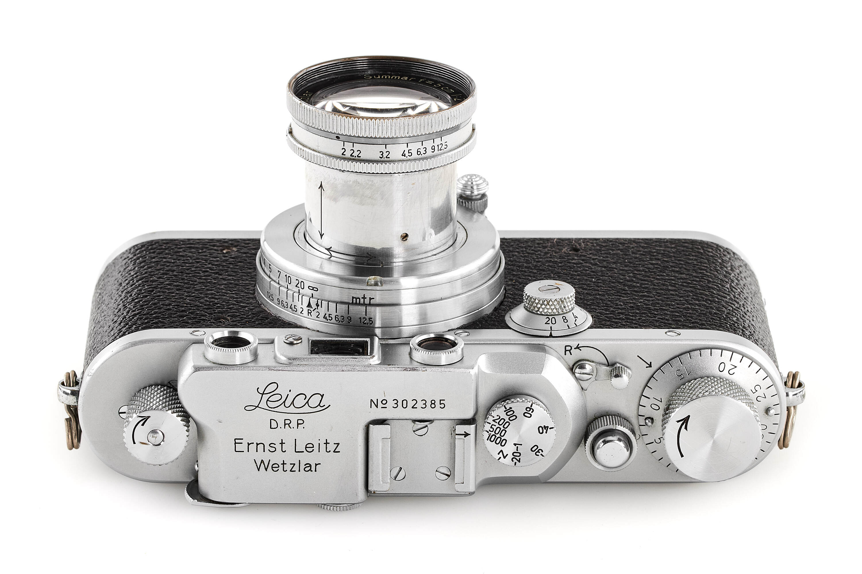 Nice outfit including a Leica IIIa chrome no.302385 in very good condition, delivered to Berlin on 14.10.1938, with matching Summar chrome 2/5cm no.467731, optics only showing a light haze and a few cleaning marks, with front lens cap, red maker's box and black bakelite box, post-war Elmar 3.5/3.5cm no.653940, in feet scale, coated optics showing some cleaning marks, with front lens cap, red maker's box, black bakelite box and rare tropen aluminium box, black/chrome Hektor 1.9/7.3cm no.538097, with both caps, hood and rare tropen aluminium box, wartime black/chrome Elmar 4/9cm no.576432 with very good optics (later coated), with both caps, black bakelite box and rare tropen aluminium box, VIOOH universal finder, OSBLOO telescope adapter, leather eveready case, MBROO metal waterproof metal eveready case, red maker's box (matching body serial number) and 2x film magazines in aluminium double canister.