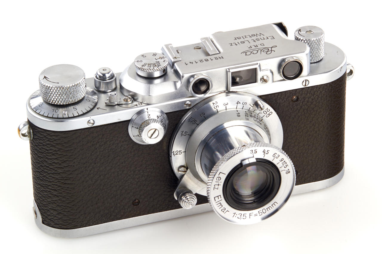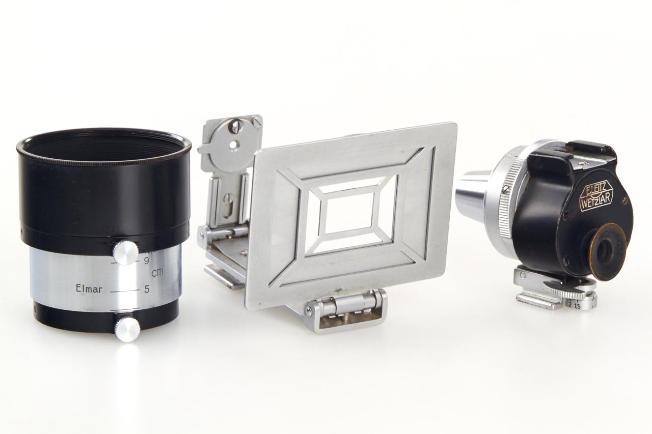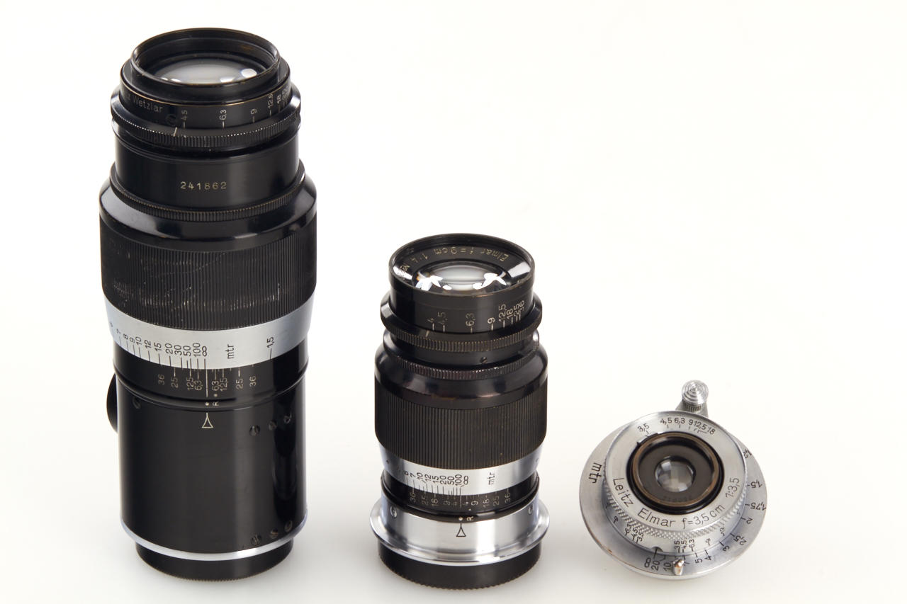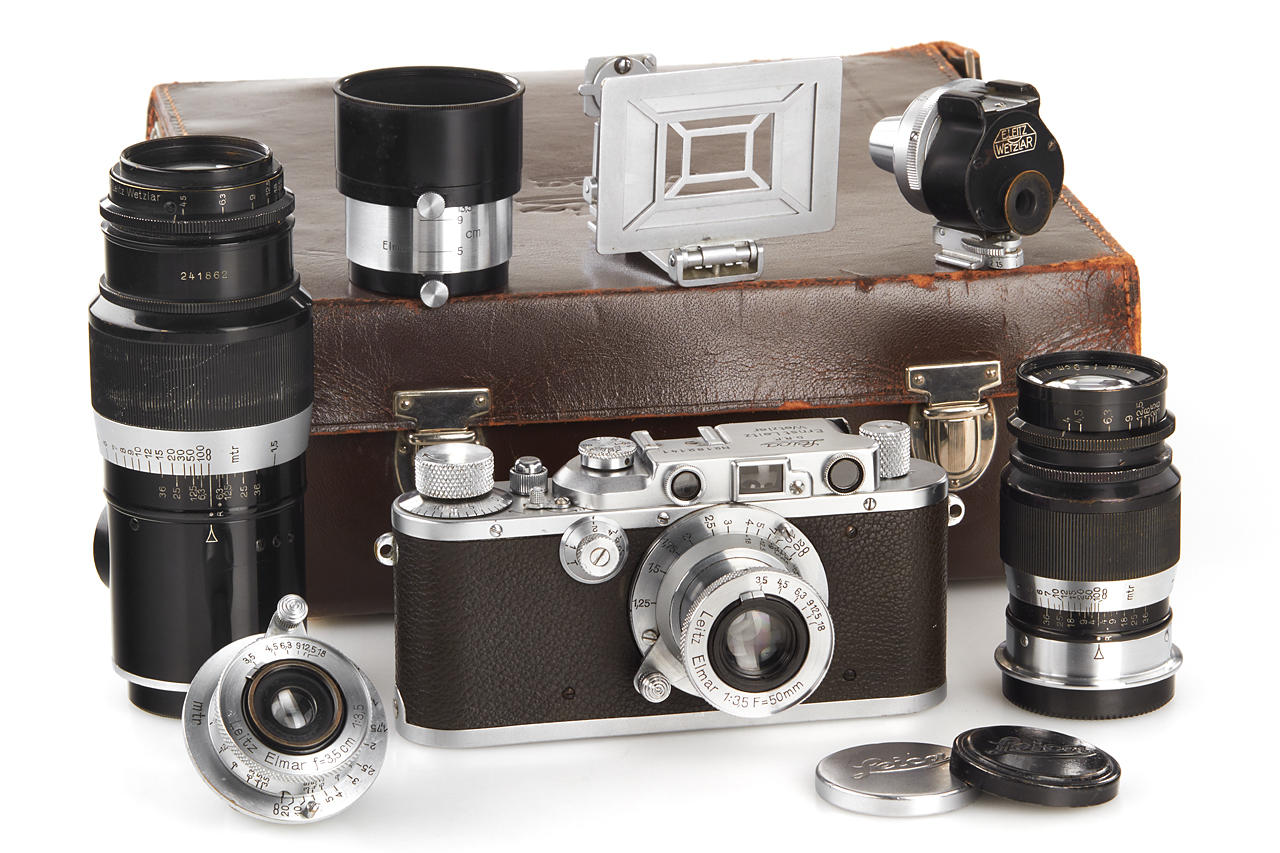 chrome camera in very good working condition, with chrome Elmar 3.5/50mm no.181085, chrome Elmar 3.5/3.5cm no.252012, black/chrome Elmar 4/9cm no.220198, black/chrome Hektor 4.5/13.5cm no.241862, FIKUS hood, lyre-shaped VIOOH universal viewfinder and ROSOL frame finder, everything in large outfit case