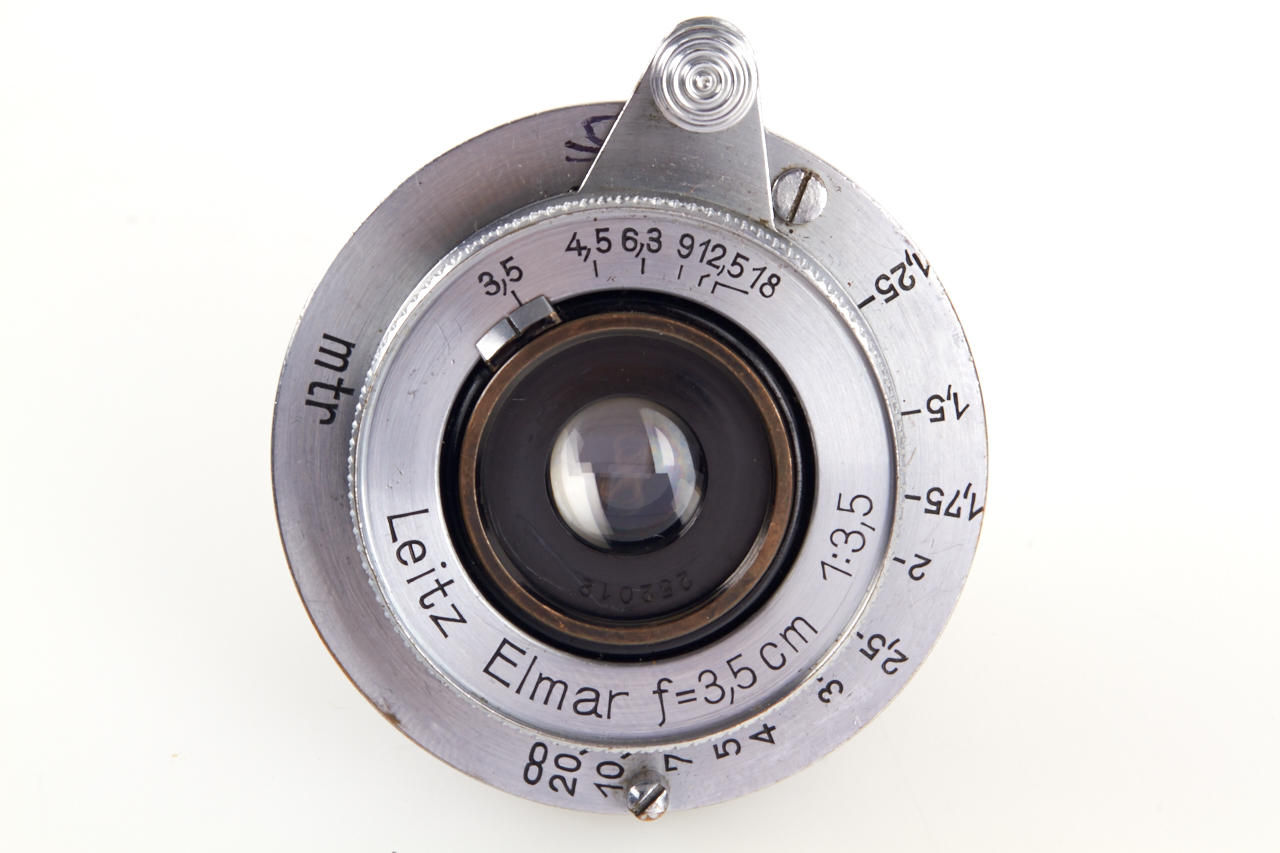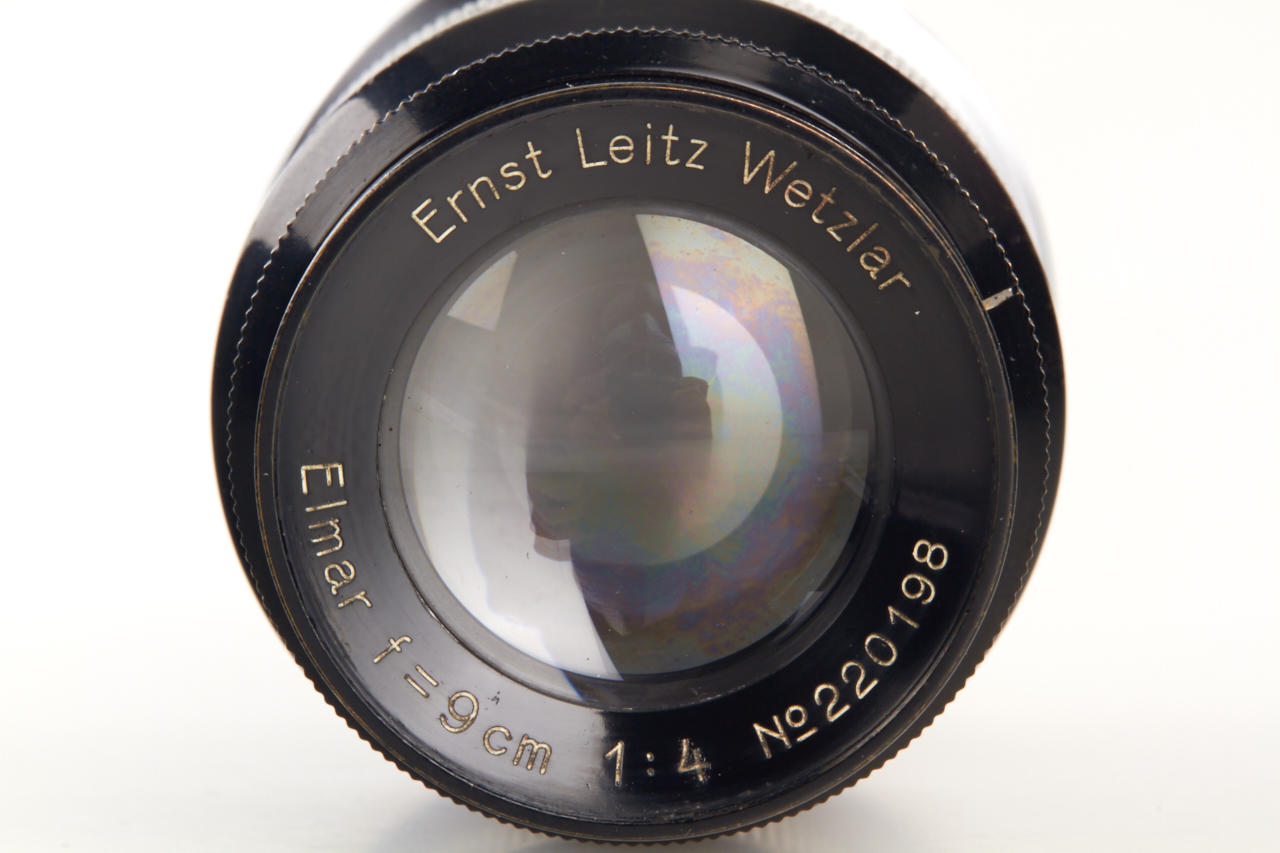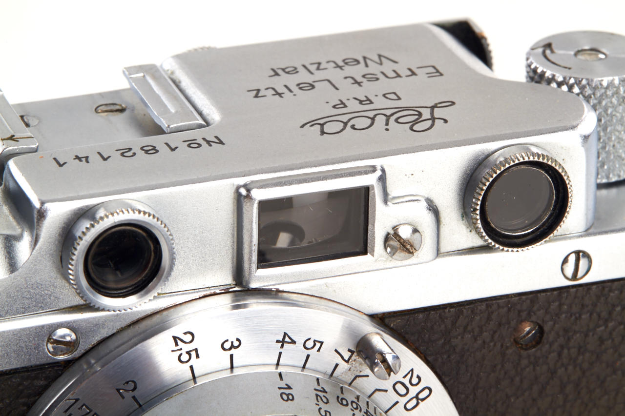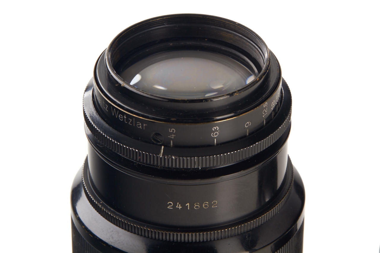 chrome camera in very good working condition, with chrome Elmar 3.5/50mm no.181085, chrome Elmar 3.5/3.5cm no.252012, black/chrome Elmar 4/9cm no.220198, black/chrome Hektor 4.5/13.5cm no.241862, FIKUS hood, lyre-shaped VIOOH universal viewfinder and ROSOL frame finder, everything in large outfit case