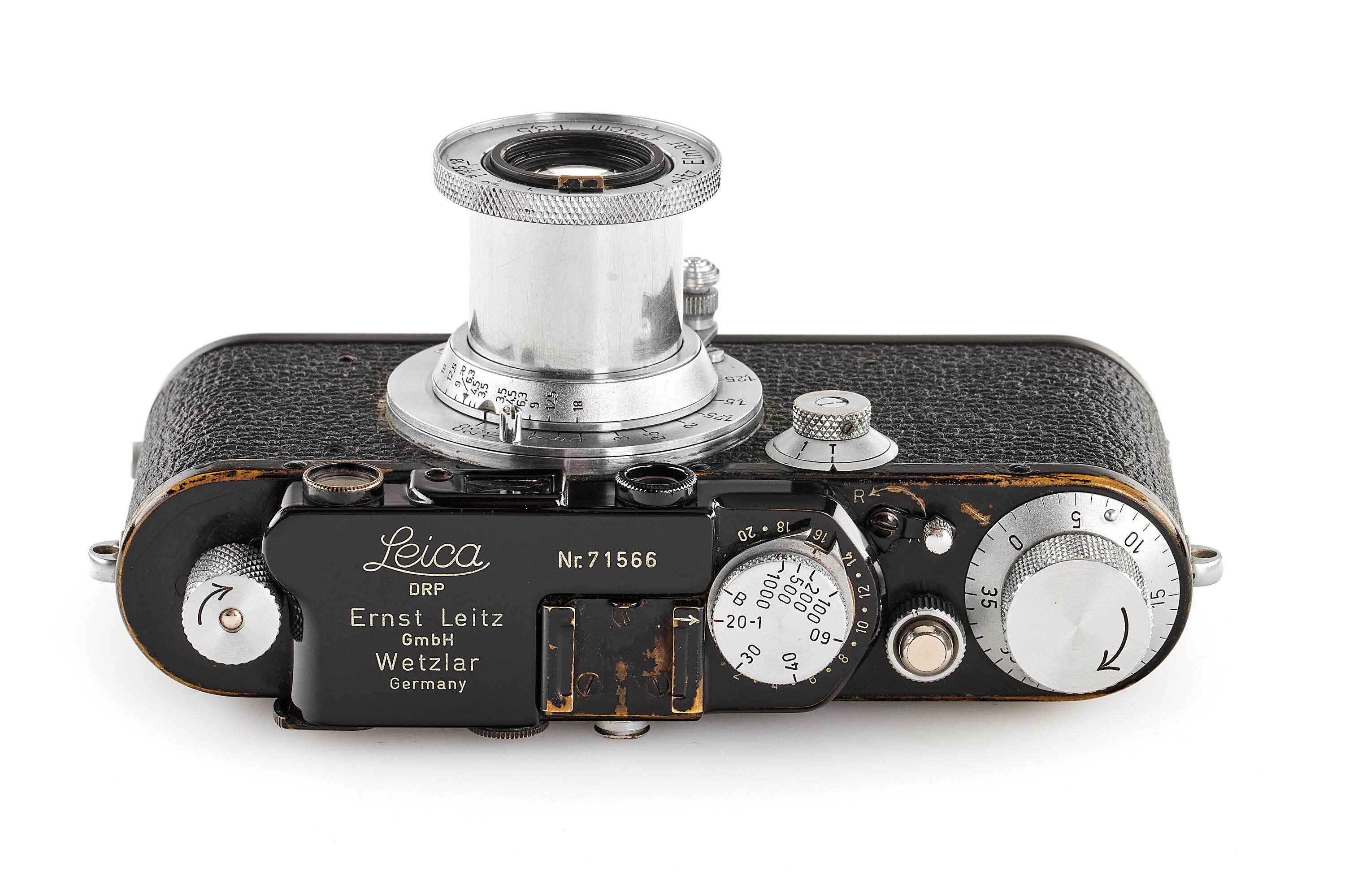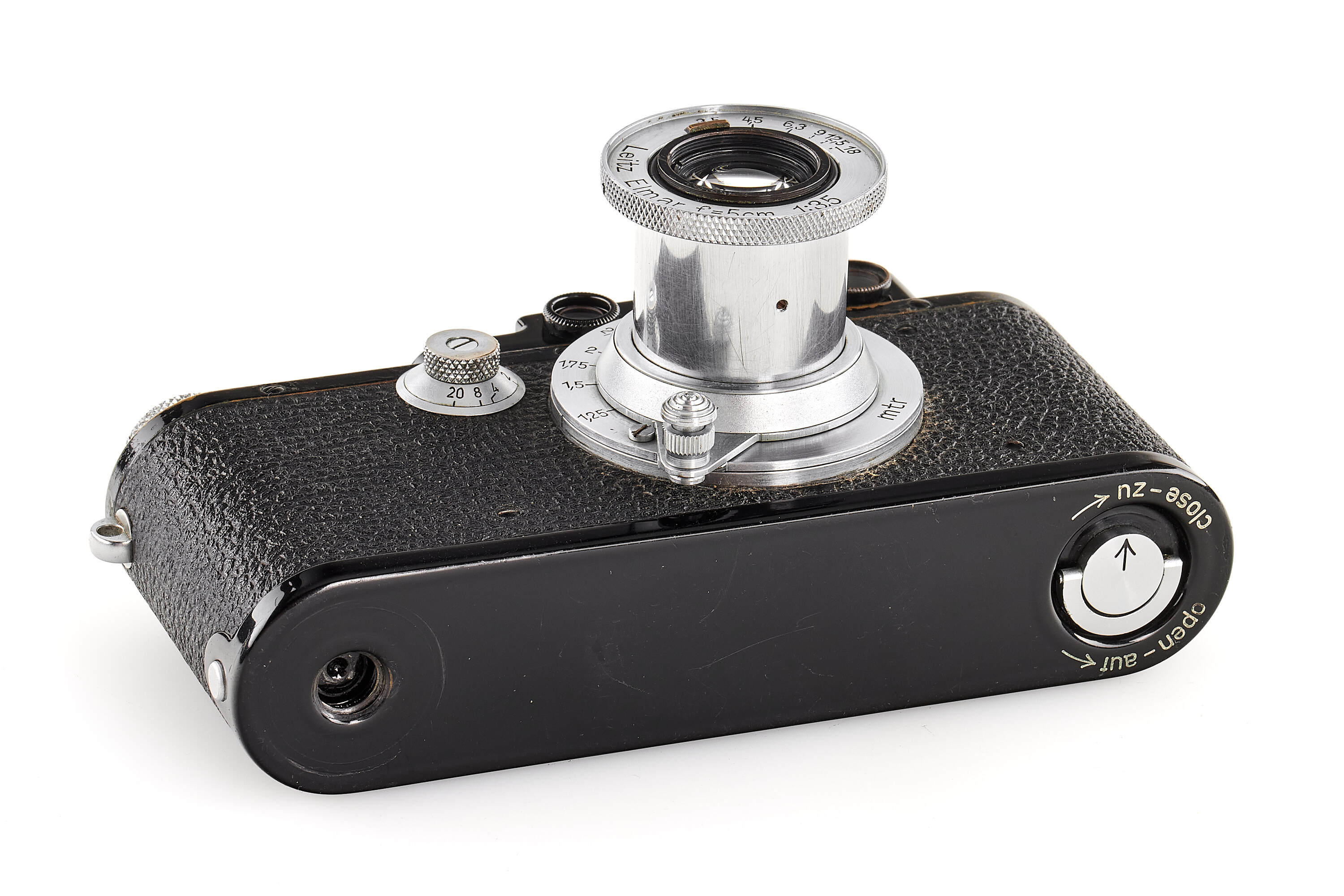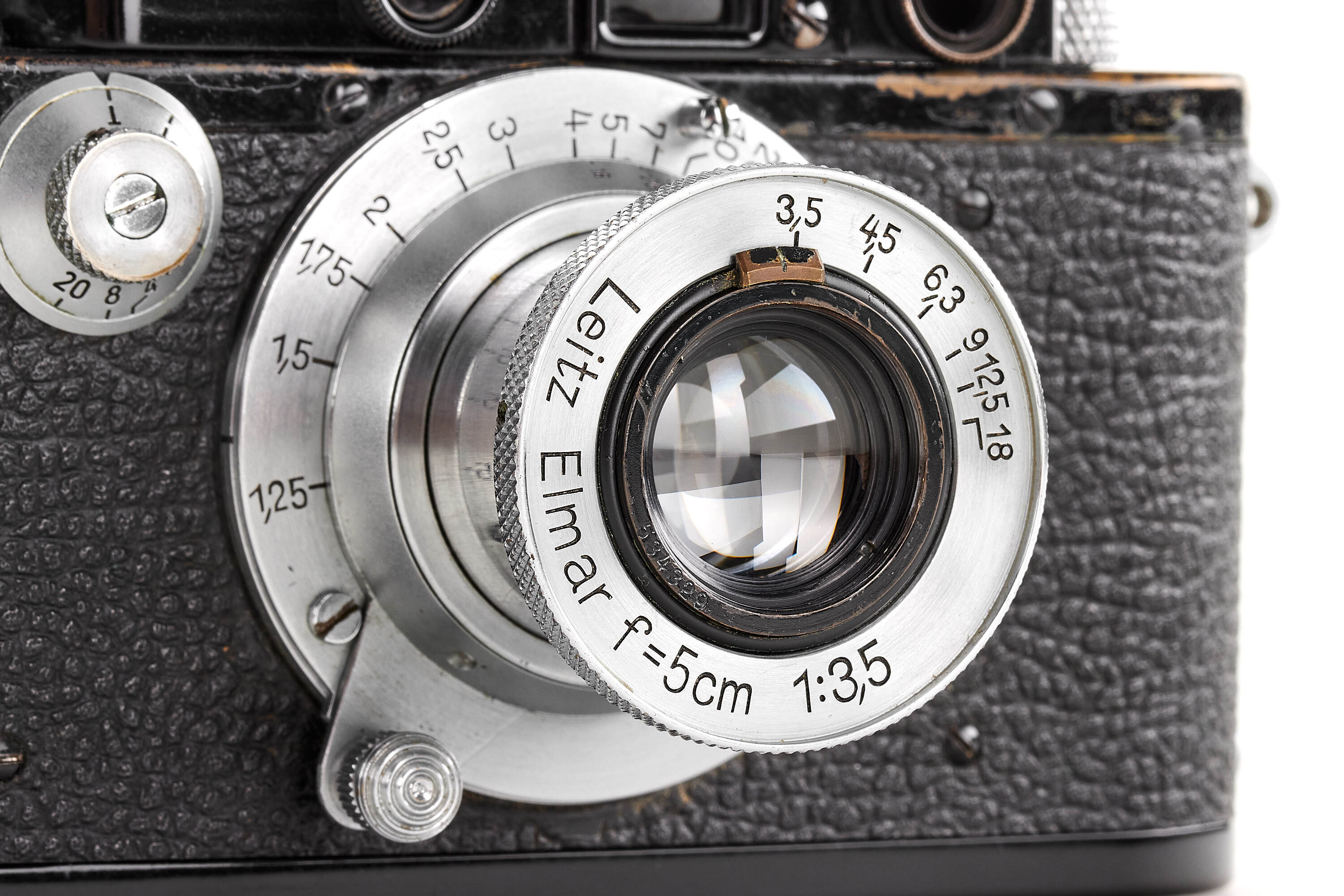 Very nice black/paint Leica with IIIf specifications, originally a very early Leica II Mod. D, upgraded in 1953 and 1954, in good condition, note the shutter release button is still in nickel finish, as well as the rewind knob axis, together with chrome Elmar 3.5/5cm no.534329 (good optics only showing a light haze), with front lens caps and leather case (cond. B).
